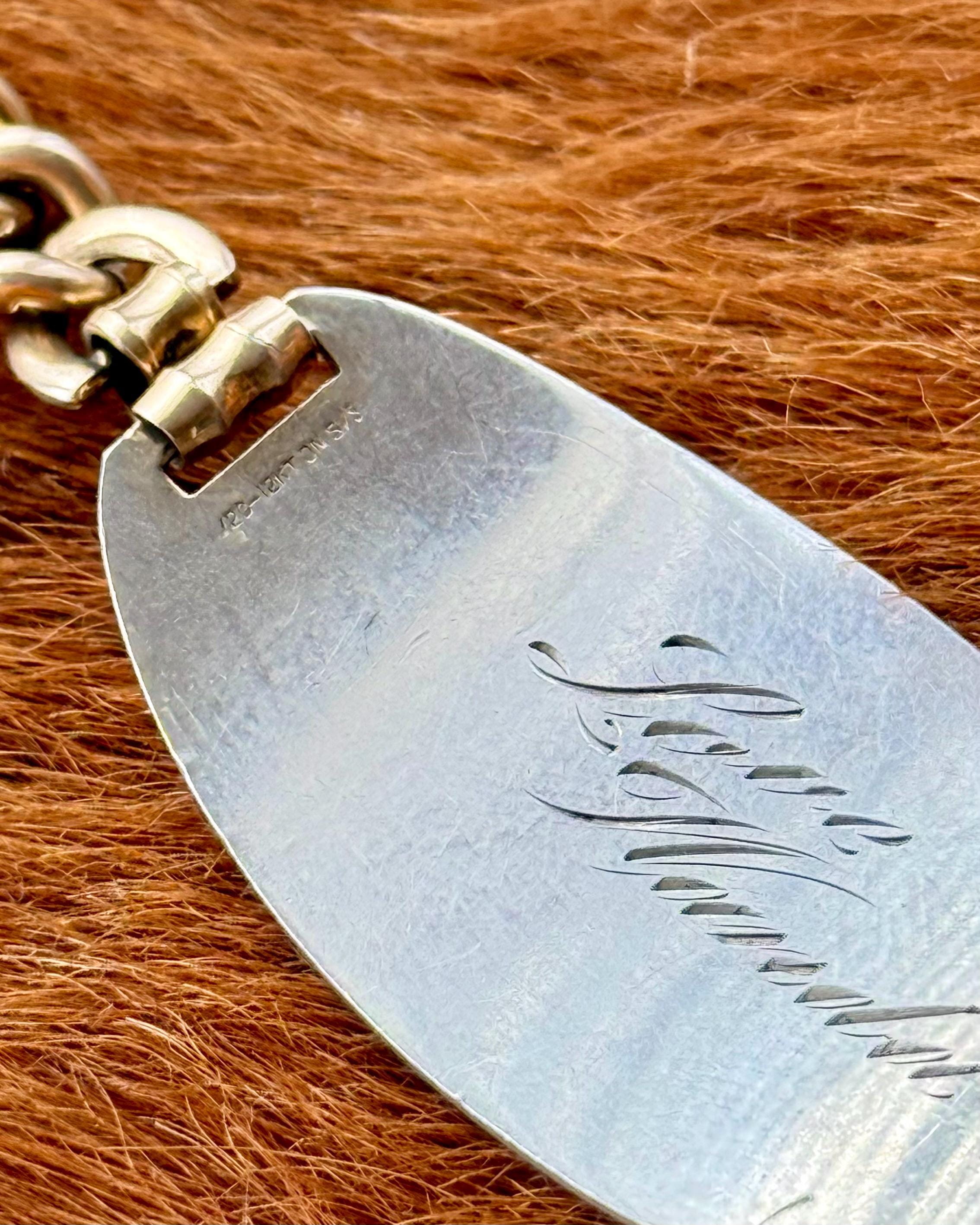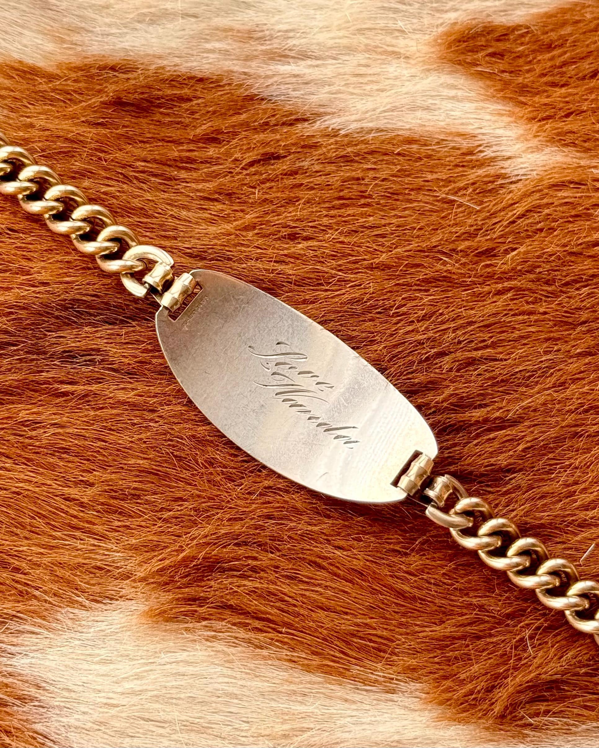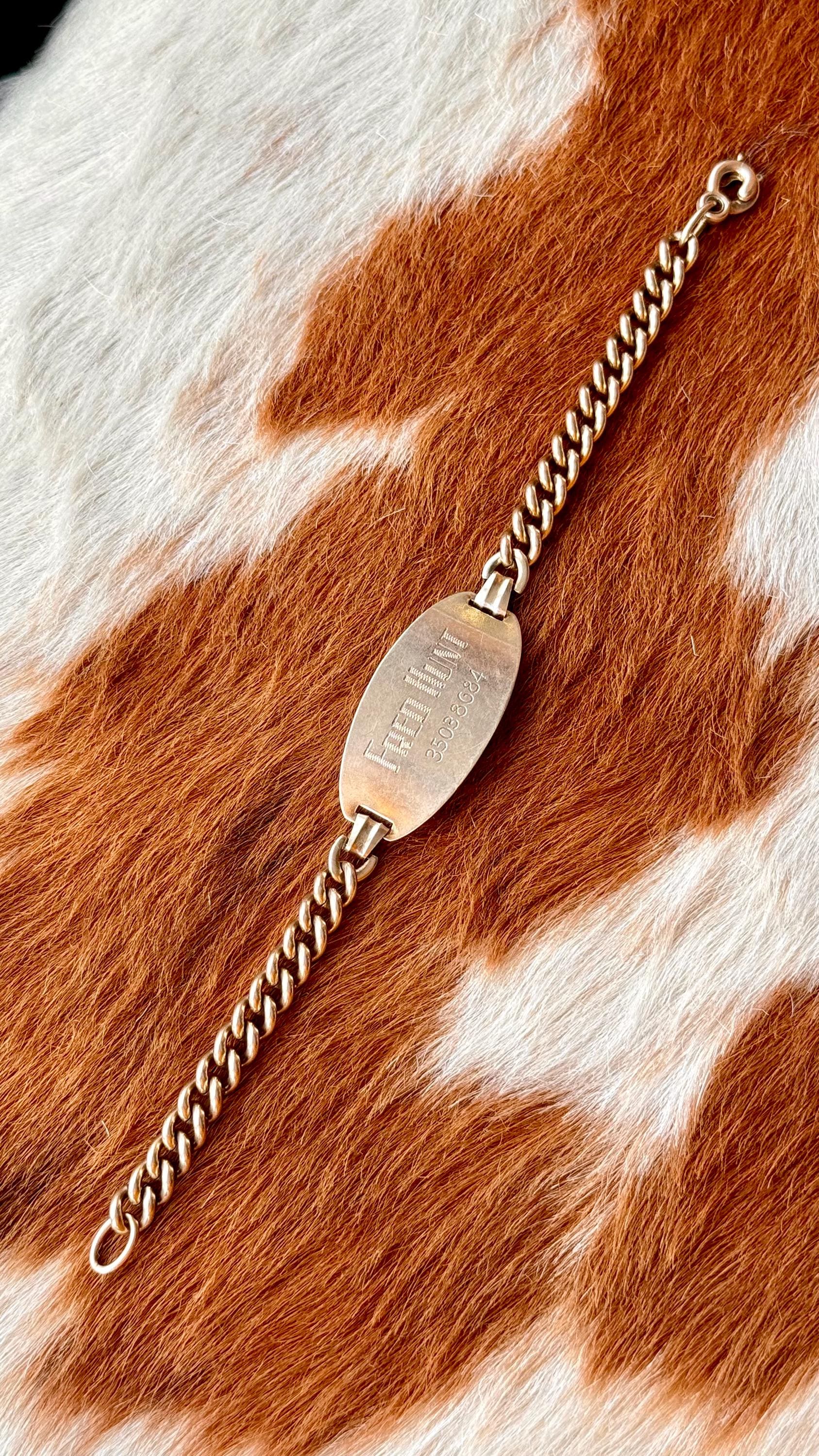 An authentic vintage midcentury era ID bracelet. 12k gold filled over sterling silver. features the name Fred Hunt and identification engraved on the front. a note from his sweetheart “Love Wanda” engraved on the back. a beautiful memento of love and representation of American history. wear with integrity.