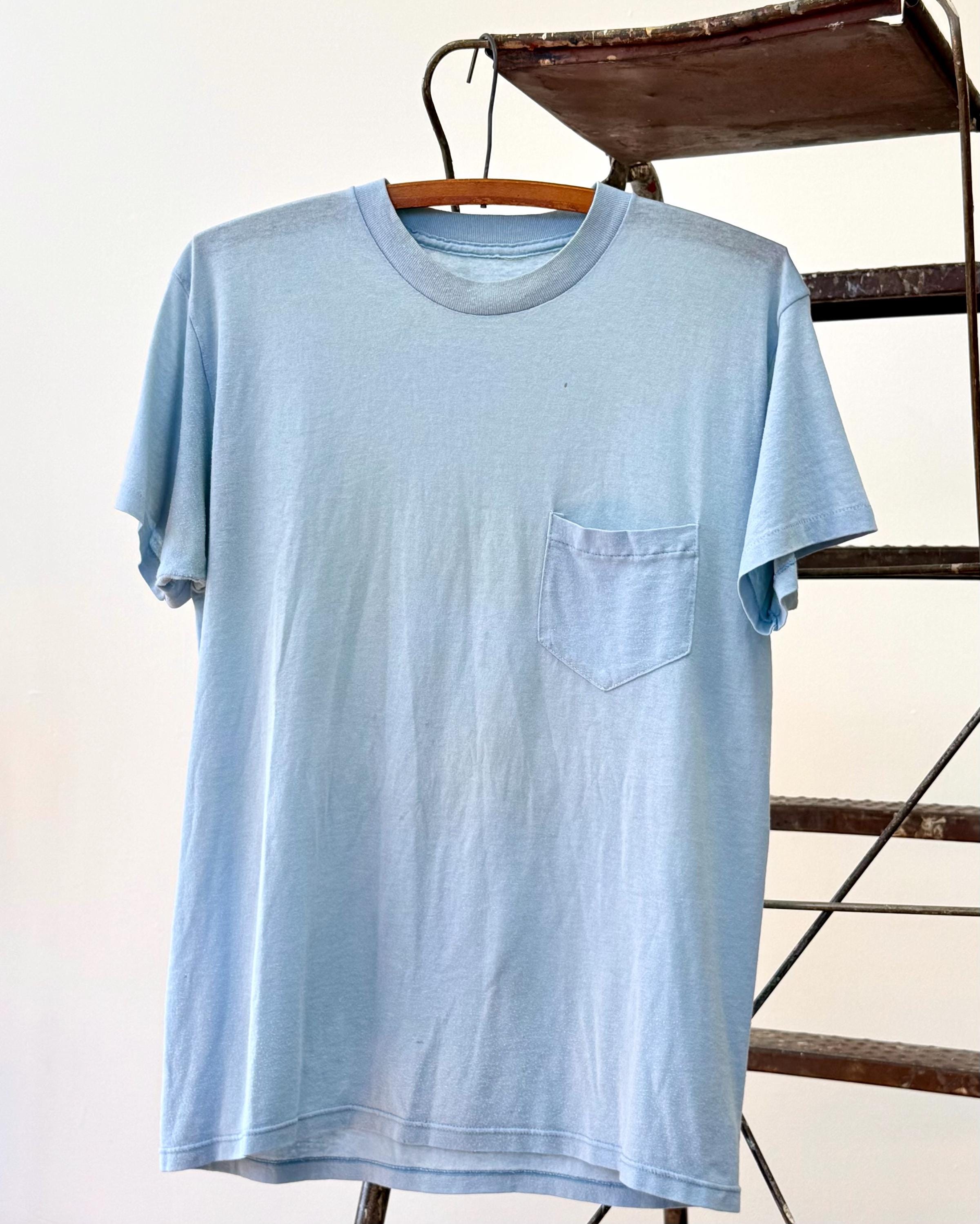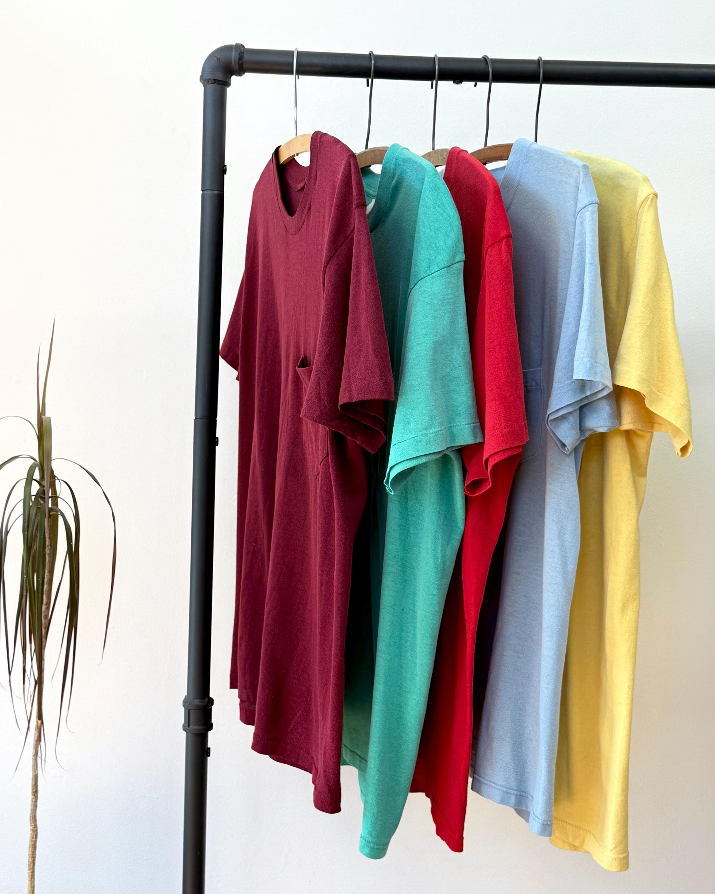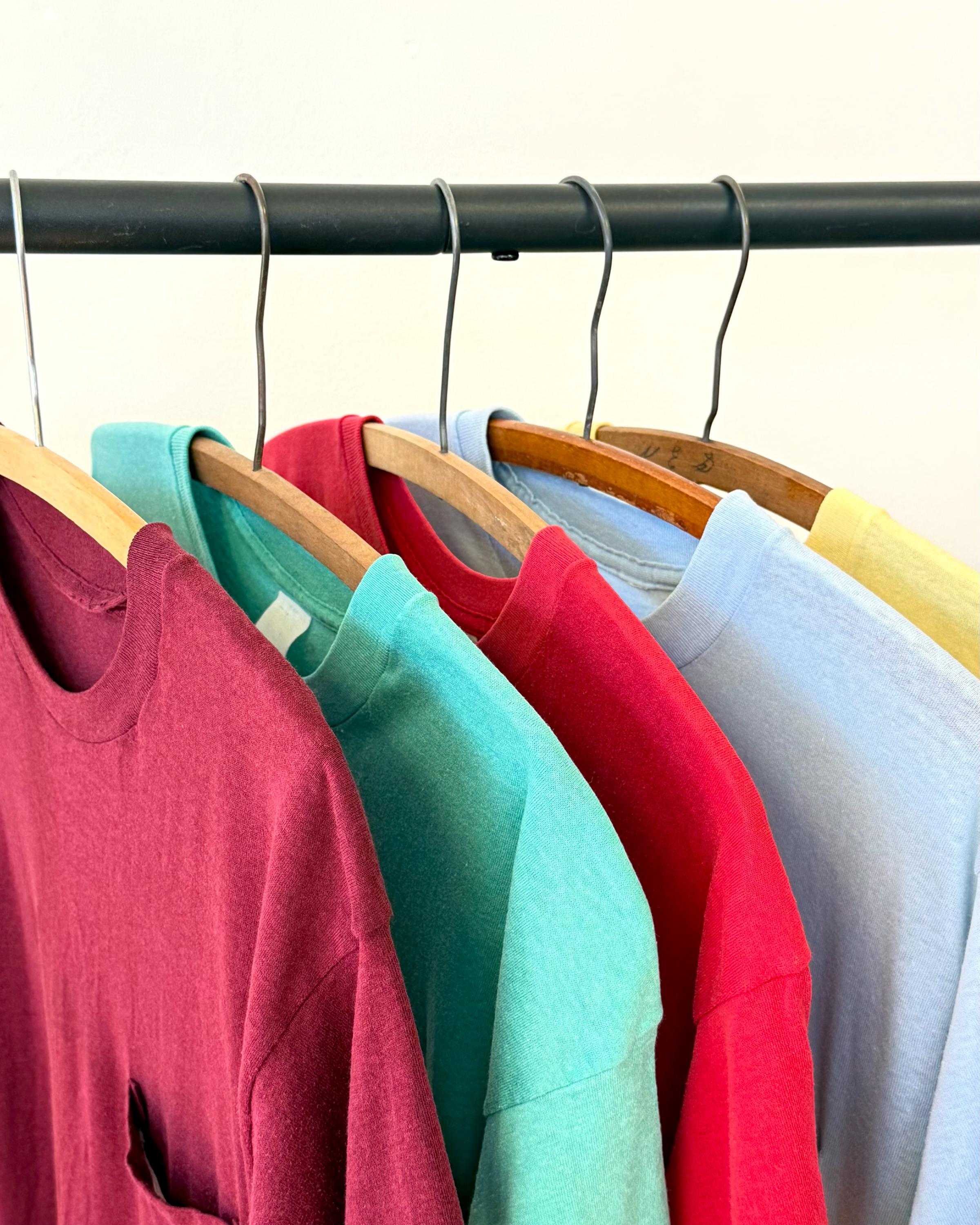 Authentic vintage pocket t shirts. choose from a selection of colors in the same fit and same label. all tees are worn “paper thin” one of a kind with distressed details that vary between tees - such as fading, marks, faint spots, small holes and other patina. made in USA