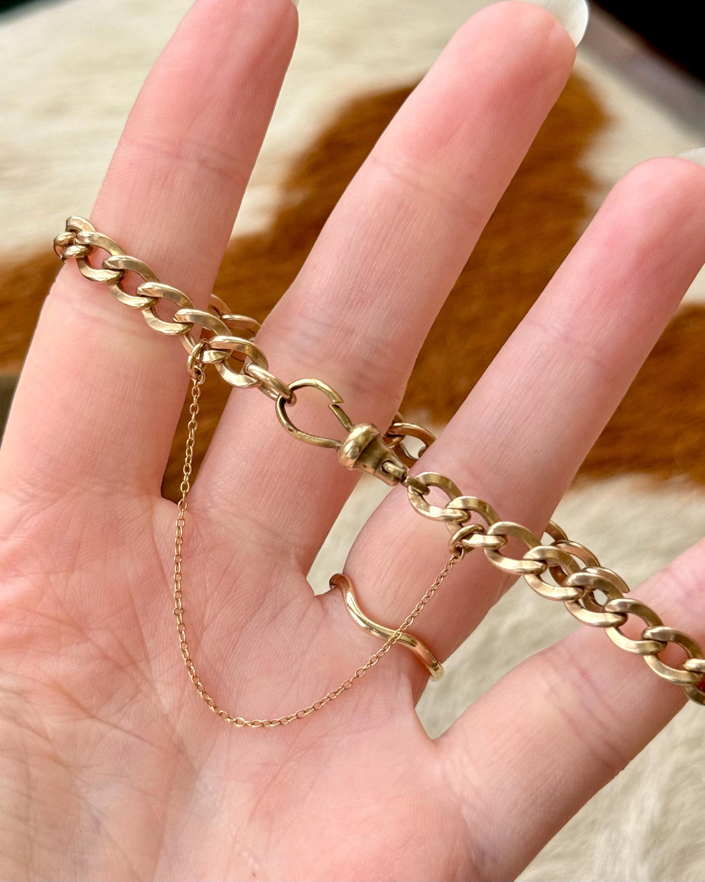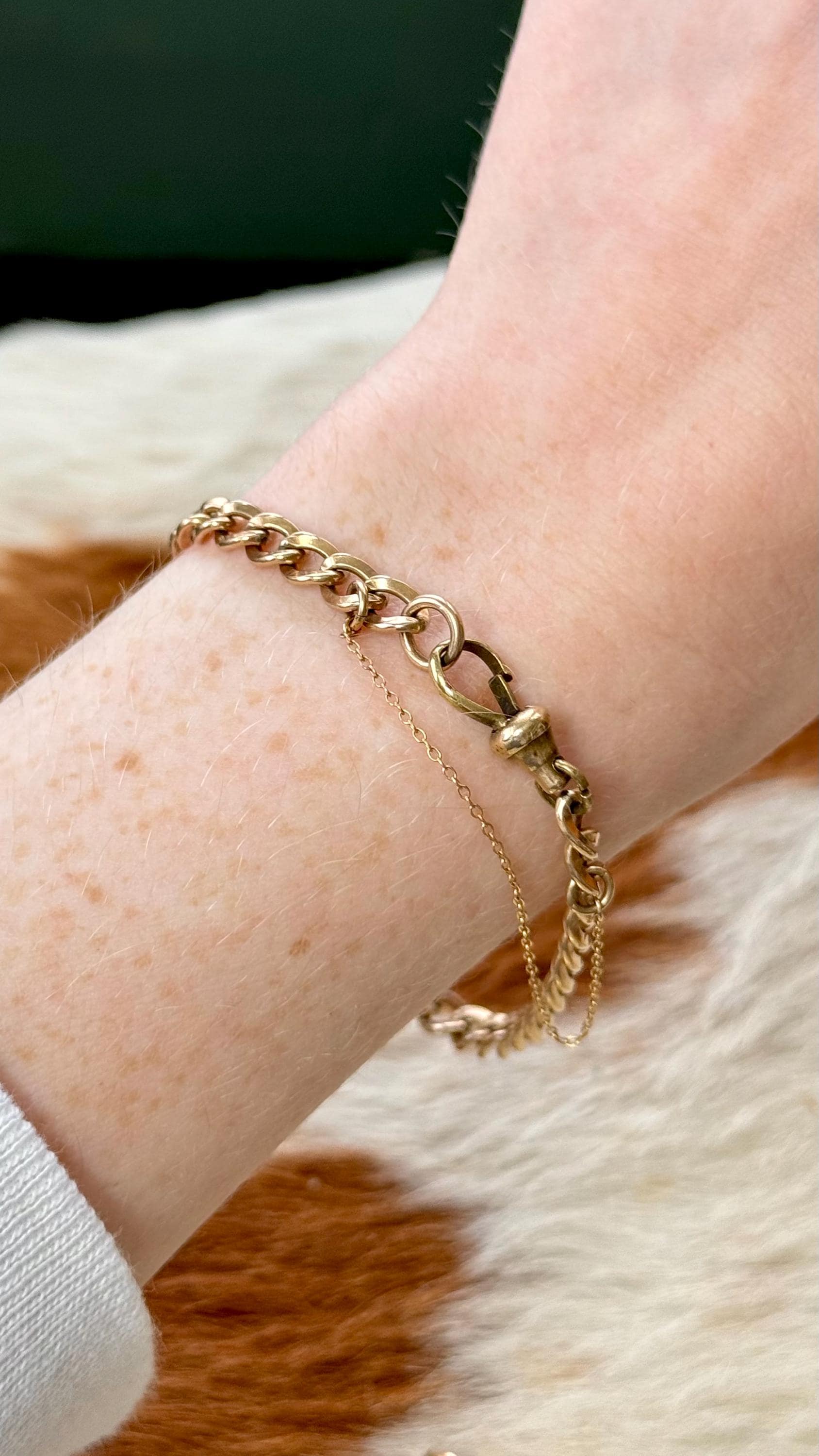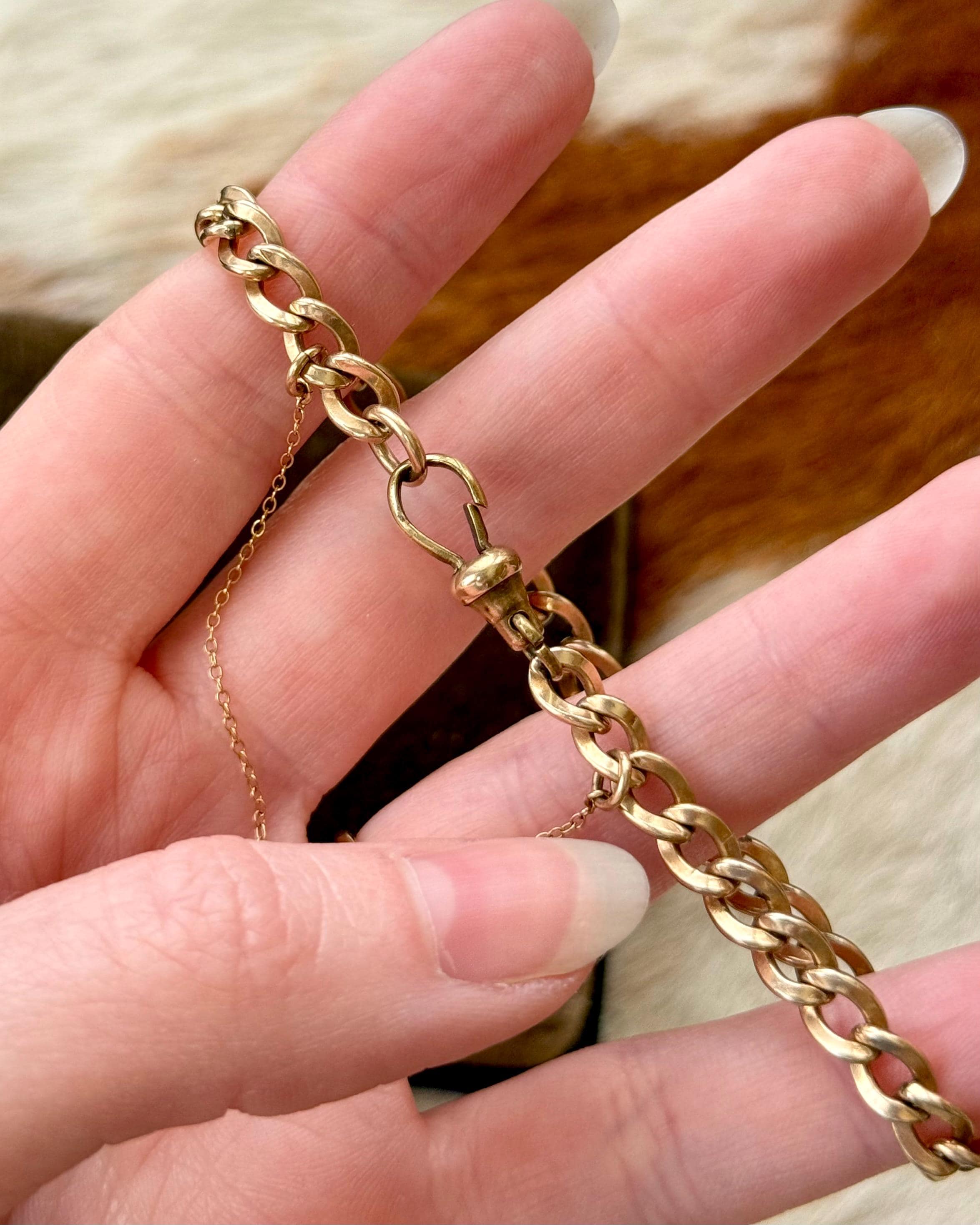 A one of a kind bracelet crafted by us from reclaimed authentic vintage jewelry chains and antique findings. features a gold filled curb link chain with a soft matte finish. fastens with an antique solid brass dog clip that functions mechanically without a spring. includes an attached safety chain. unmarked.