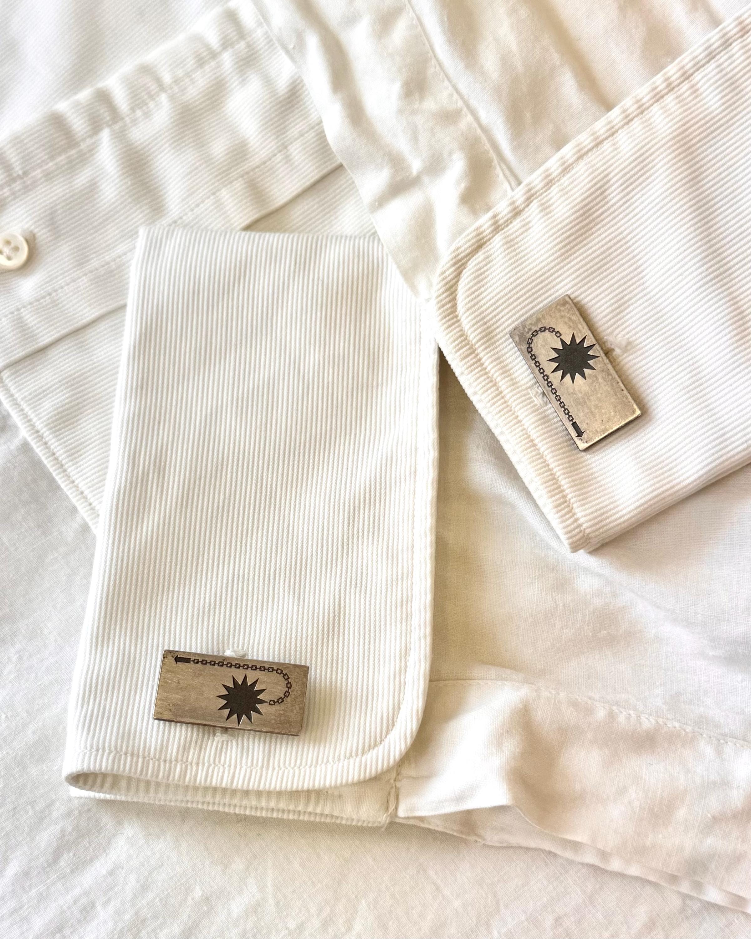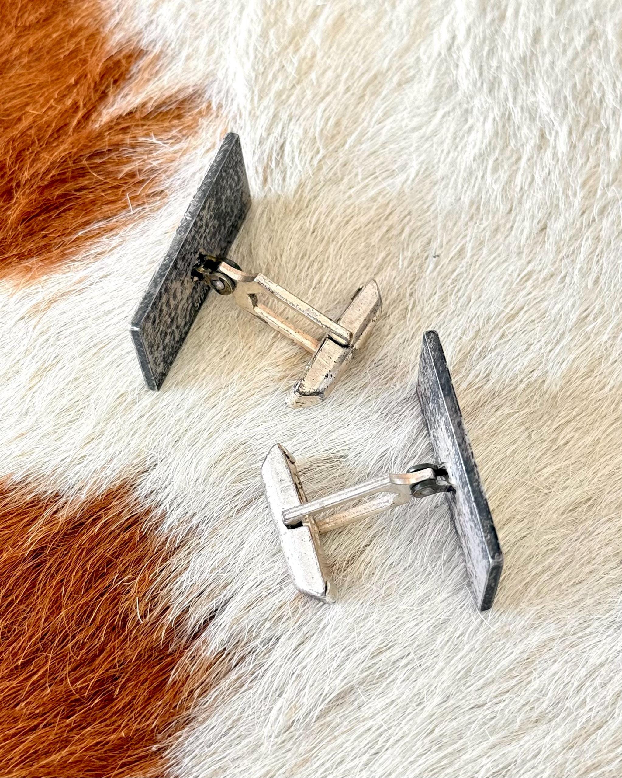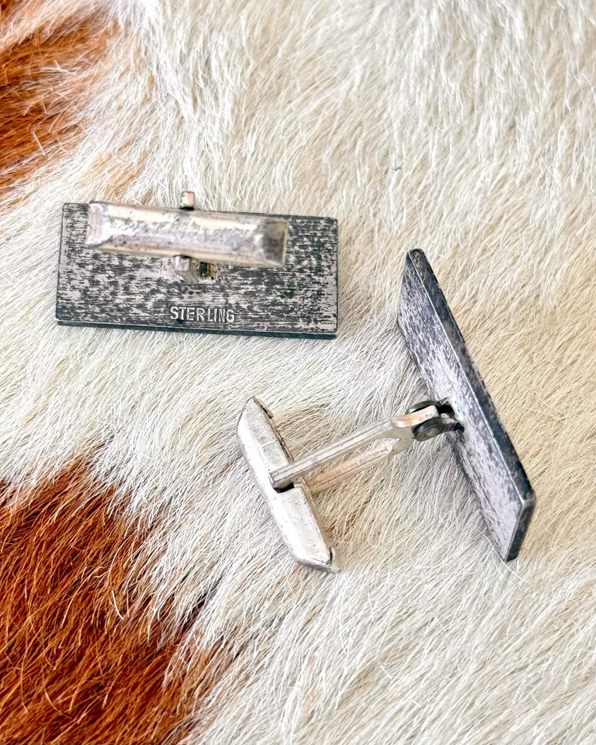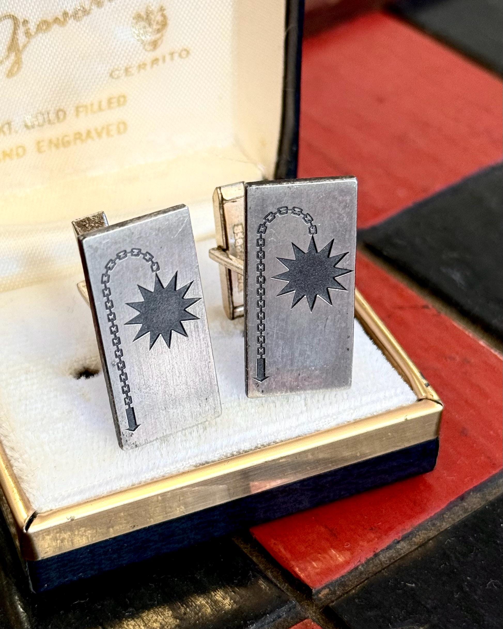 An authentic vintage pair of shirt cufflinks. the faces are crafted of sterling silver and marked on the back. features a midcentury design of a medieval flail pressed into a rectangular shaped face with a brushed finish. the toggles are made from another type of metal with a hinged mechanism.