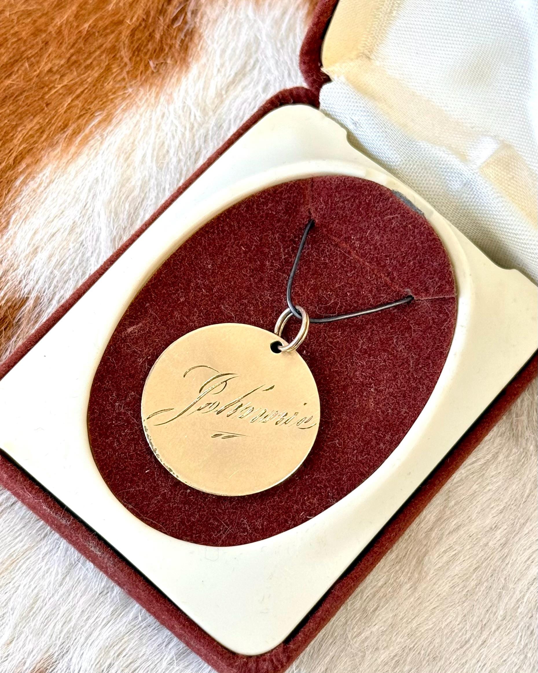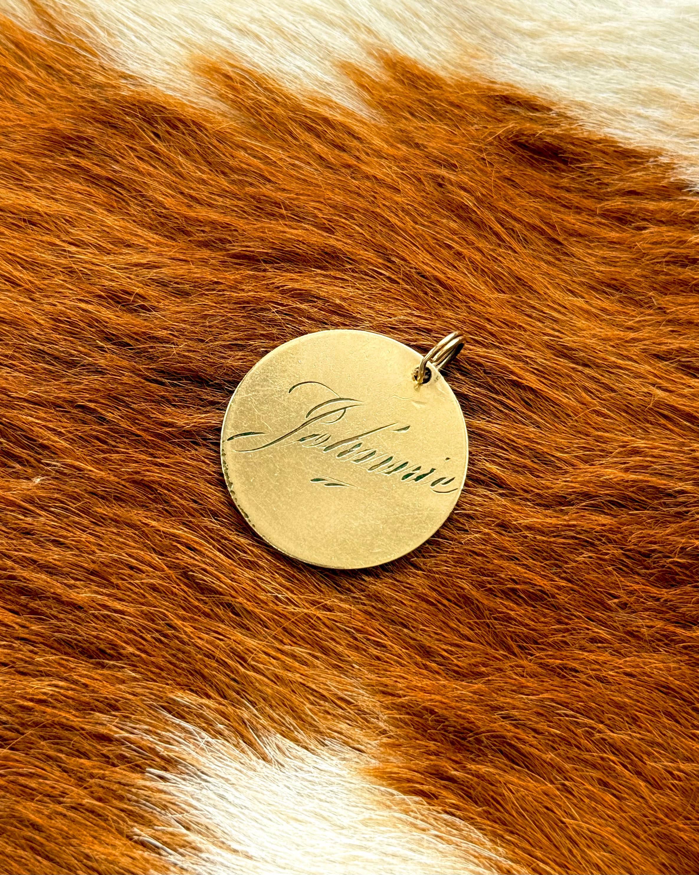 An authentic vintage gold filled disc charm. In the style of a Victorian love token, this piece is engraved on both side with names “Johnnie” &. “Steve. a charming little piece made to remember the names of those you love.