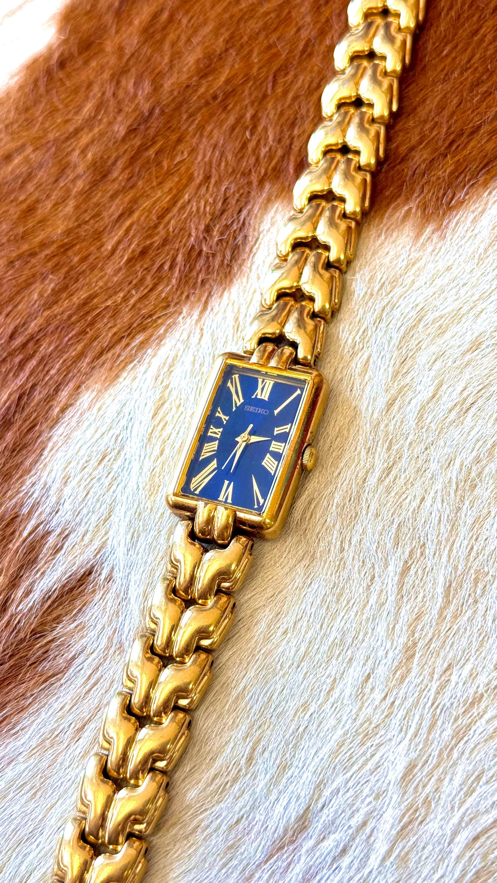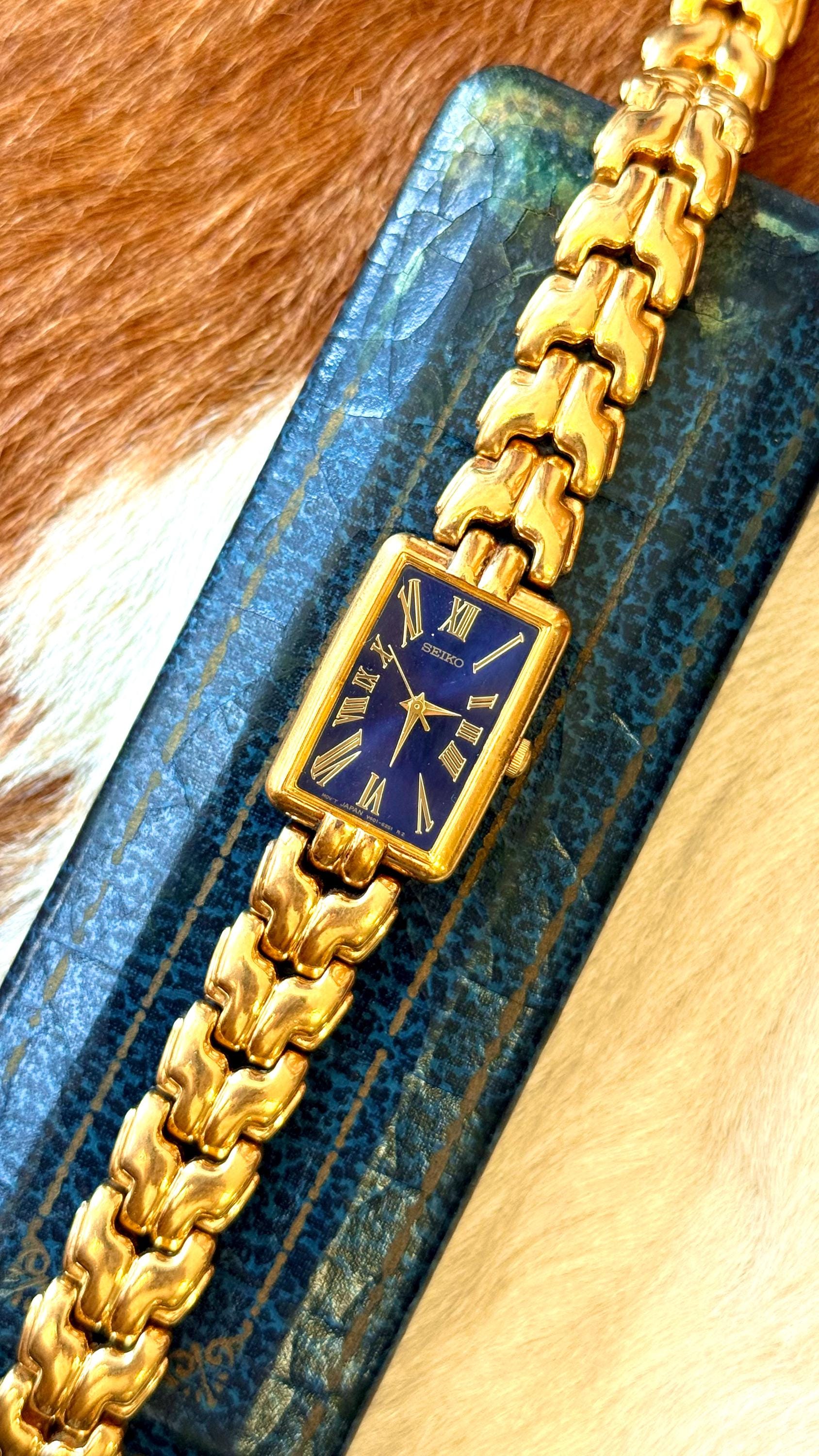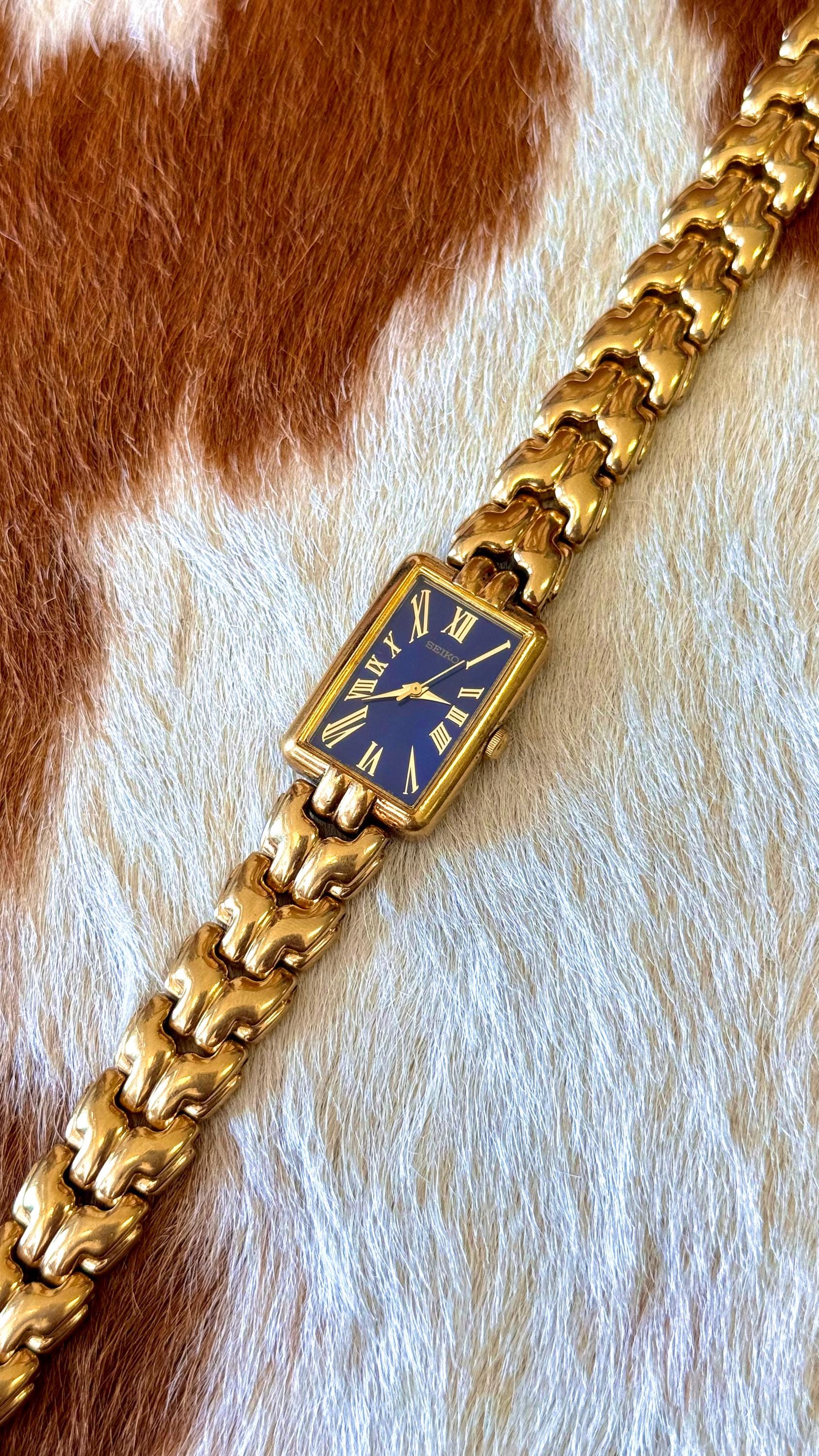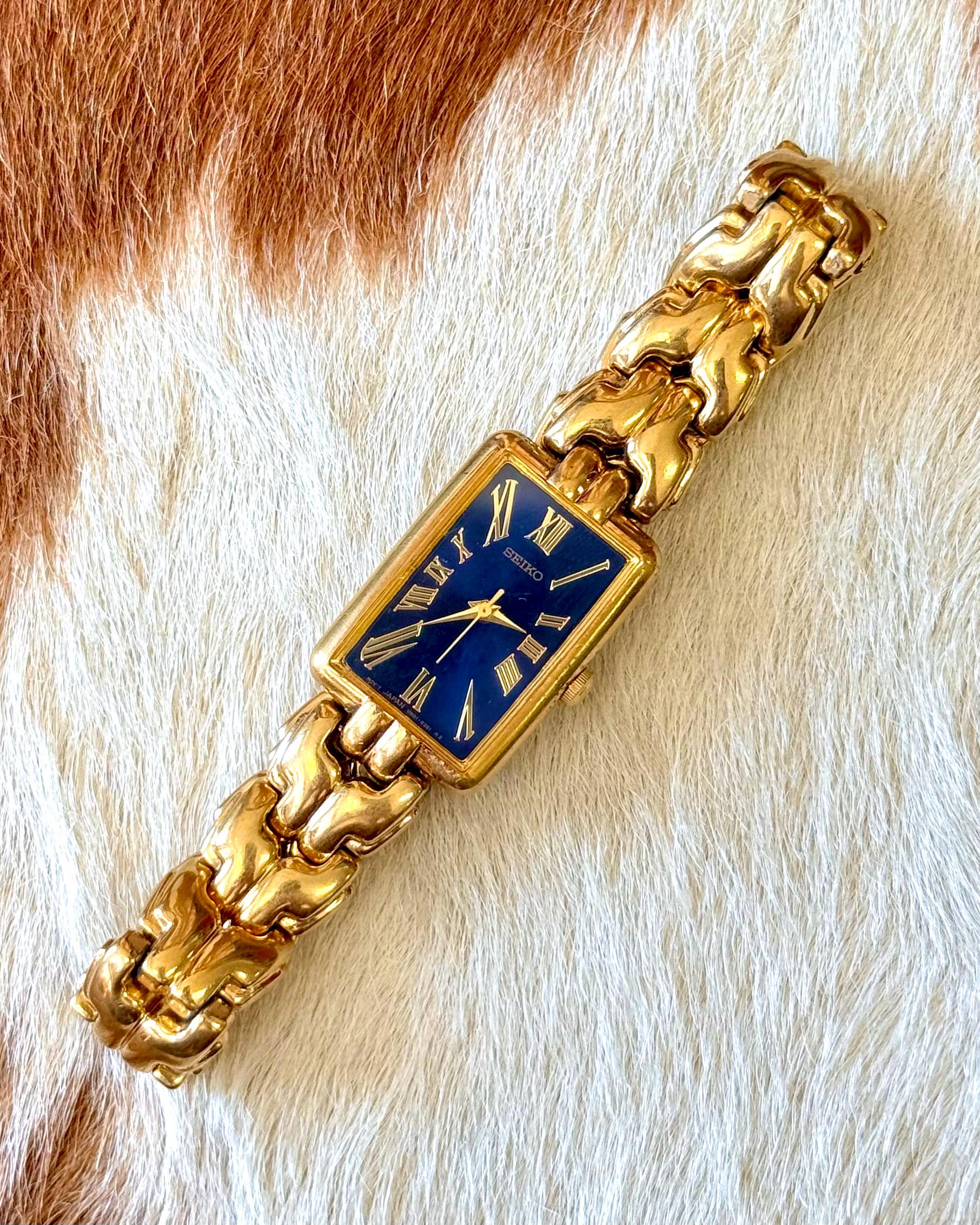 An authentic vintage quartz Seiko watch. features a blue face with gold tone hardware and rectangular bezel. individual links of the bands can easily be removed by any jeweler. an elegant look and excellent craftsmanship!