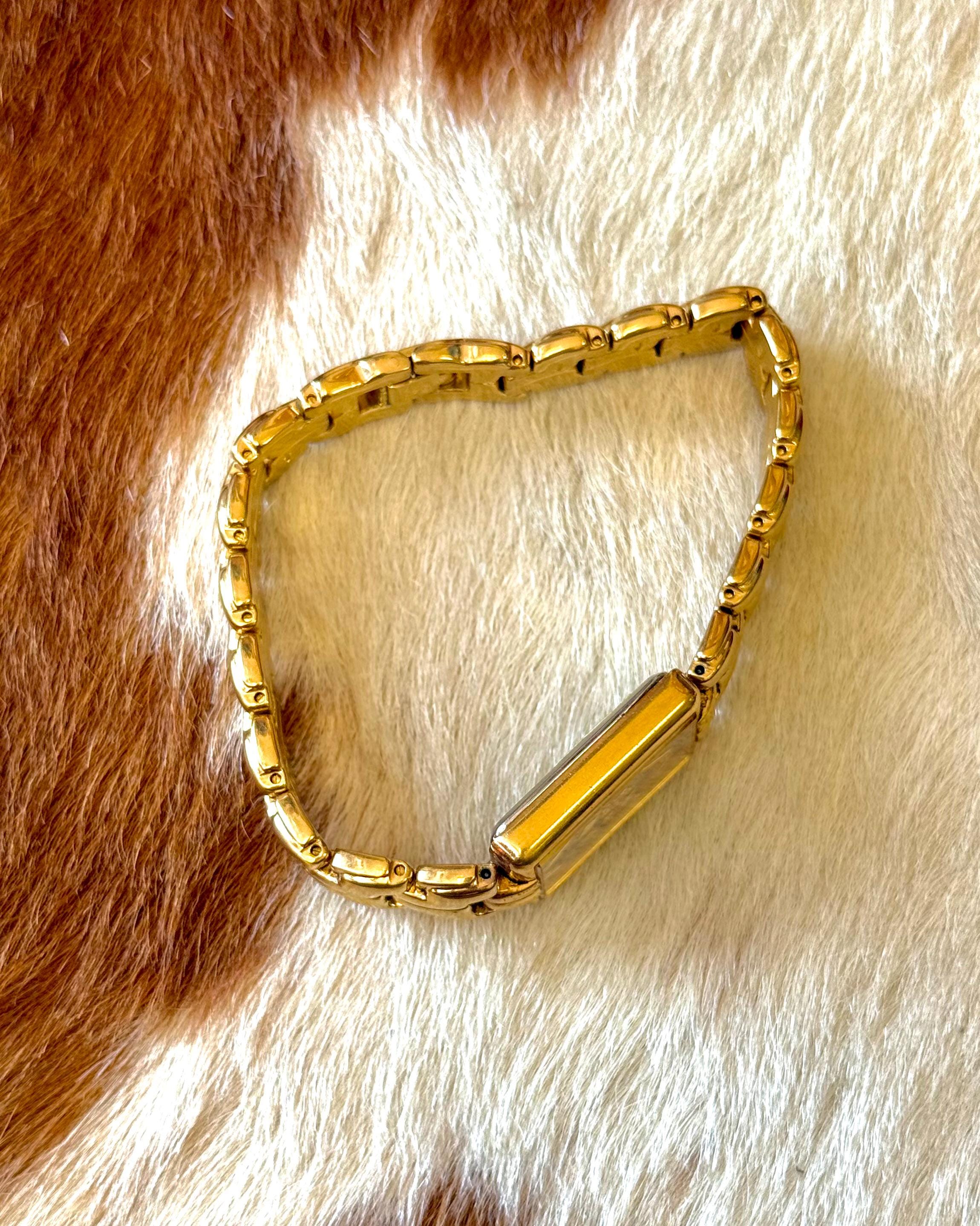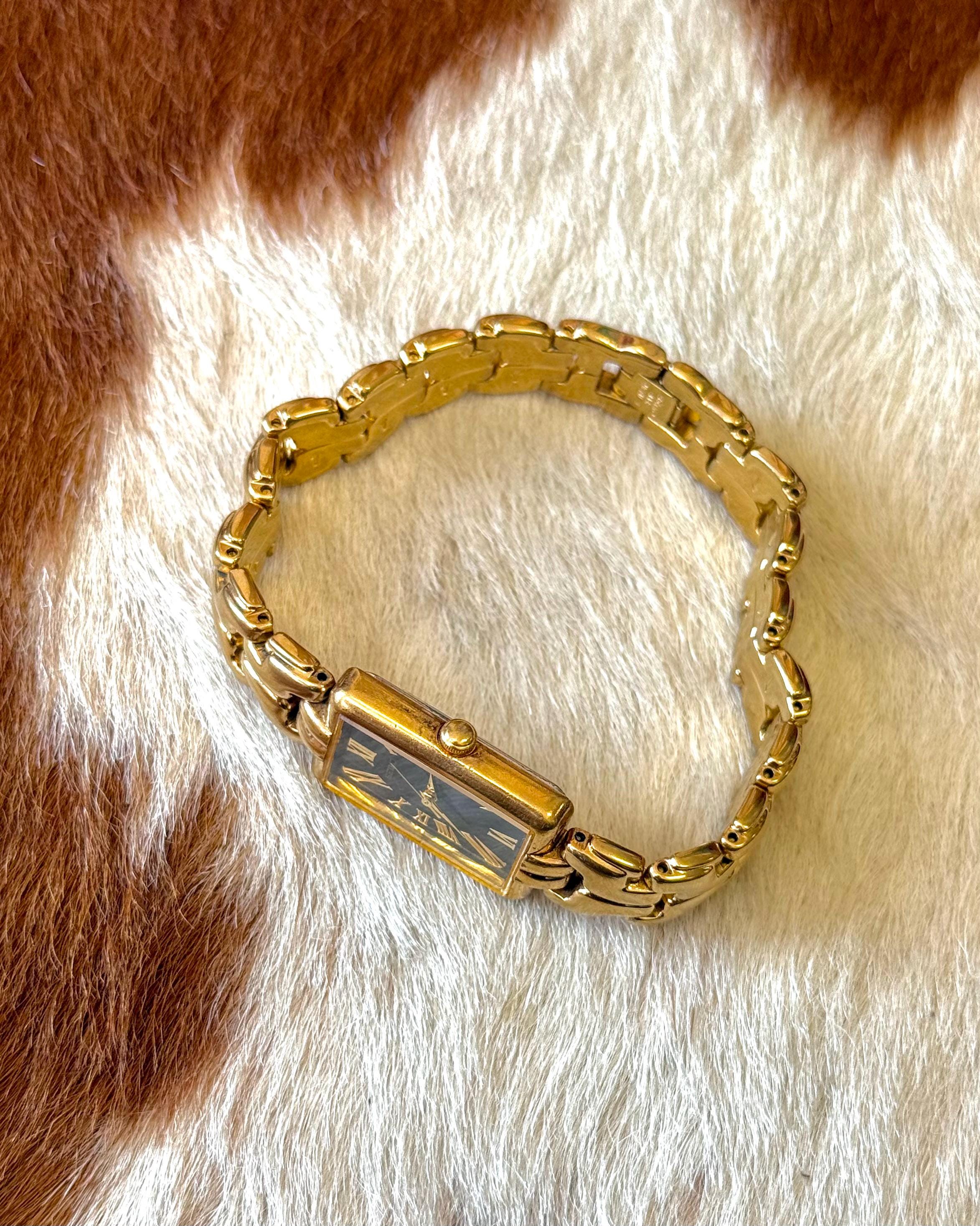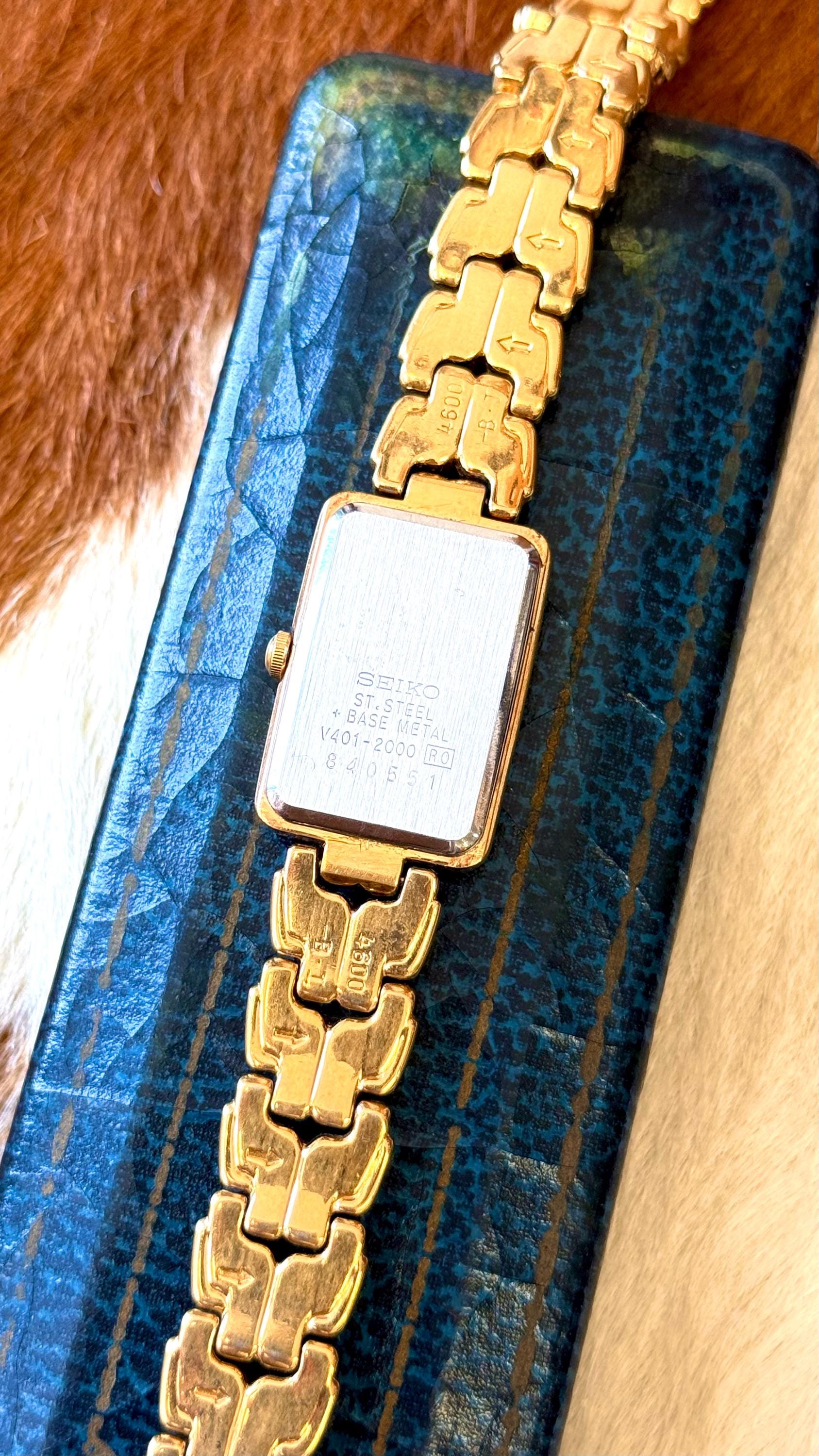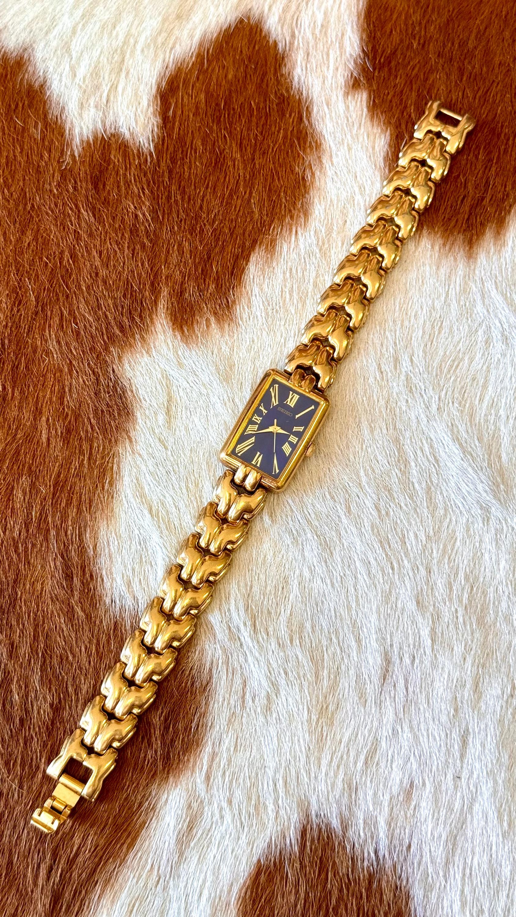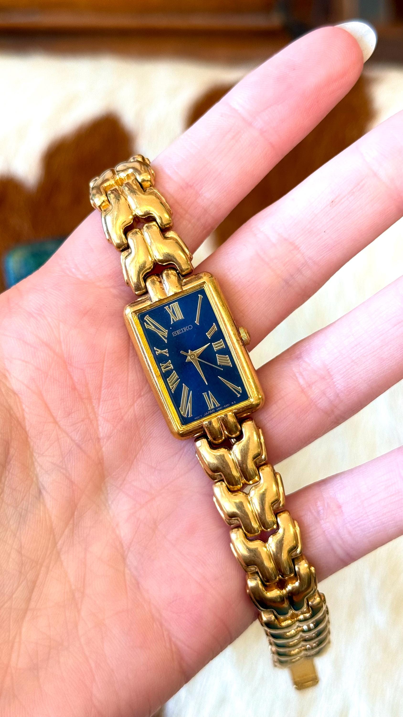 An authentic vintage quartz Seiko watch. features a blue face with gold tone hardware and rectangular bezel. individual links of the bands can easily be removed by any jeweler. an elegant look and excellent craftsmanship!