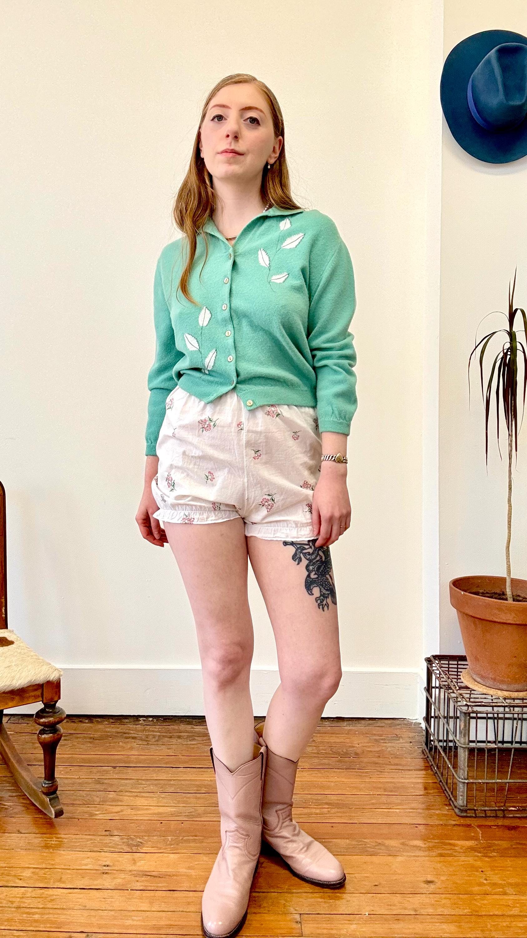 An authentic vintage pair of bloomers. made from a lightweight woven cotton fabric featuring a sweet pink floral print. a brief cut with elastic waist and elastic ruffled leg openings. somewhat semi sheer, style for modern day like a pair of shorts over a body suit or wear as sleepwear or to add coverage under a skirt as originally intended.
