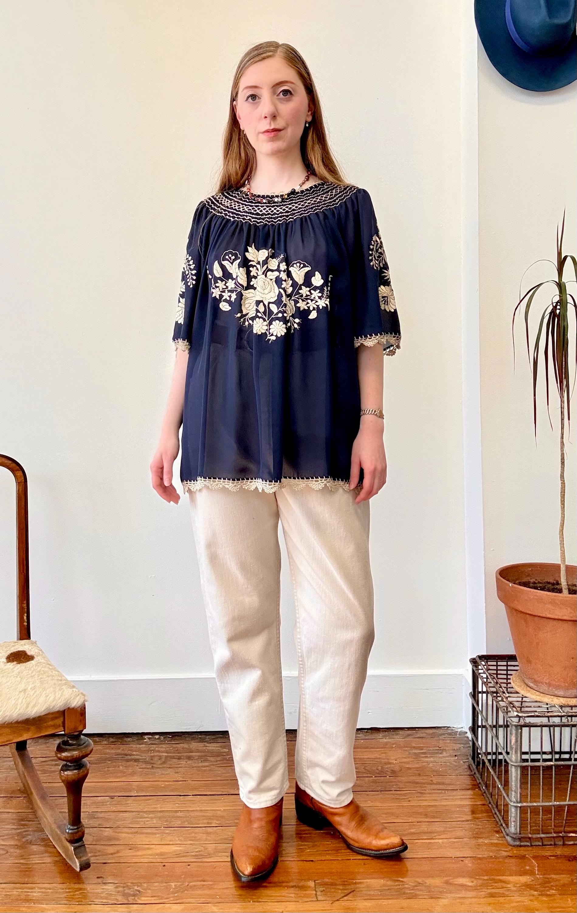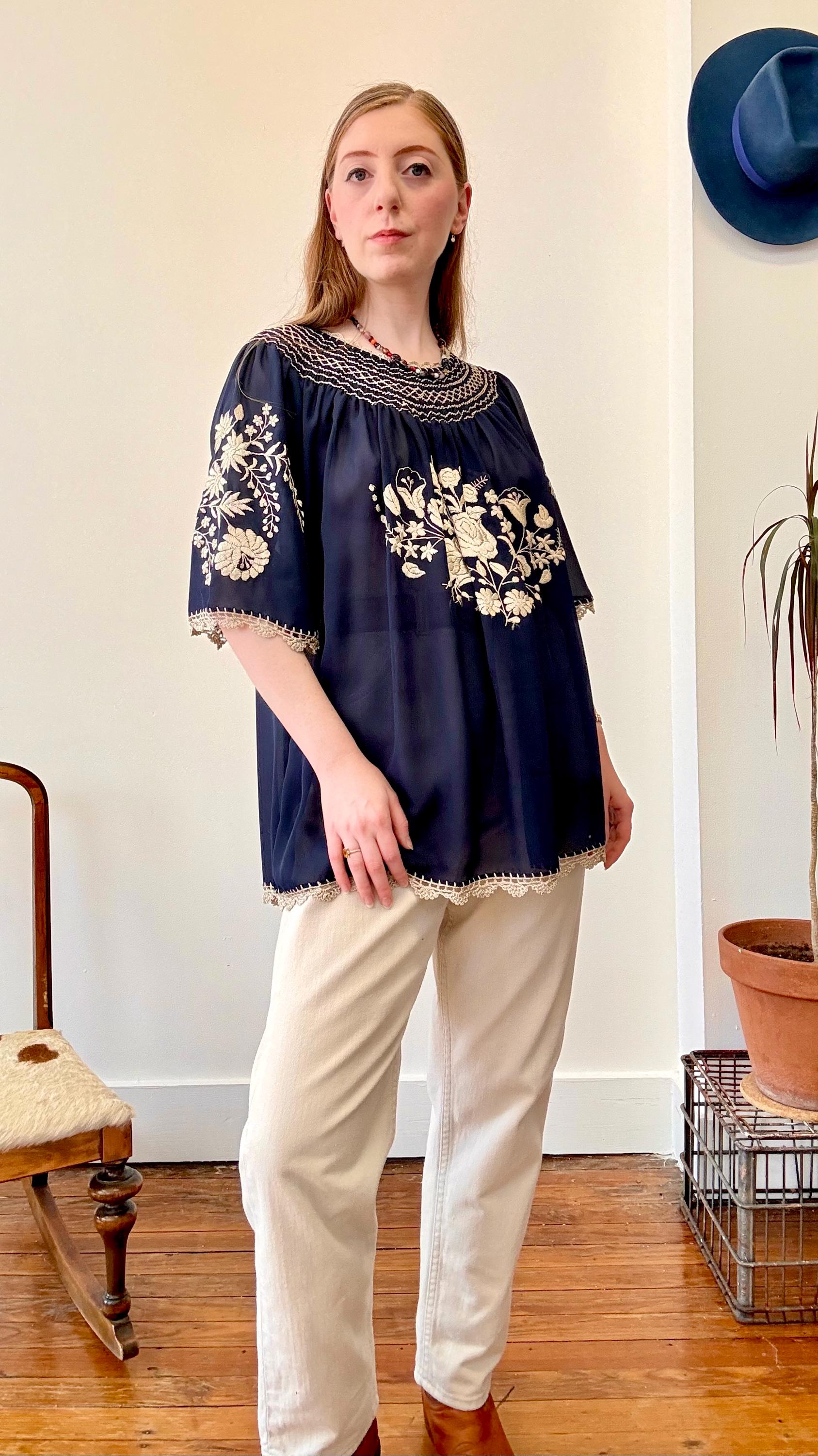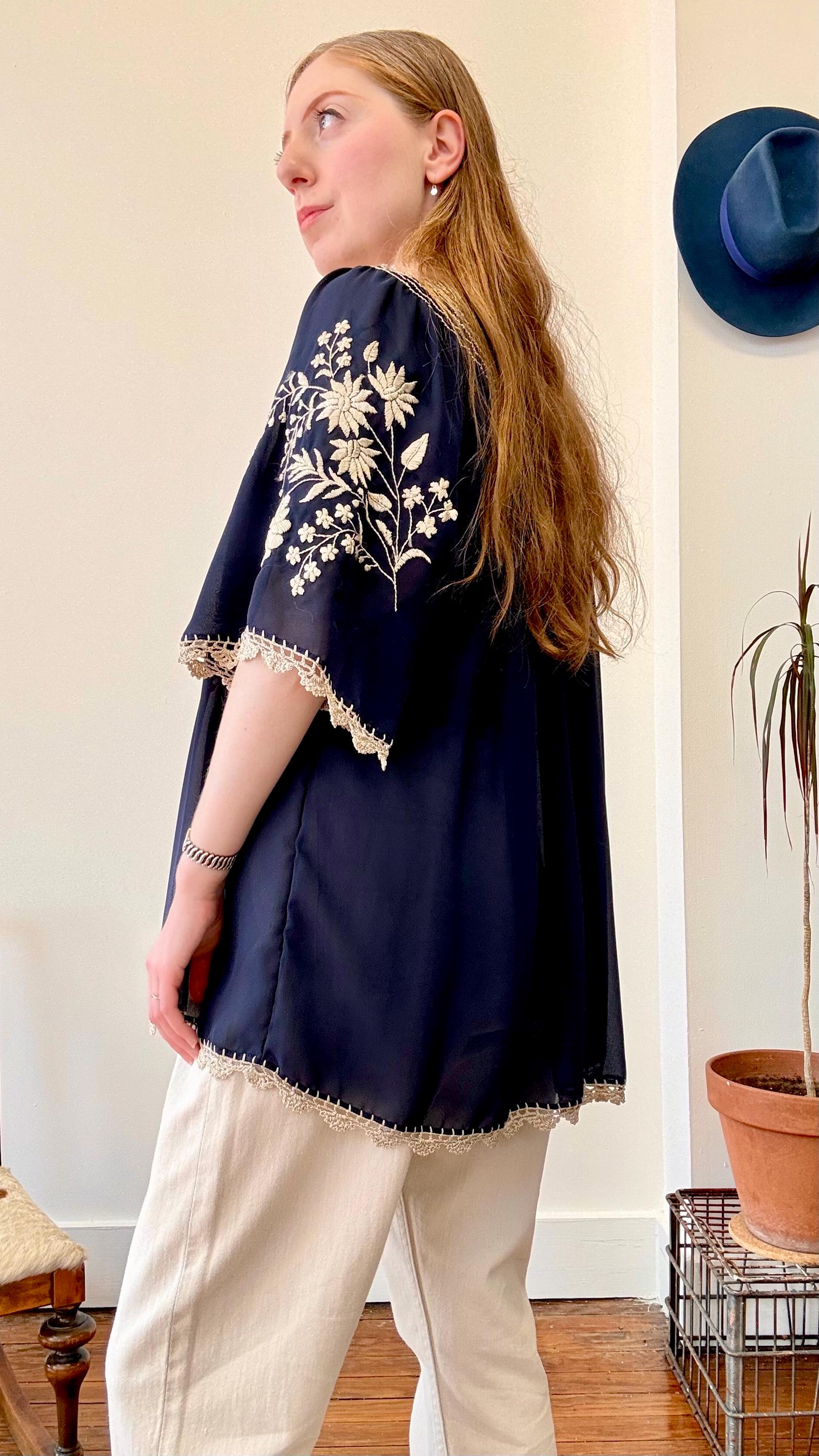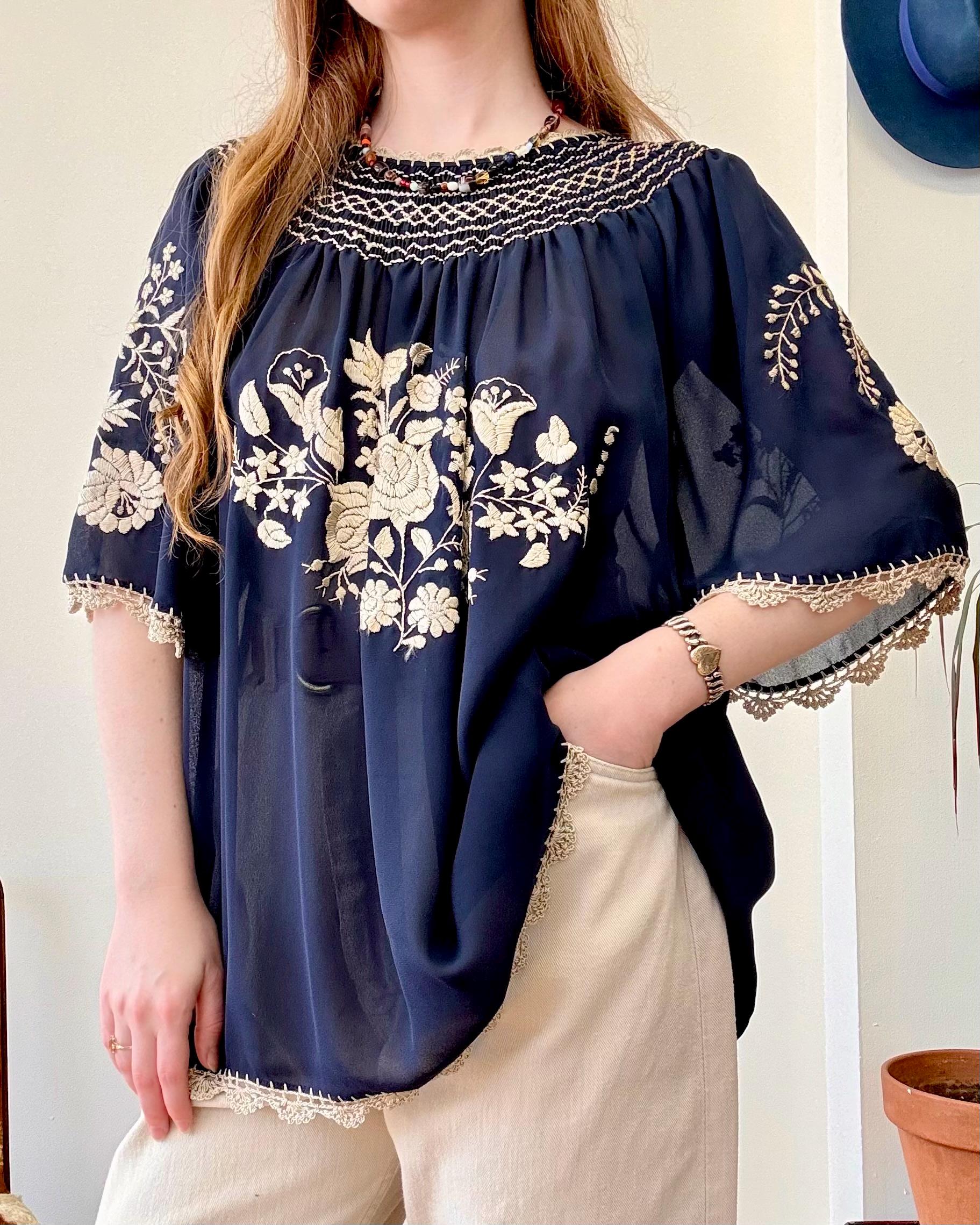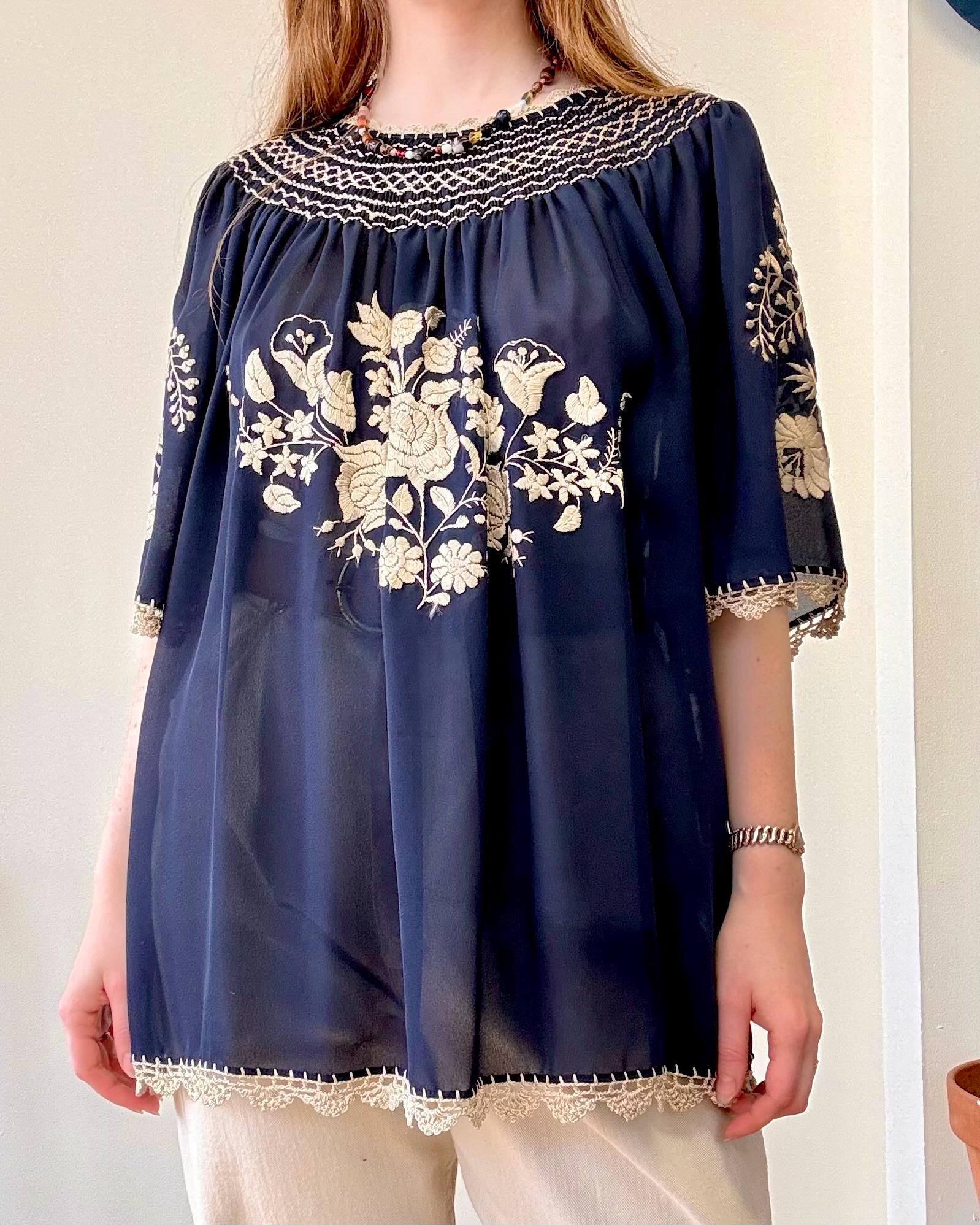 An authentic vintage blouse. an entirely handmade item featuring a smocked neckline, embroidered floral decorations, and a crochet lace trim. fits loose and oversized. crafted from a sheer crepe fabric