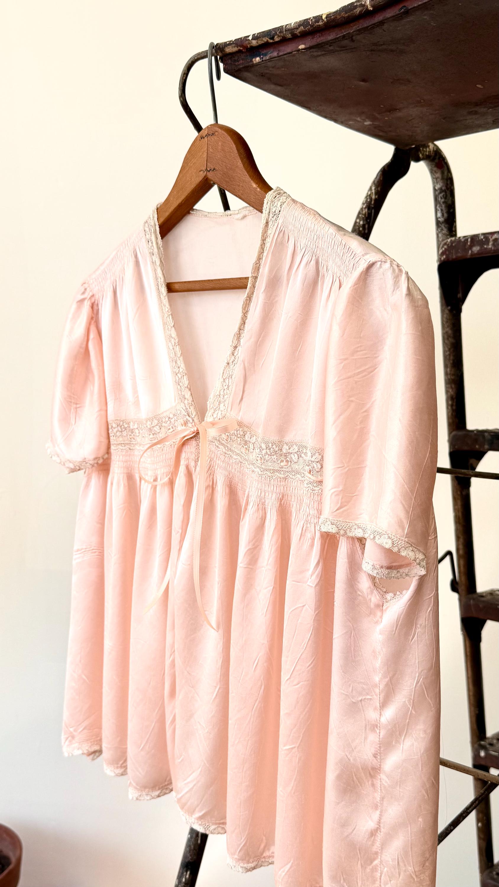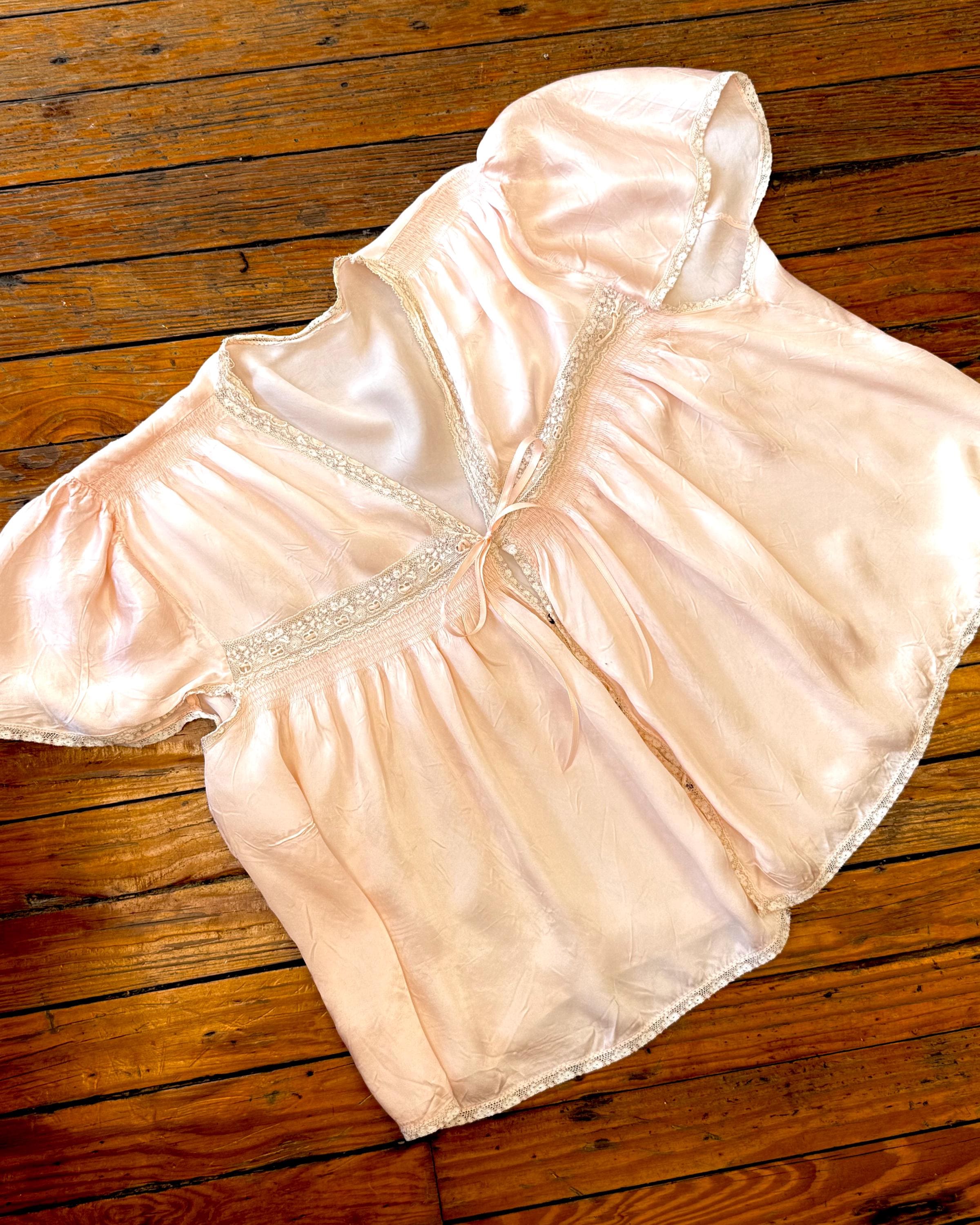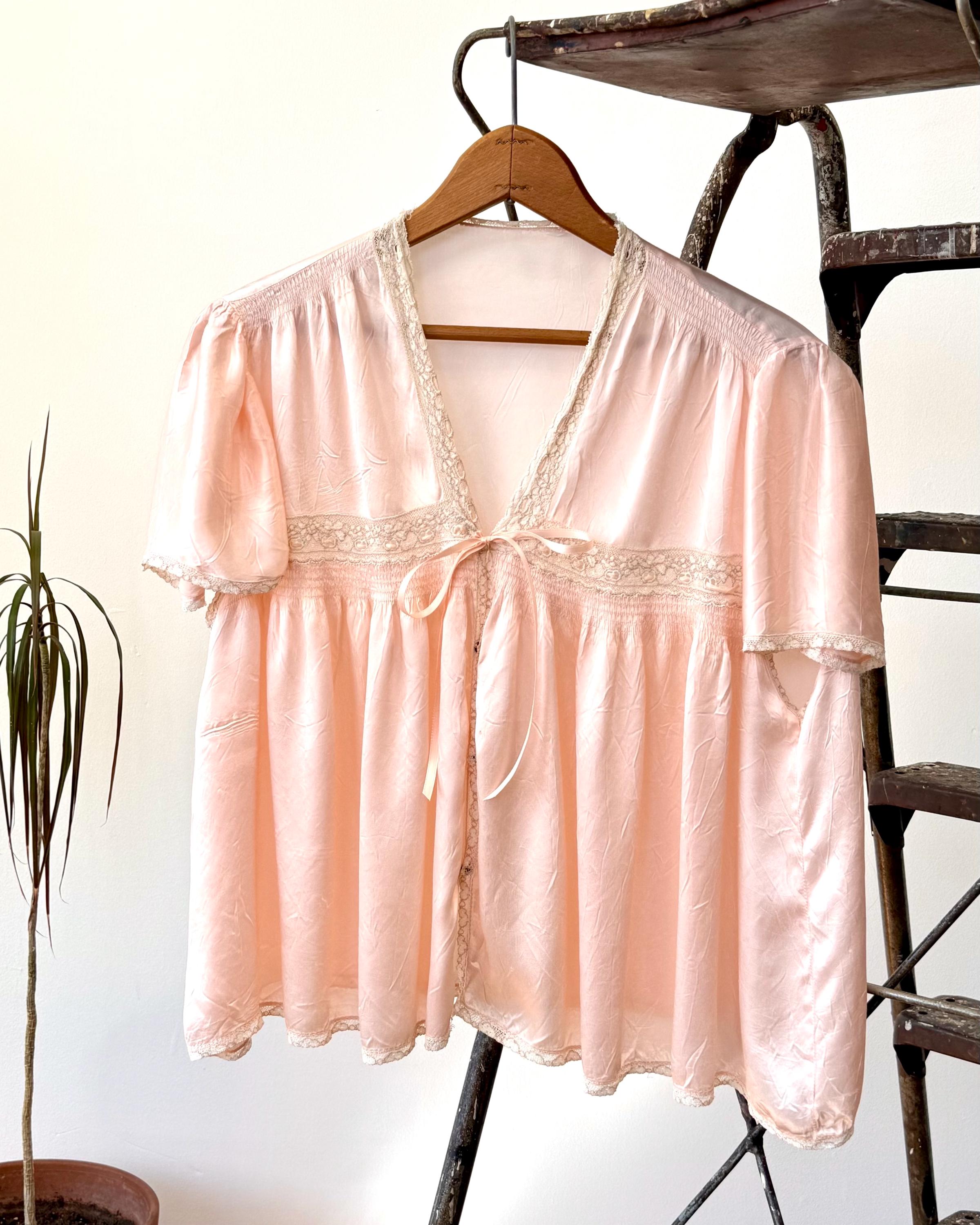 An authentic vintage blouse. originally called a bed jacket worn as loungewear or sleep wear. crafted from fine satin silk in a ballet slipper hue with delicate lace trim. features an snap front closure added by the original owner and a functional ribbon tie detail.