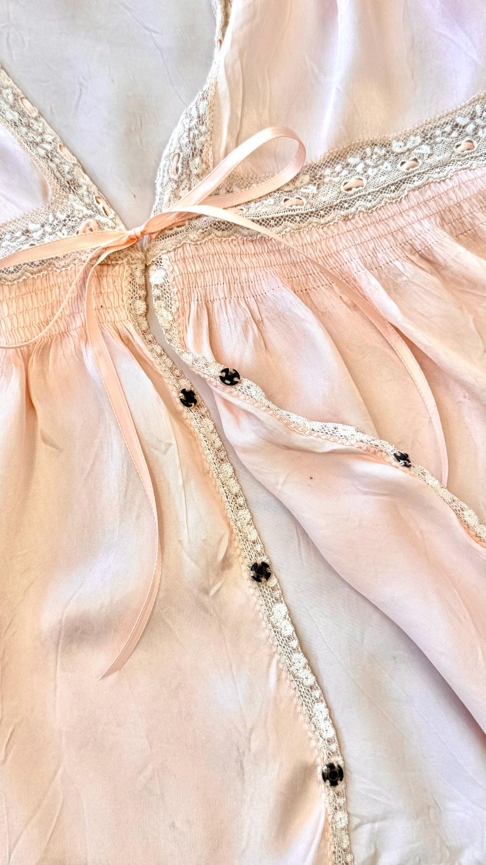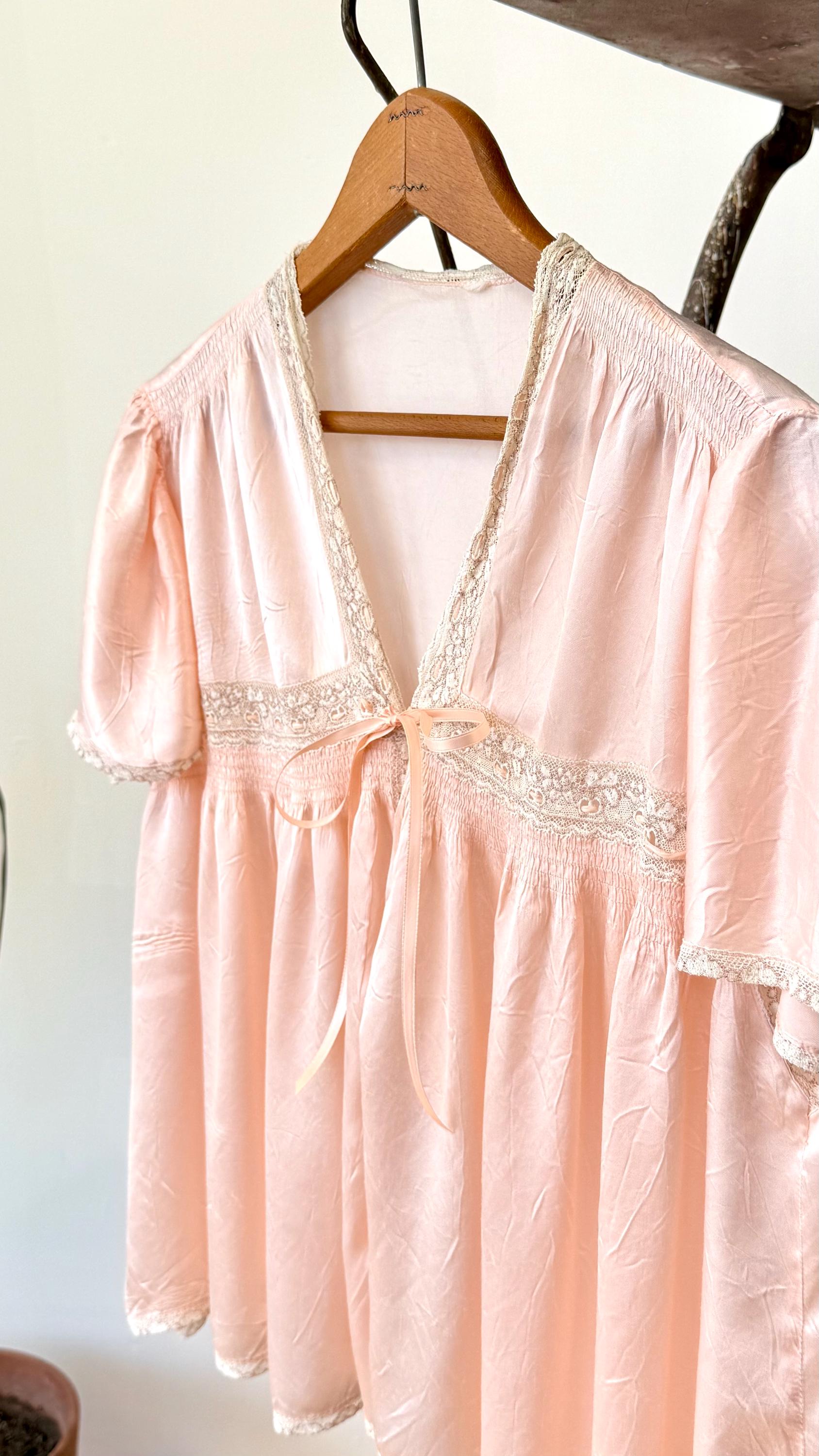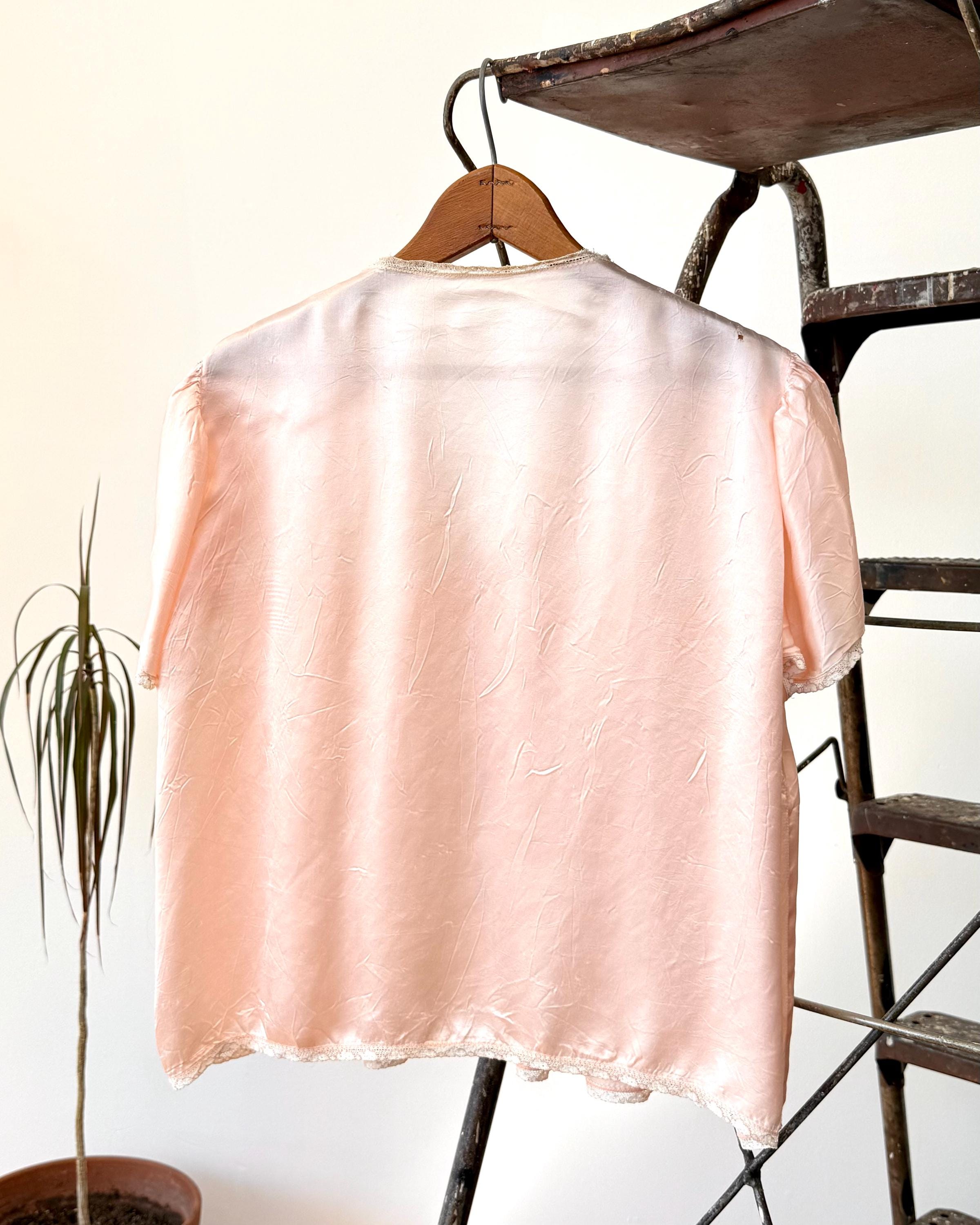 An authentic vintage blouse. originally called a bed jacket worn as loungewear or sleep wear. crafted from fine satin silk in a ballet slipper hue with delicate lace trim. features an snap front closure added by the original owner and a functional ribbon tie detail.