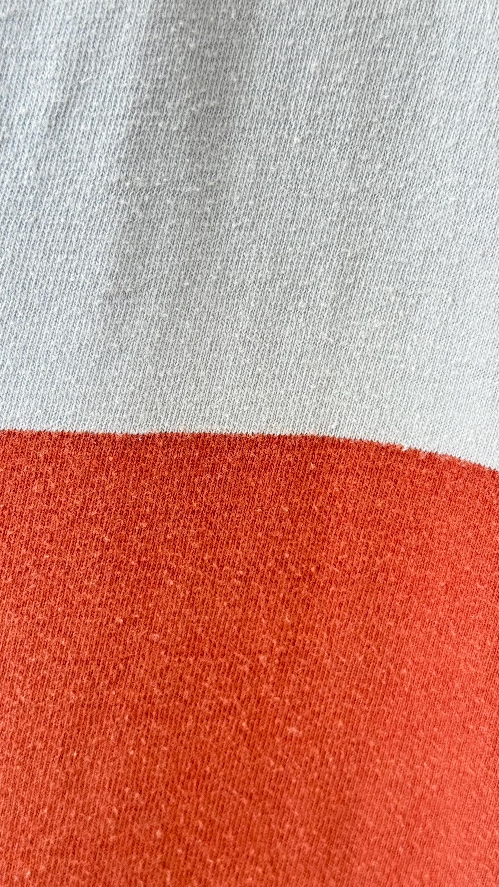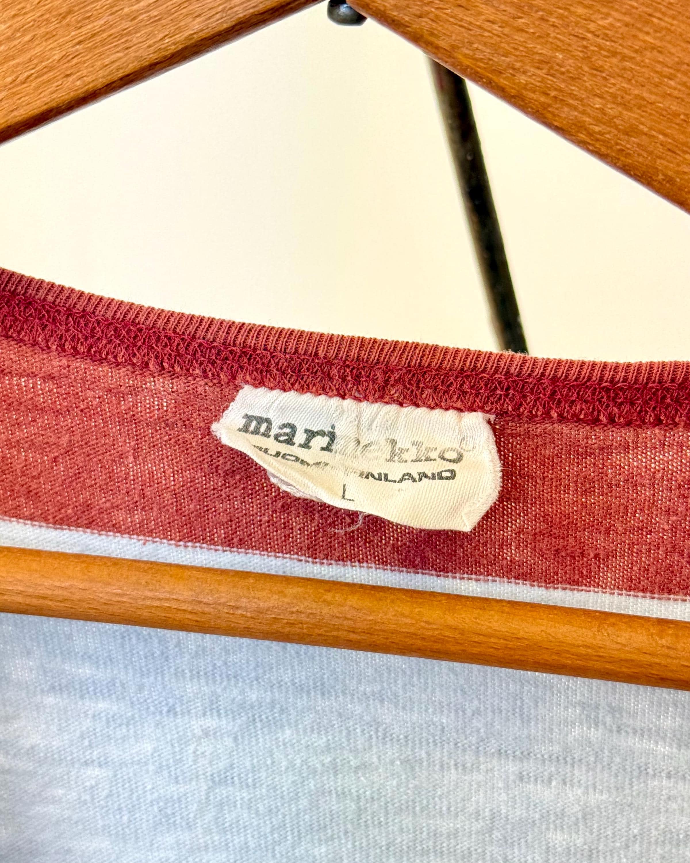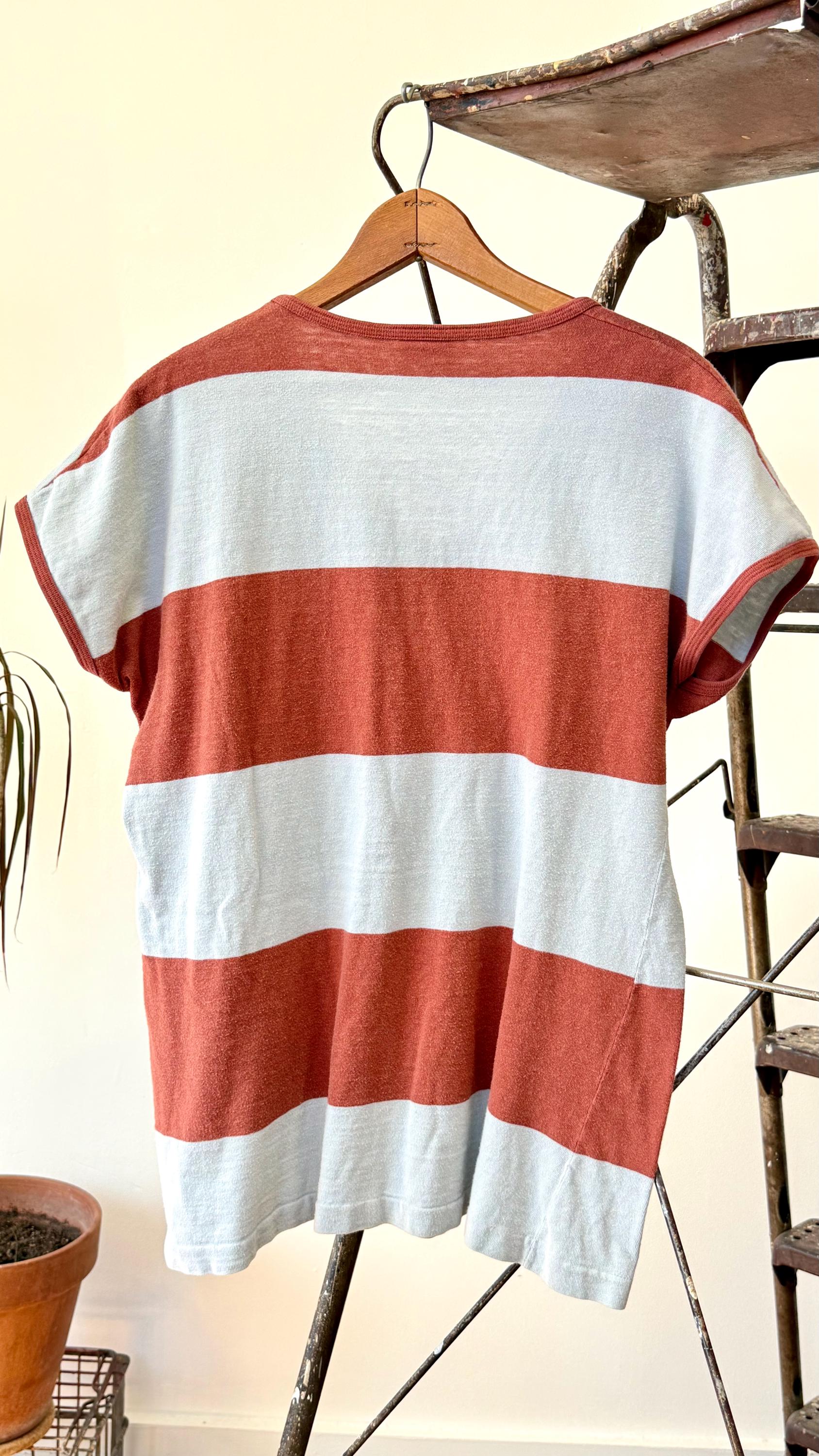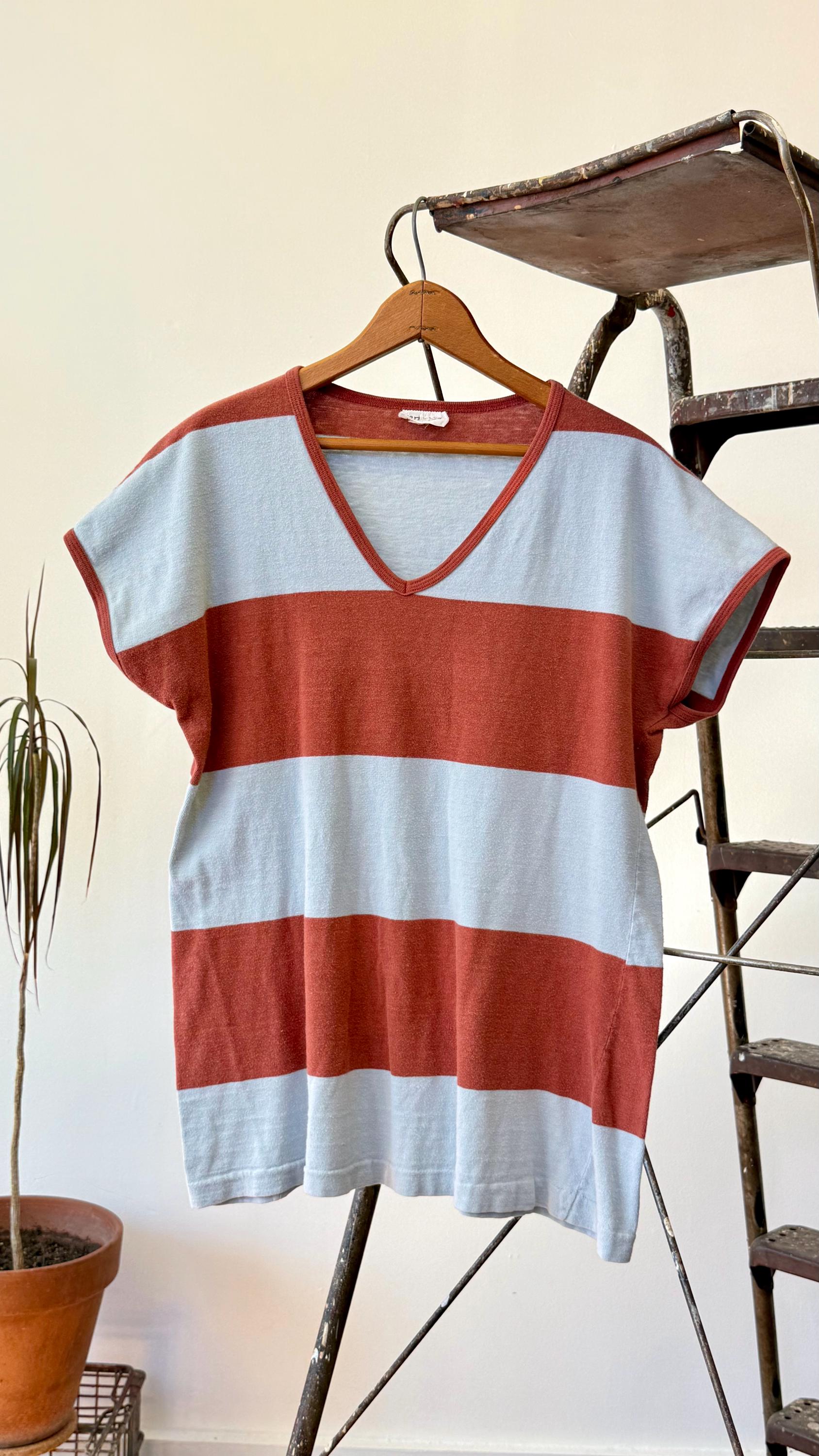An authentic vintage t shirt by Finnish designer Marimekko. features the “galleria” stripe pattern in a soft powder blue and cinnamon hues. this feminine tee is cut with a dolman cap sleeve and a V neckline.