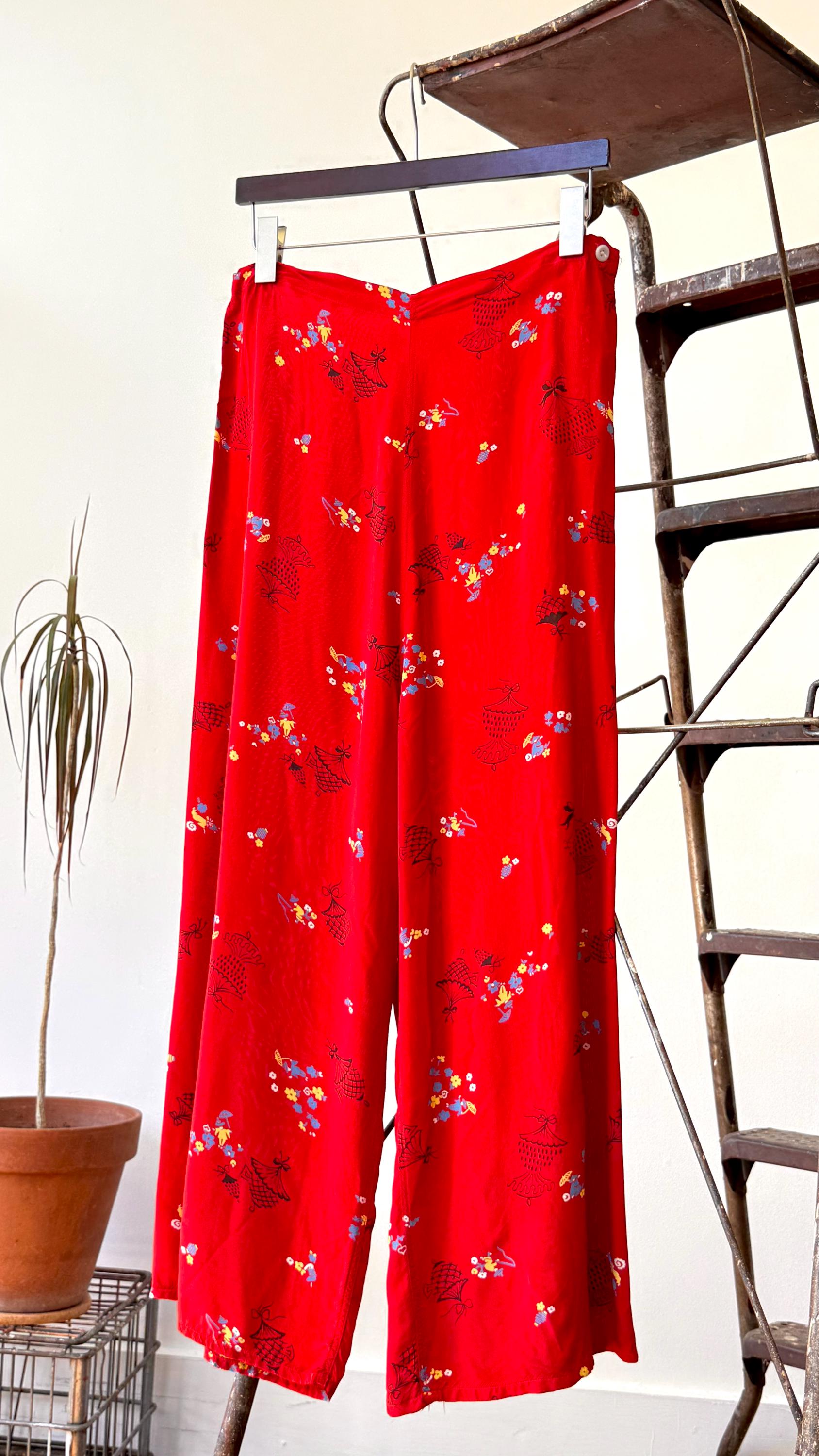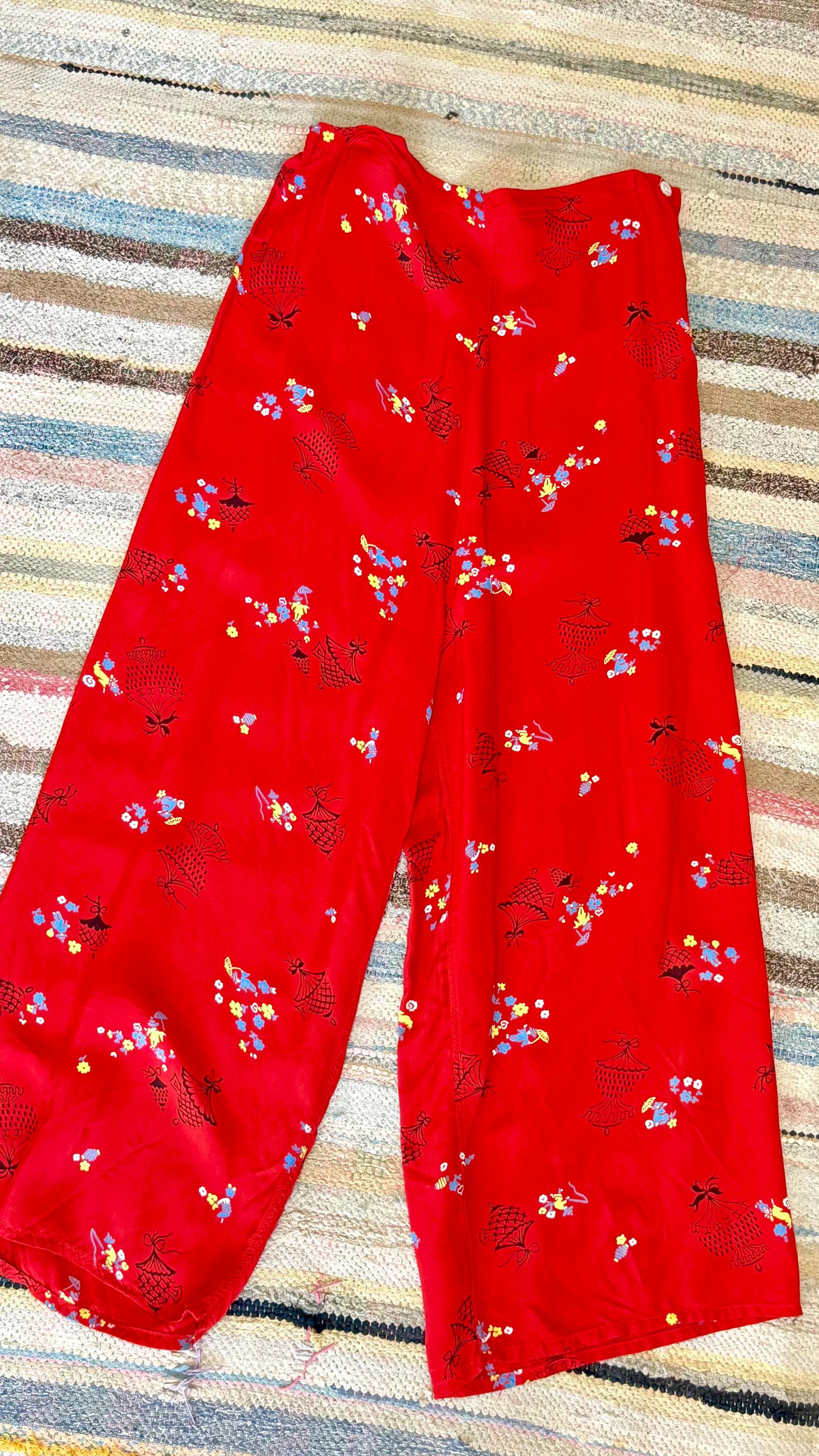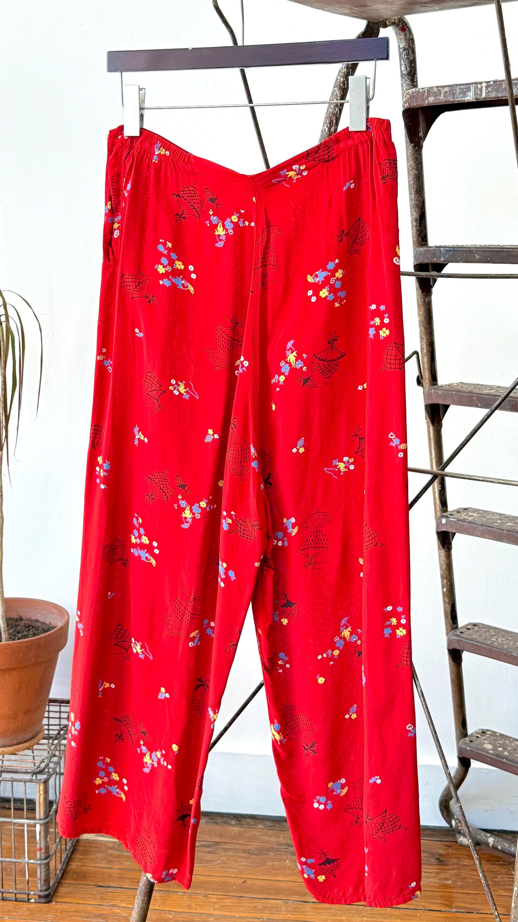 An authentic vintage pair of printed rayon pants. originally designed as pajamas but can be styled for modern day at home as loungewear or out as silky wide leg slacks. features a feminine novelty print featuring Asian paper lantern and garden motifs in a bright cherry background. fits with an ultra high rise, elastic waistline and side button detail.