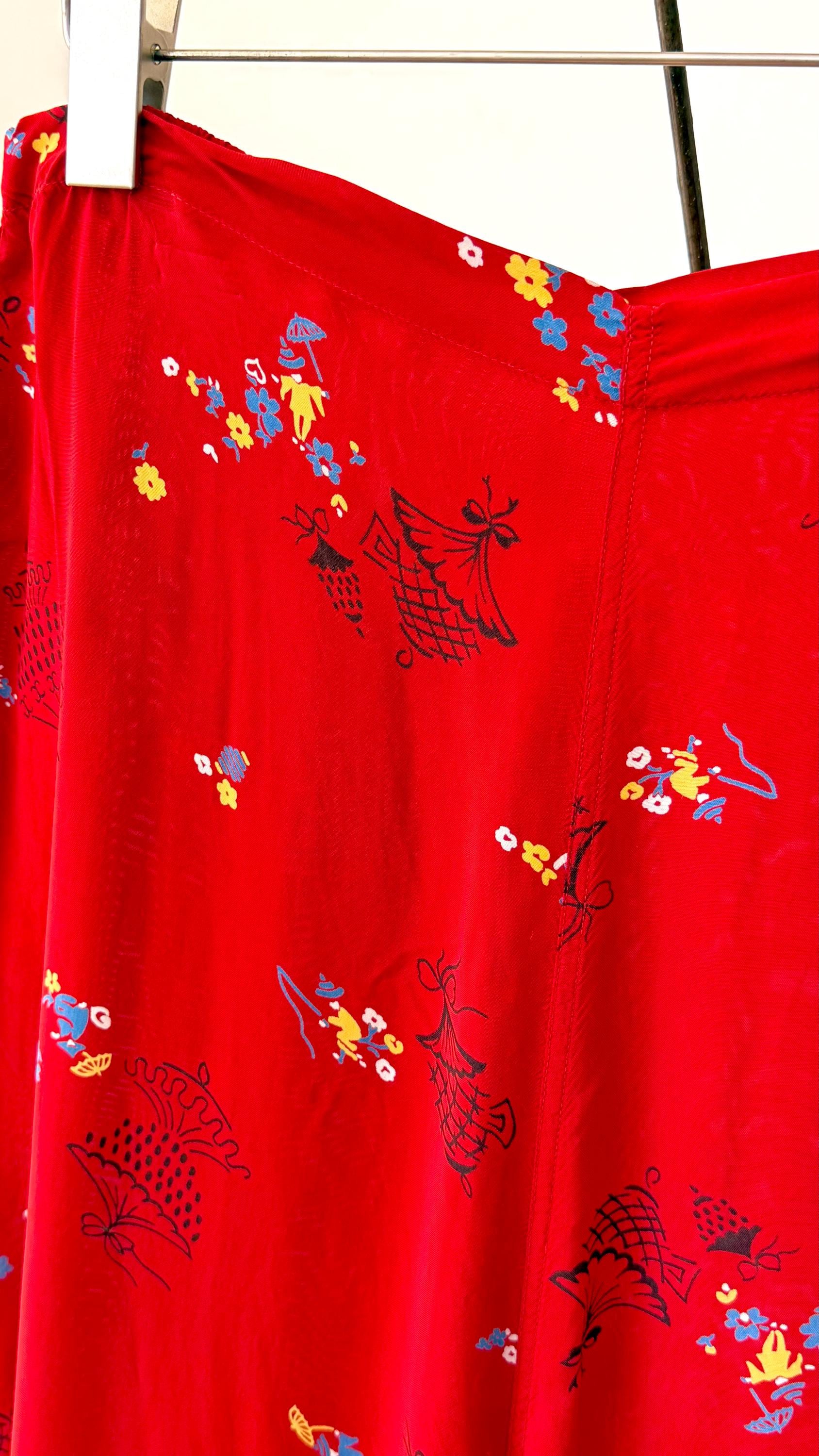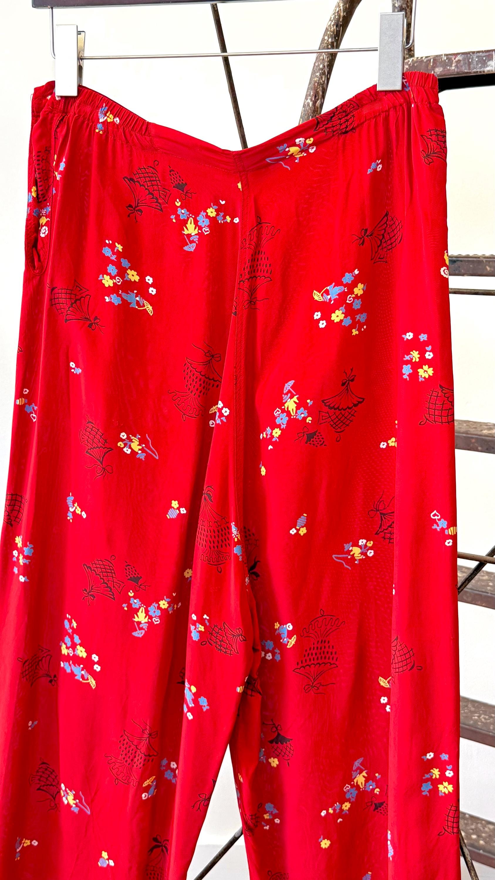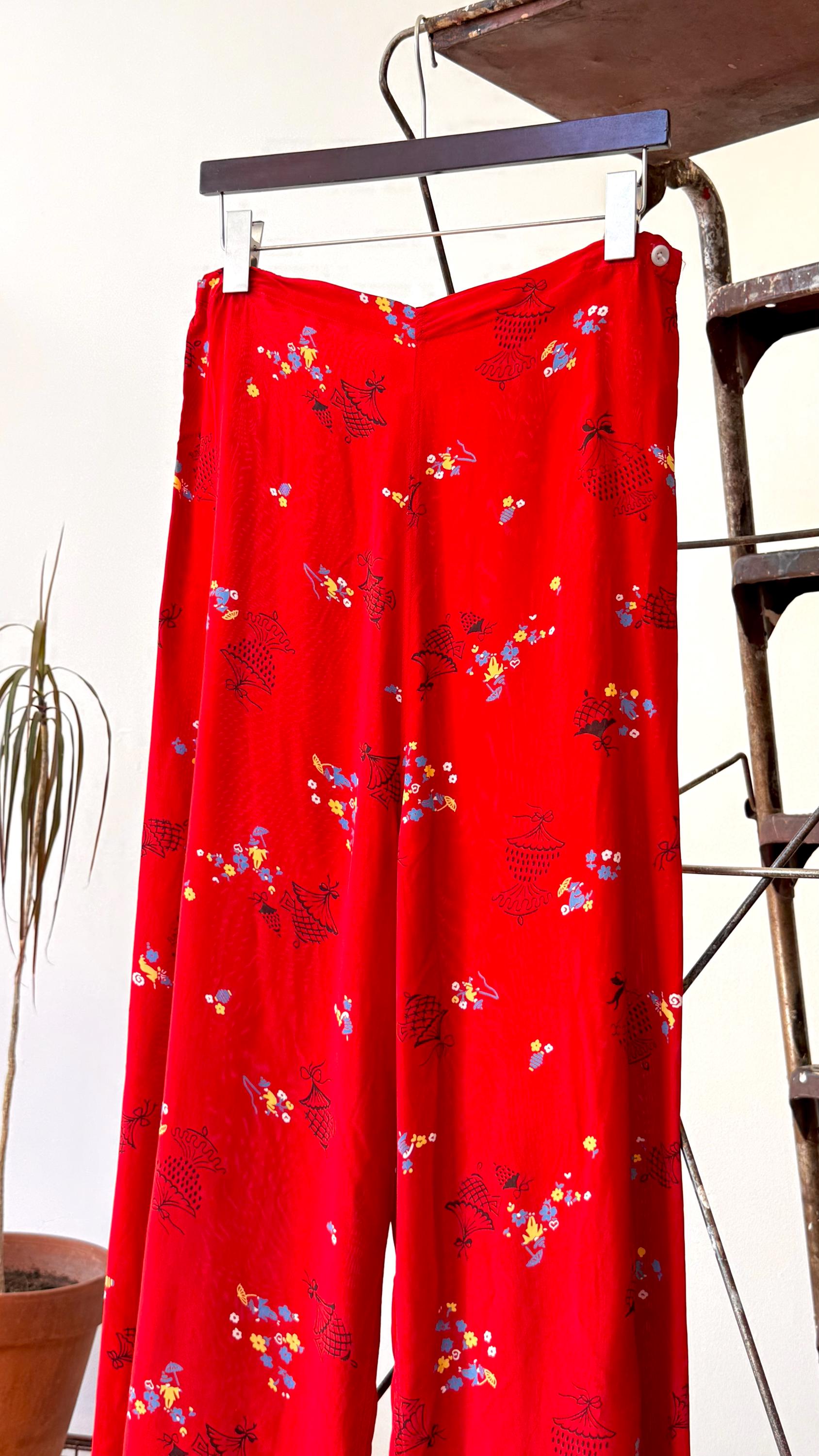 An authentic vintage pair of printed rayon pants. originally designed as pajamas but can be styled for modern day at home as loungewear or out as silky wide leg slacks. features a feminine novelty print featuring Asian paper lantern and garden motifs in a bright cherry background. fits with an ultra high rise, elastic waistline and side button detail.