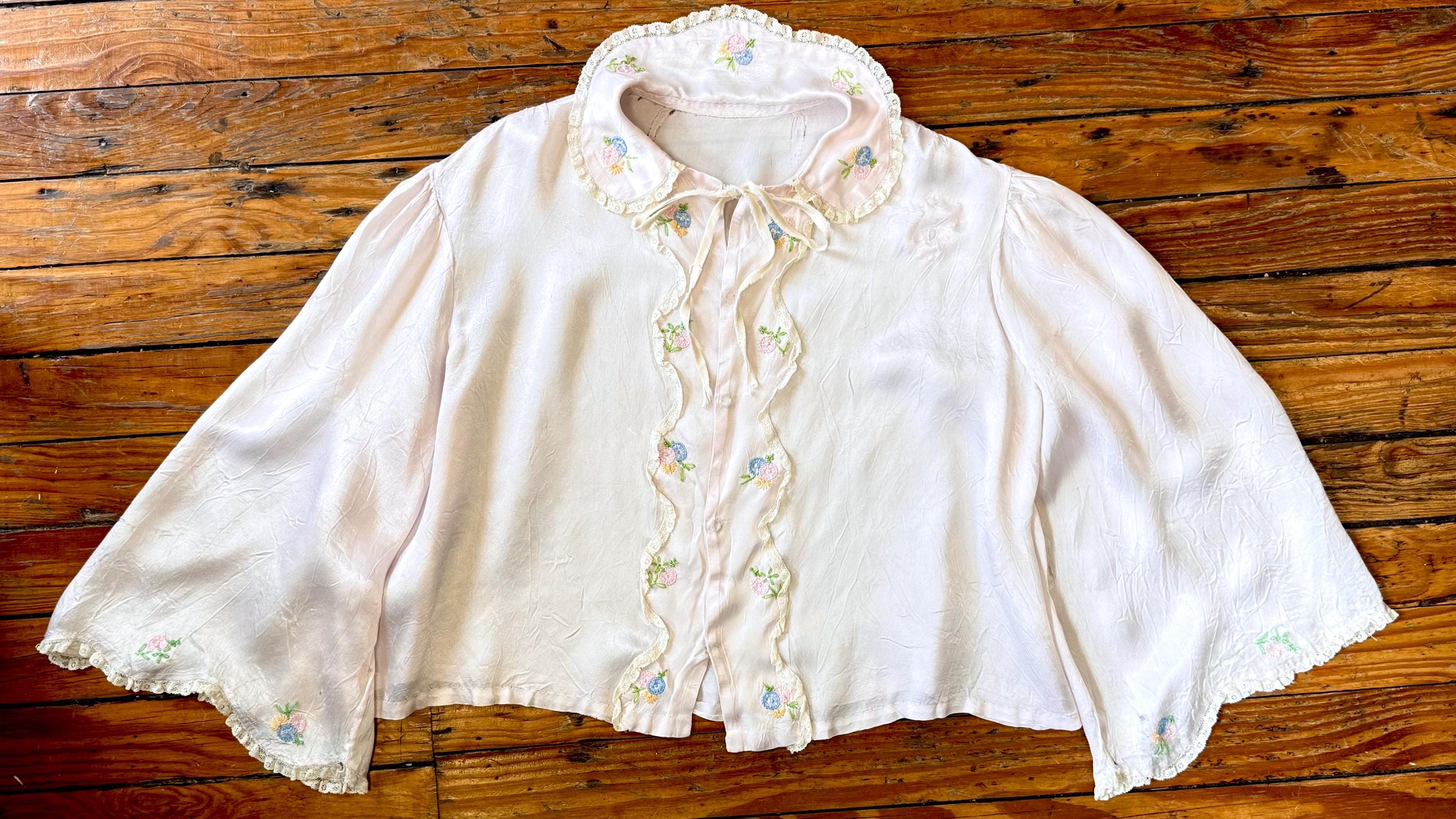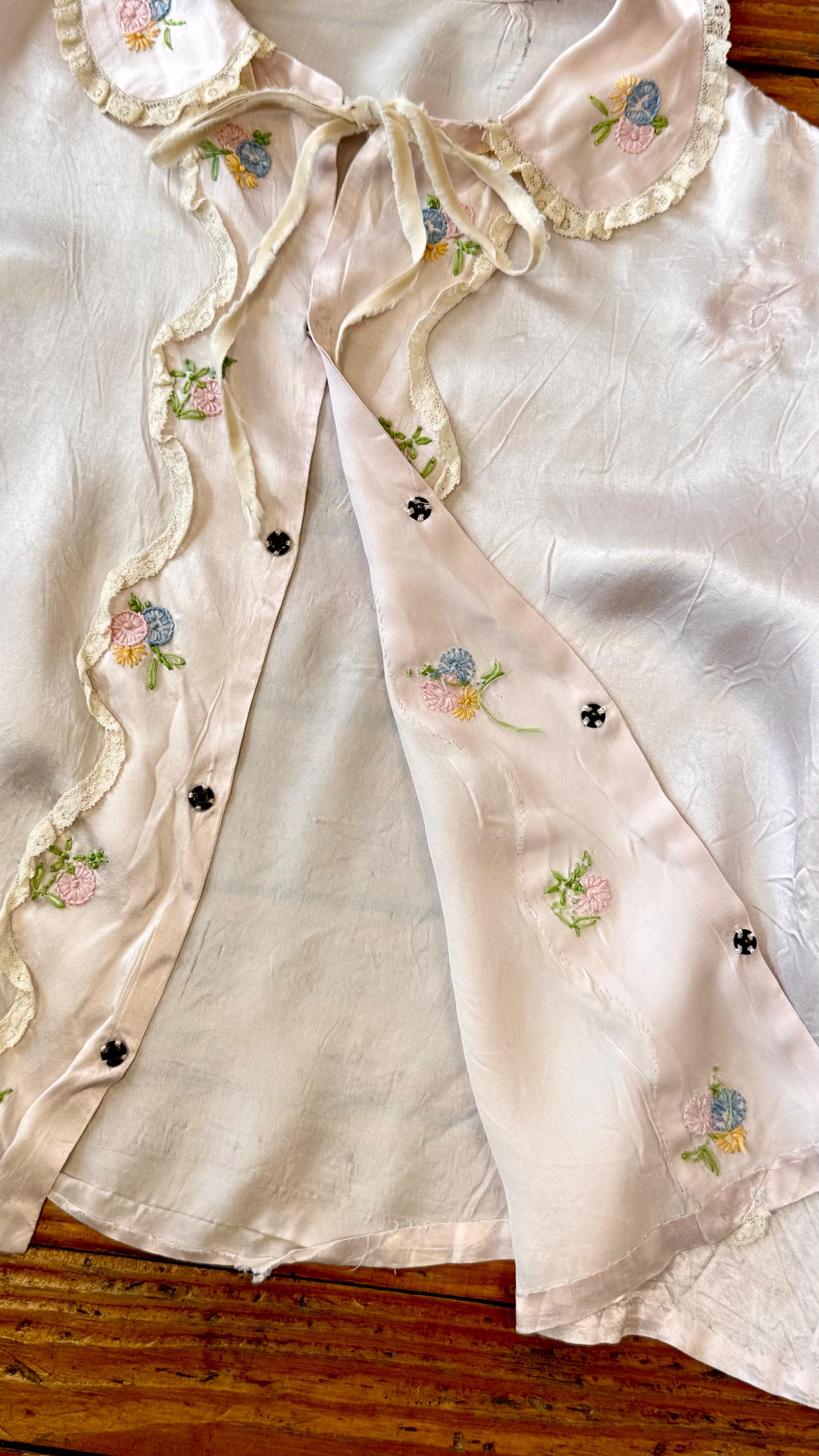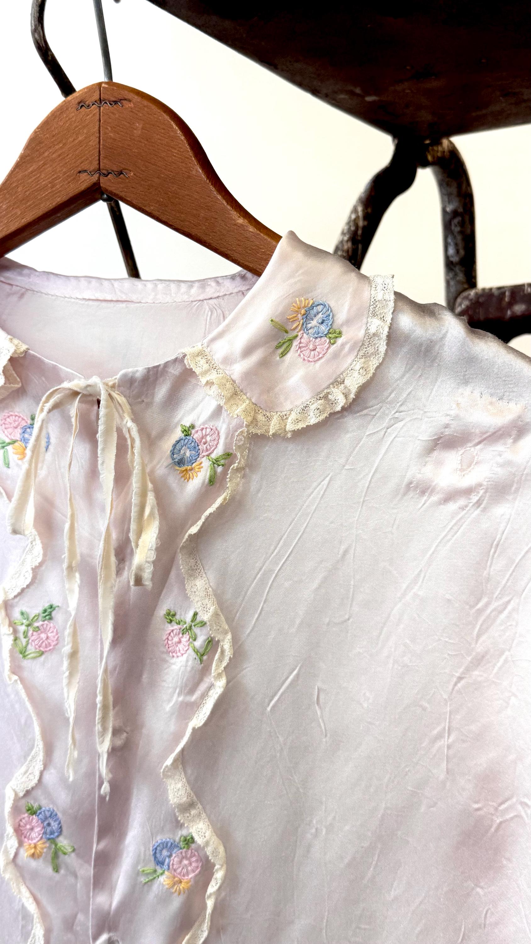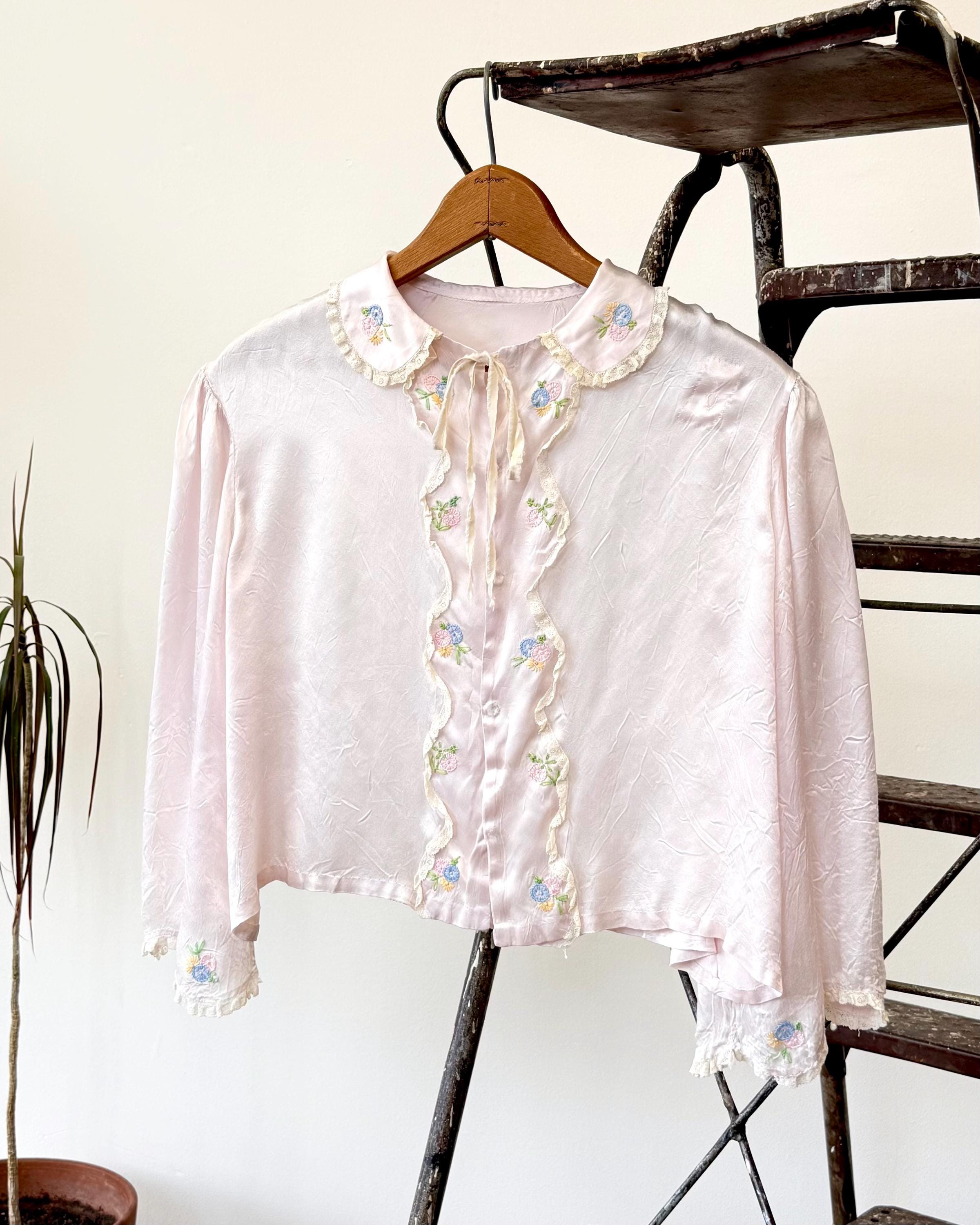 An authentic vintage blouse. originally called a bed jacket worn as loungewear or sleep wear. crafted from fine satin silk in a pale hue with delicate lace trim and floral hand embroidery. features an snap front closure added by the original owner, a peter pan collar, and a functional ribbon tie detail.