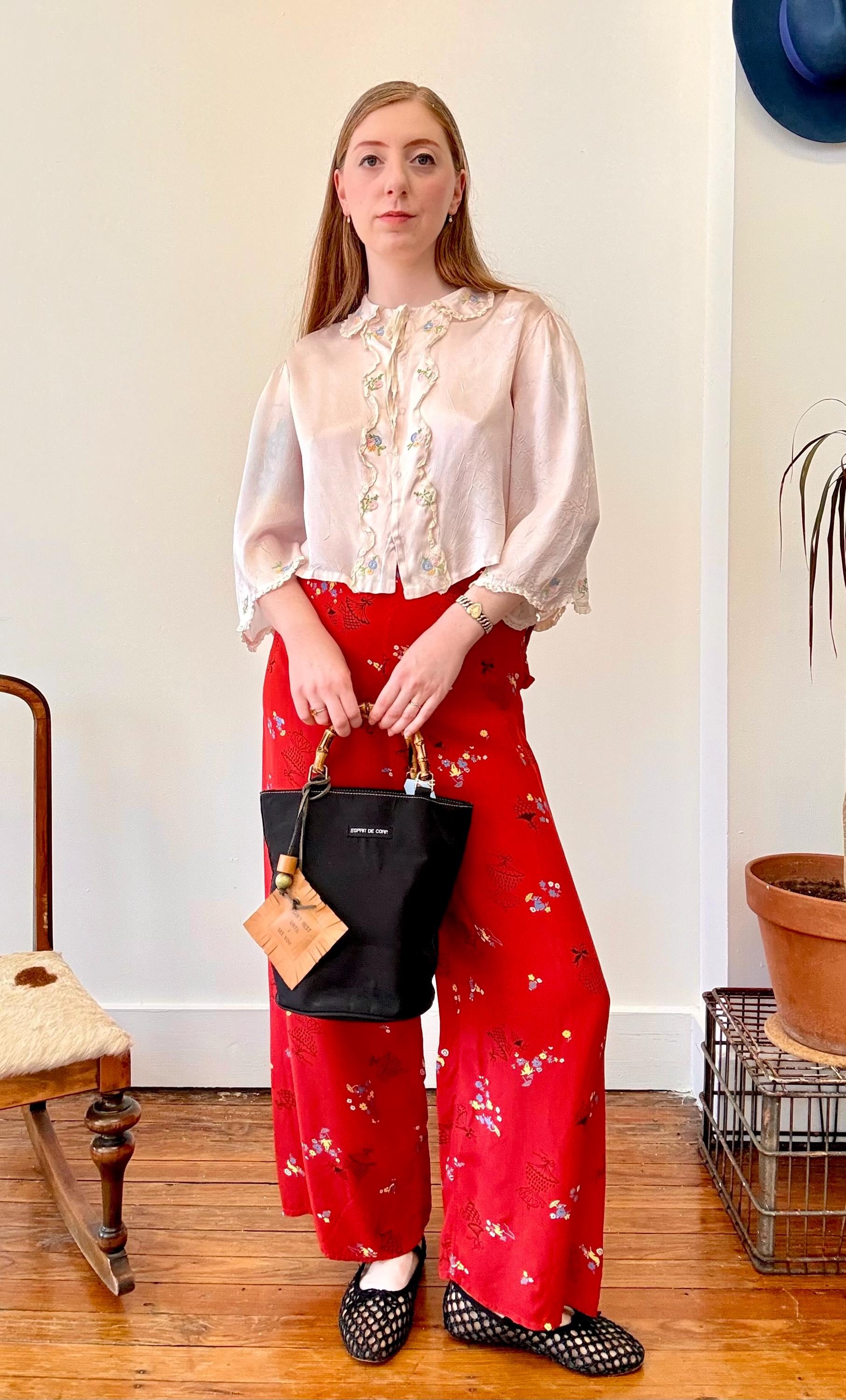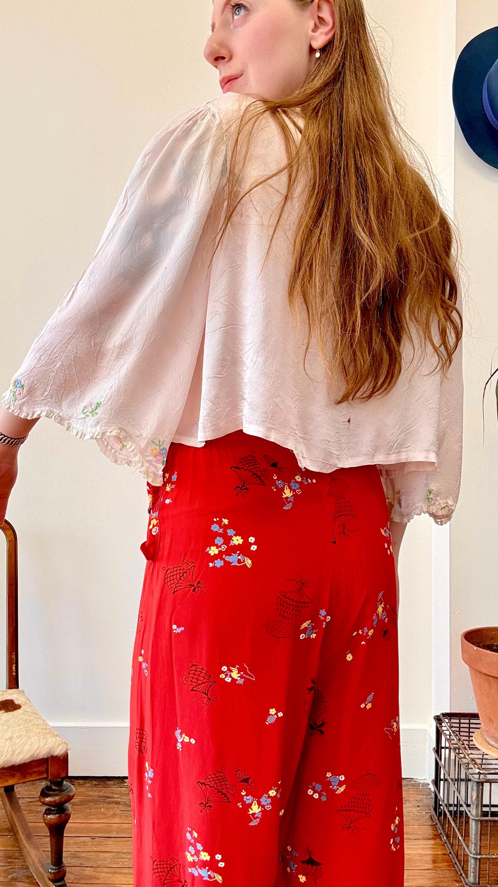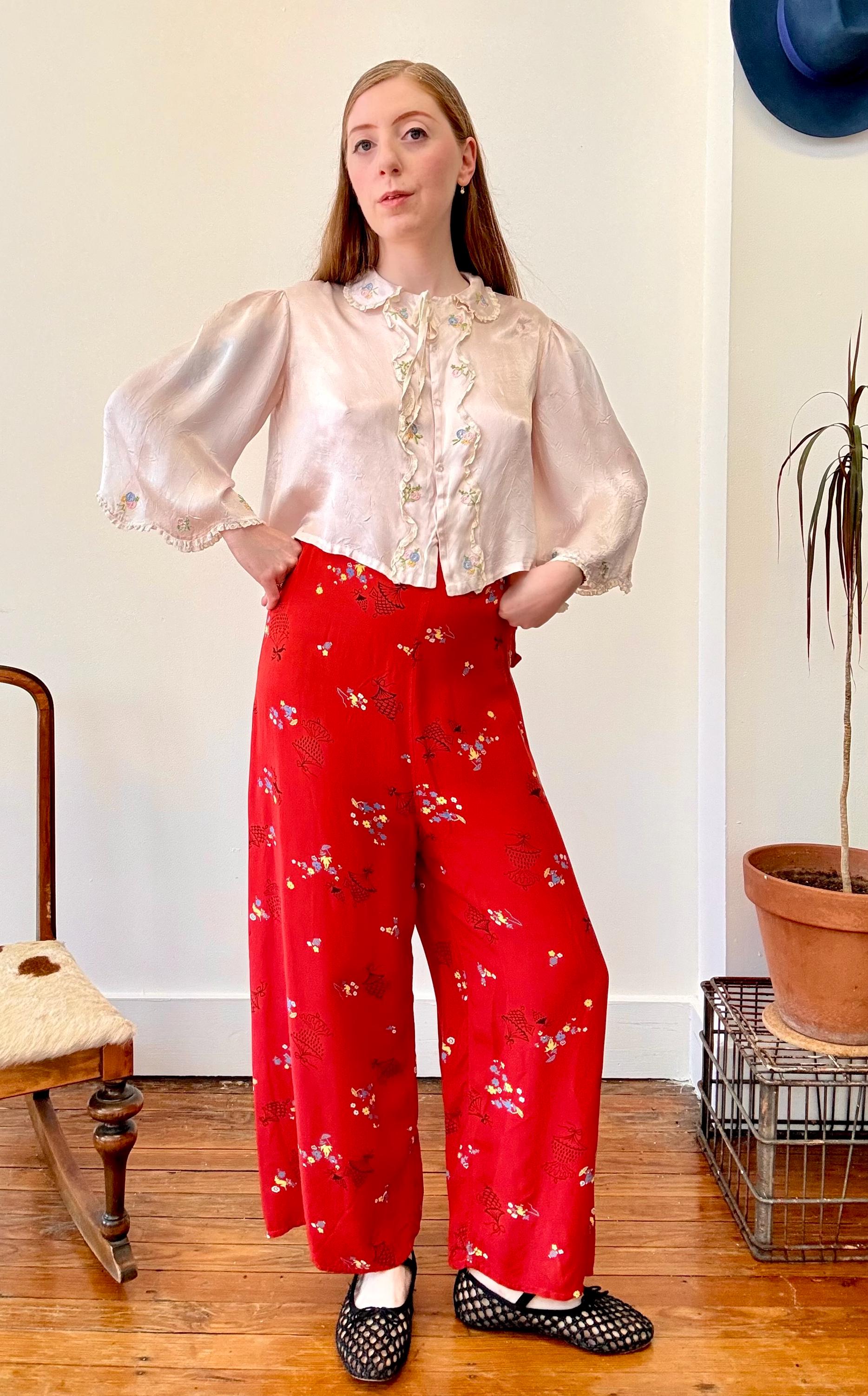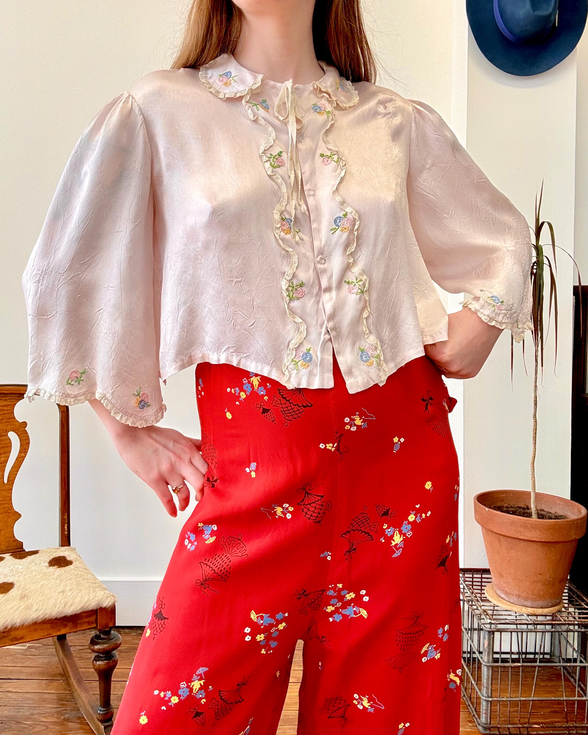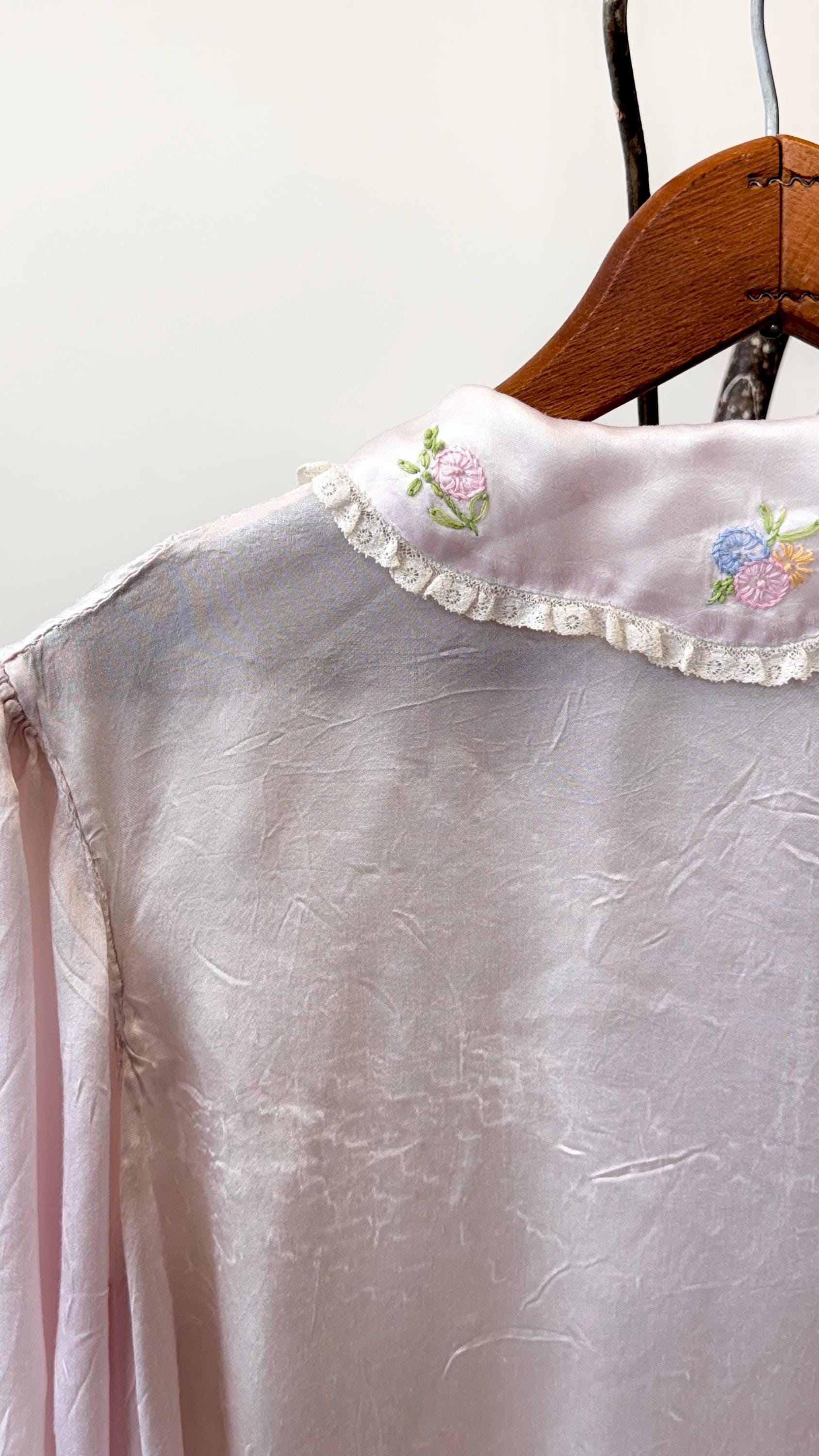 An authentic vintage blouse. originally called a bed jacket worn as loungewear or sleep wear. crafted from fine satin silk in a pale hue with delicate lace trim and floral hand embroidery. features an snap front closure added by the original owner, a peter pan collar, and a functional ribbon tie detail.