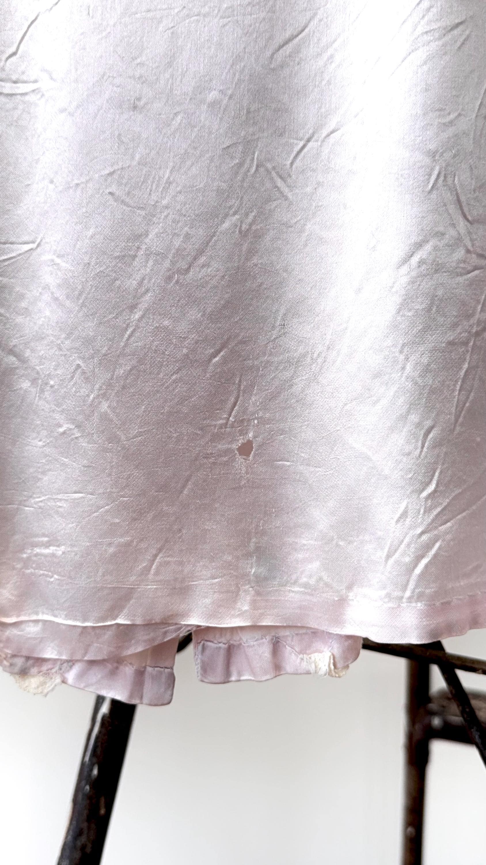 condition : distressed, visible signs of age and wear as seen in photos including various imperfections throughout including a shoulder patch, holes and pulling - adding texture to the silk fabric, common for antique satin. garment is clean and ready to wear!