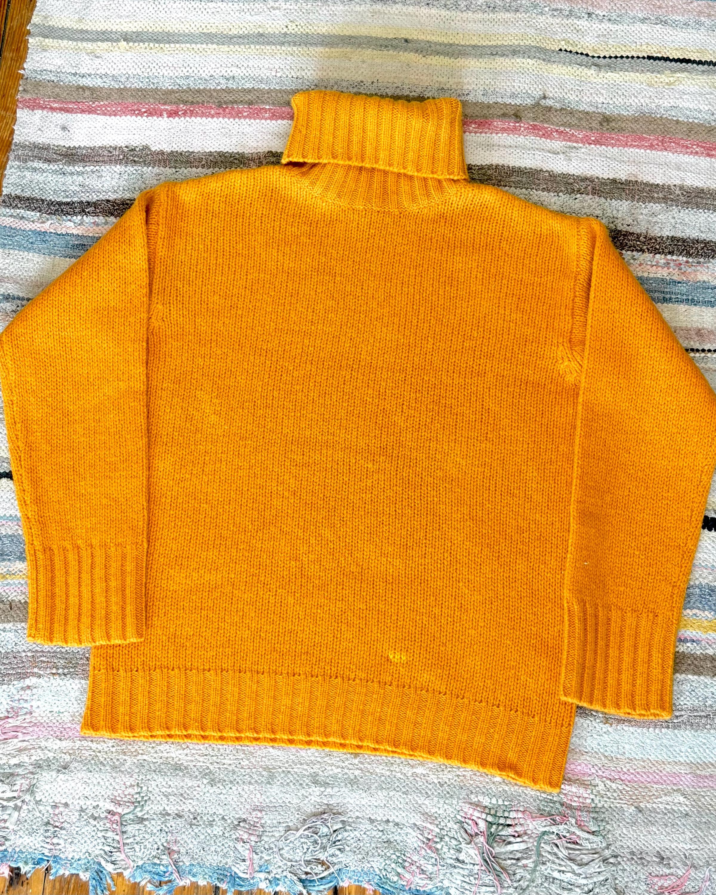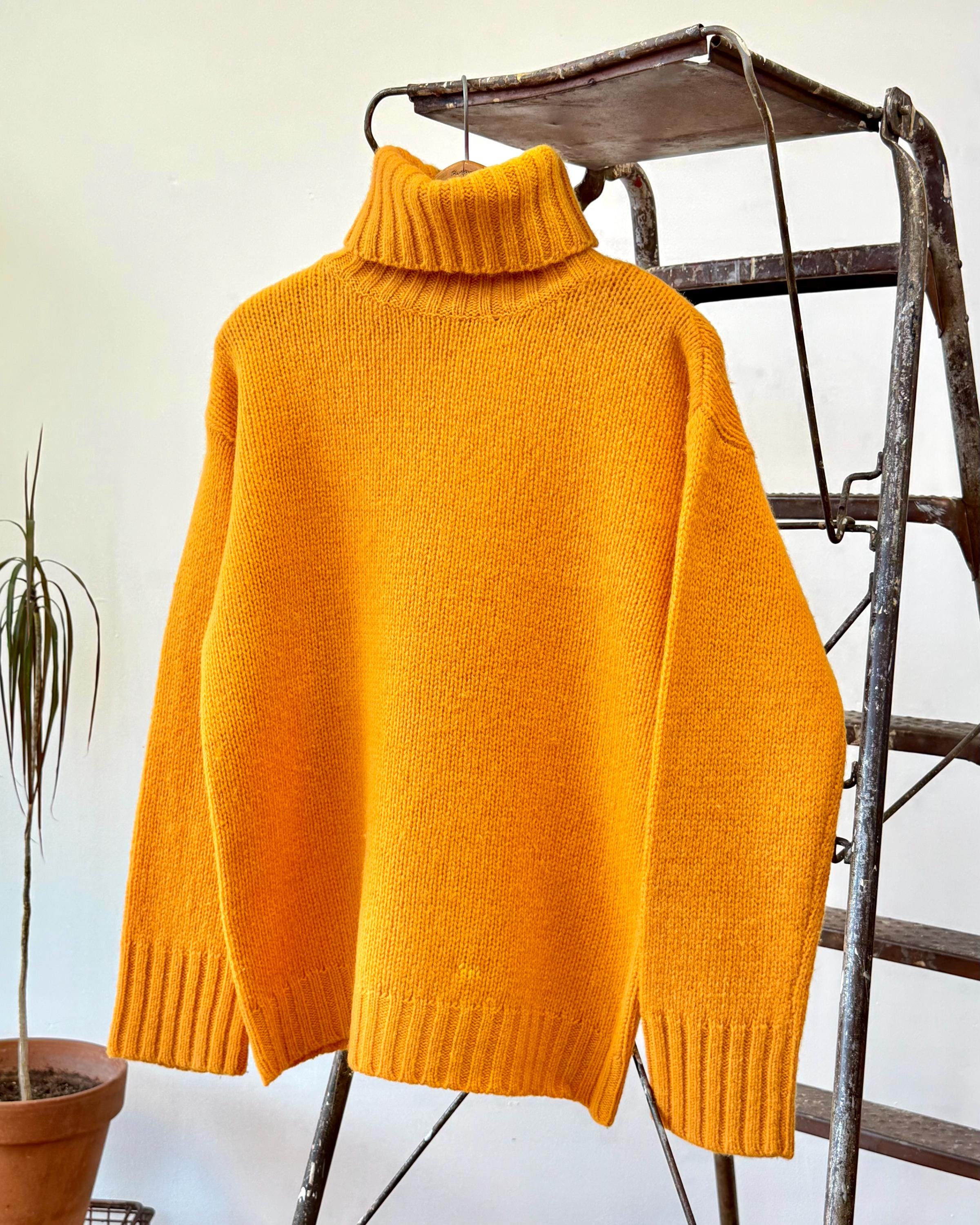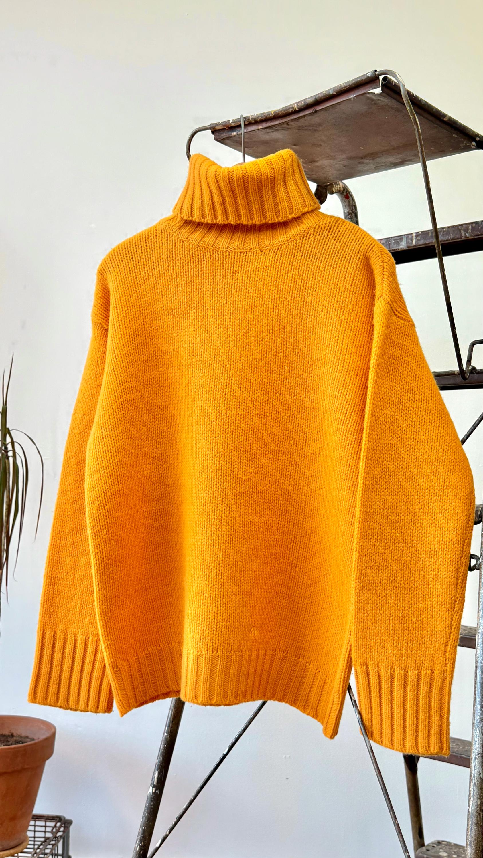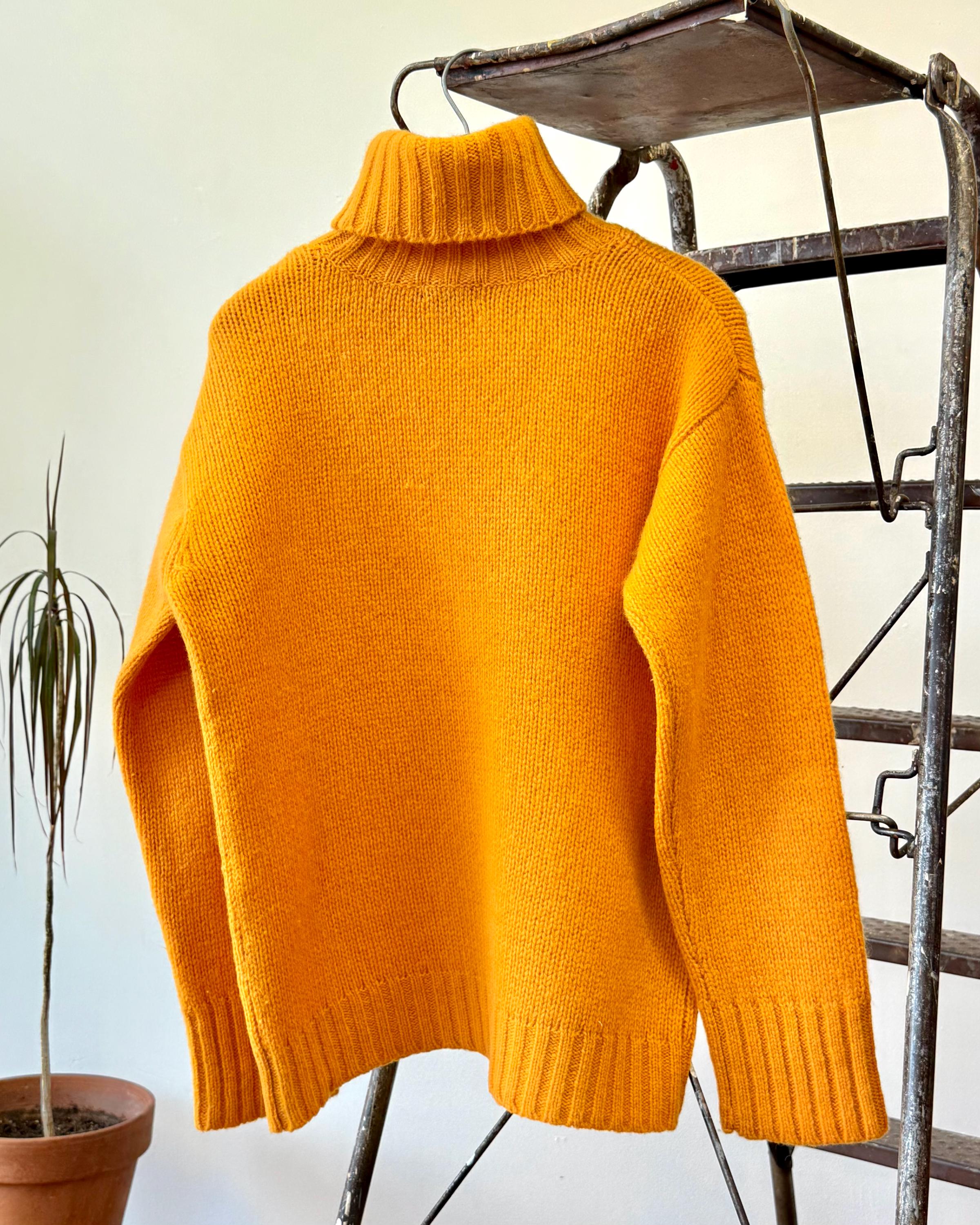 An authentic vintage pullover sweater by J Crew. a dense wool knit in an approachable clementine orange hue. a classic T cut with relaxed fit and fold over turtleneck collar. a great gender neutral style!