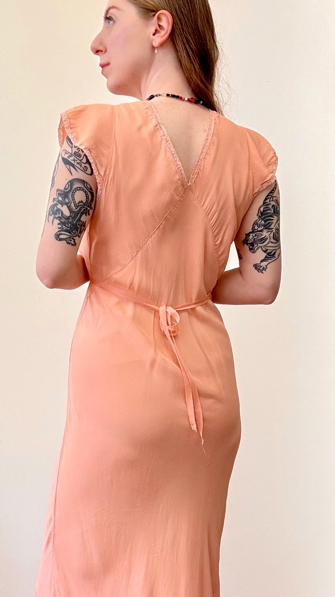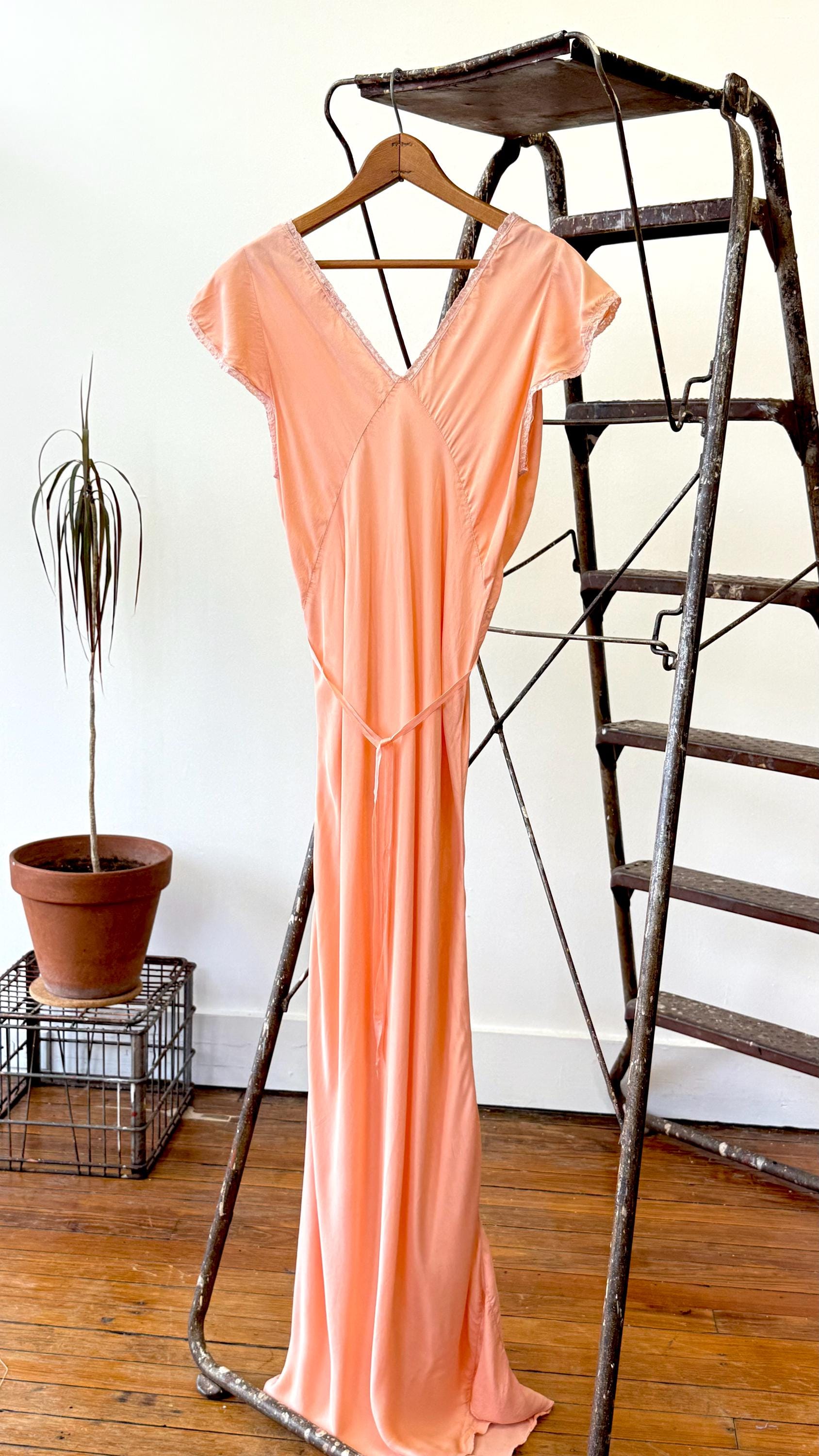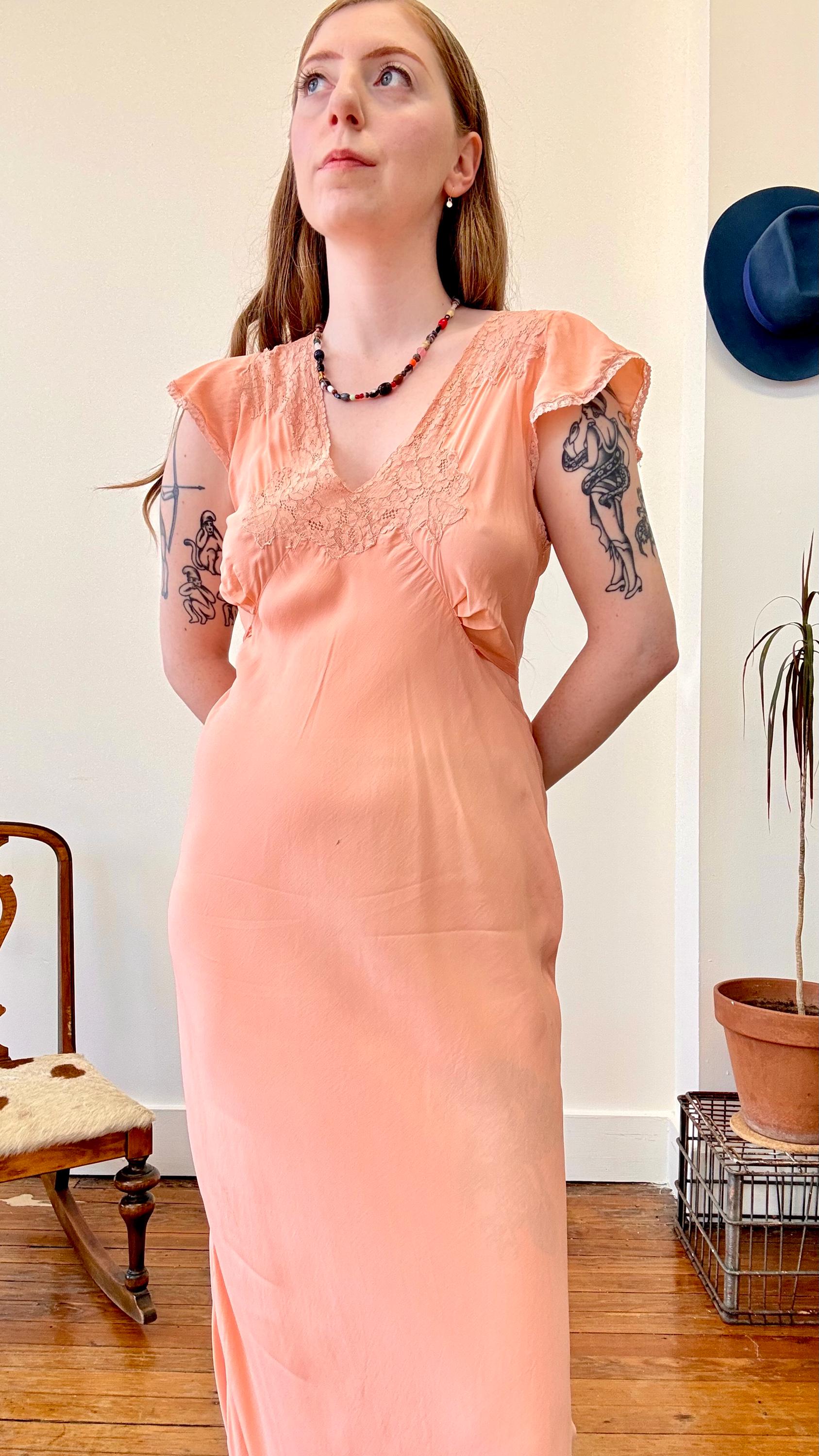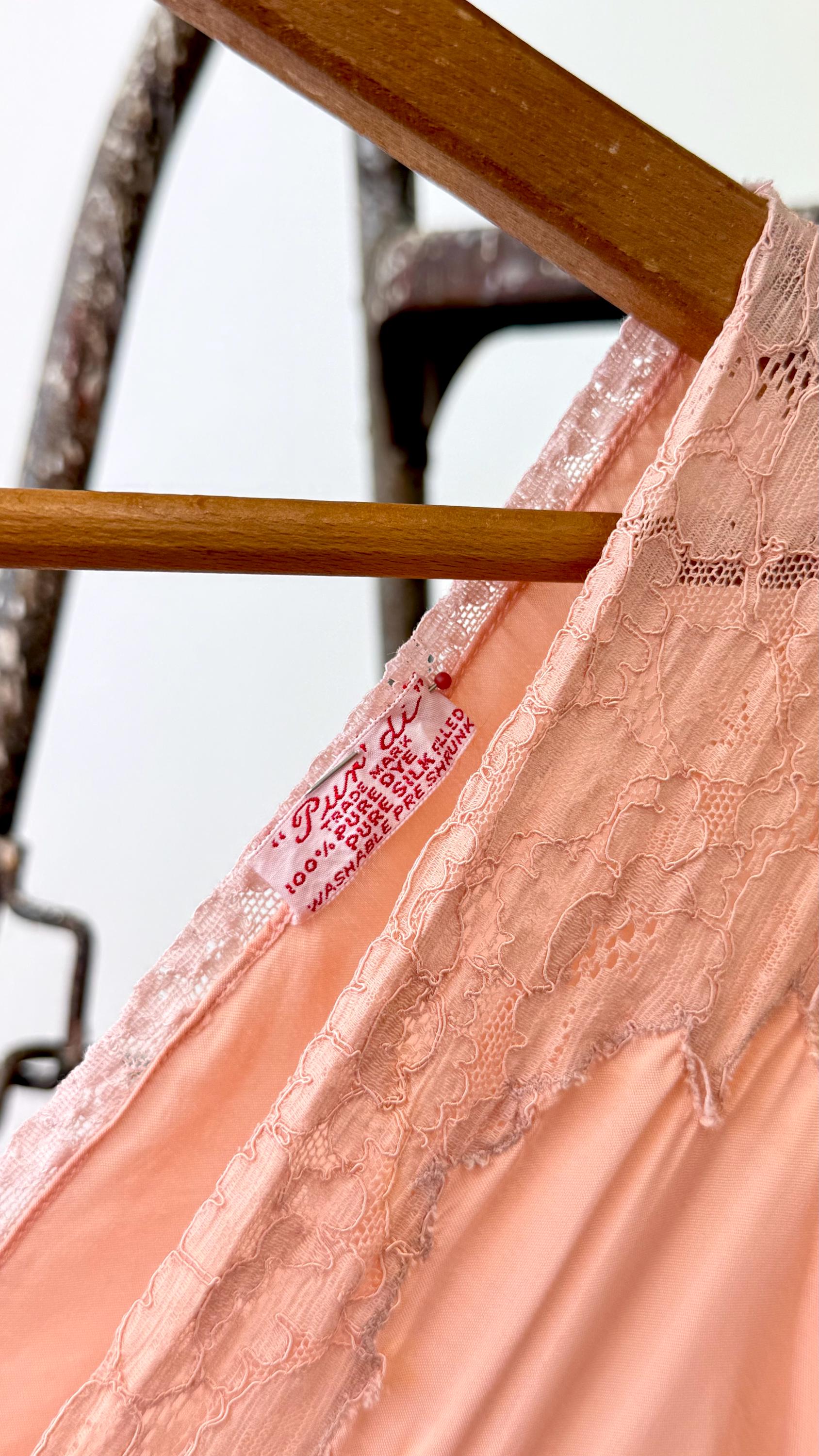 An authentic vintage slip dress. a lovely silk bias cut slip dress in an elegant floor length. features lace trim, cap sleeves, and tie waisline. a timeless deco design that drapes beautifully and comfortably over the body. what originally was designed as lingerie makes a stunning modern day dress. “Pur-Di” label.