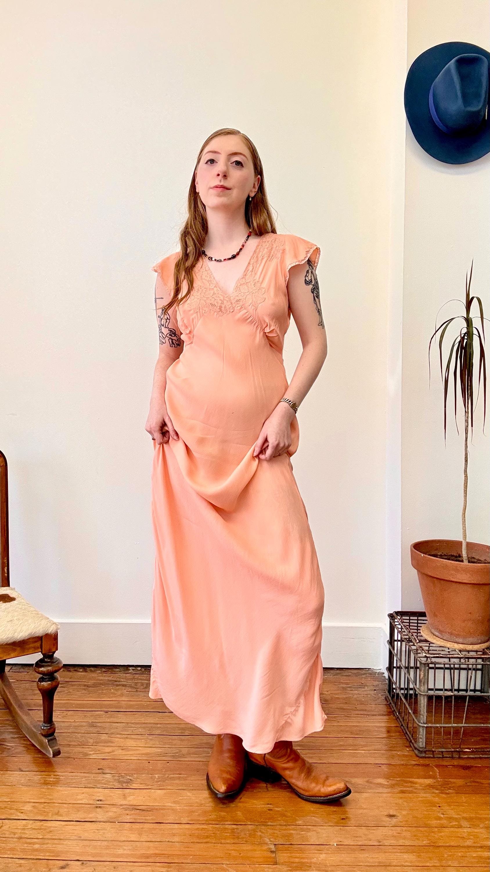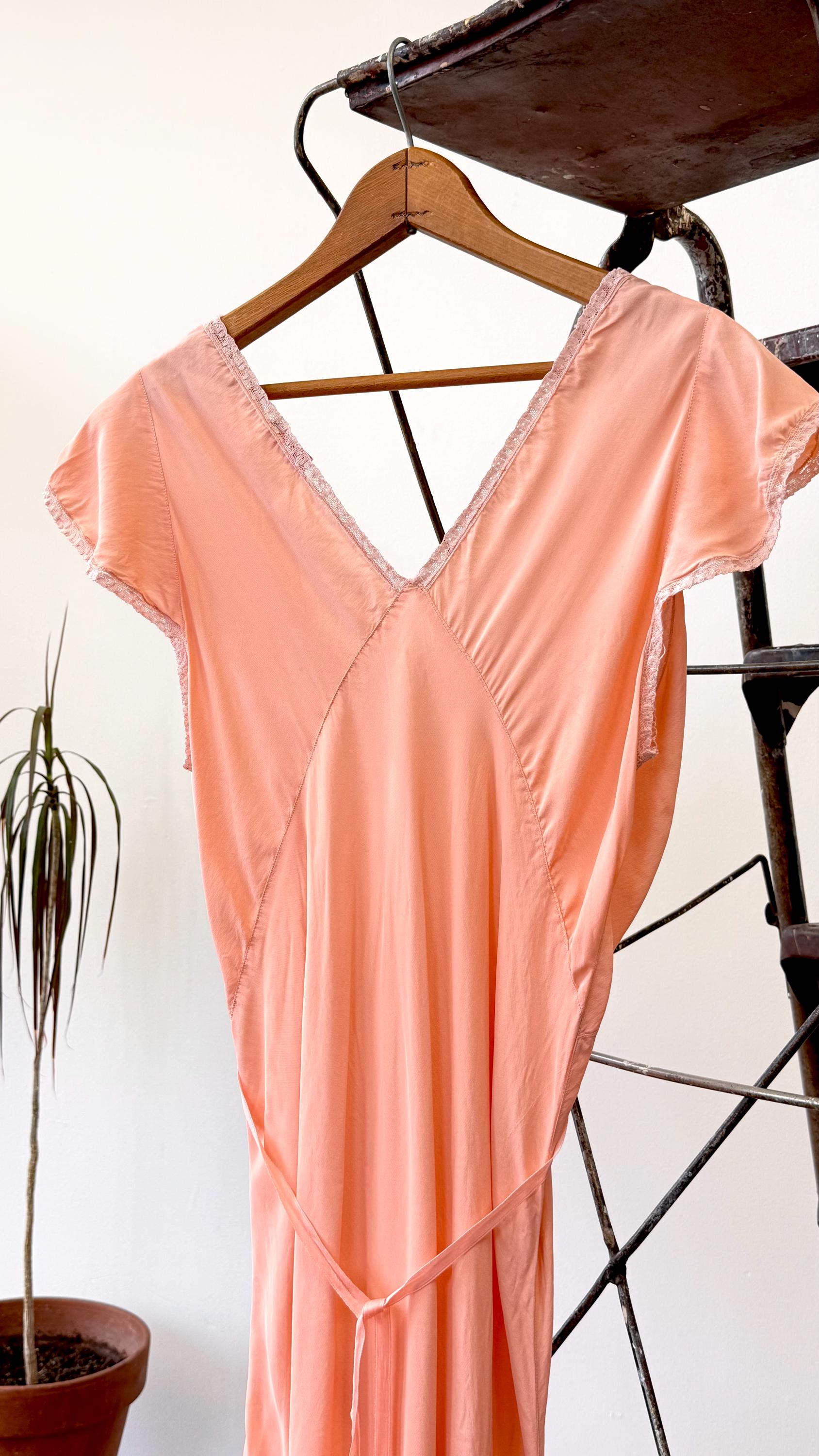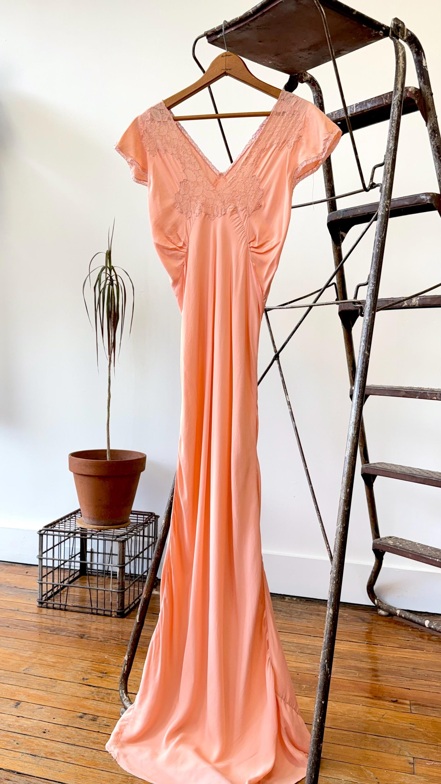 An authentic vintage slip dress. a lovely silk bias cut slip dress in an elegant floor length. features lace trim, cap sleeves, and tie waisline. a timeless deco design that drapes beautifully and comfortably over the body. what originally was designed as lingerie makes a stunning modern day dress. “Pur-Di” label.