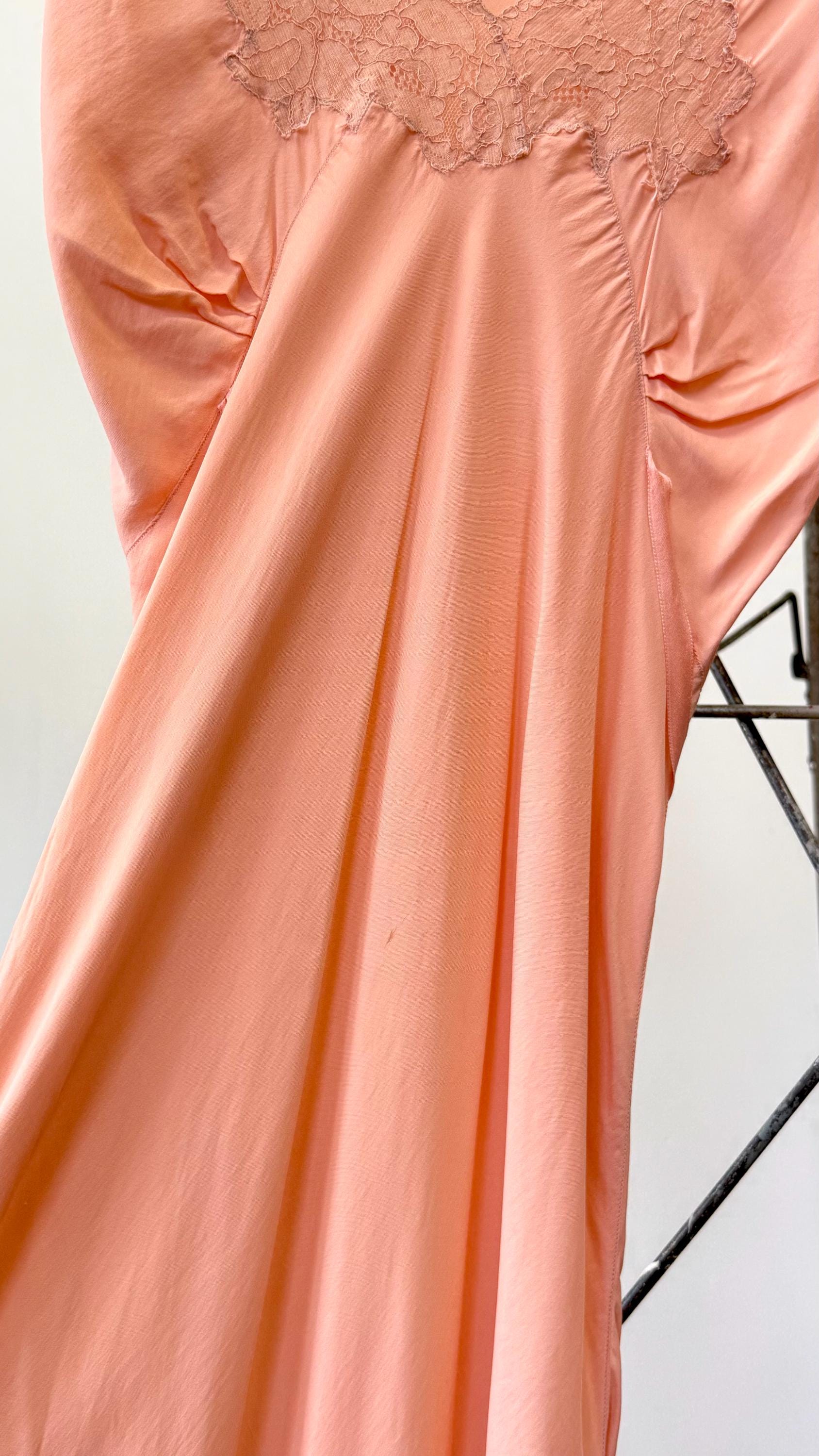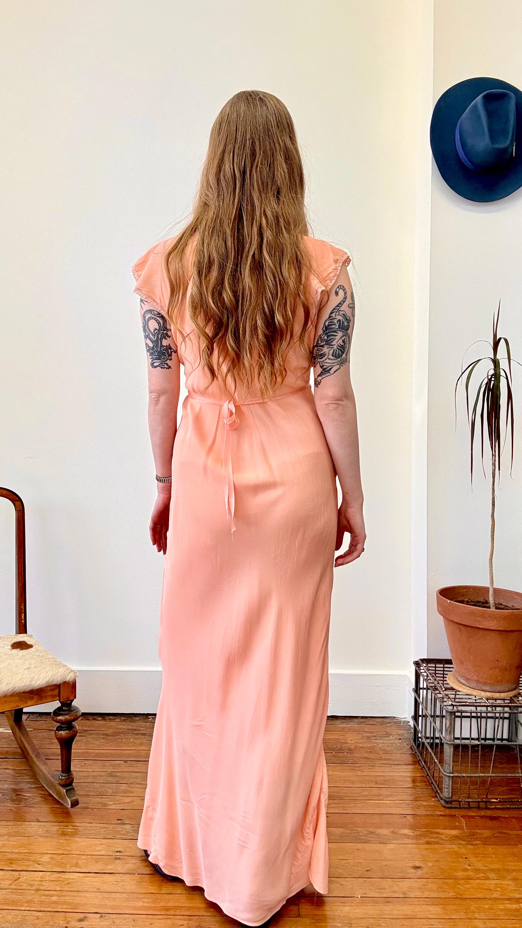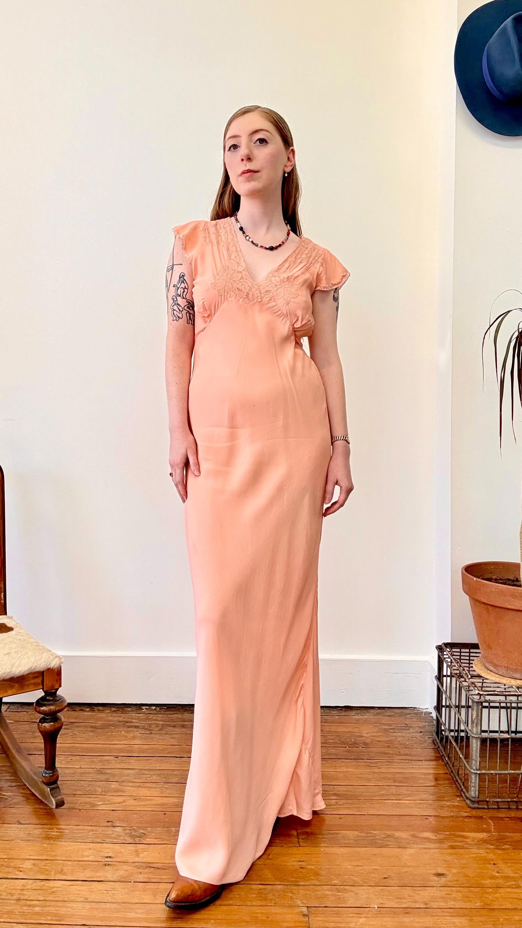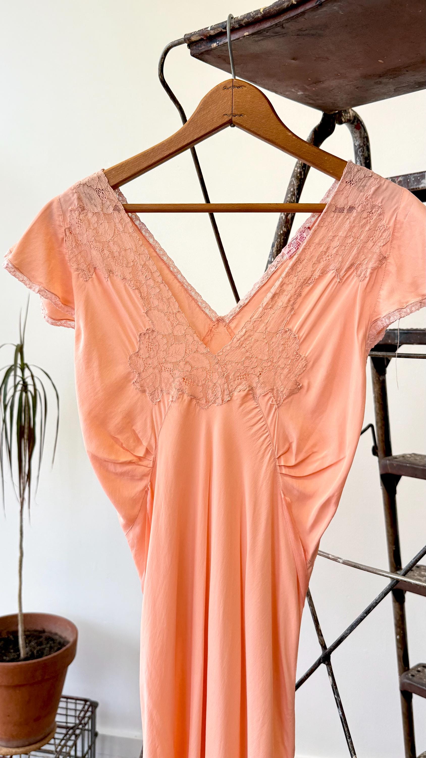 An authentic vintage slip dress. a lovely silk bias cut slip dress in an elegant floor length. features lace trim, cap sleeves, and tie waisline. a timeless deco design that drapes beautifully and comfortably over the body. what originally was designed as lingerie makes a stunning modern day dress. “Pur-Di” label.