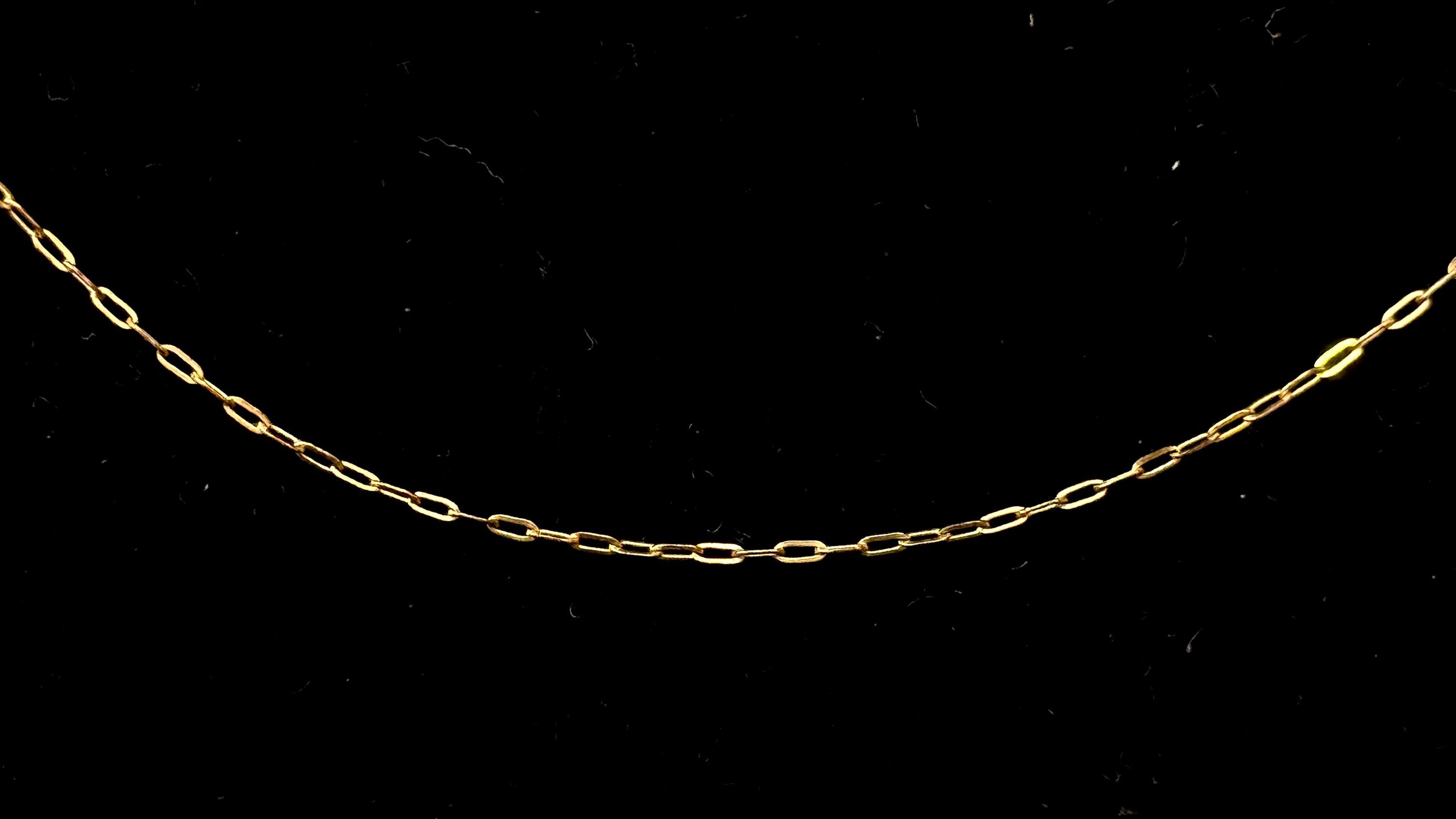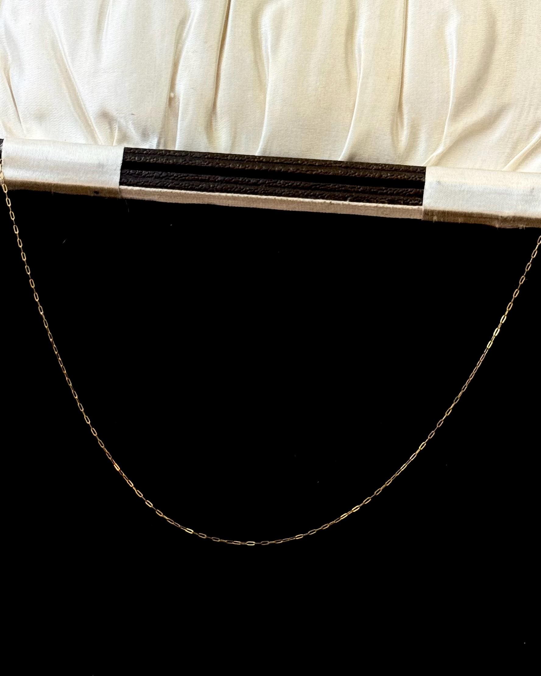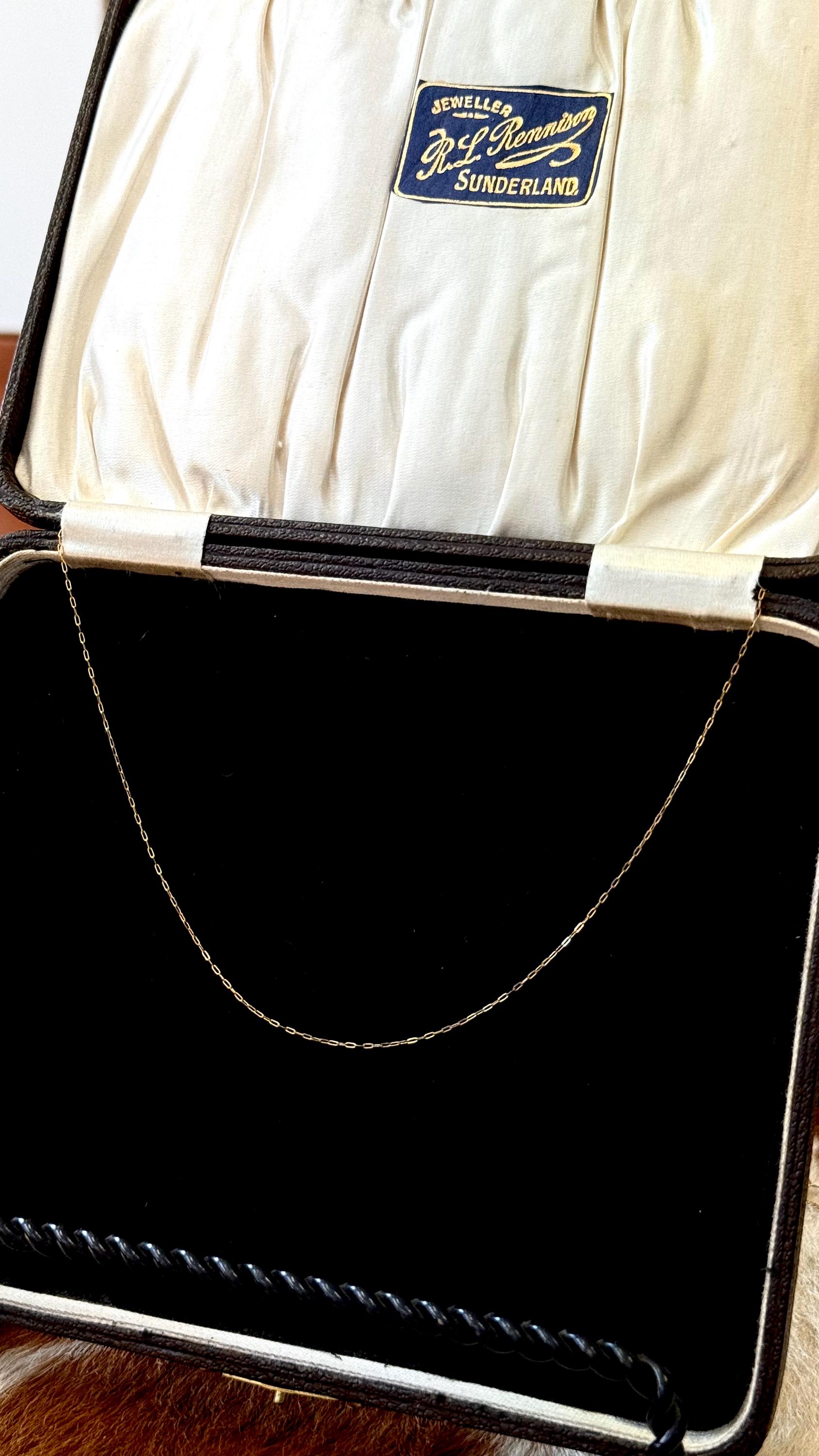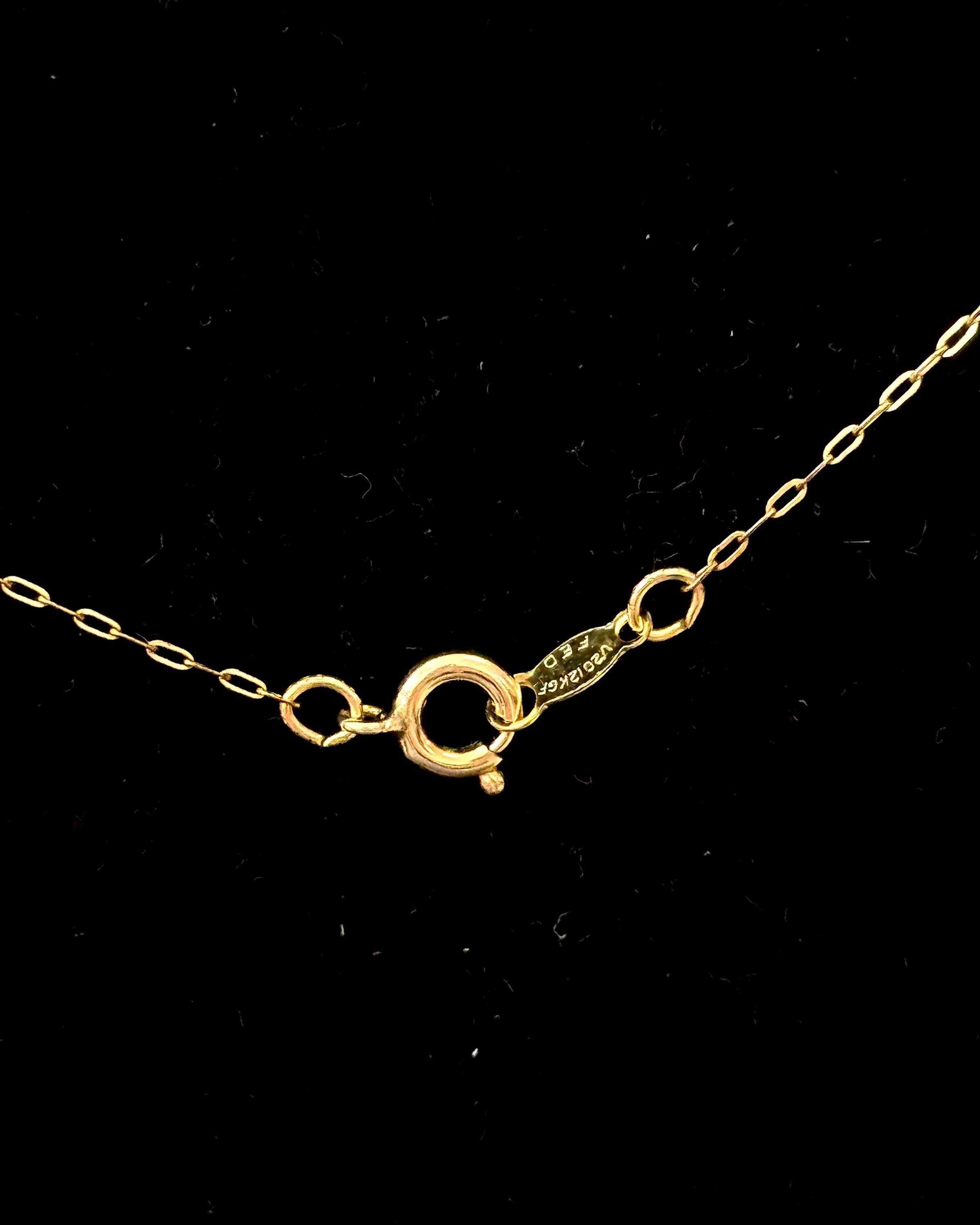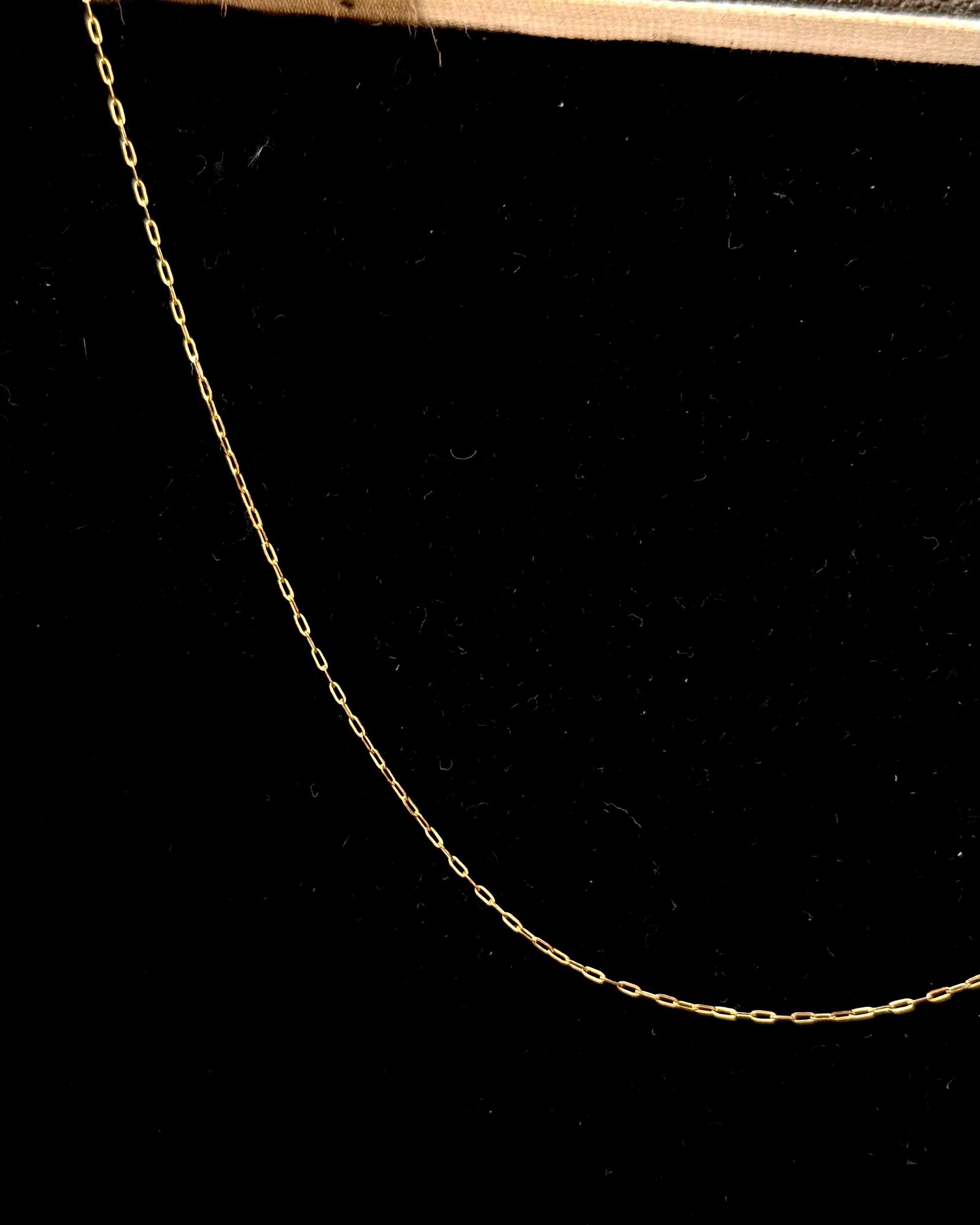 An authentic vintage 12k gold filled dainty paper clip chain necklace. spring ring clasp with jewelry mark.