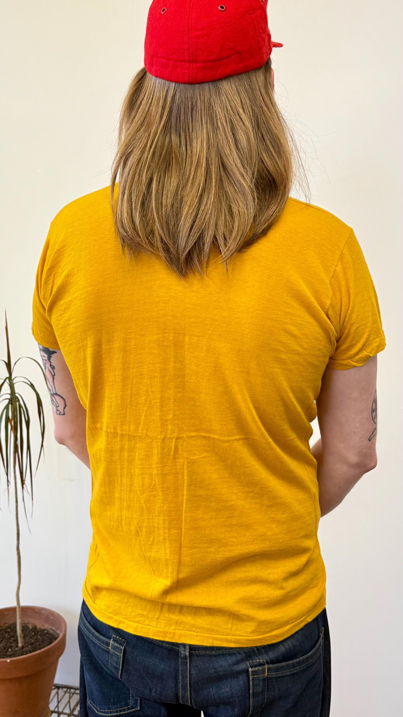 a soft and gently worn tee. stretches to fit. generic label. made in USA