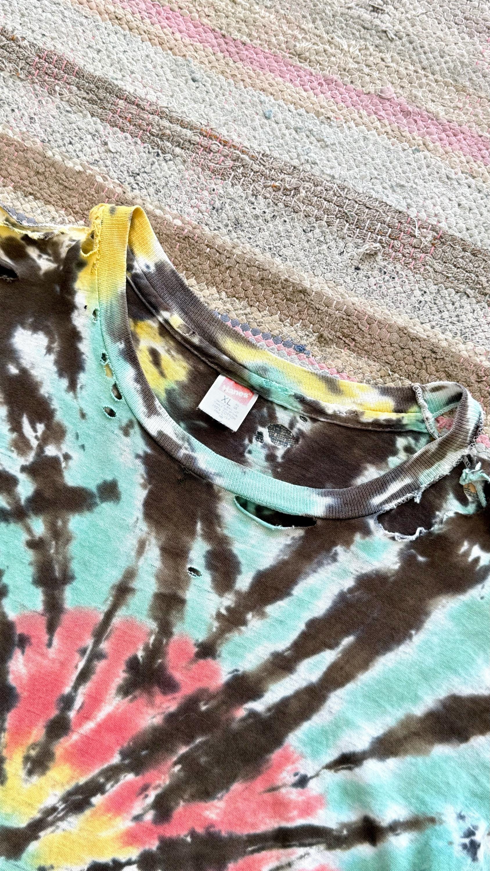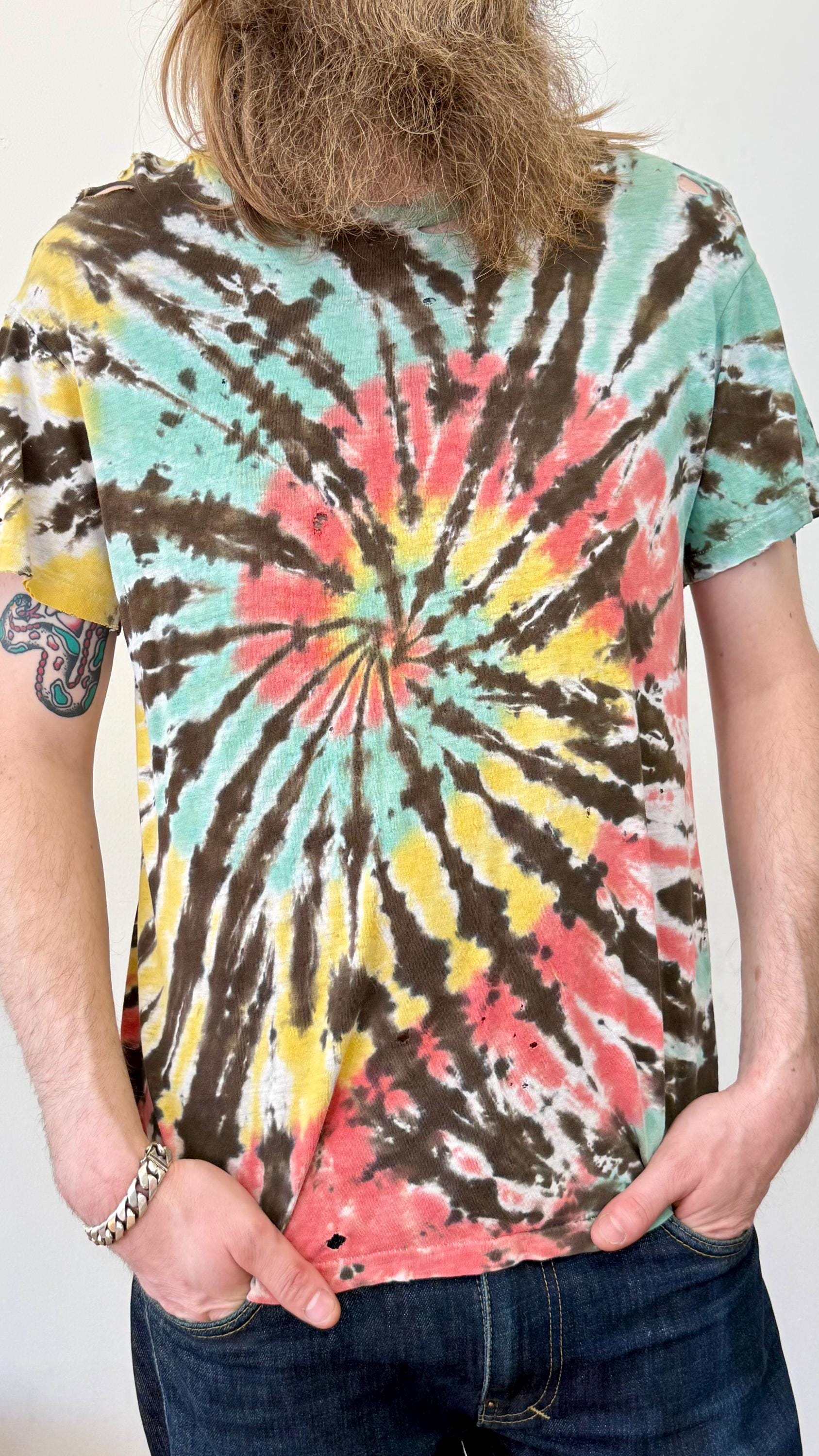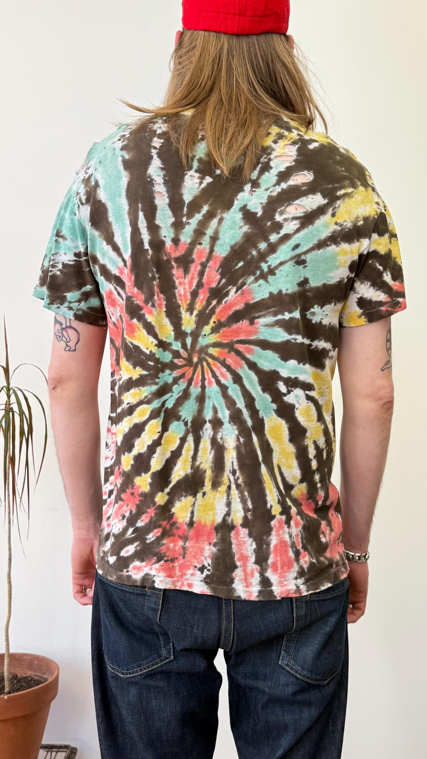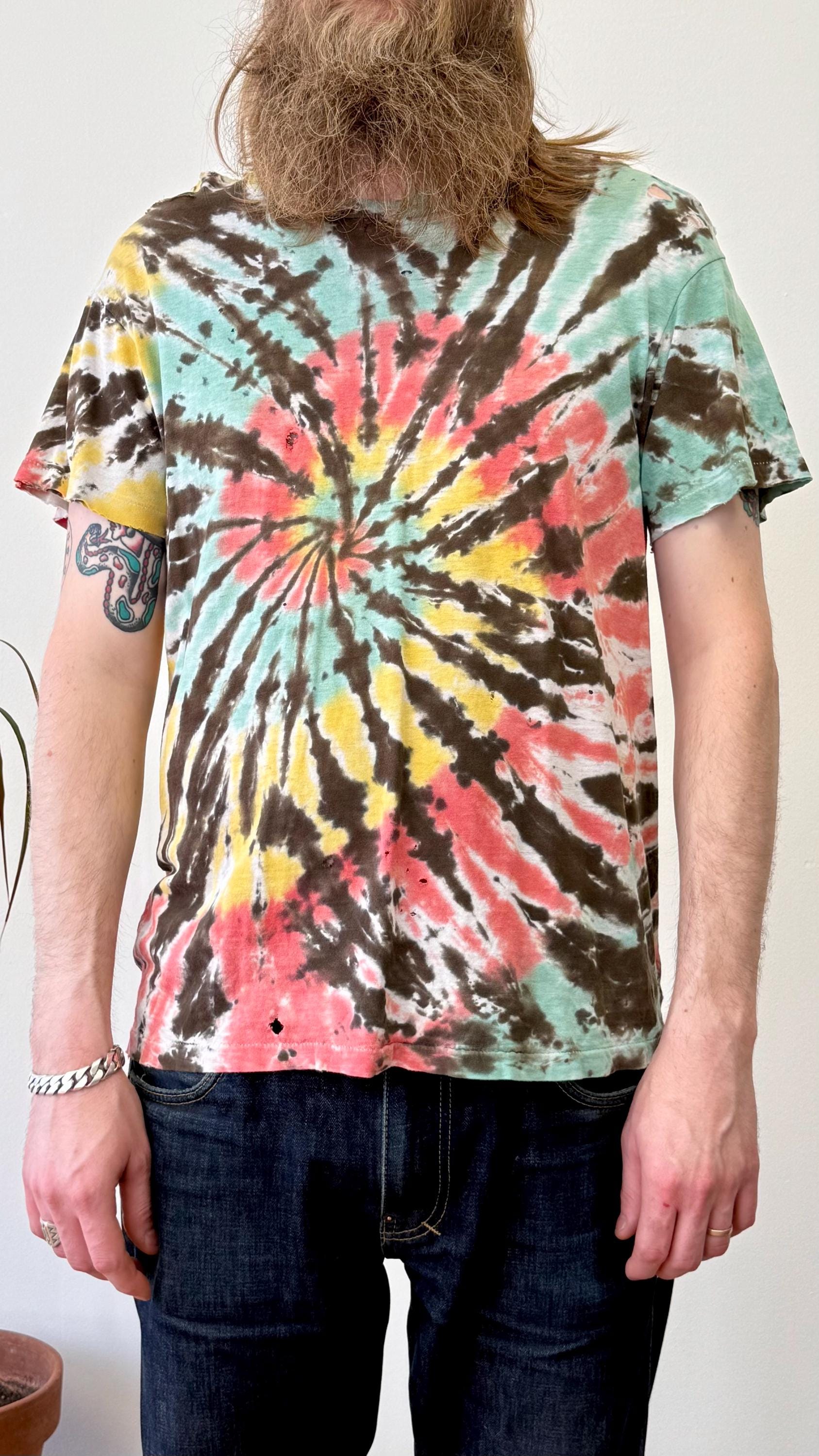 An authentic vintage t shirt featuring original tie dye spiral design. sun faded coloring. heavily worn, paper thin thrashed tee. stretches to fit. Hanes label. made in USA