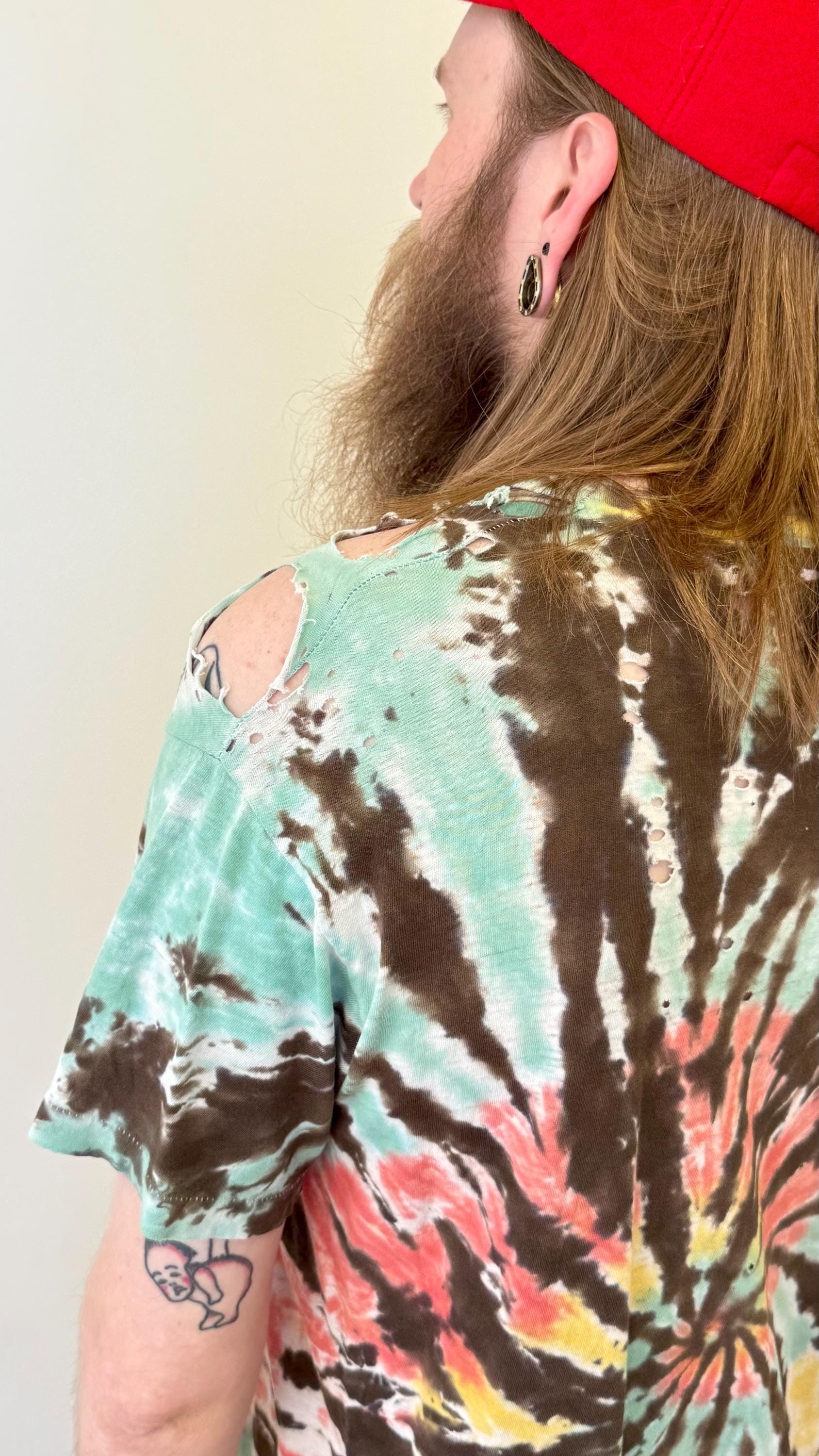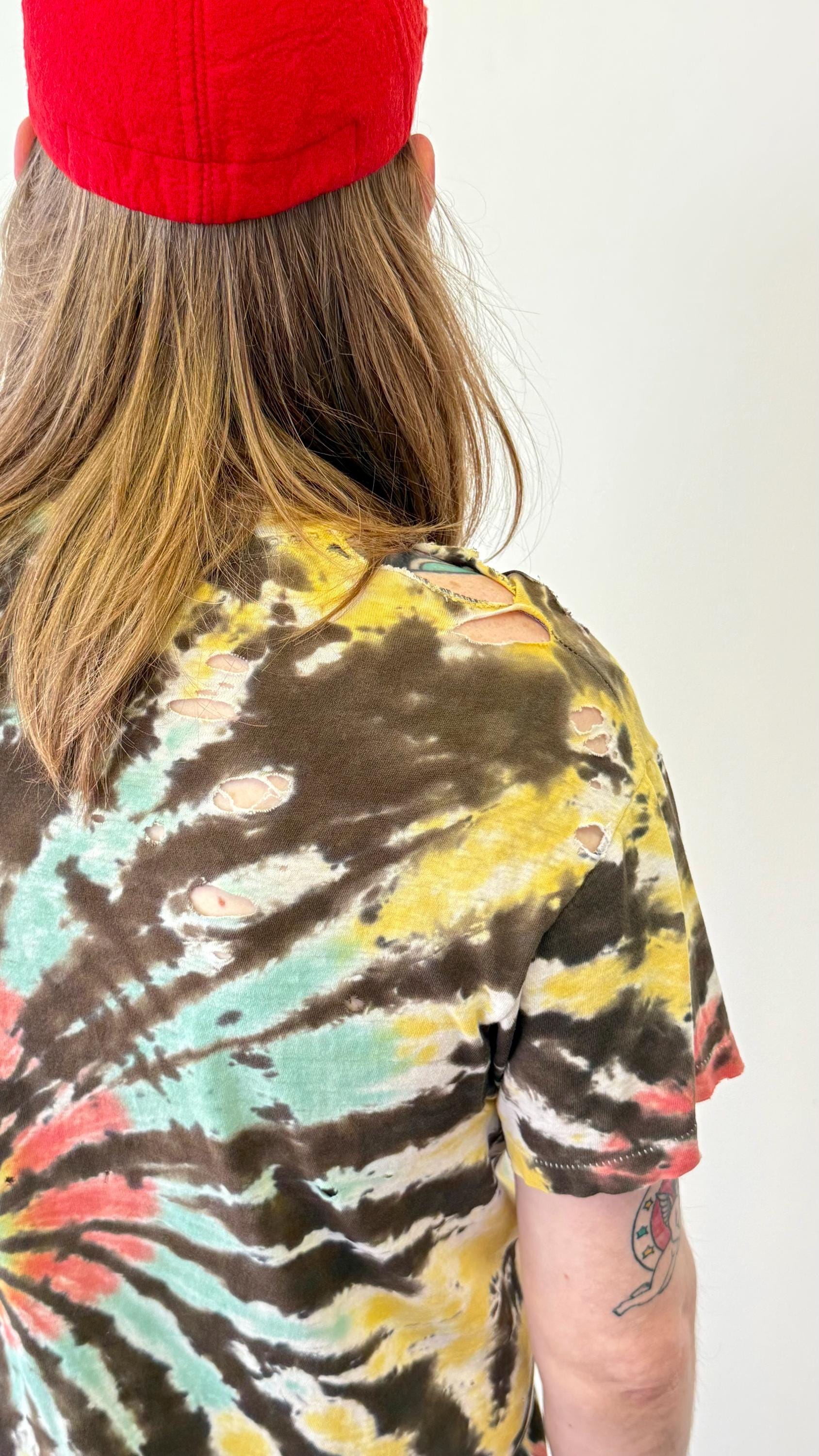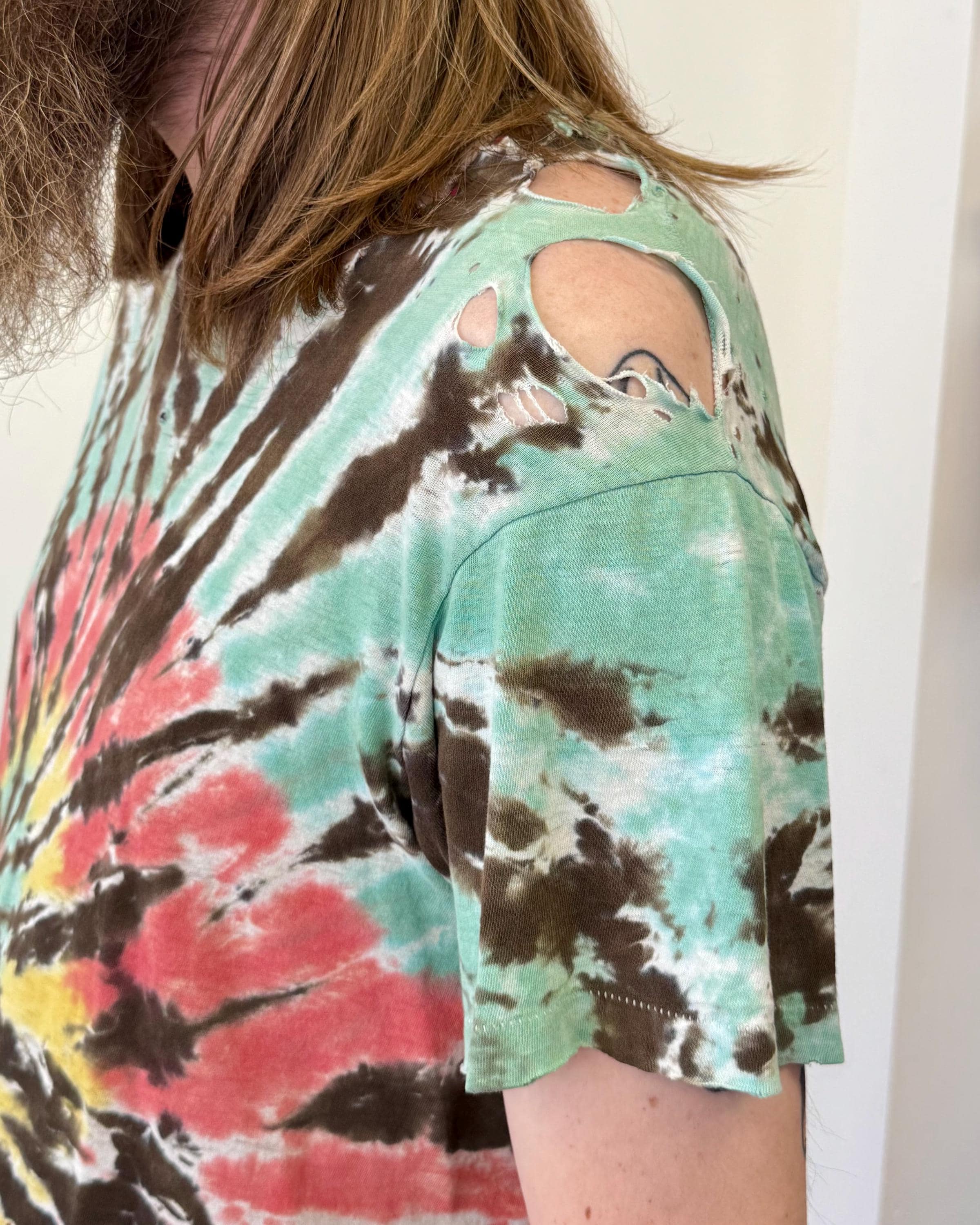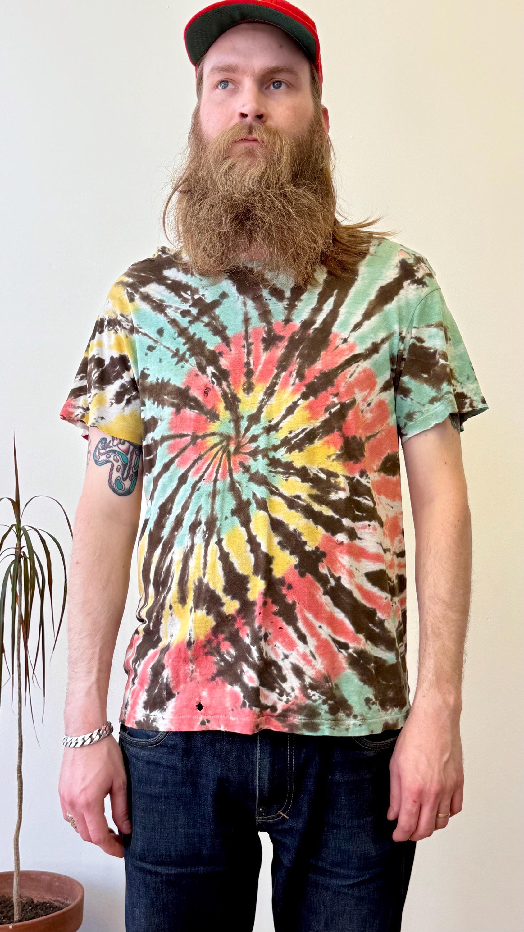 An authentic vintage t shirt featuring original tie dye spiral design. sun faded coloring. heavily worn, paper thin thrashed tee. stretches to fit. Hanes label. made in USA