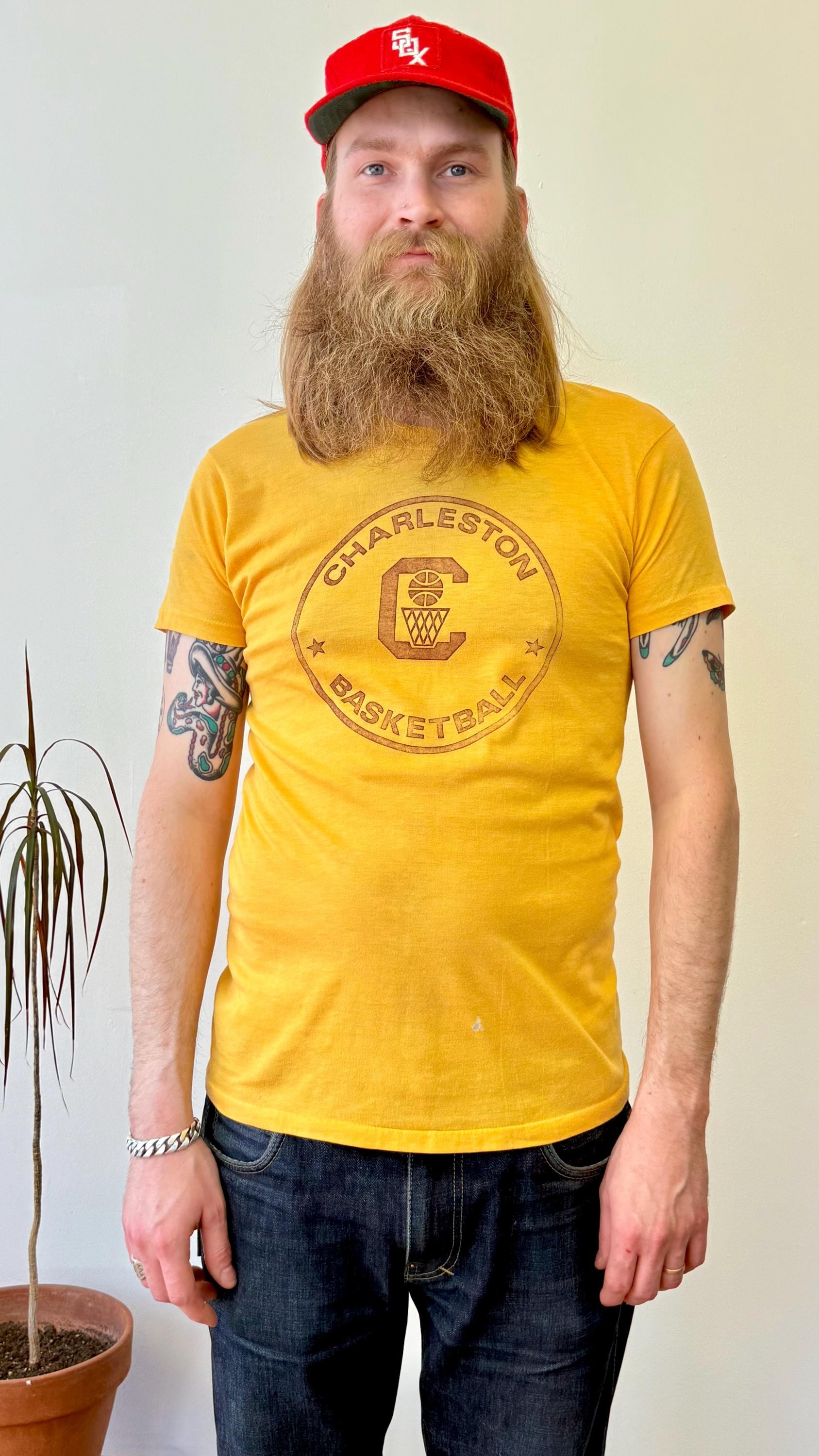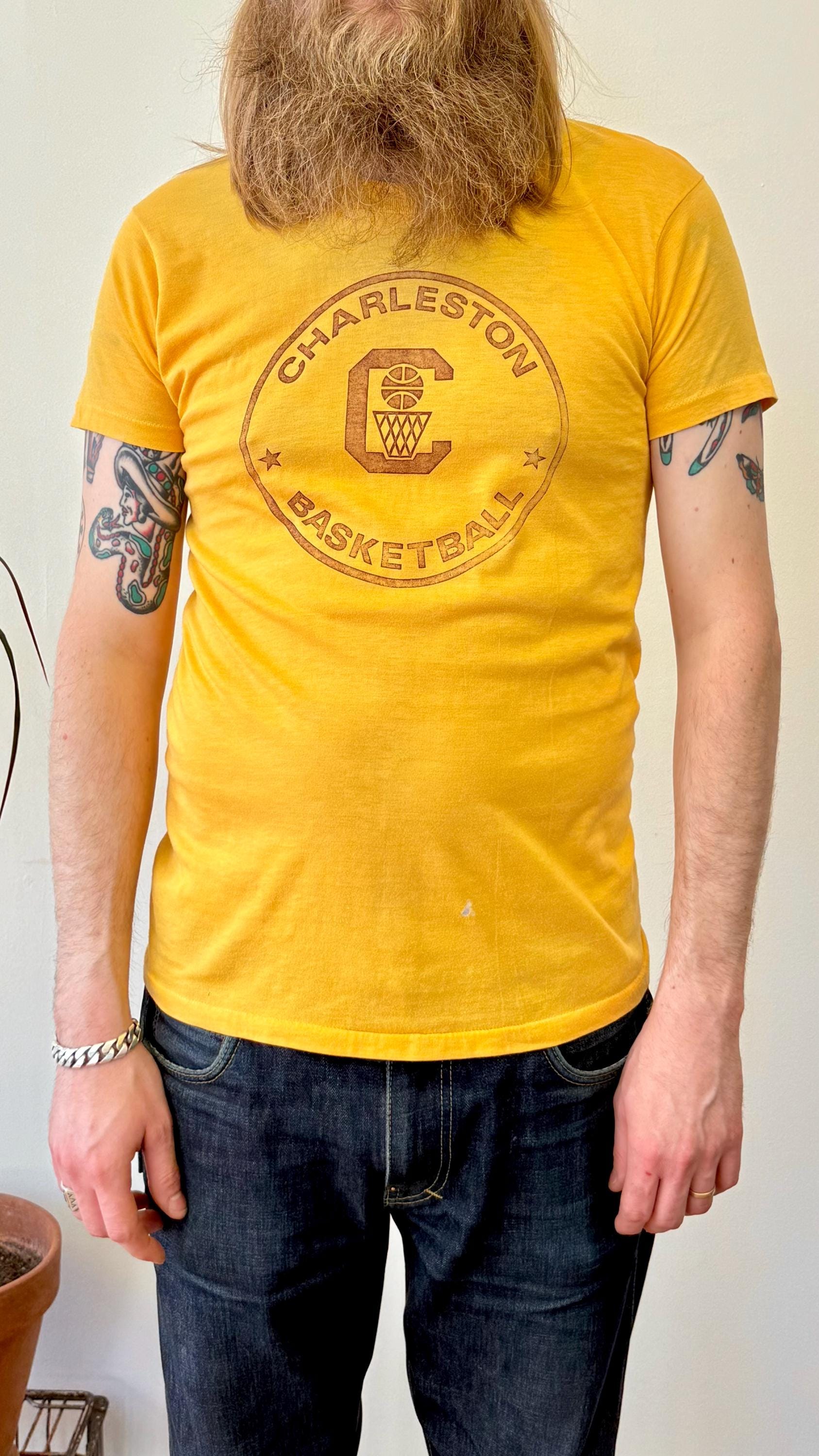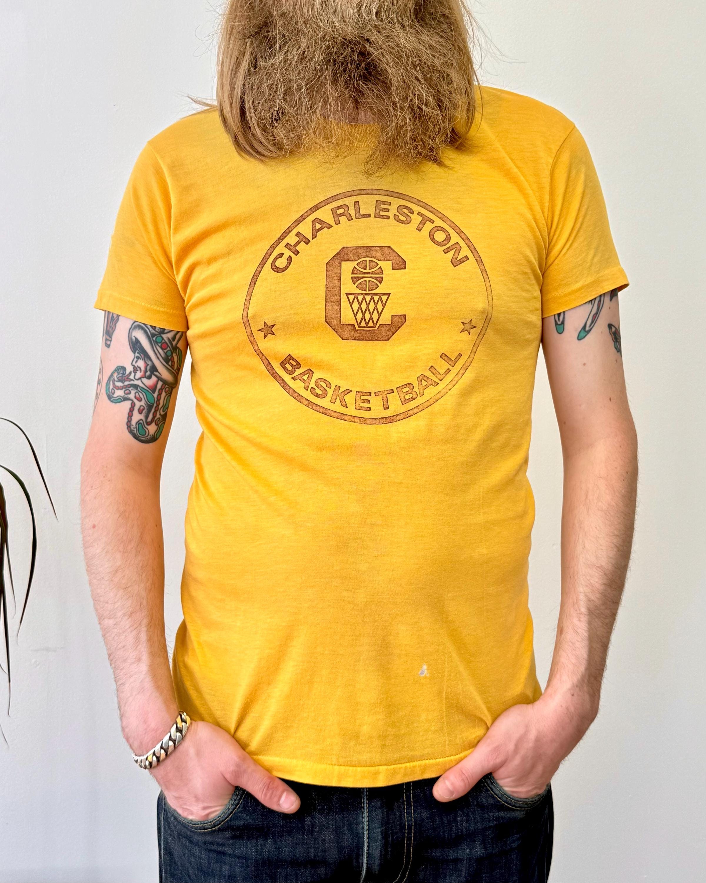 An authentic vintage t shirt featuring a Charleston basketball graphic front and player cartoon on back. a soft and gently worn tee. stretches to fit. Velvasheen label. made in USA