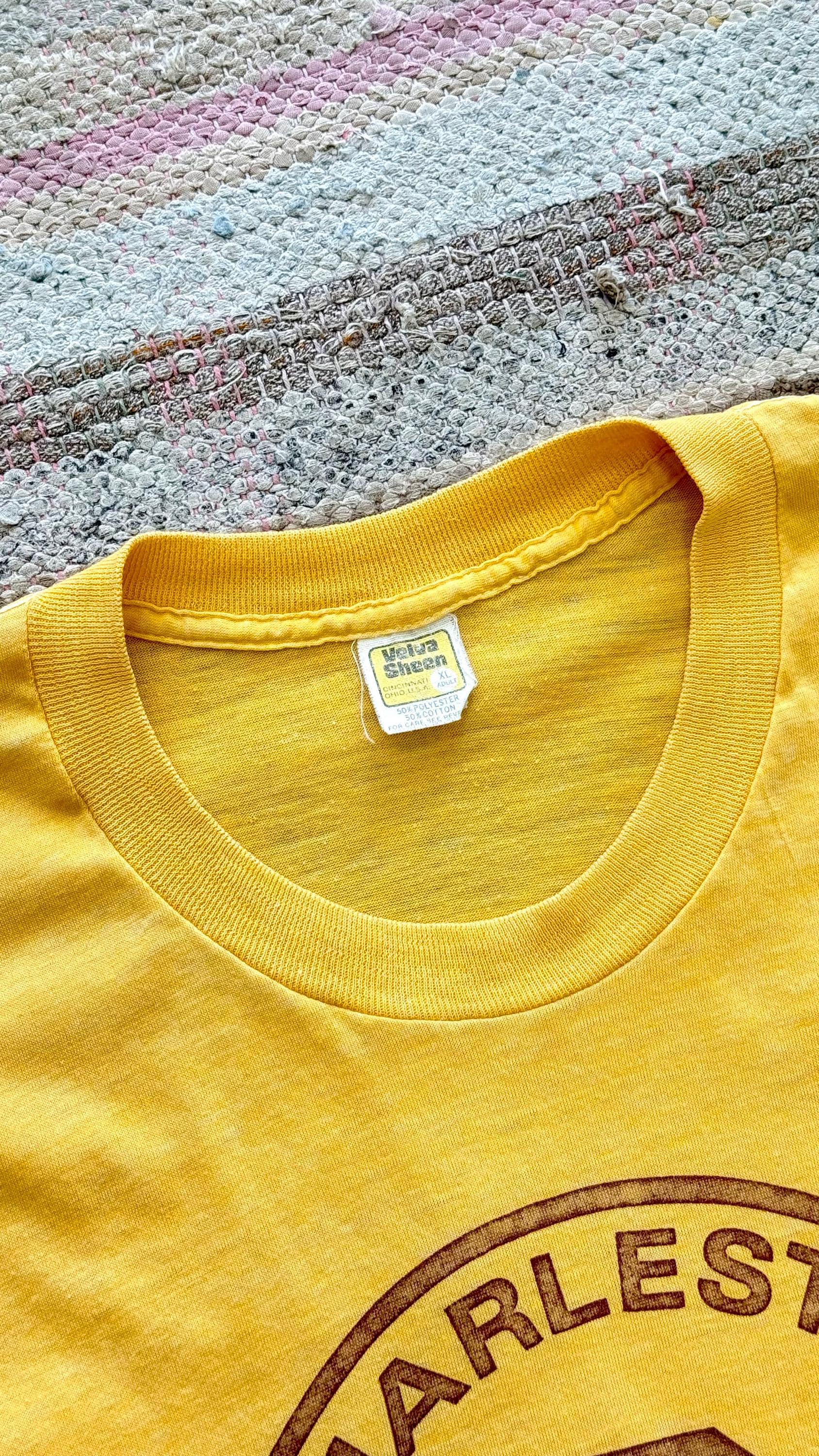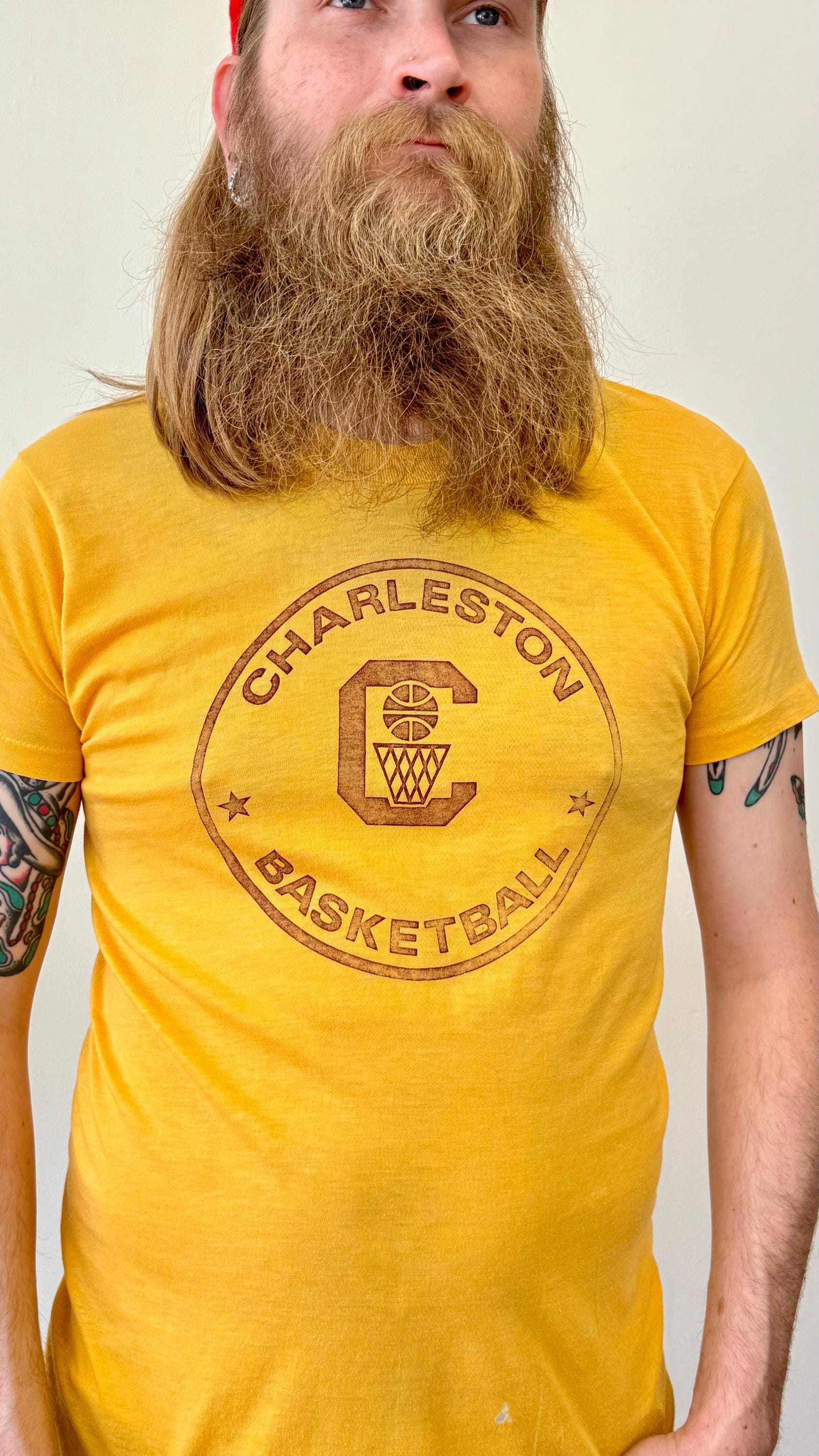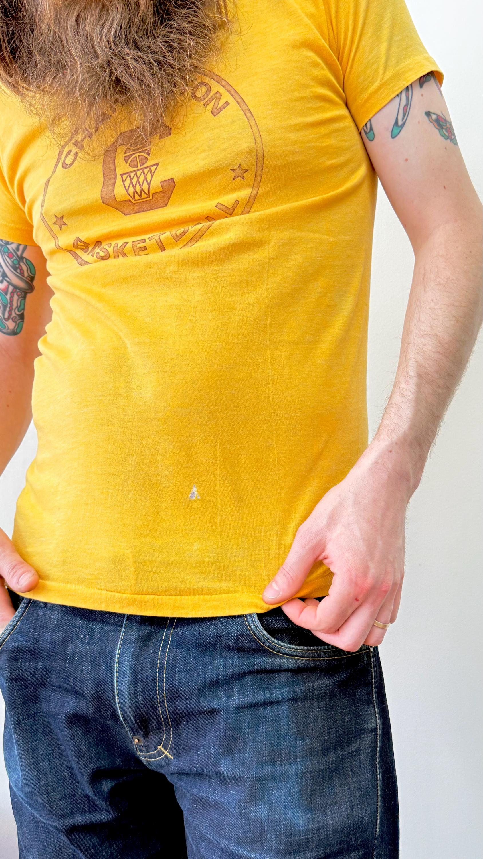 An authentic vintage t shirt featuring a Charleston basketball graphic front and player cartoon on back. a soft and gently worn tee. stretches to fit. Velvasheen label. made in USA