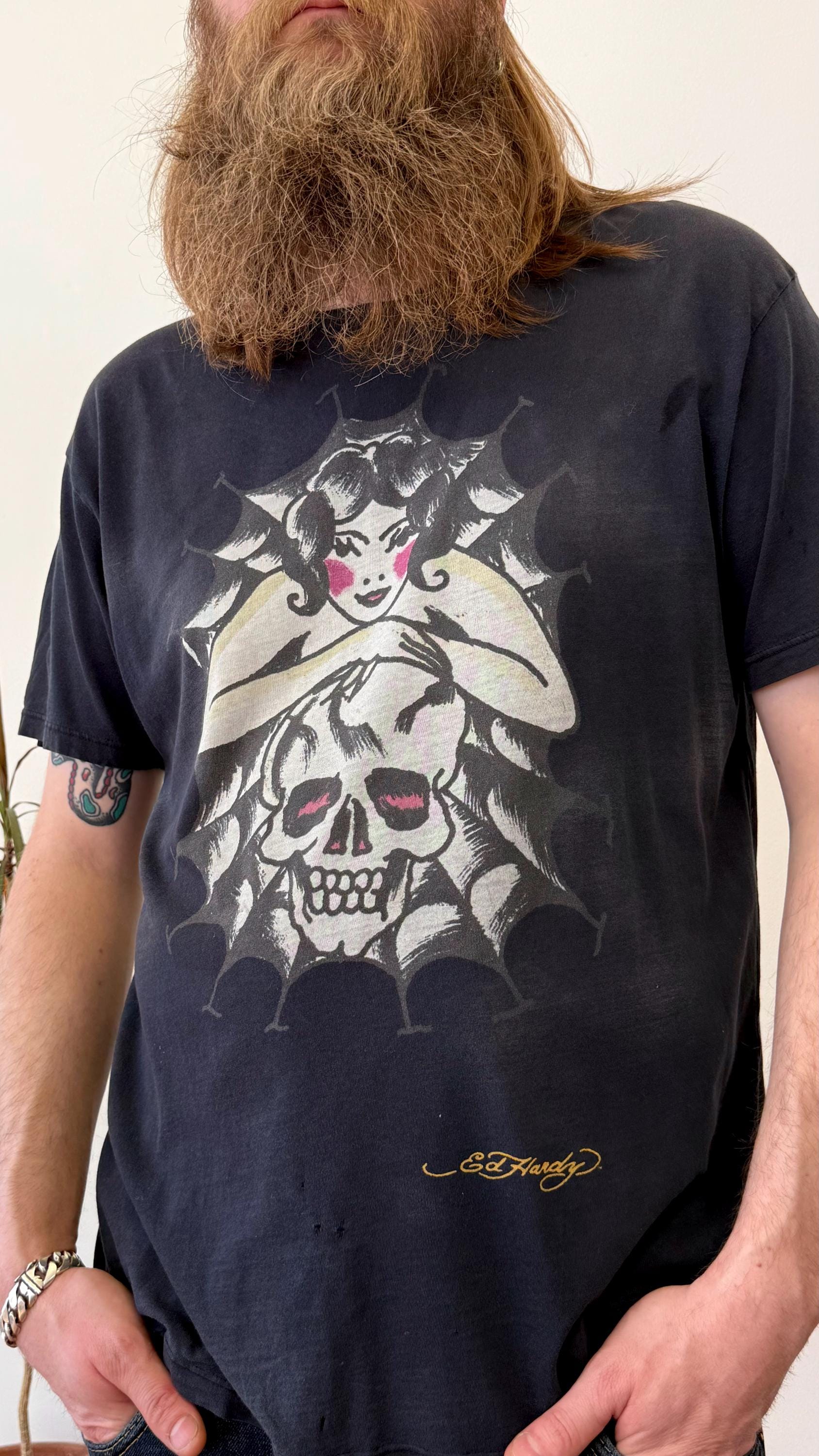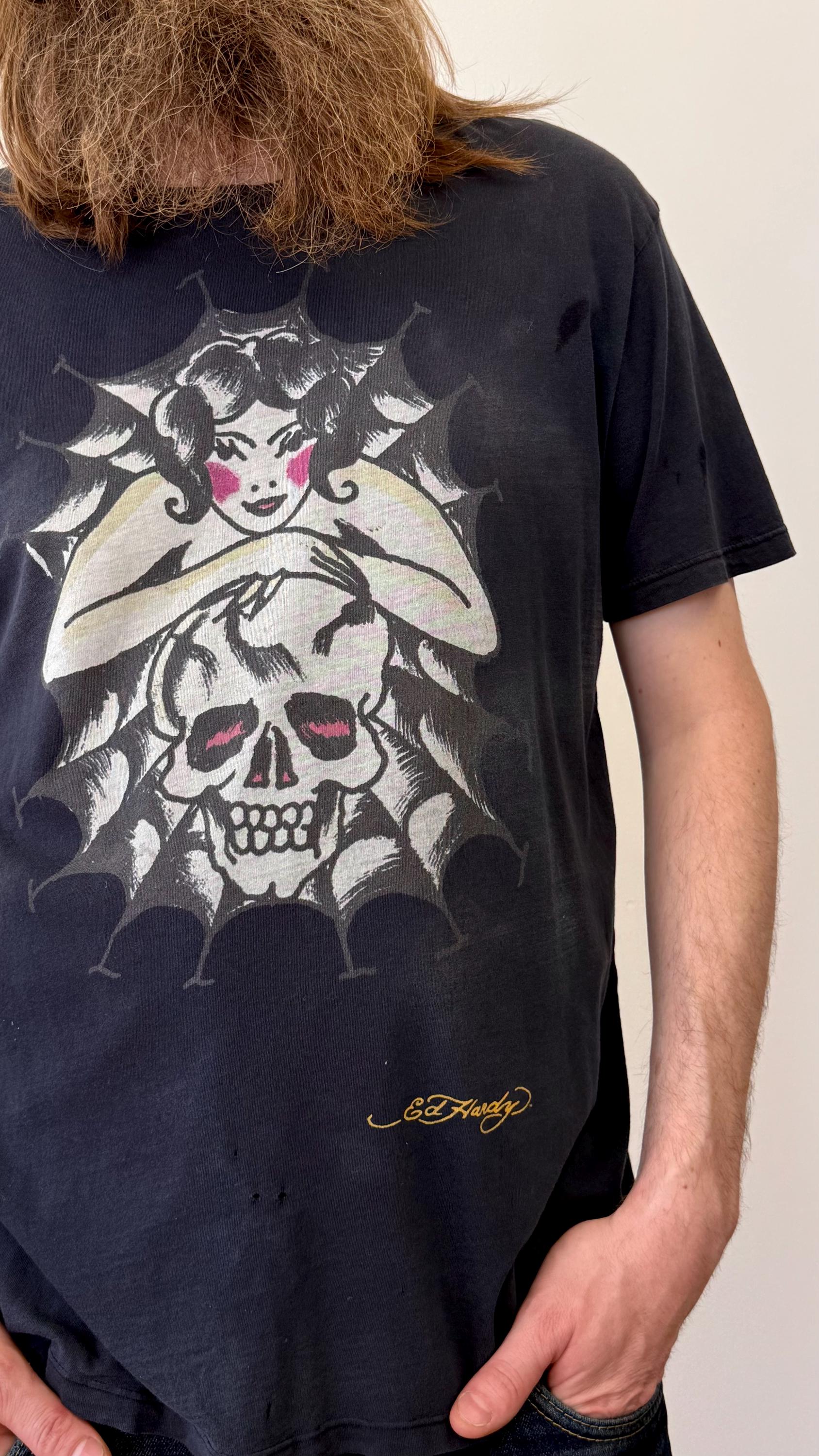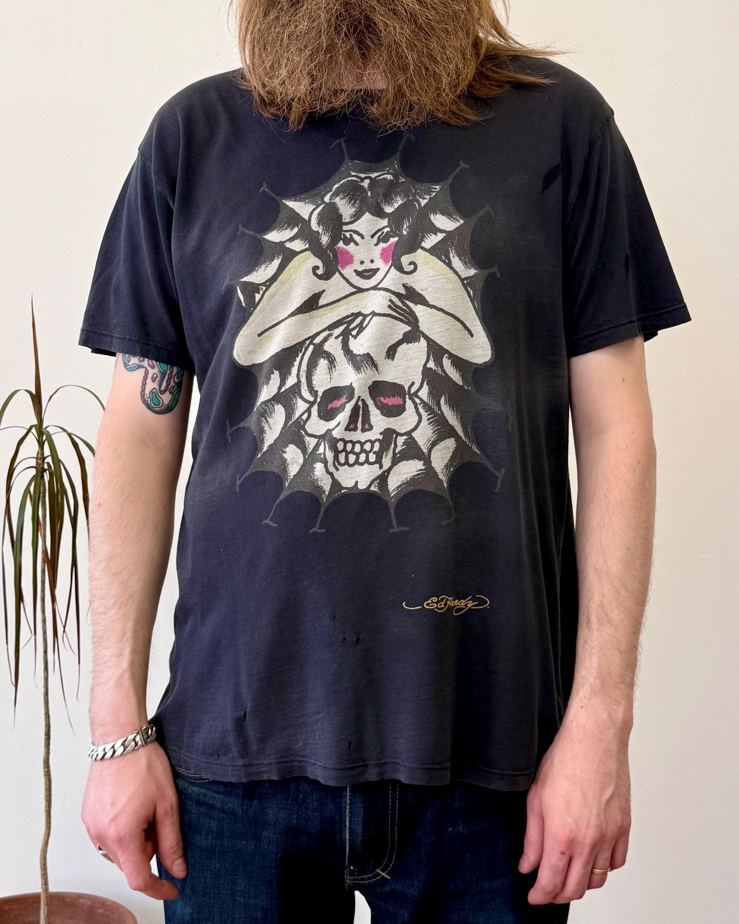 An authentic vintage t shirt featuring a lady with skull and spiderweb traditional tattoo graphic by Ed Hardy. airbrush print motif on both sides with “Don Ed Hardy designs” across back. a soft well worn, distressed tee. stretches to fit. made in USA