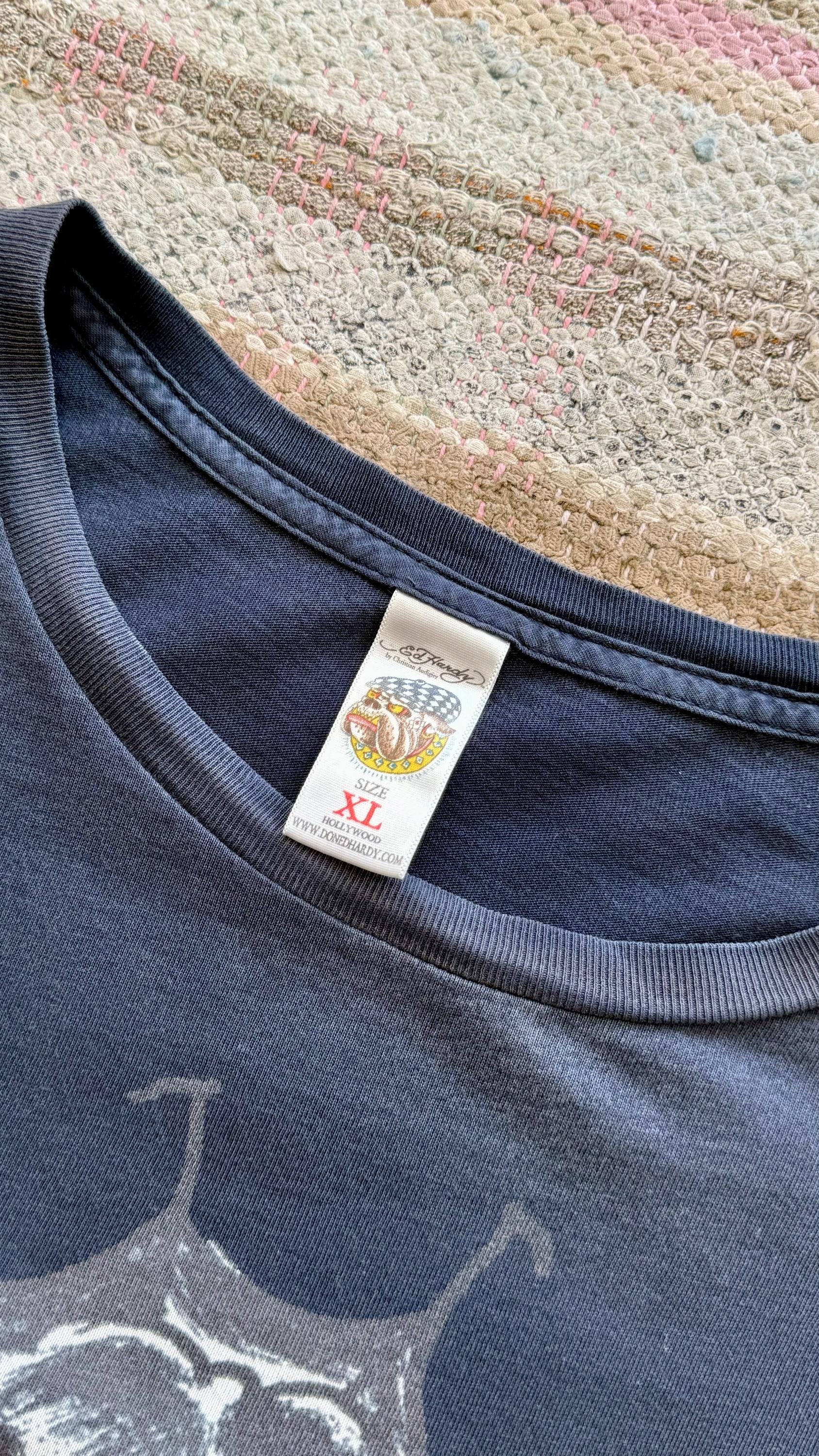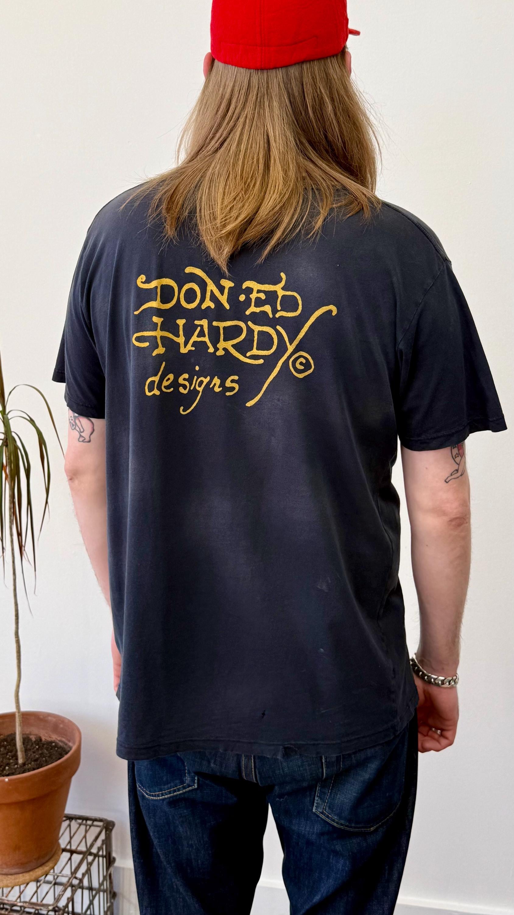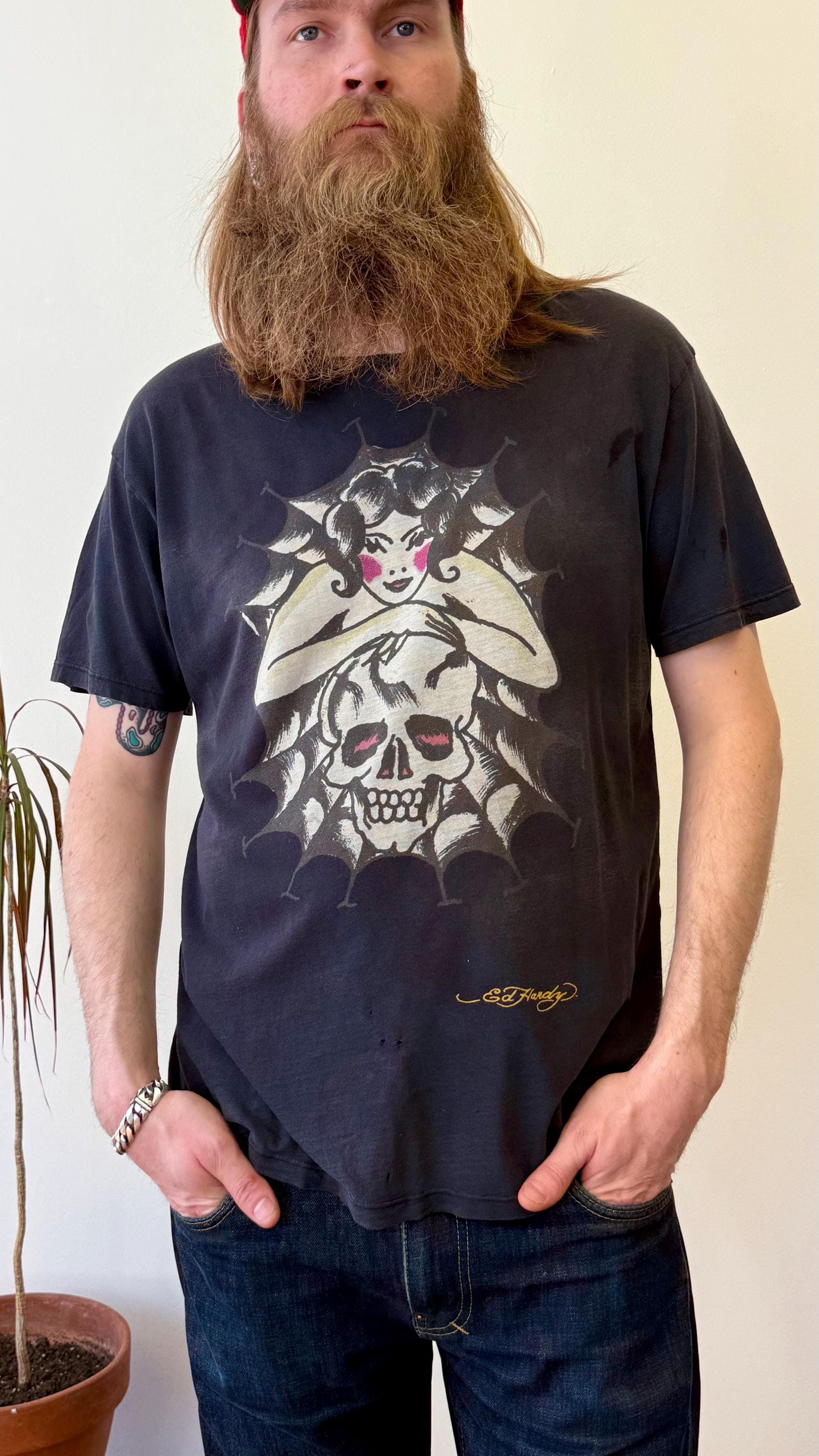 An authentic vintage t shirt featuring a lady with skull and spiderweb traditional tattoo graphic by Ed Hardy. airbrush print motif on both sides with “Don Ed Hardy designs” across back. a soft well worn, distressed tee. stretches to fit. made in USA