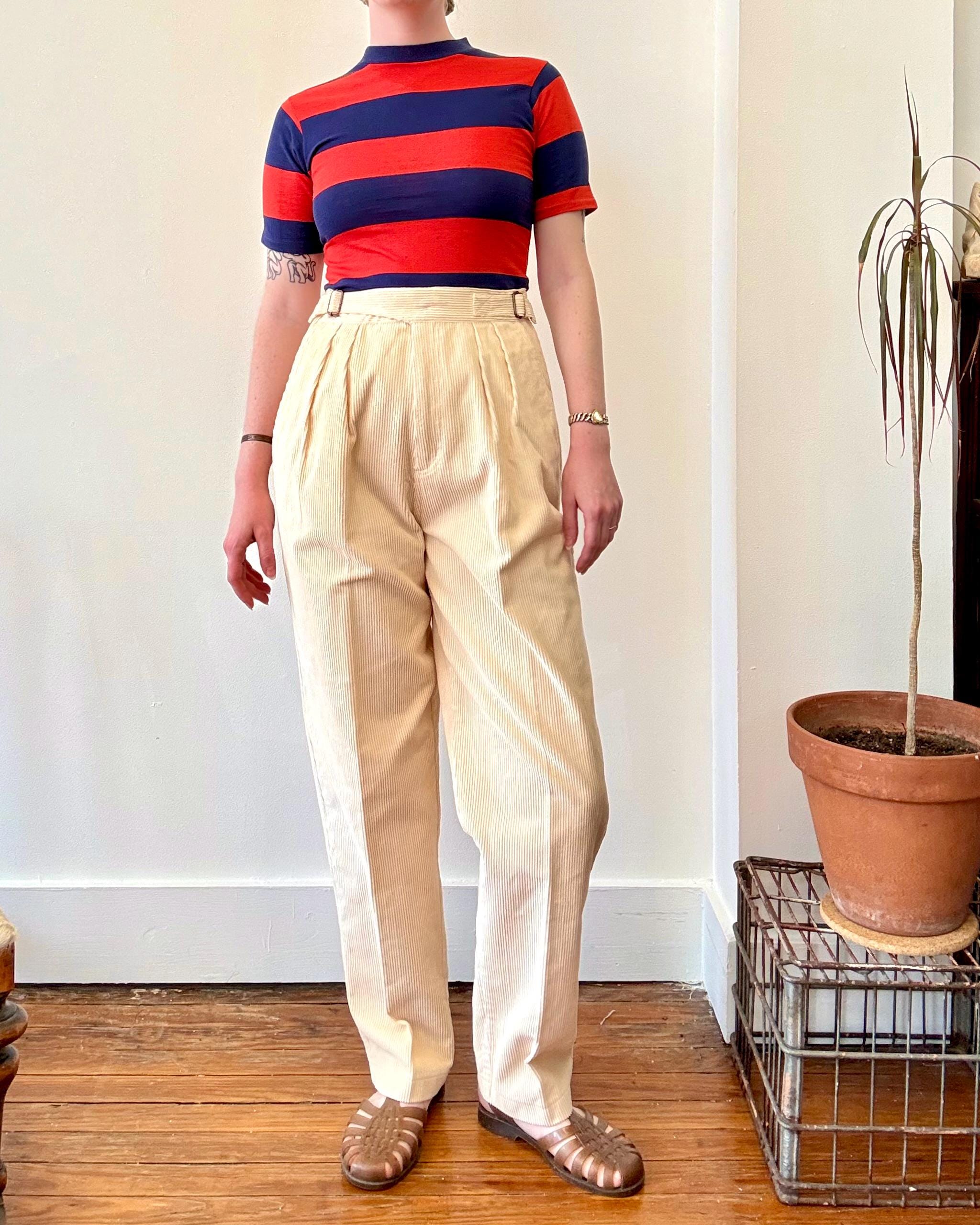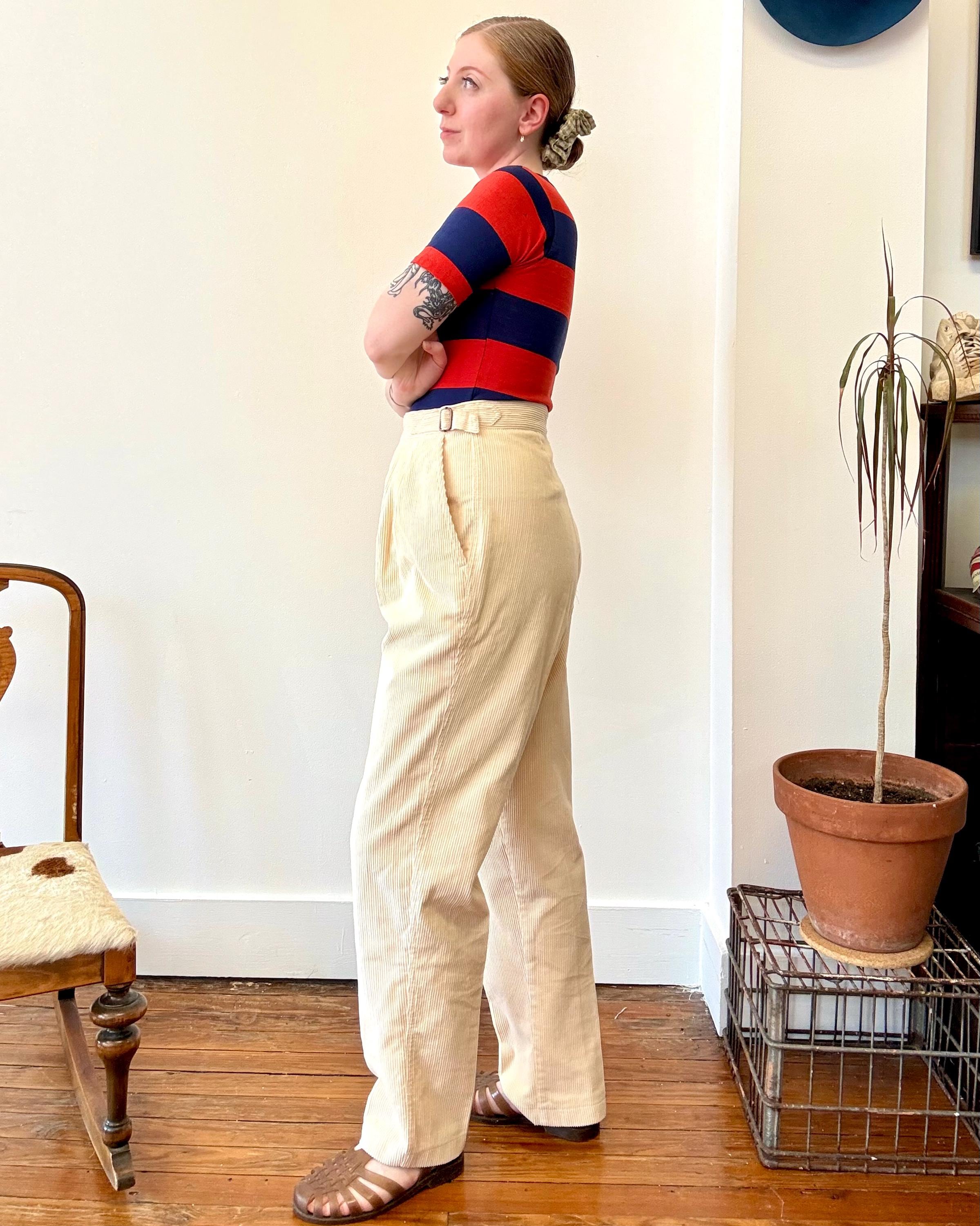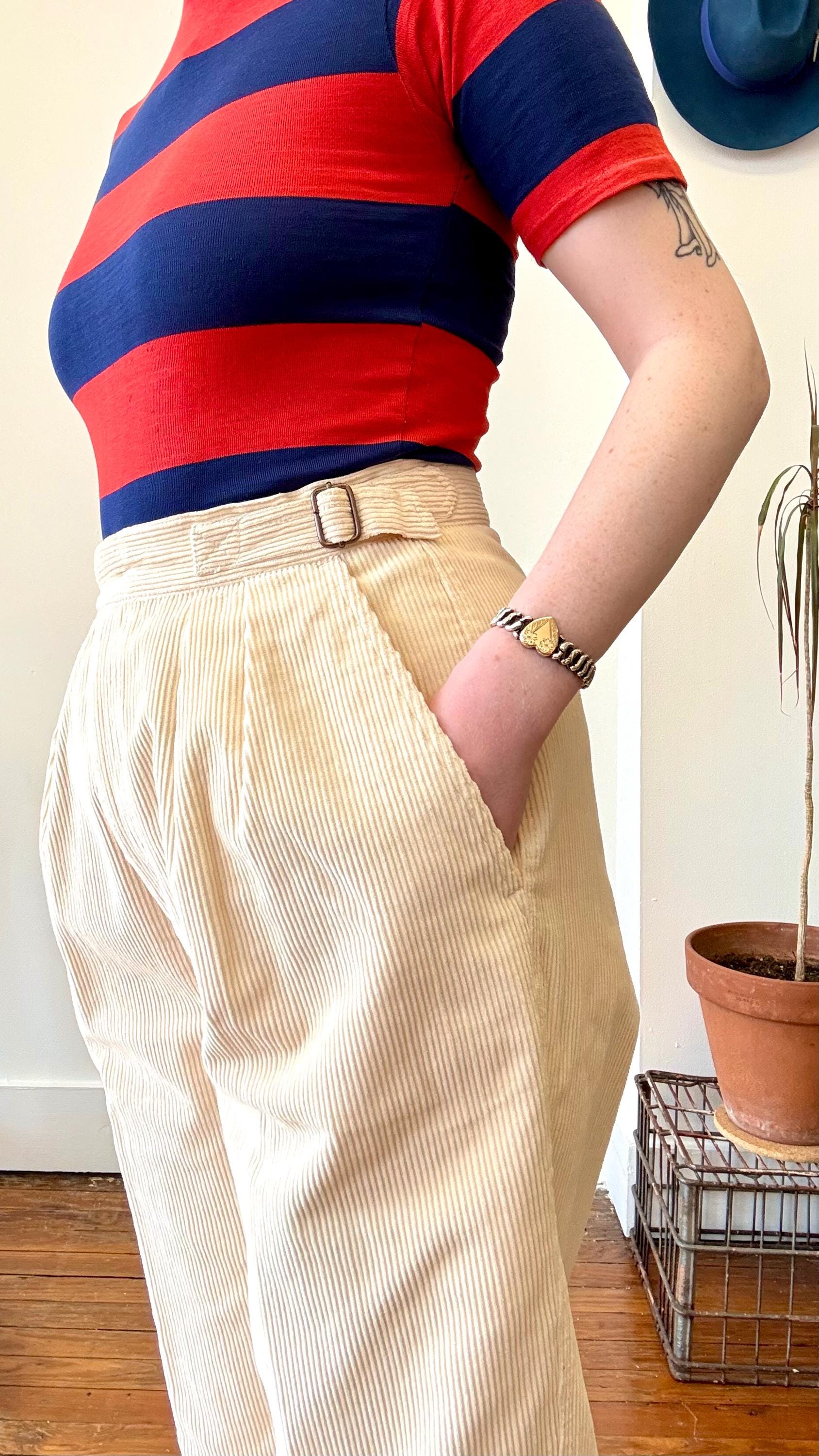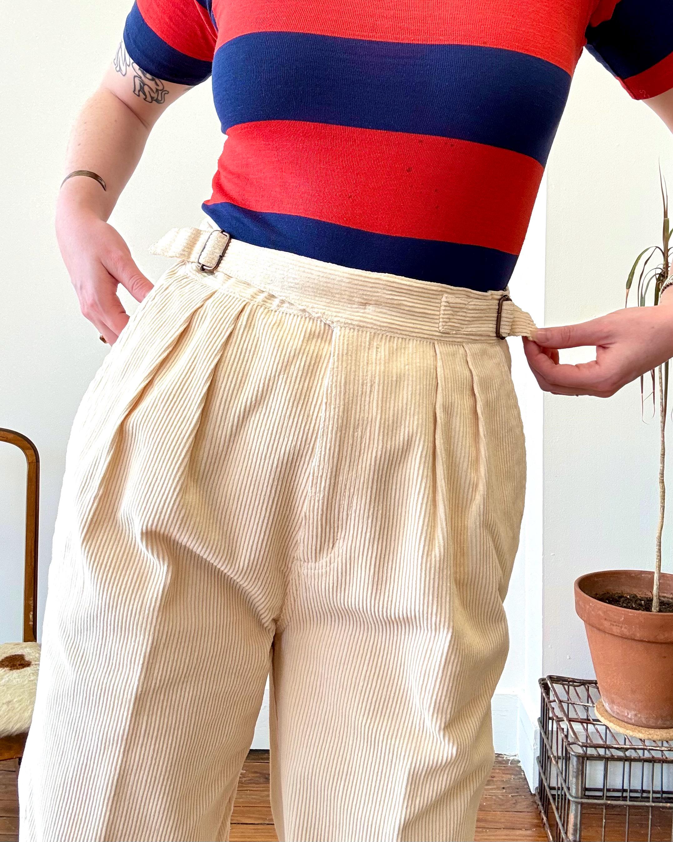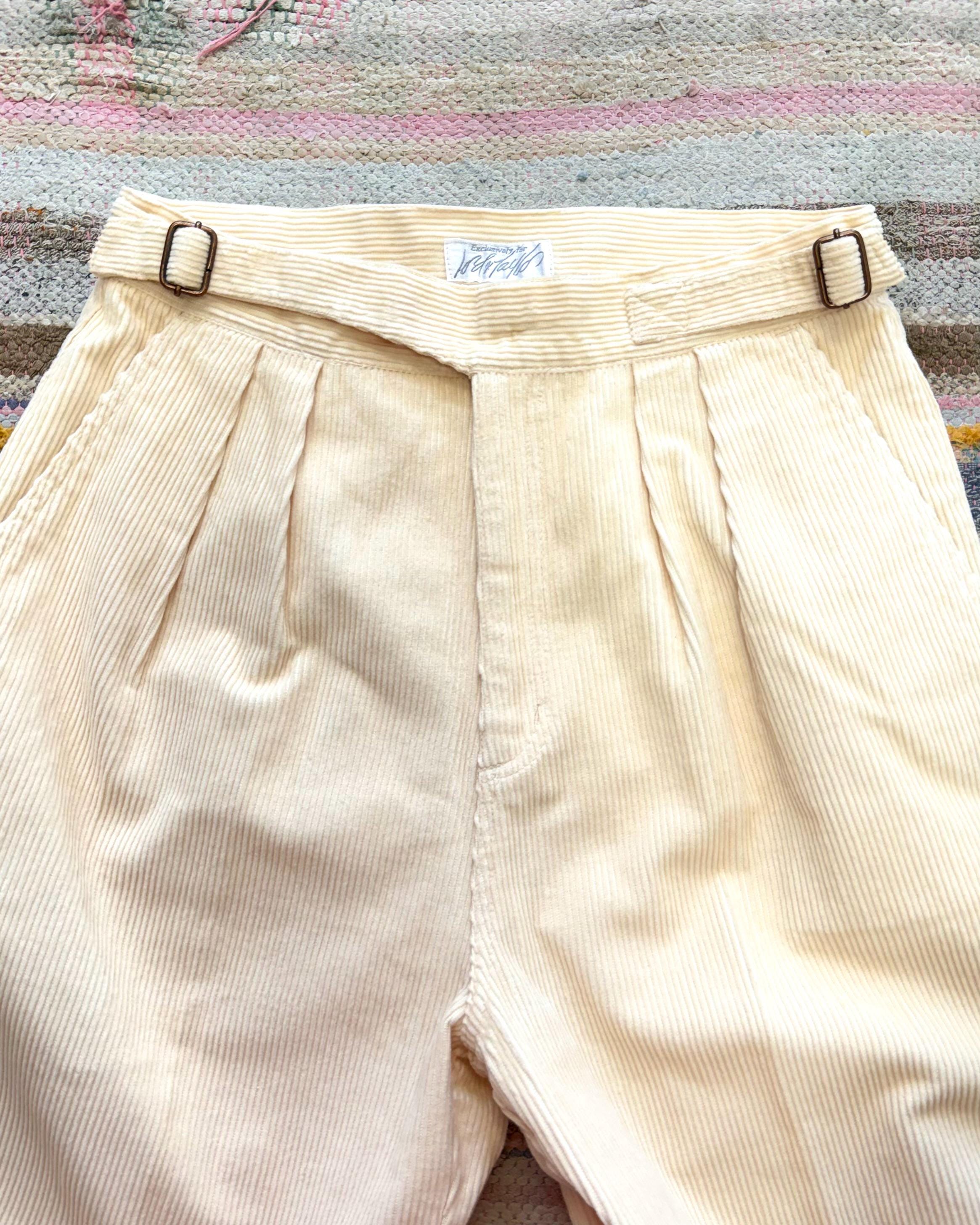 An authentic vintage pair of Gurkha style pants. a feminine pleated trouser with an adjustable slide buckle wrap waistline detail to create the perfect fit. fastens with a zipper fly and button underneath. features a high rise and tailored fit across the hip with a relaxed, loose tapered leg. made from a luxurious cotton plush corduroy. private label for Lord & Taylor.