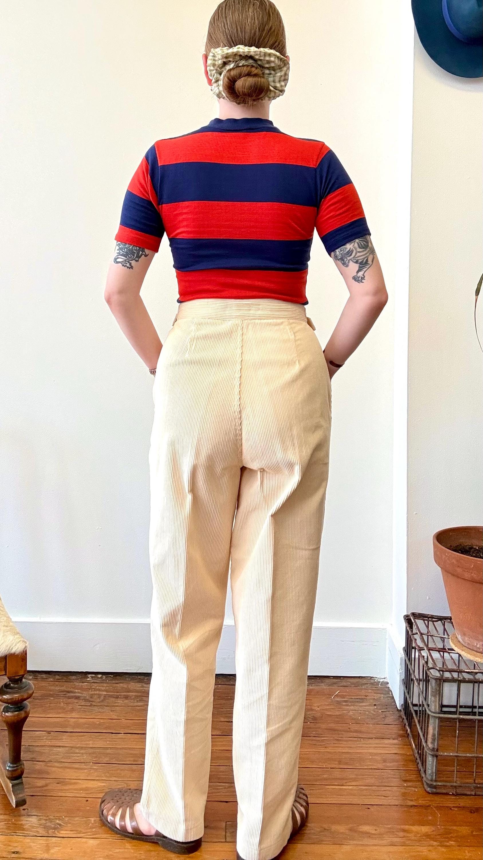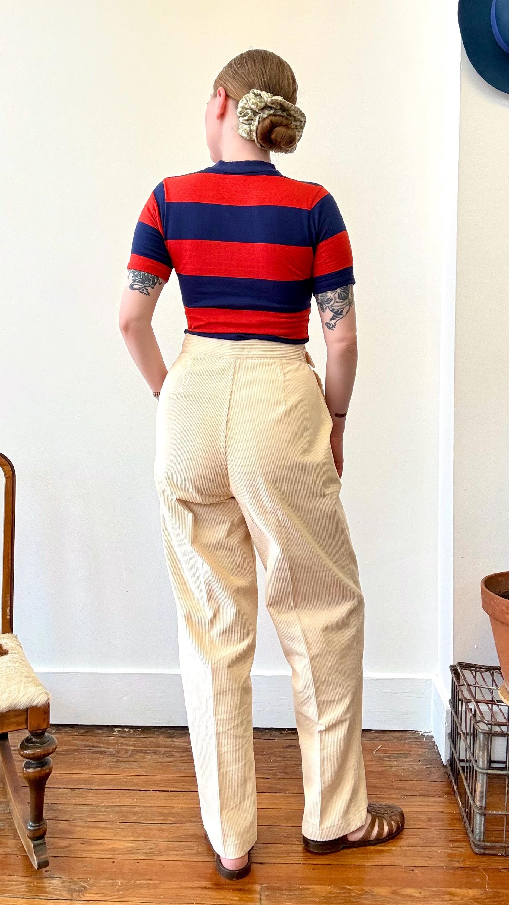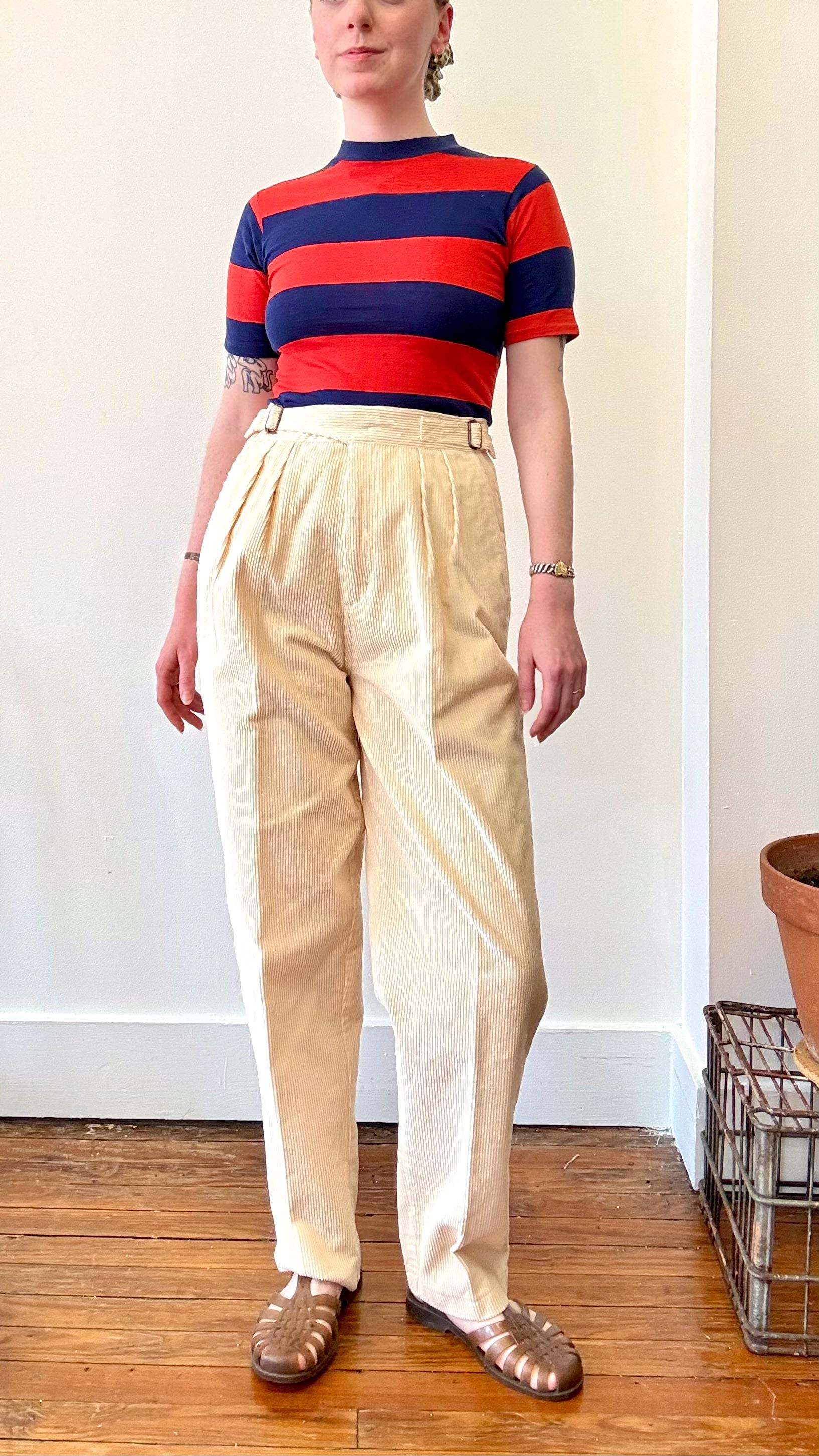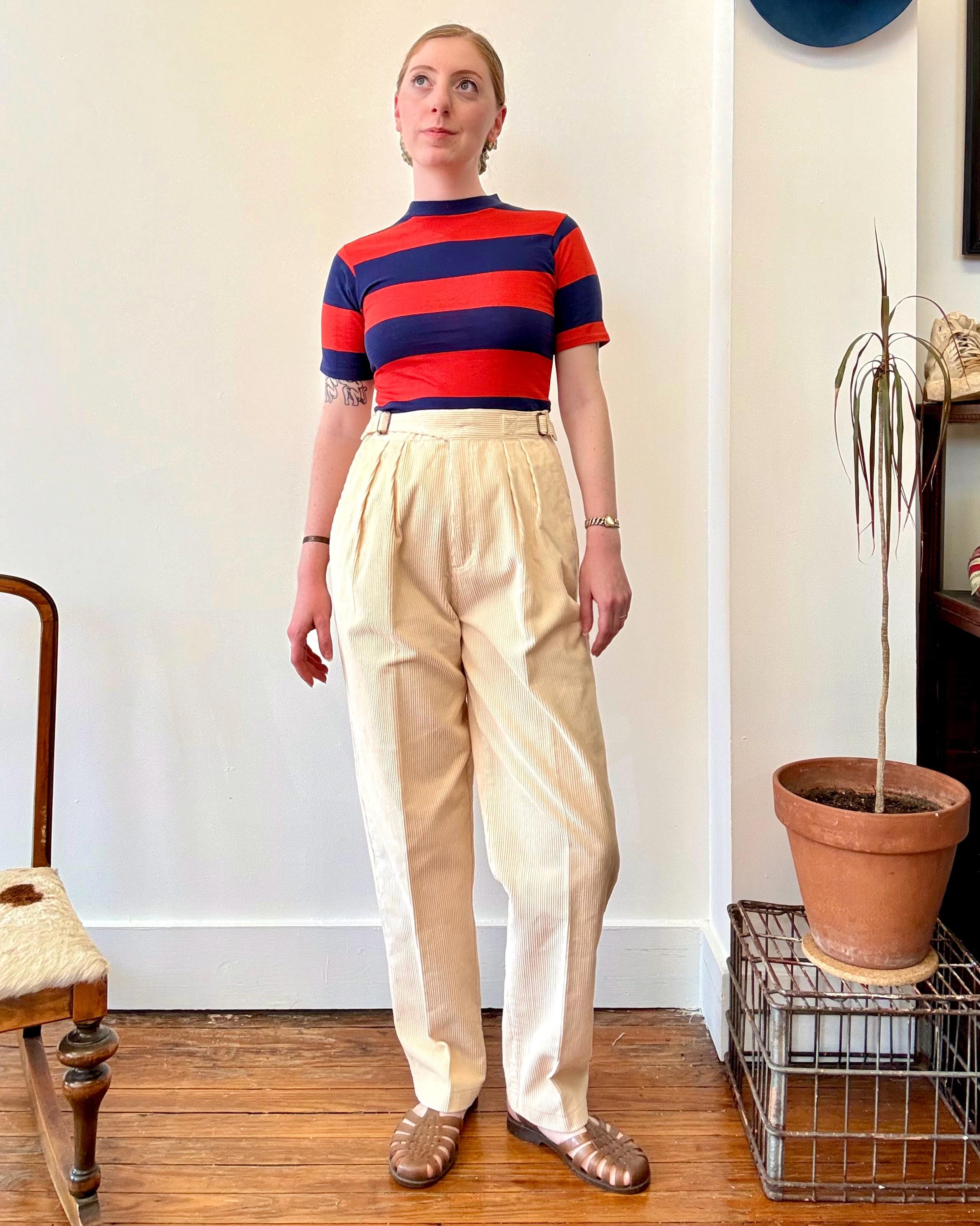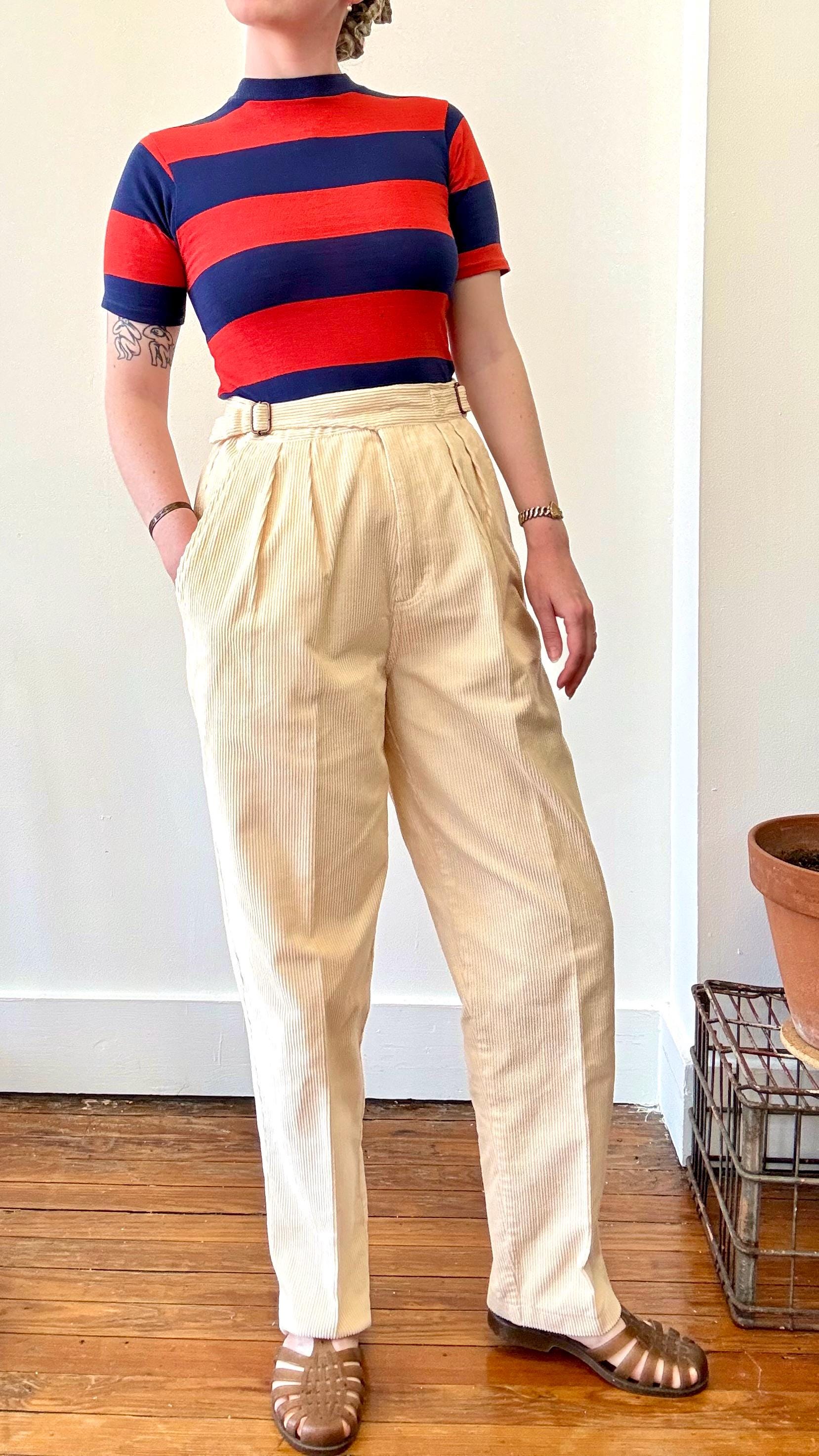 An authentic vintage pair of Gurkha style pants. a feminine pleated trouser with an adjustable slide buckle wrap waistline detail to create the perfect fit. fastens with a zipper fly and button underneath. features a high rise and tailored fit across the hip with a relaxed, loose tapered leg. made from a luxurious cotton plush corduroy. private label for Lord & Taylor.