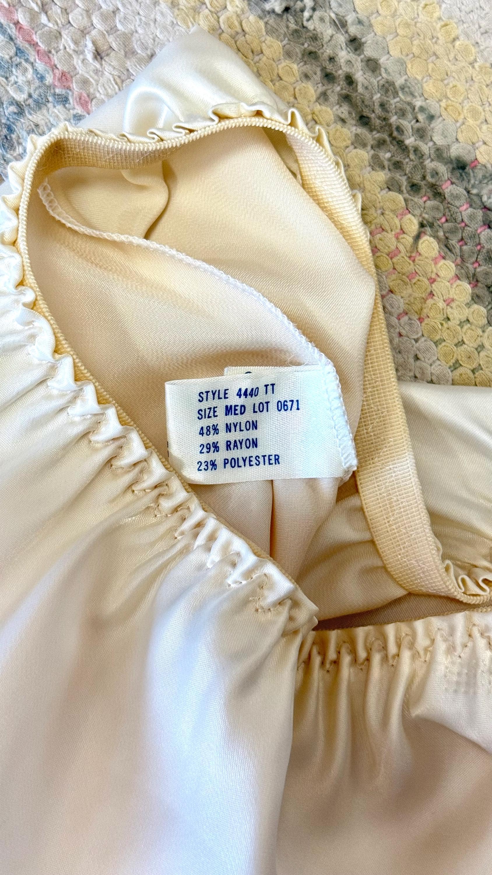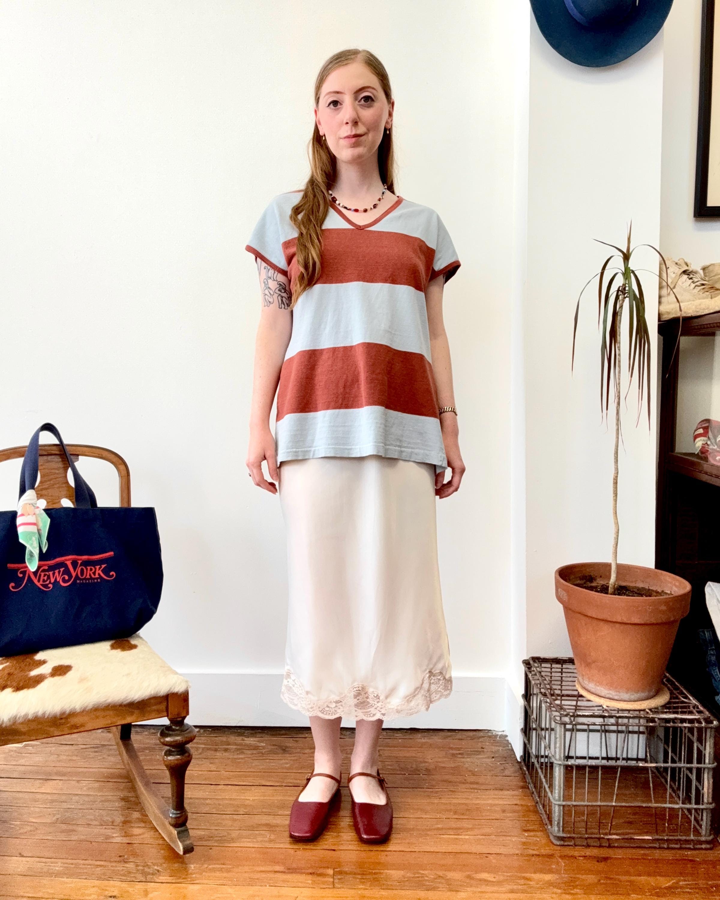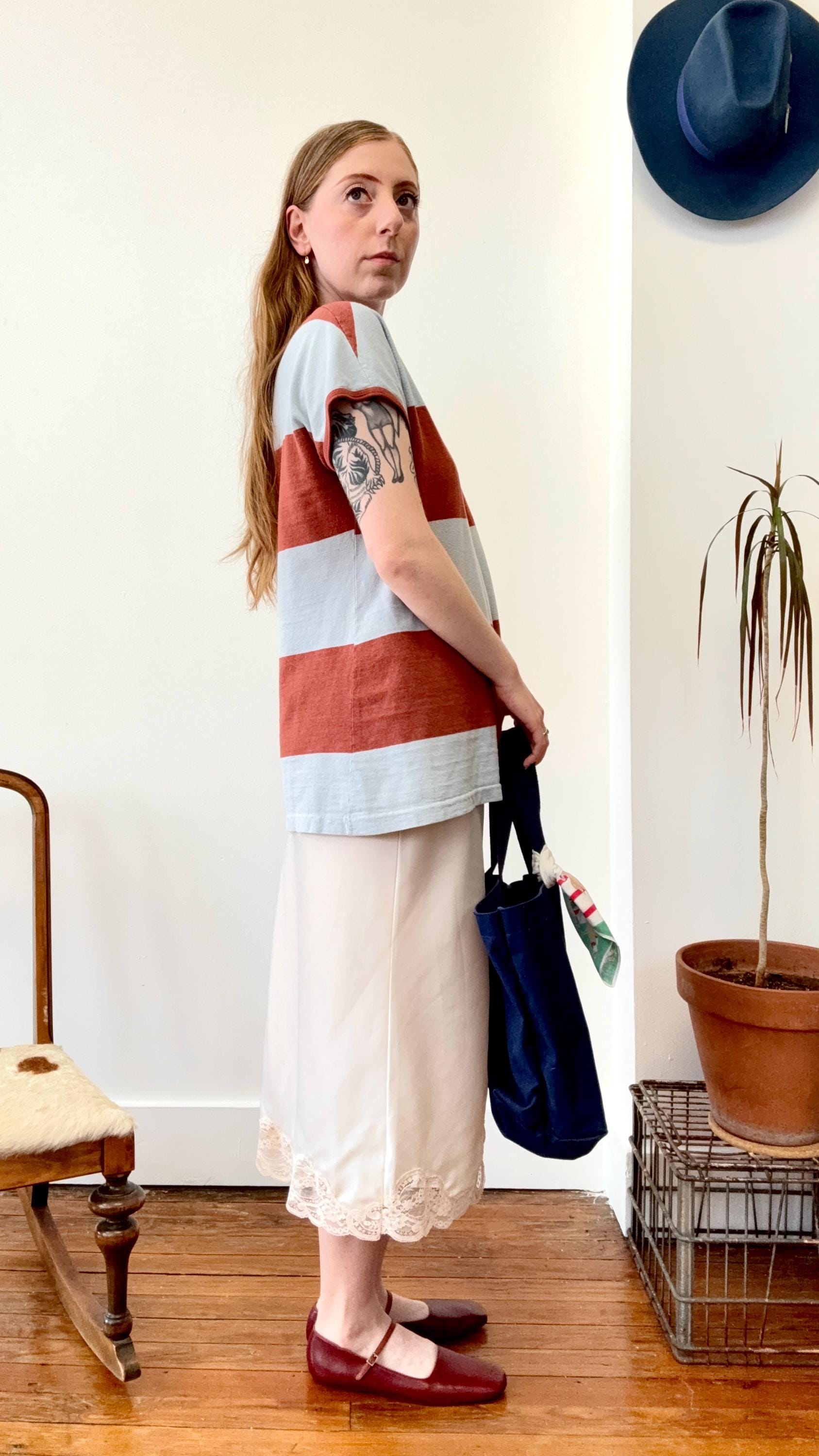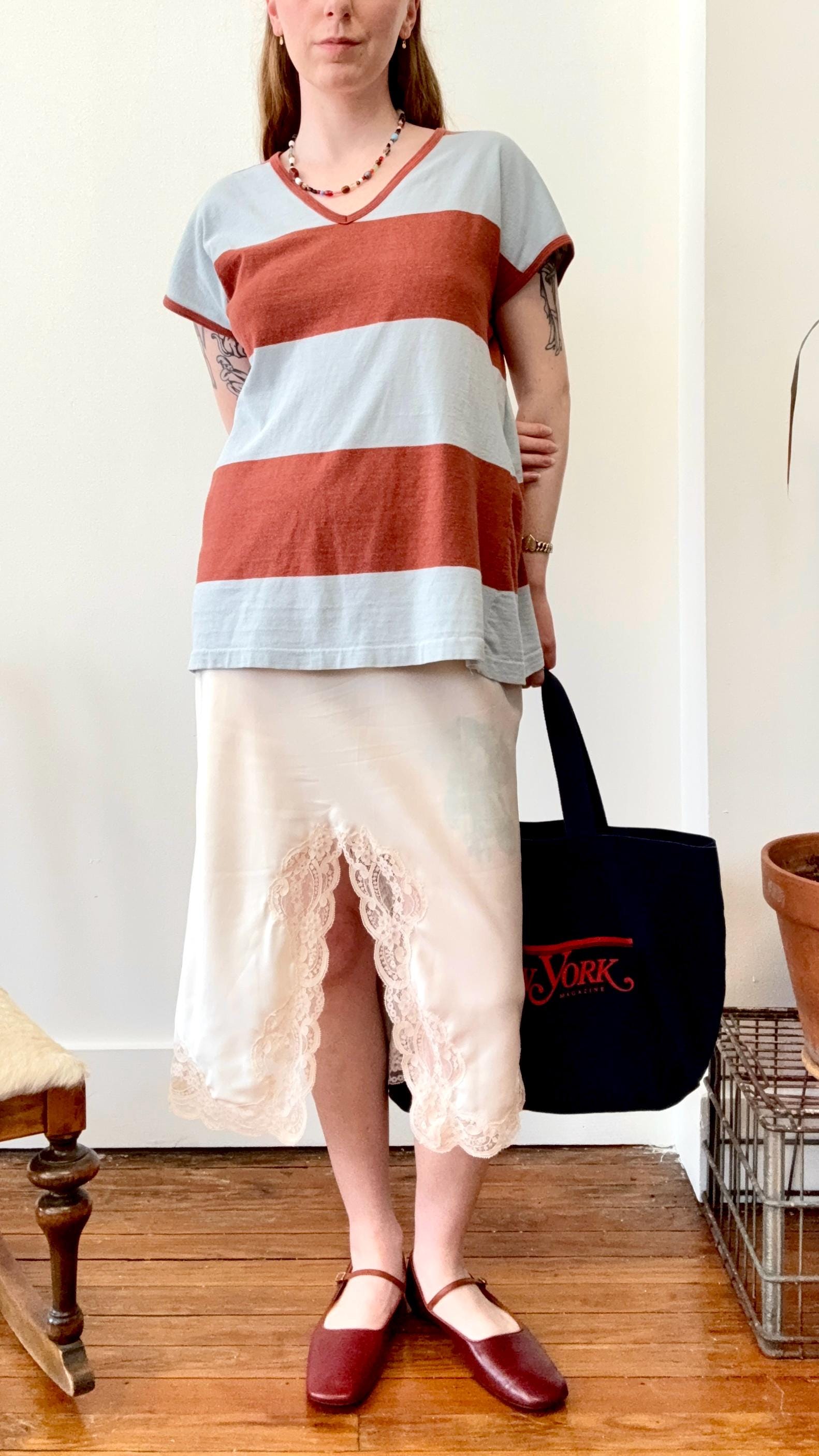 An authentic vintage half slip skirt. originally designed to wear under another skirt or dress but for today, can be worn on its own. though it is somewhat sheer, there are many ways to style or layer to achieve your preferred coverage. crafted from a fine satin fabric, cut slightly on the bias for a nice drape and movement. stretch elastic waistband. a subtle contrast pale peach lace trim hem. split slit can be worn in the front or back. Wonder Maid label. made in USA