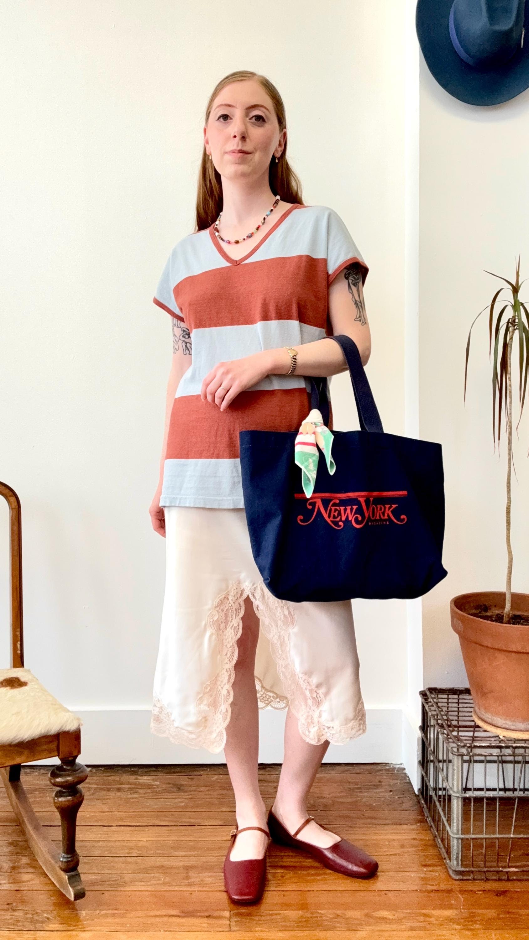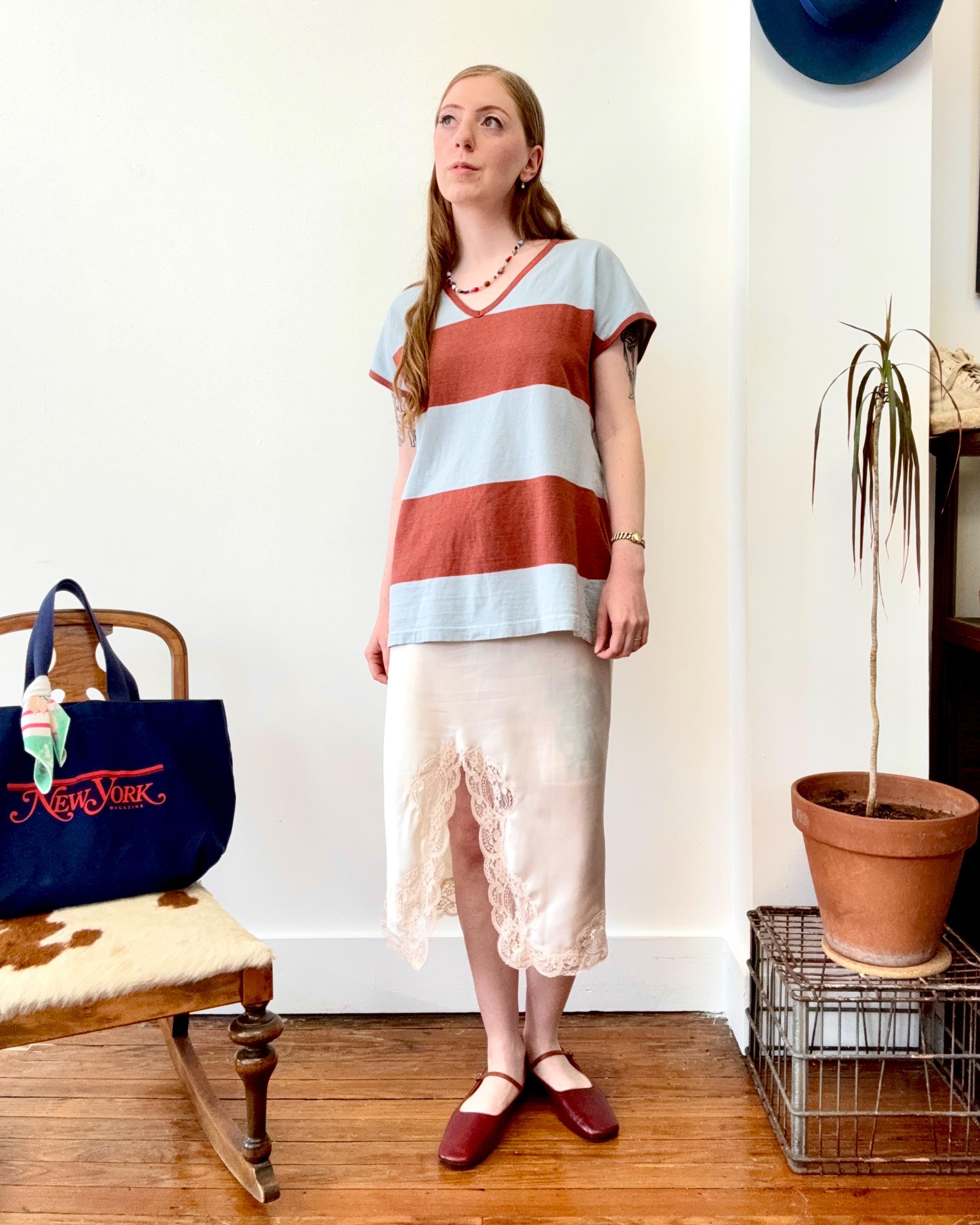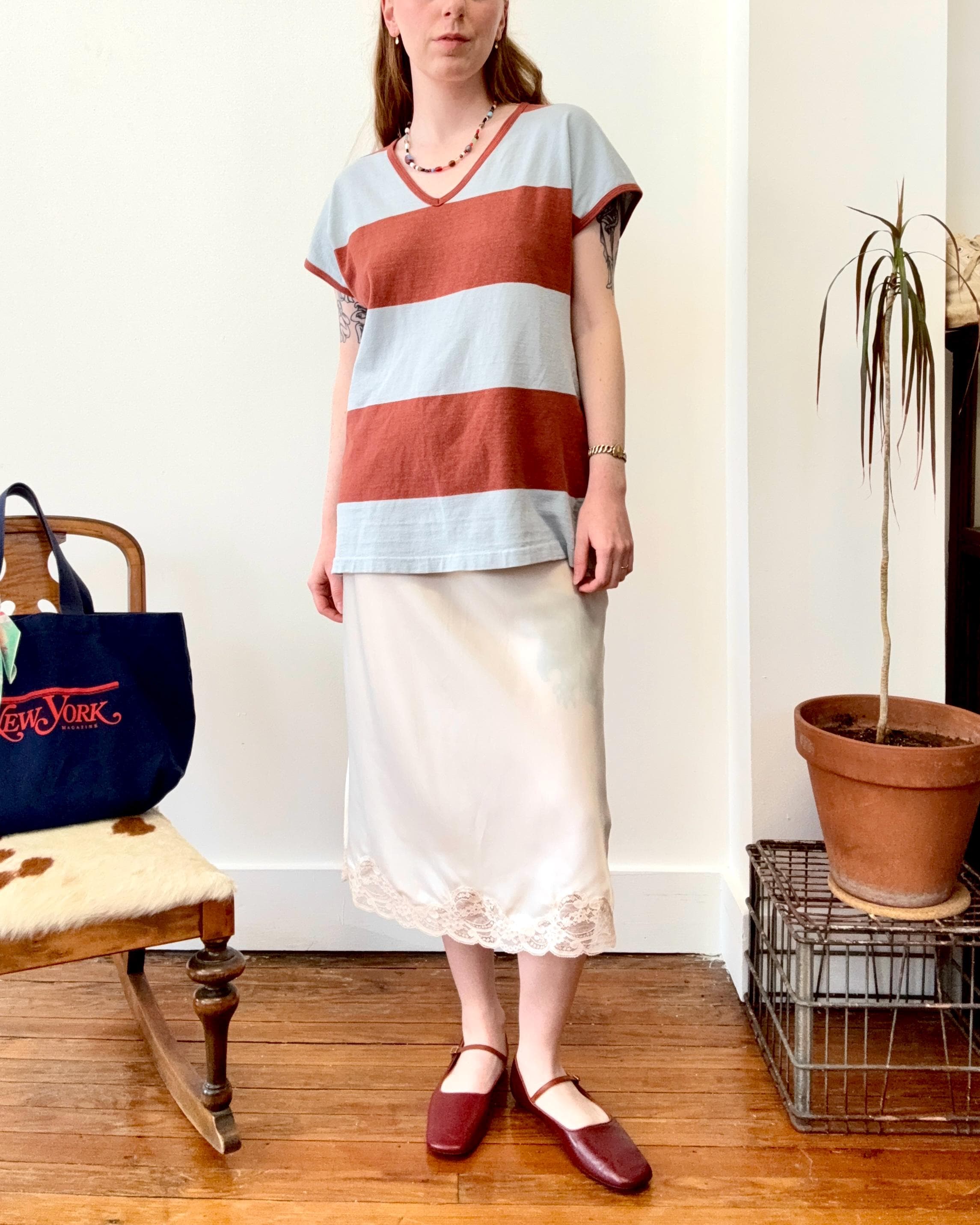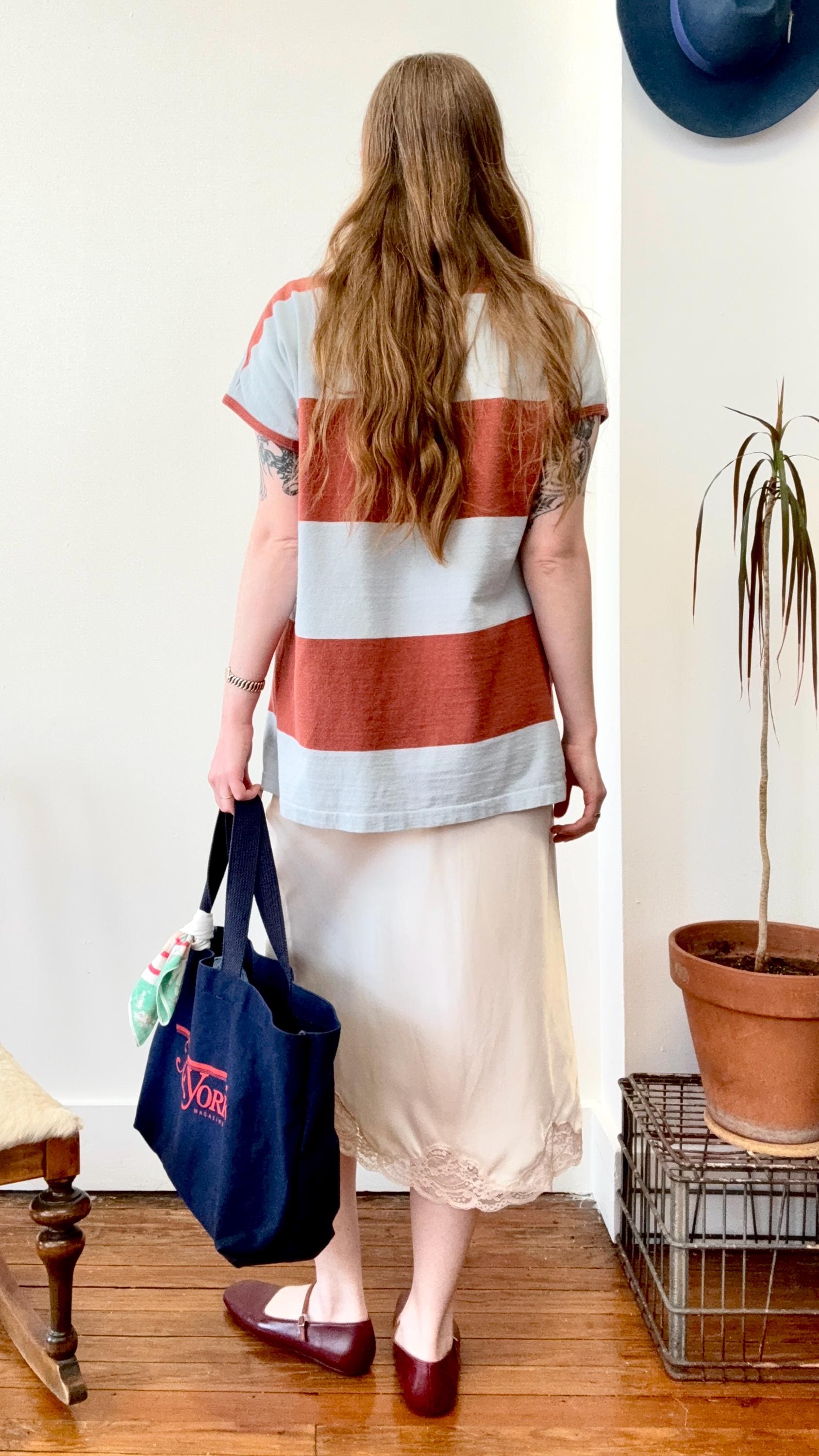 An authentic vintage half slip skirt. originally designed to wear under another skirt or dress but for today, can be worn on its own. though it is somewhat sheer, there are many ways to style or layer to achieve your preferred coverage. crafted from a fine satin fabric, cut slightly on the bias for a nice drape and movement. stretch elastic waistband. a subtle contrast pale peach lace trim hem. split slit can be worn in the front or back. Wonder Maid label. made in USA