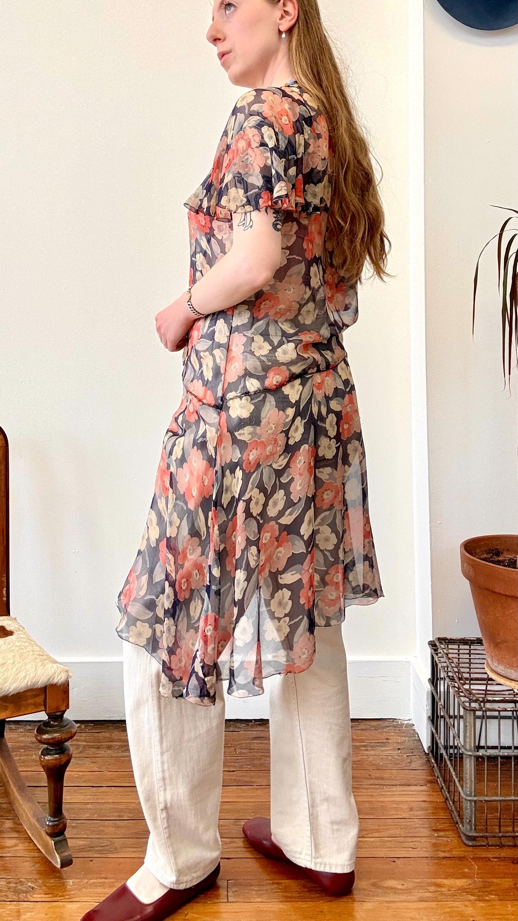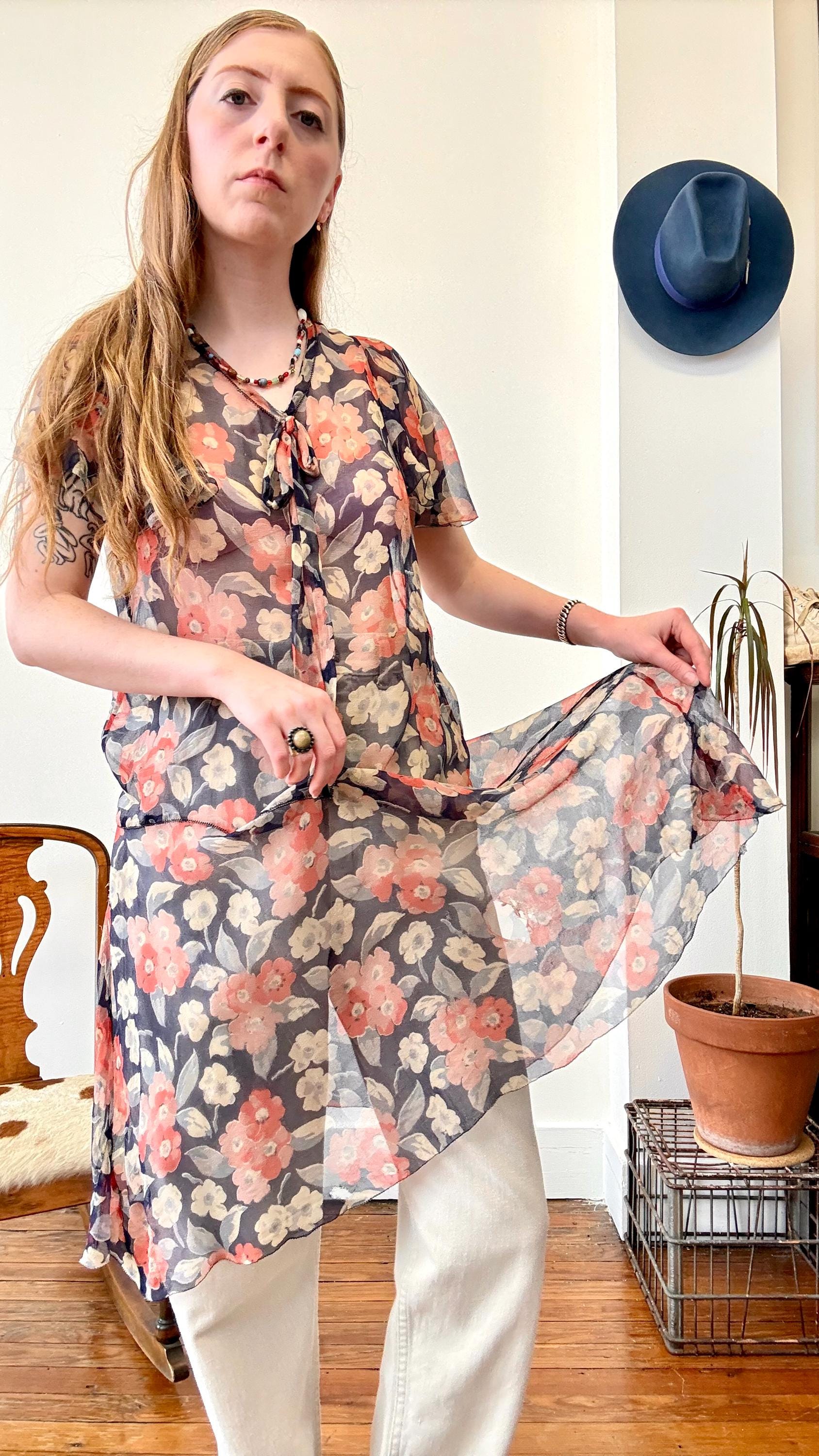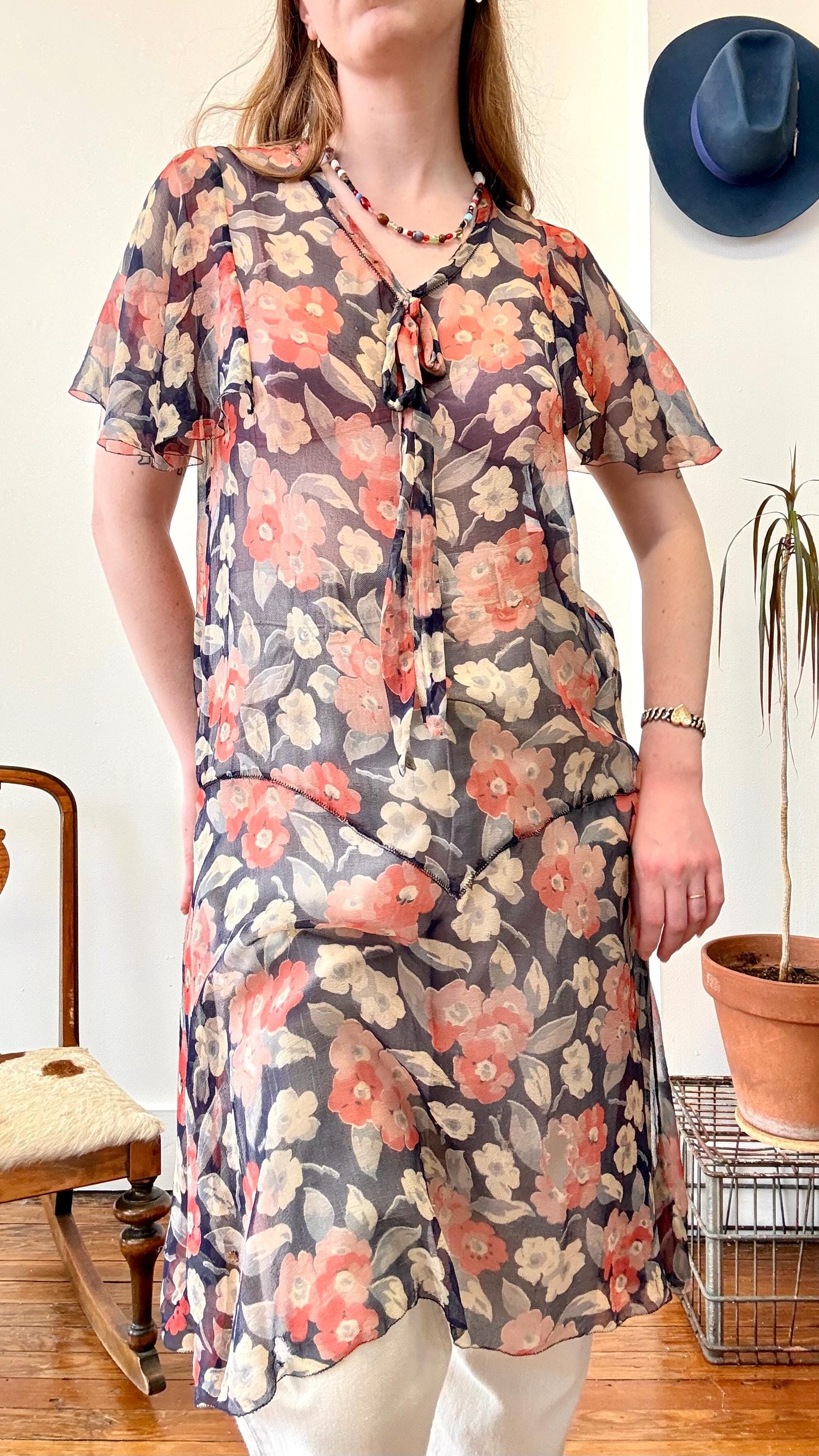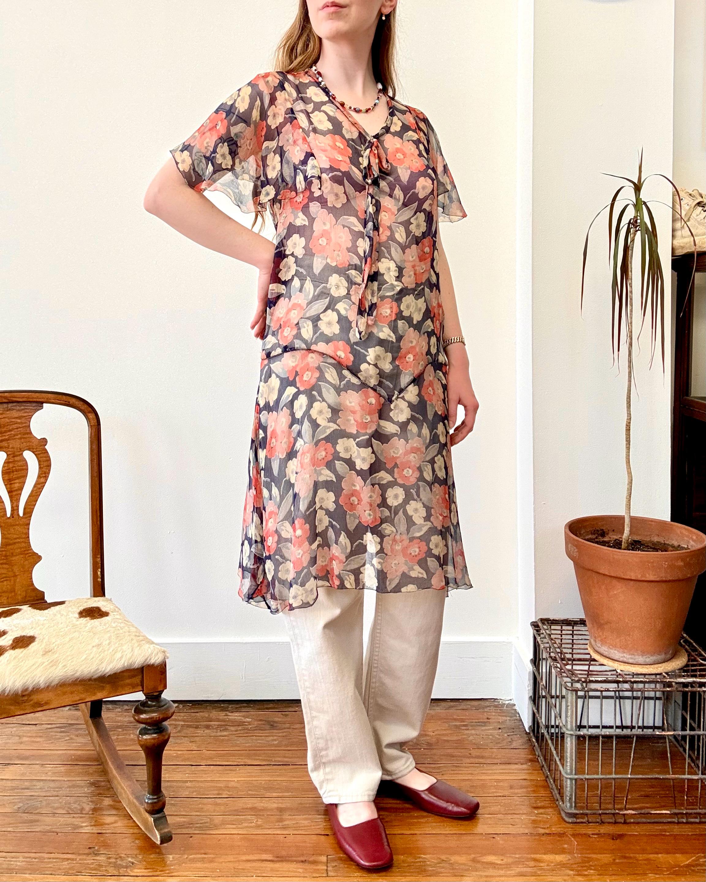 An authentic antique silk crepe drop waist dress. this flapper era dress features a deco geranium or poppy floral print, flutter sleeves, a bow necktie, and handkerchief style hem. a completely sheer garment designed to be worn loose and can be layered to your preference.