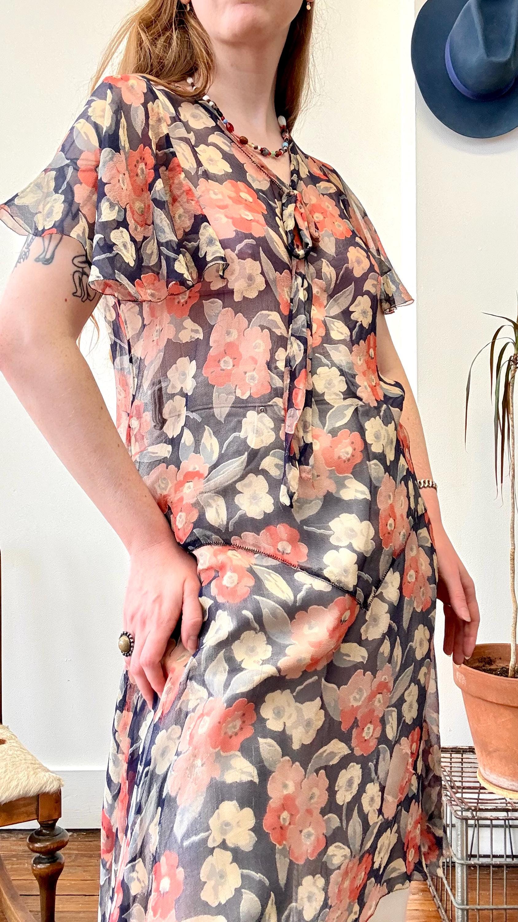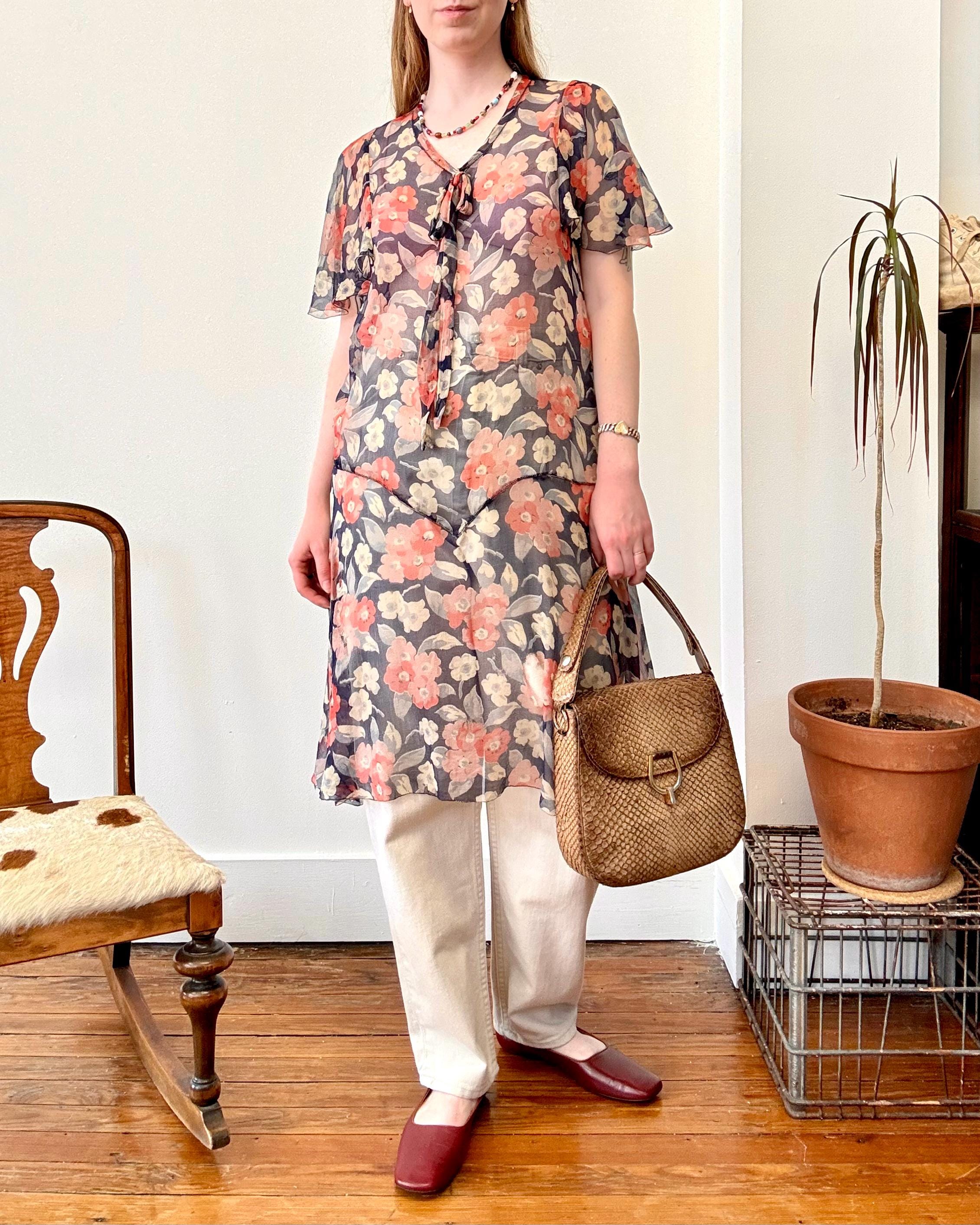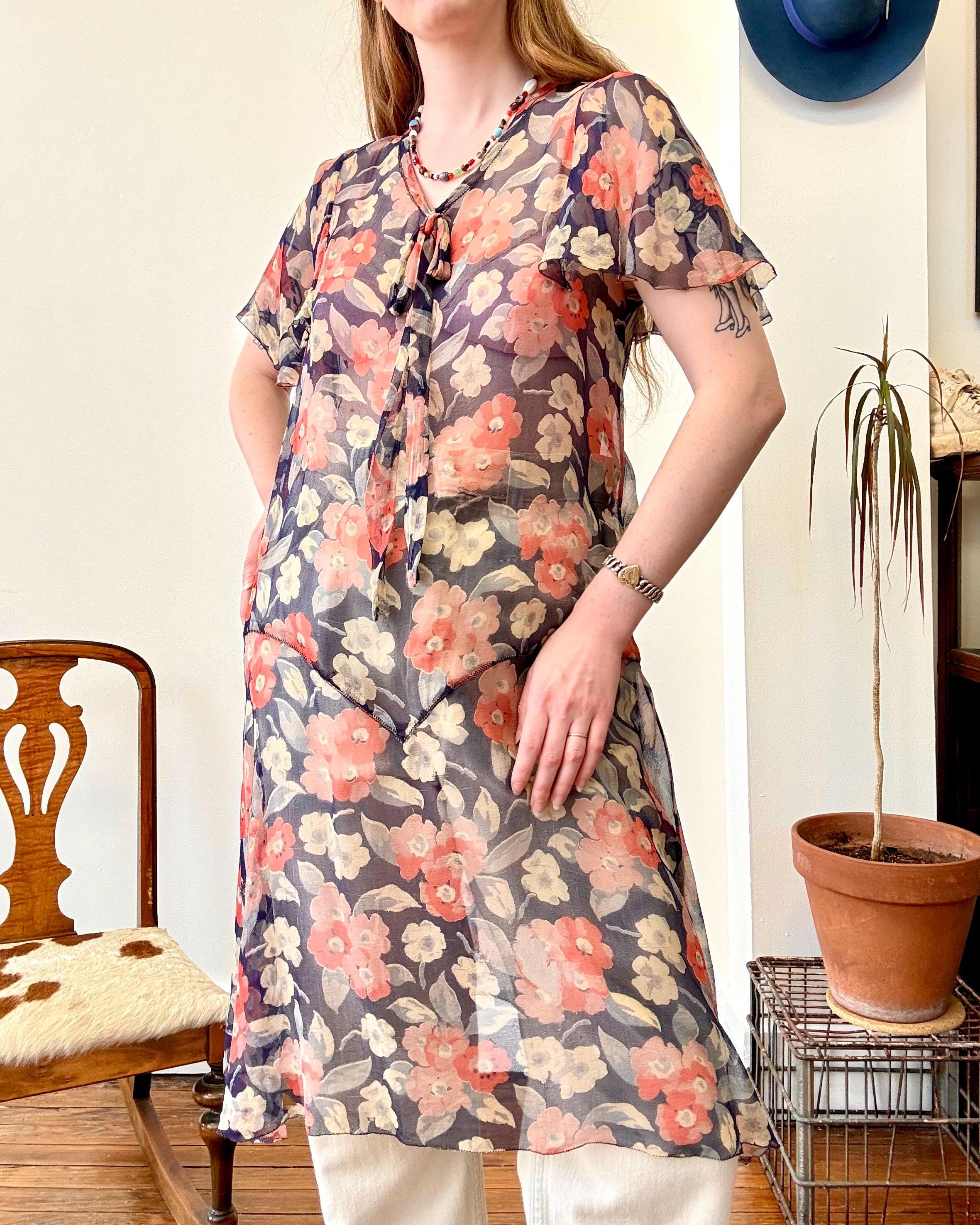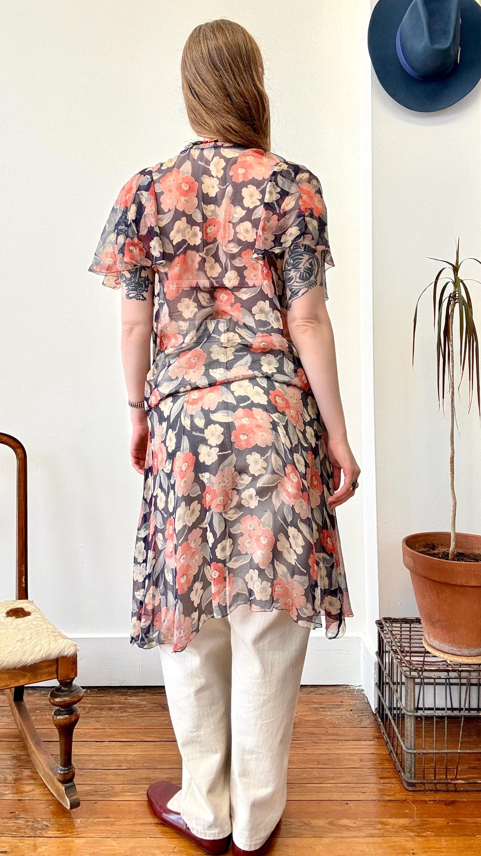 An authentic antique silk crepe drop waist dress. this flapper era dress features a deco geranium or poppy floral print, flutter sleeves, a bow necktie, and handkerchief style hem. a completely sheer garment designed to be worn loose and can be layered to your preference.