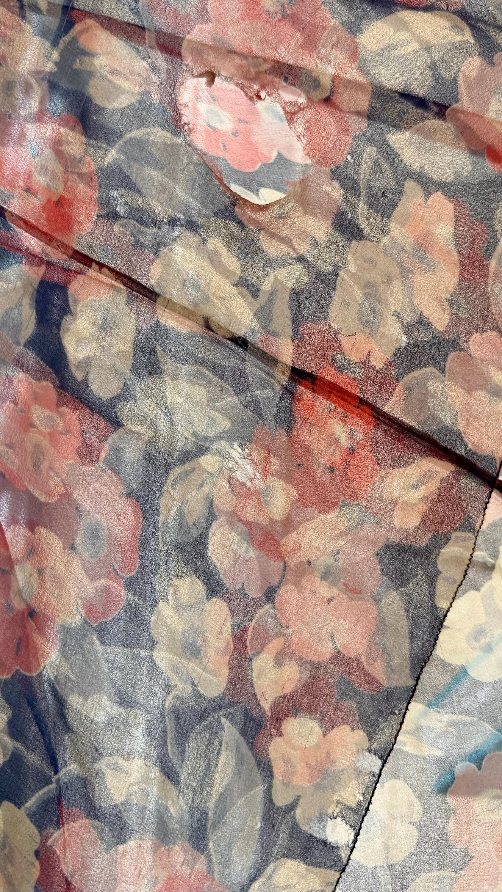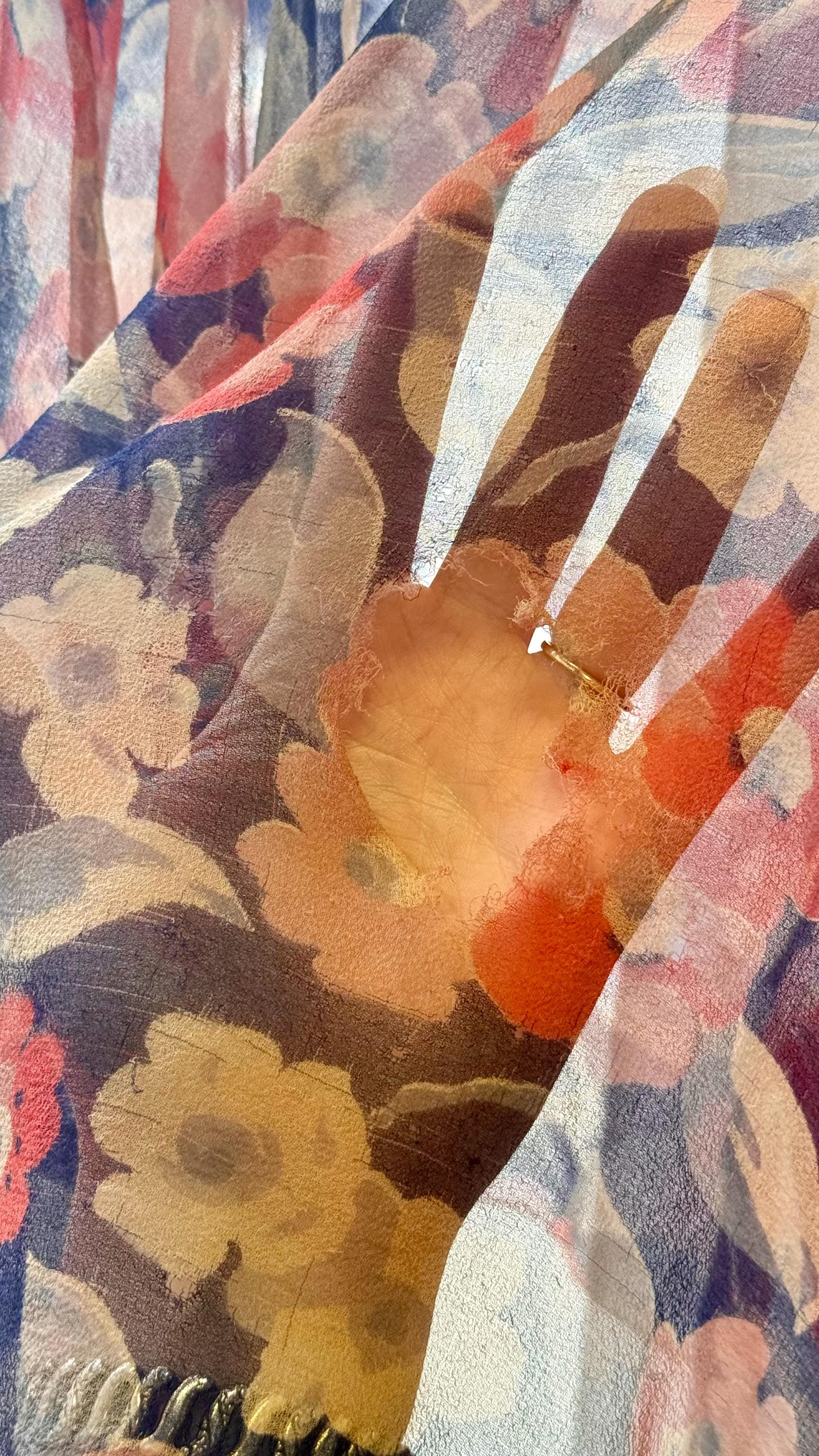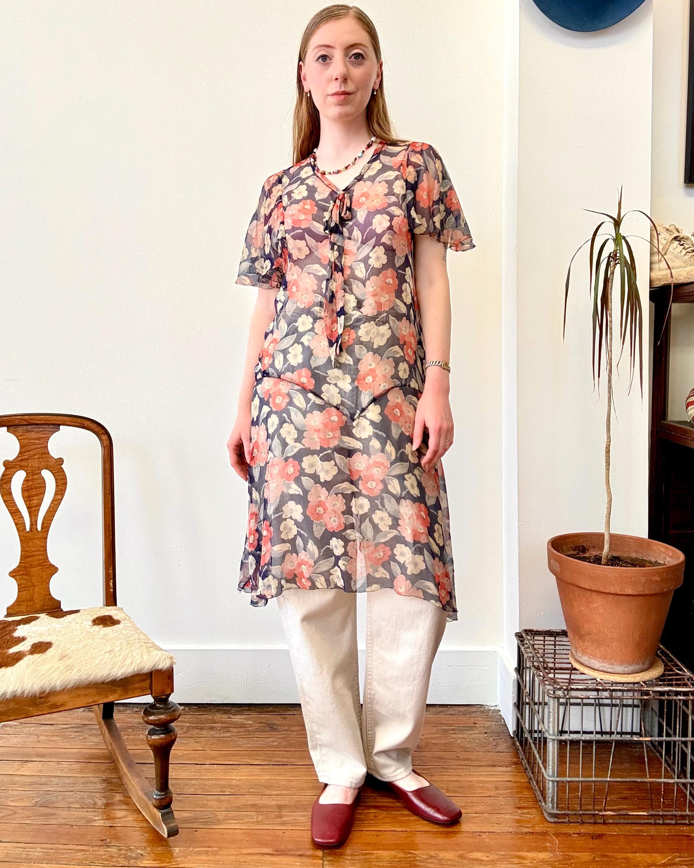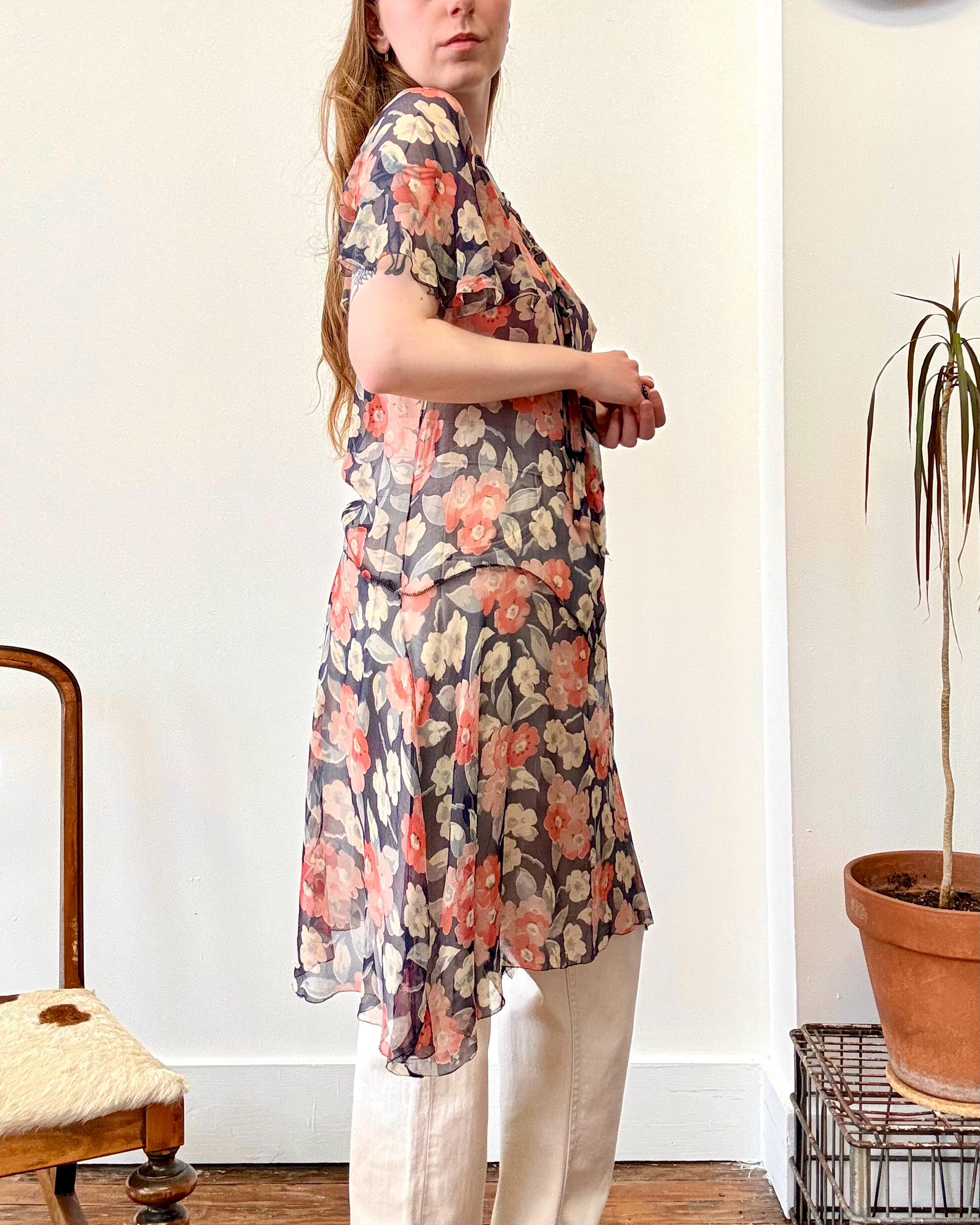 An authentic antique silk crepe drop waist dress. this flapper era dress features a deco geranium or poppy floral print, flutter sleeves, a bow necktie, and handkerchief style hem. a completely sheer garment designed to be worn loose and can be layered to your preference.