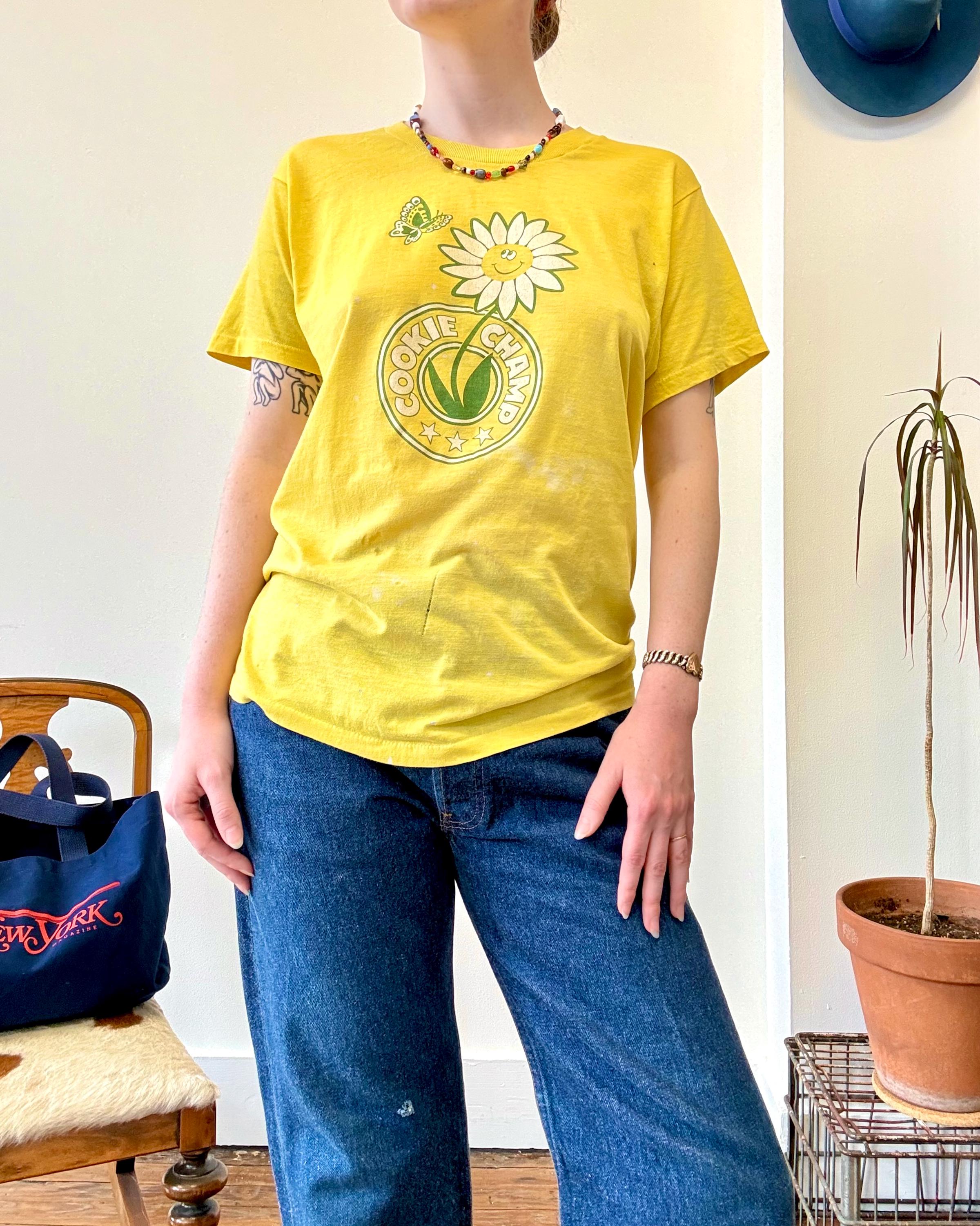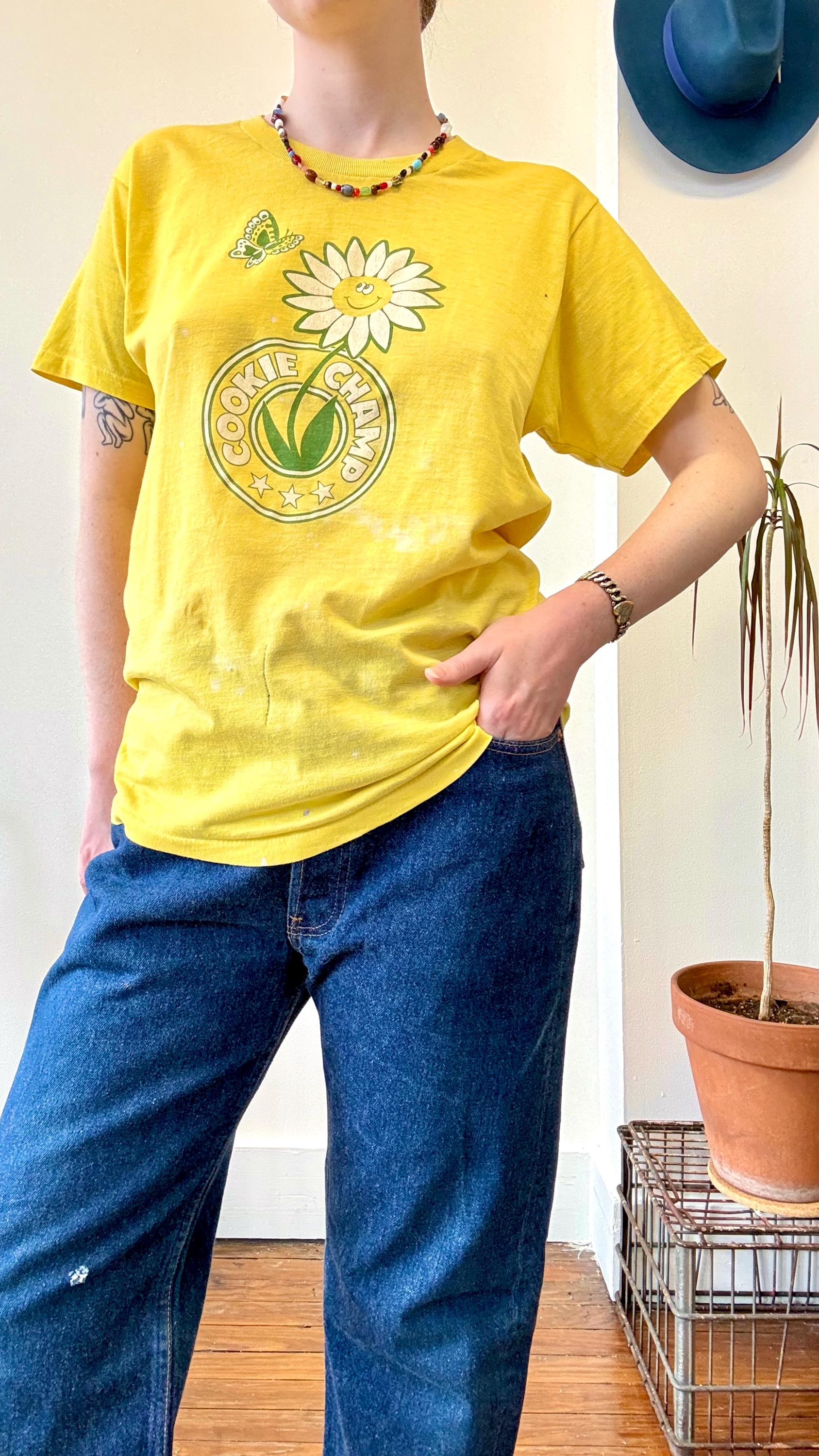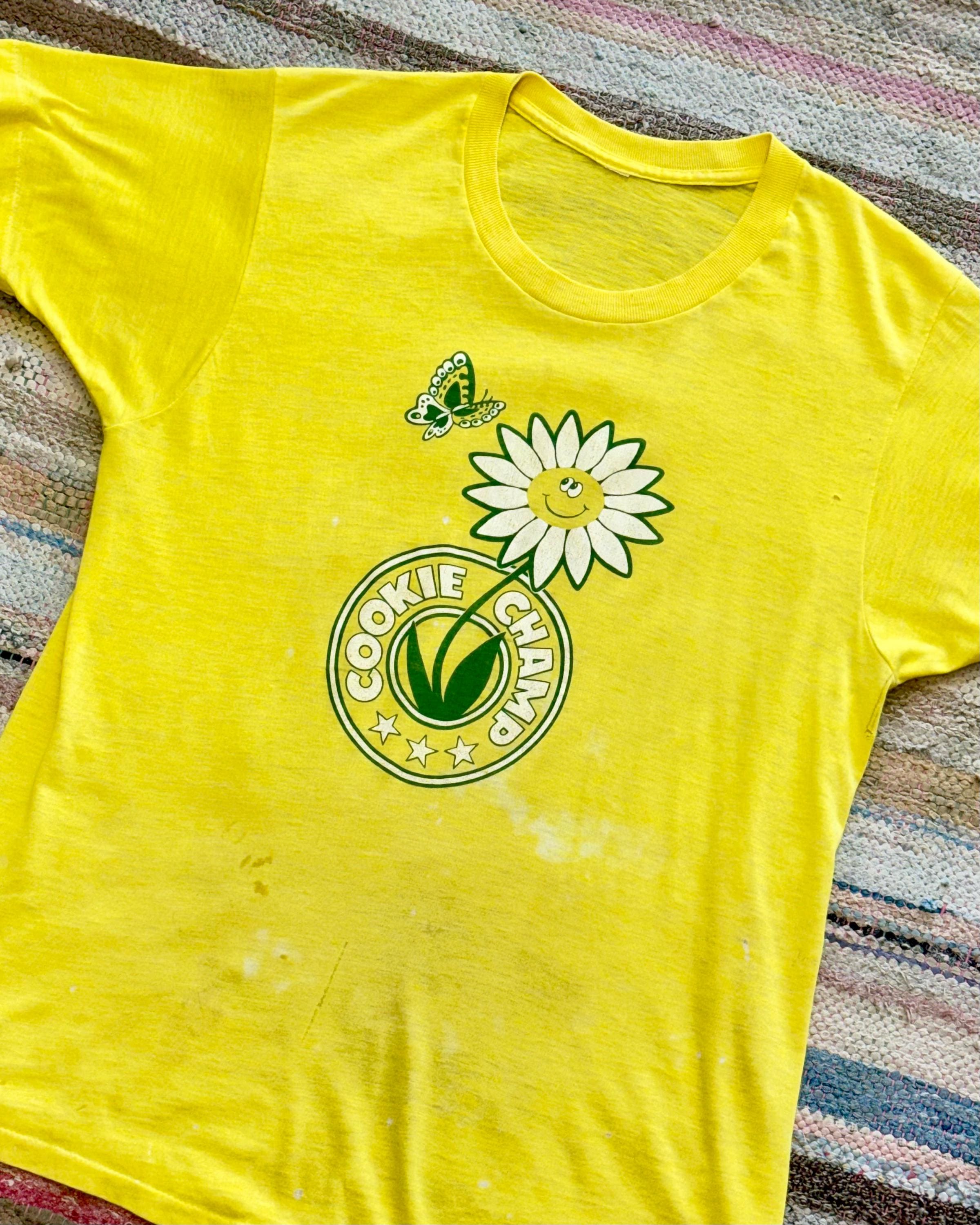 An authentic vintage t shirt featuring “Cookie Champ” Girl Scout graphic. smiley daisy and butterfly illustration. well worn, distressed paper thin tee. stretches to fit. no label.
