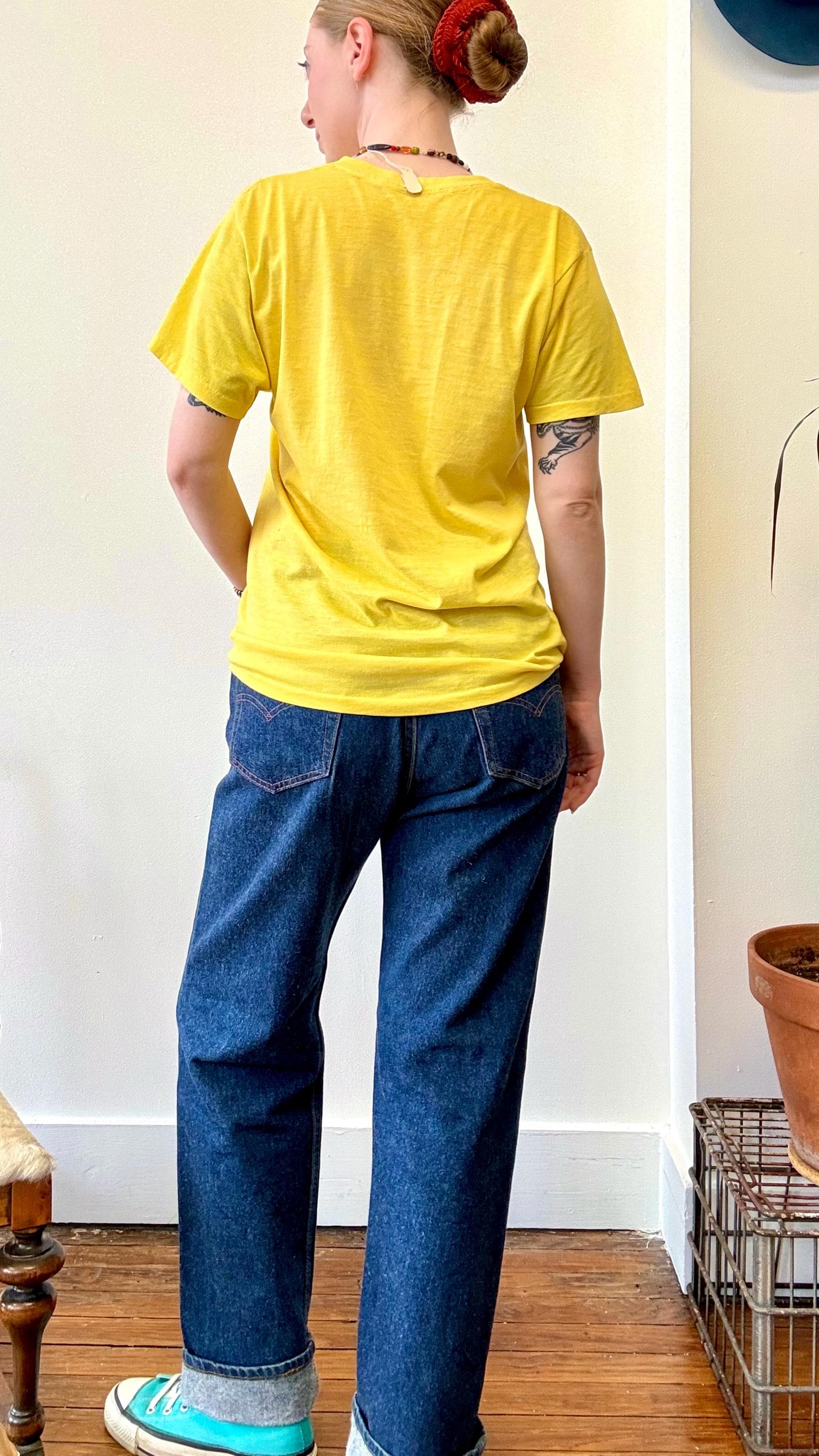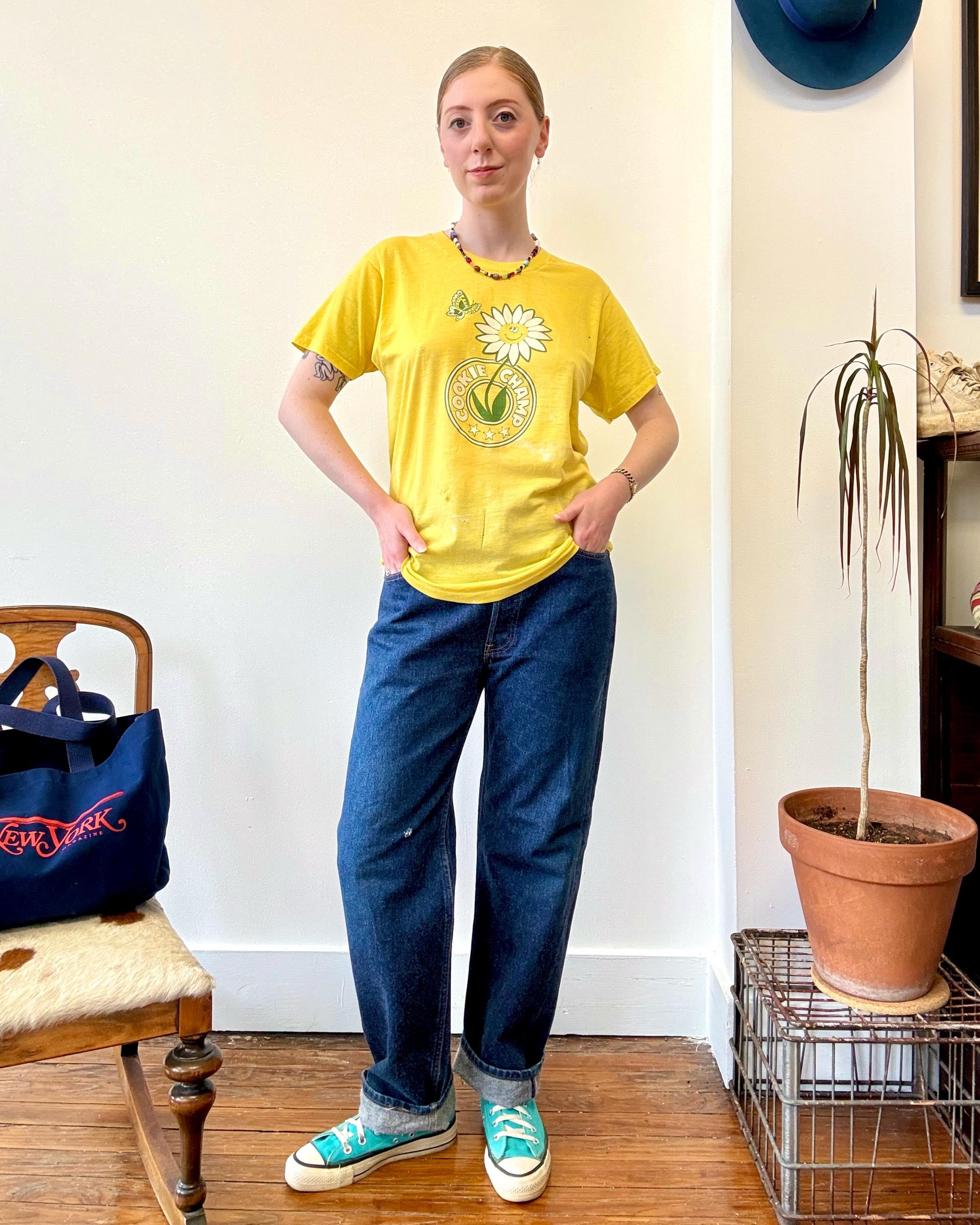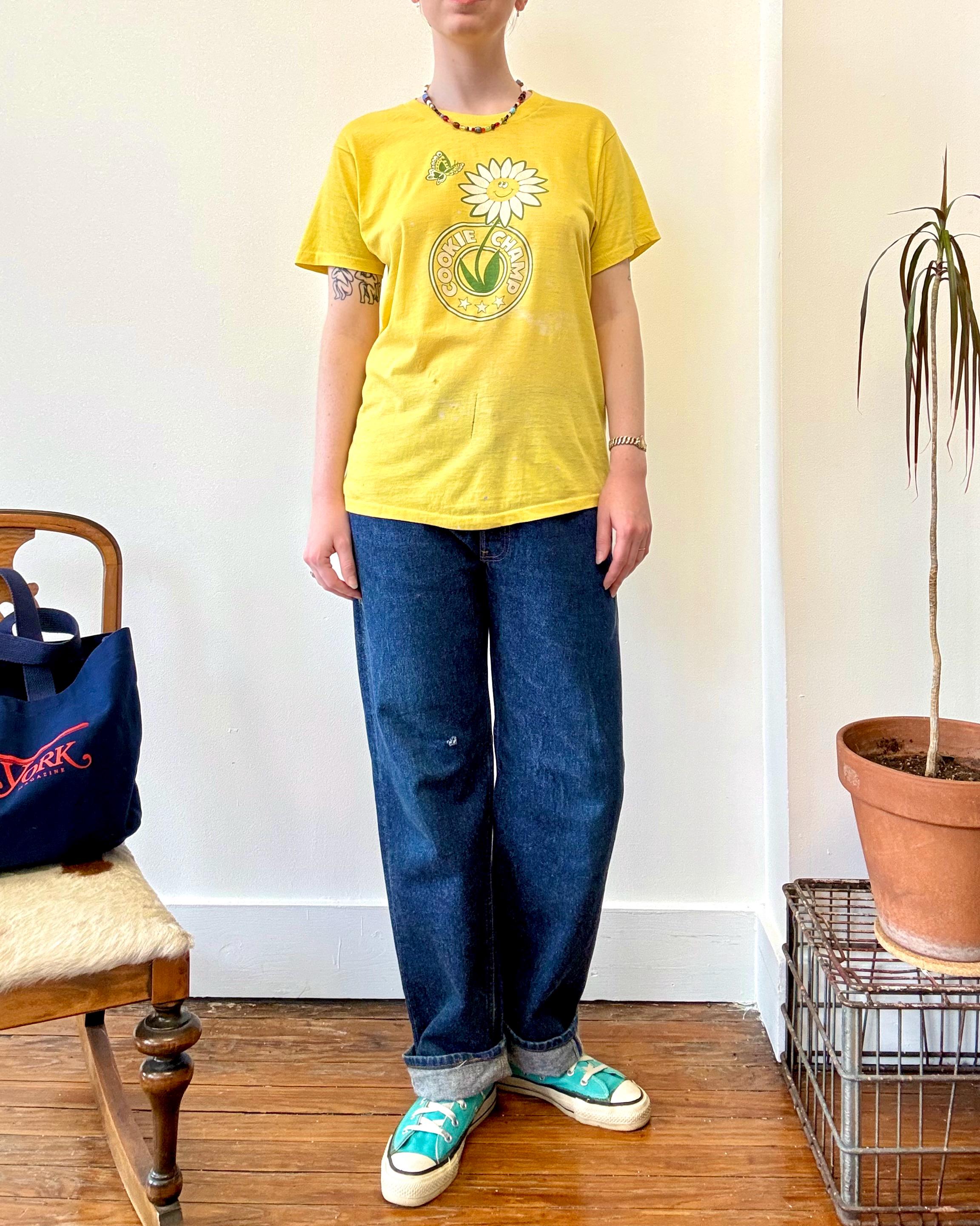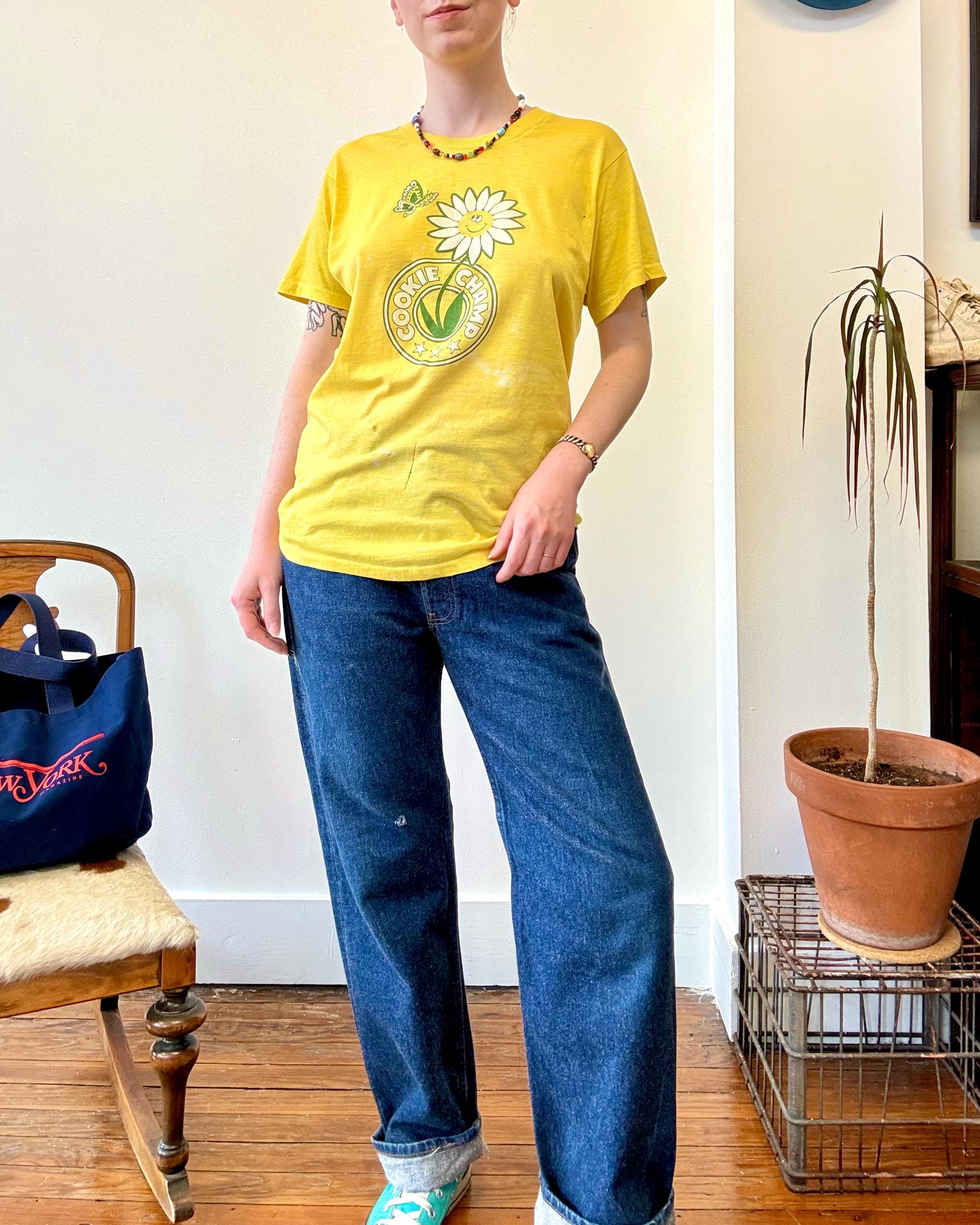 An authentic vintage t shirt featuring “Cookie Champ” Girl Scout graphic. smiley daisy and butterfly illustration. well worn, distressed paper thin tee. stretches to fit. no label.