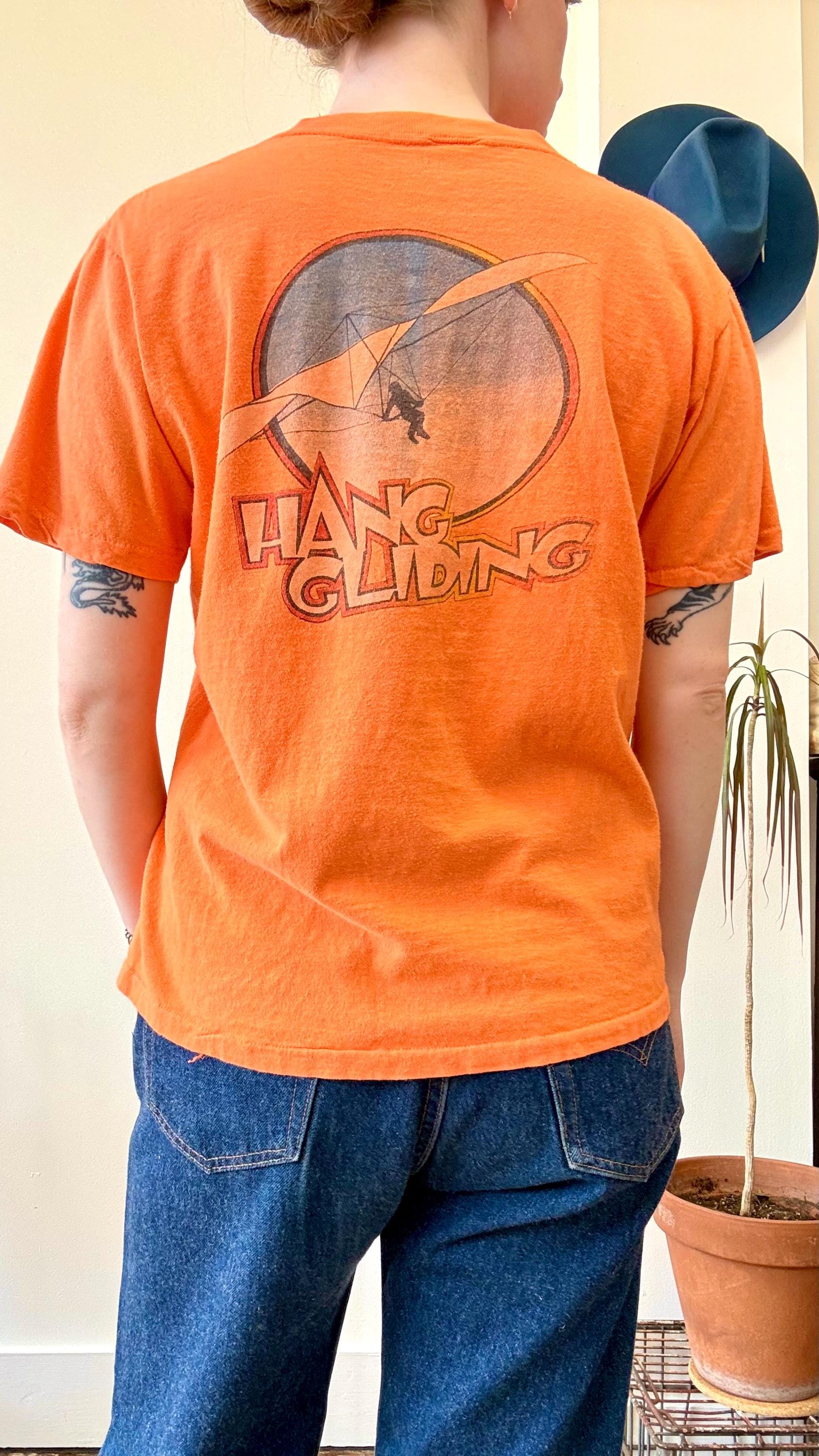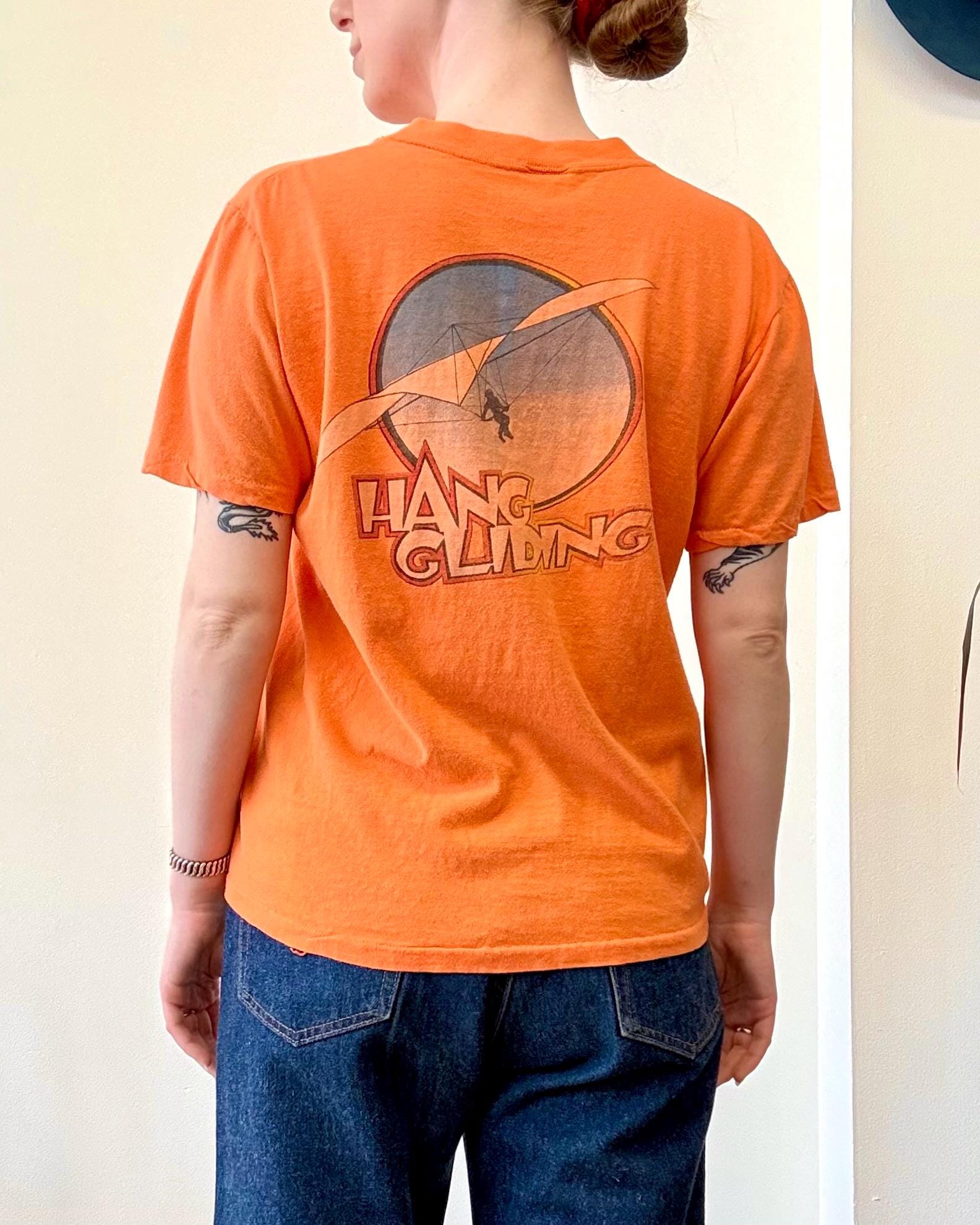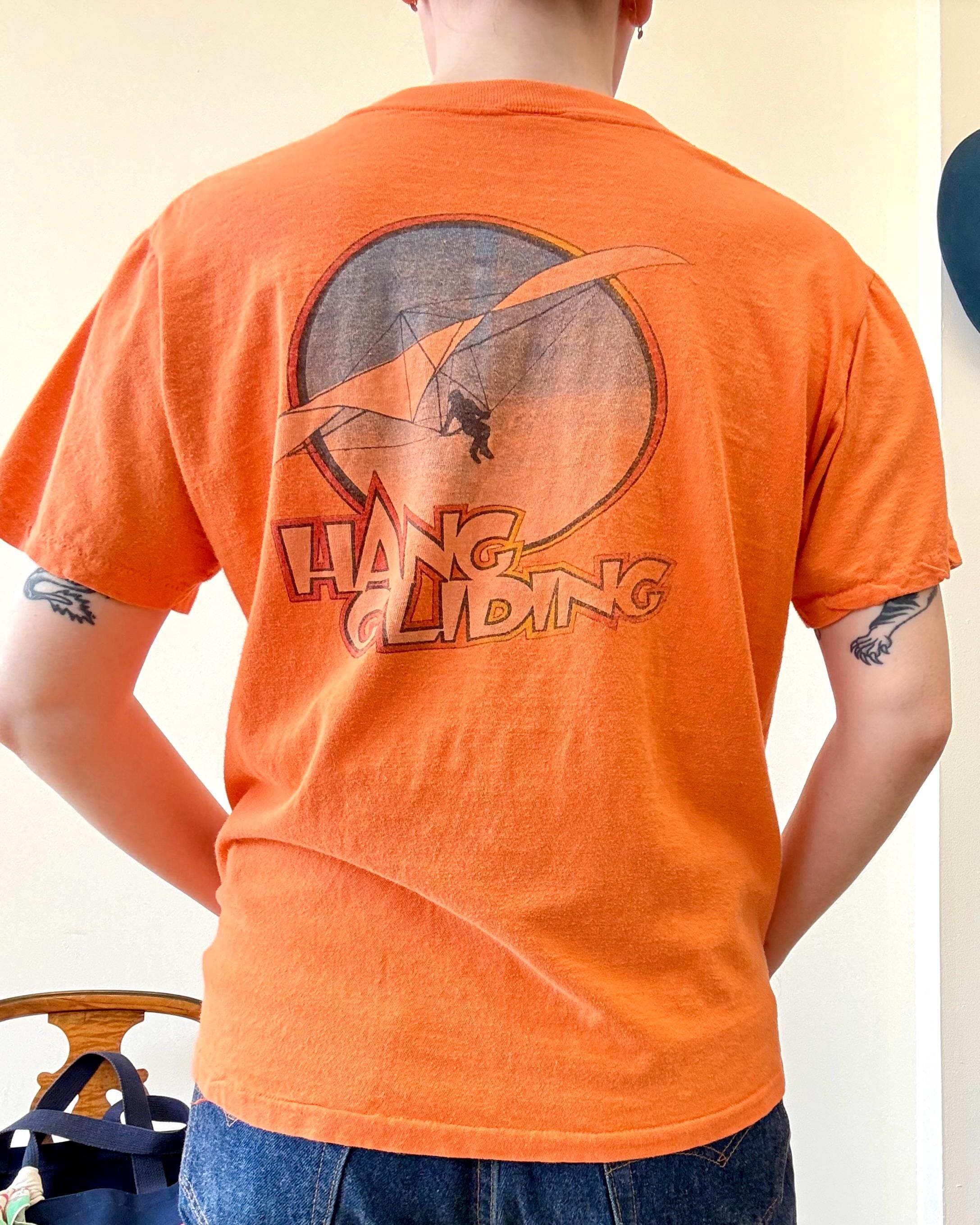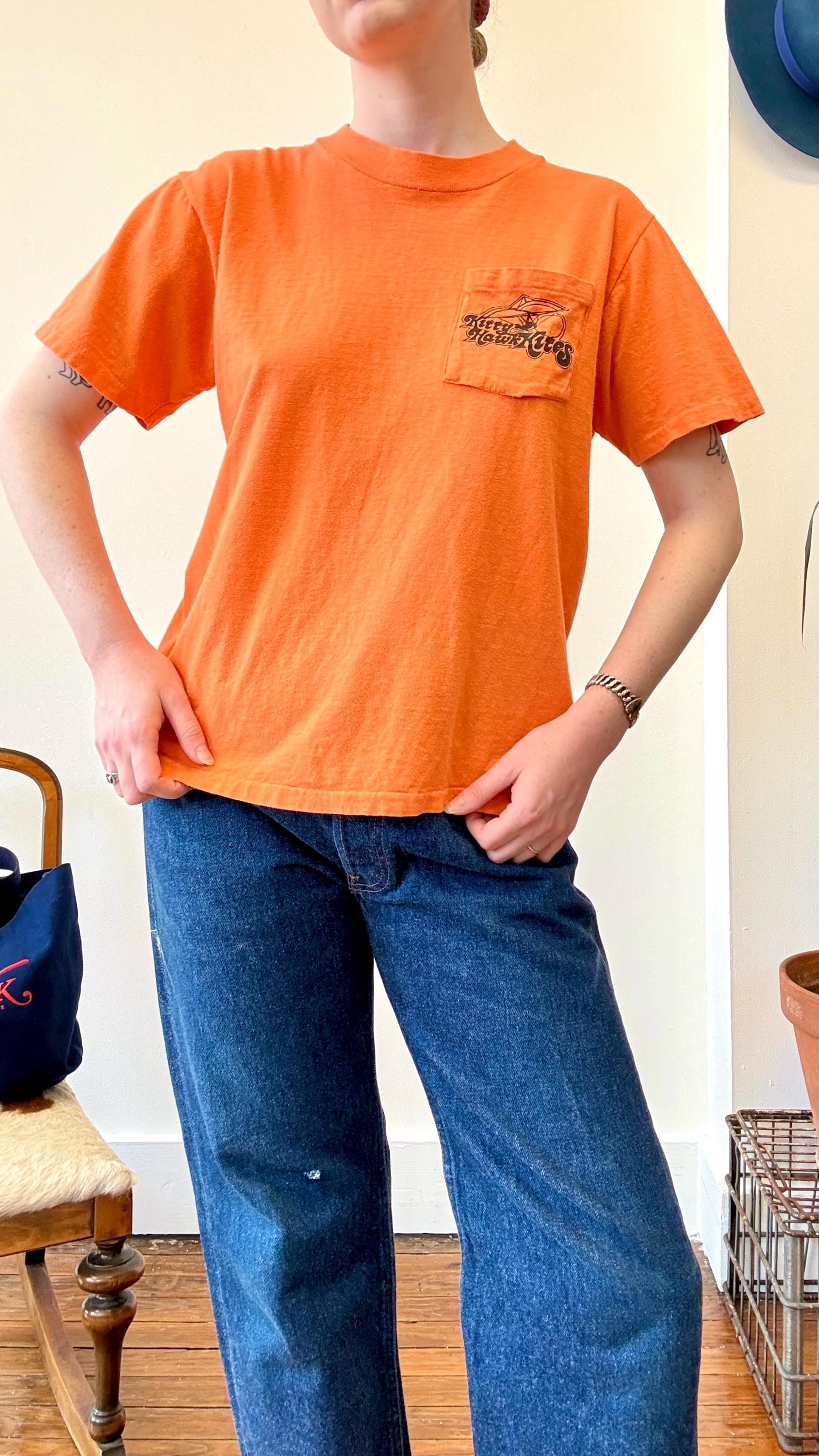 An authentic vintage t shirt featuring a Kitty Hawk Hang Gliding graphic on back and front chest pocket. a soft and gently worn tee pocket tee. stretches to fit. Stedman label. made in USA