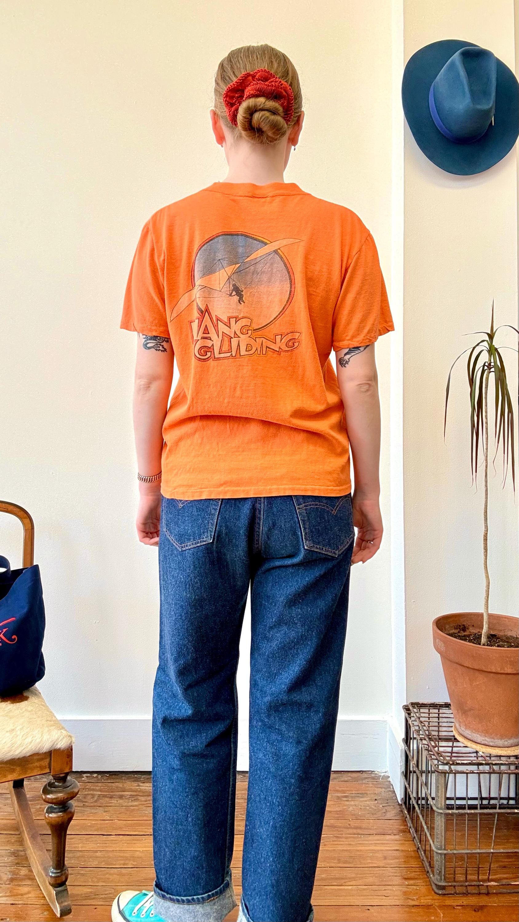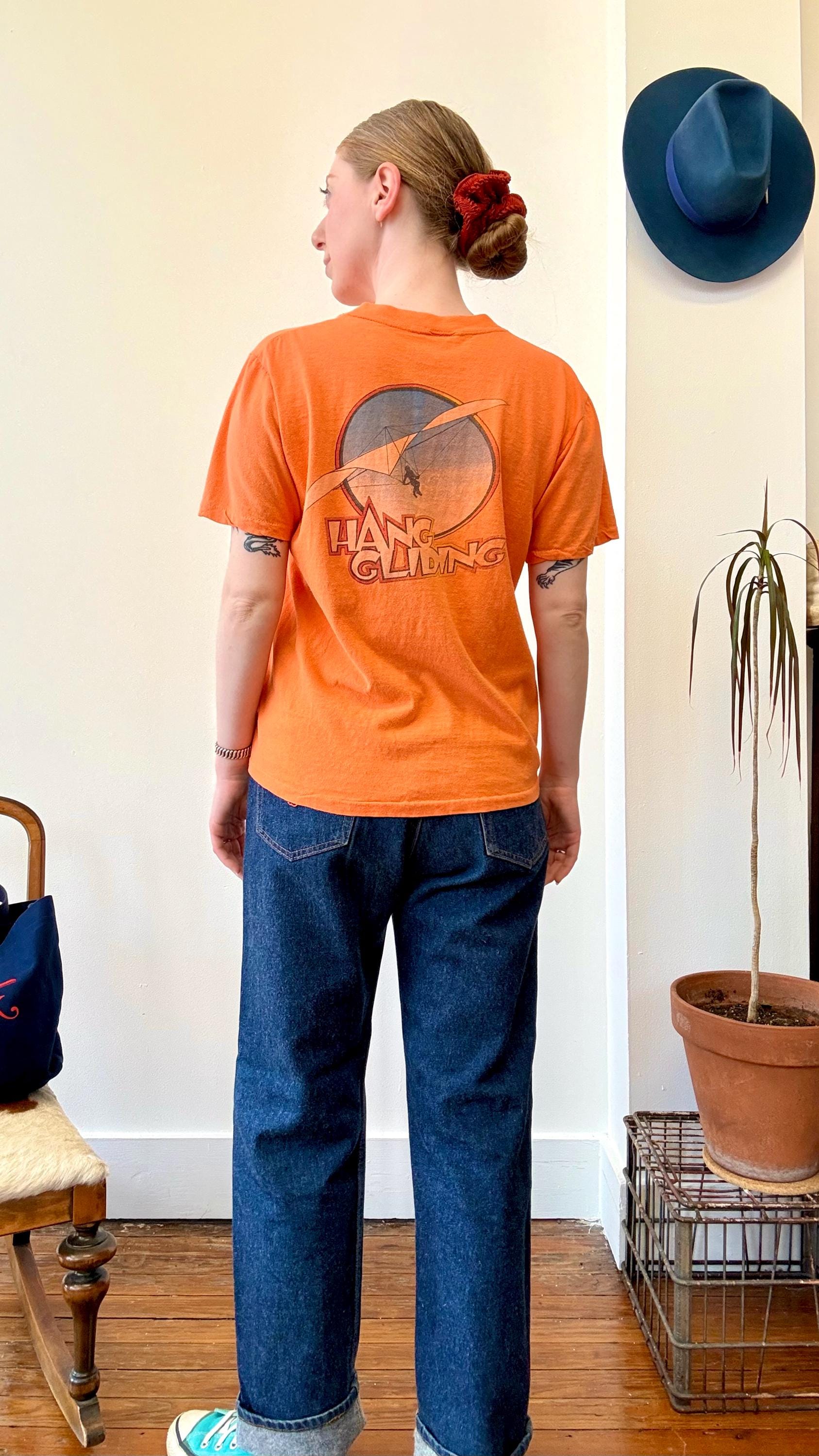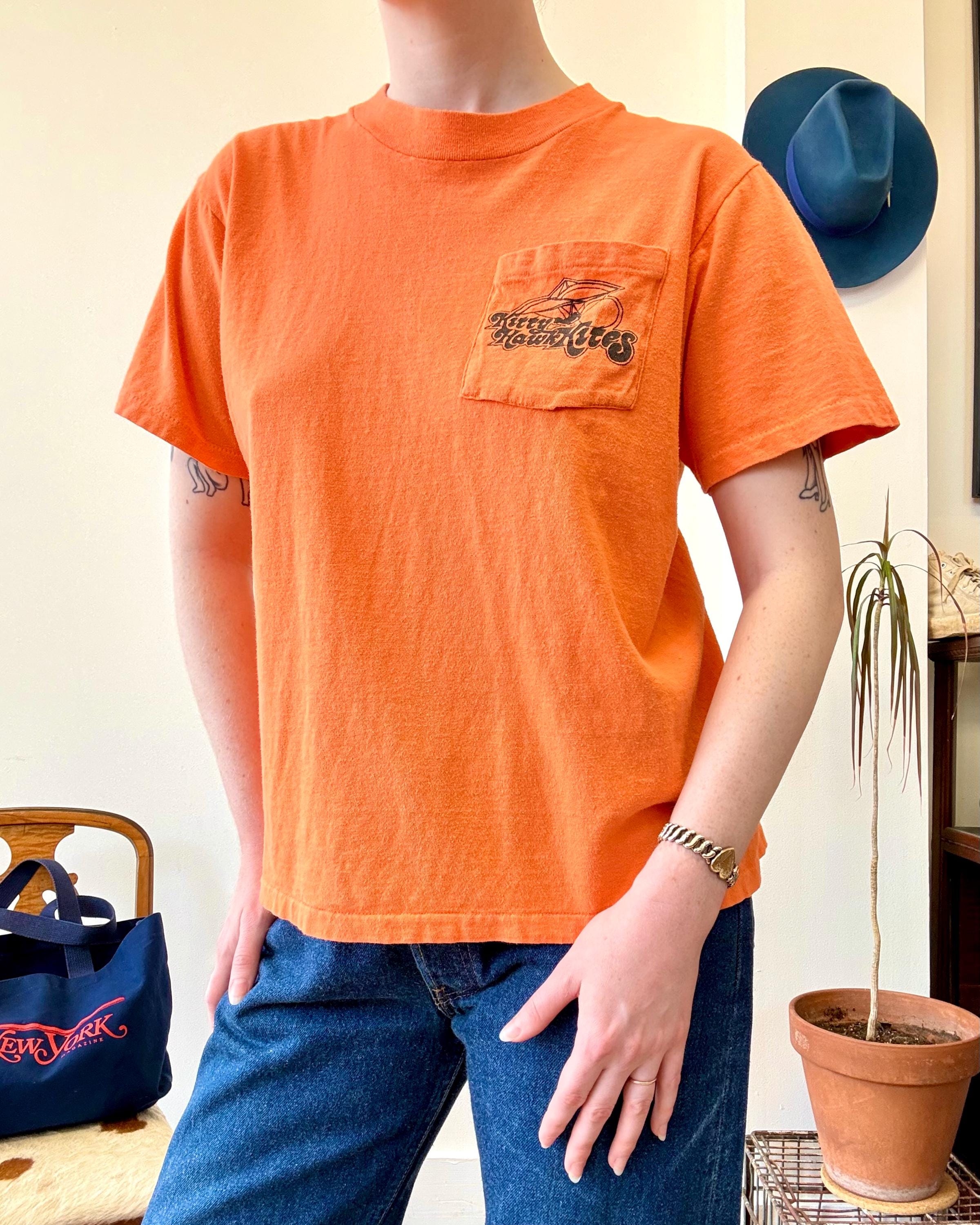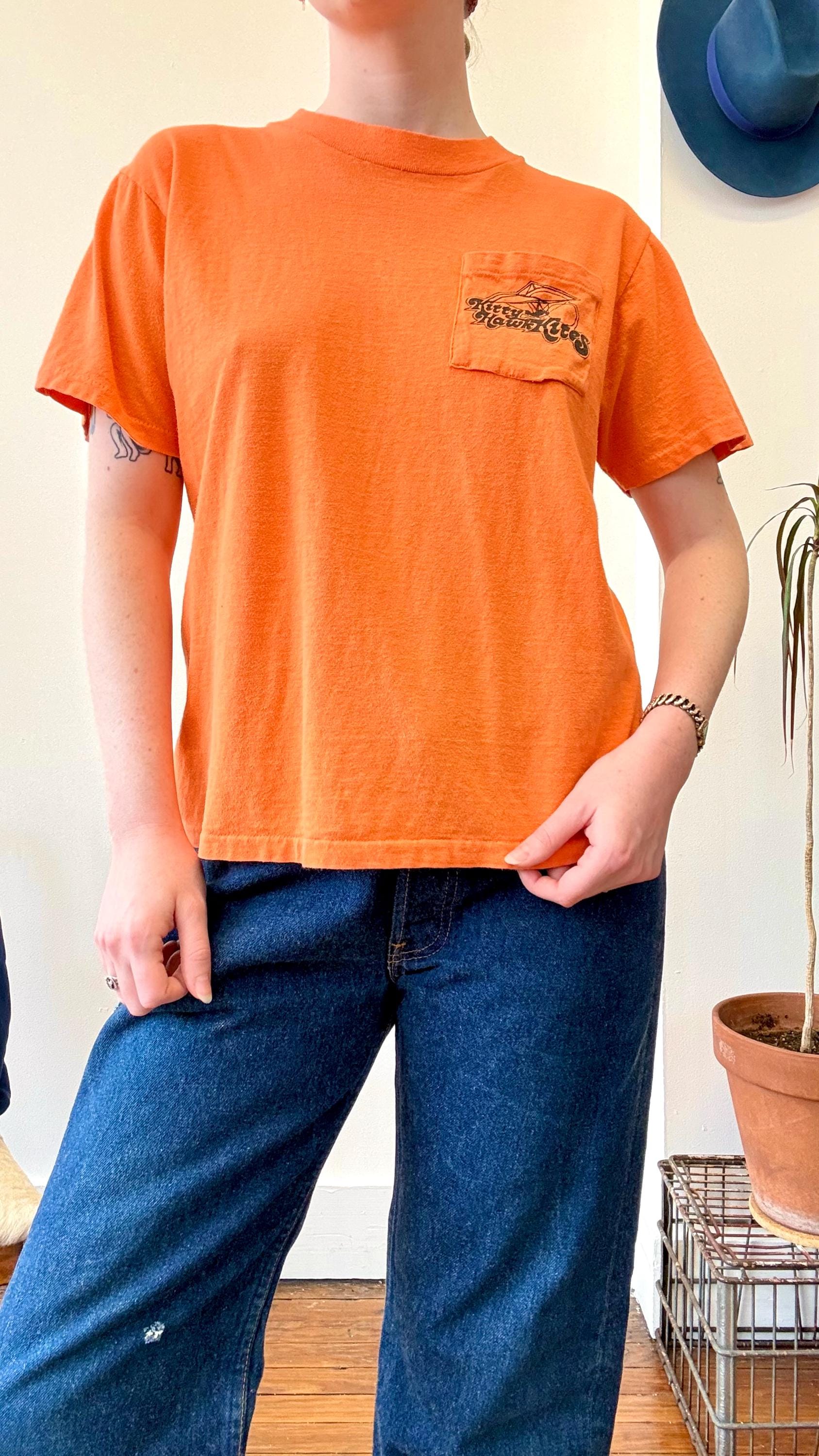 An authentic vintage t shirt featuring a Kitty Hawk Hang Gliding graphic on back and front chest pocket. a soft and gently worn tee pocket tee. stretches to fit. Stedman label. made in USA