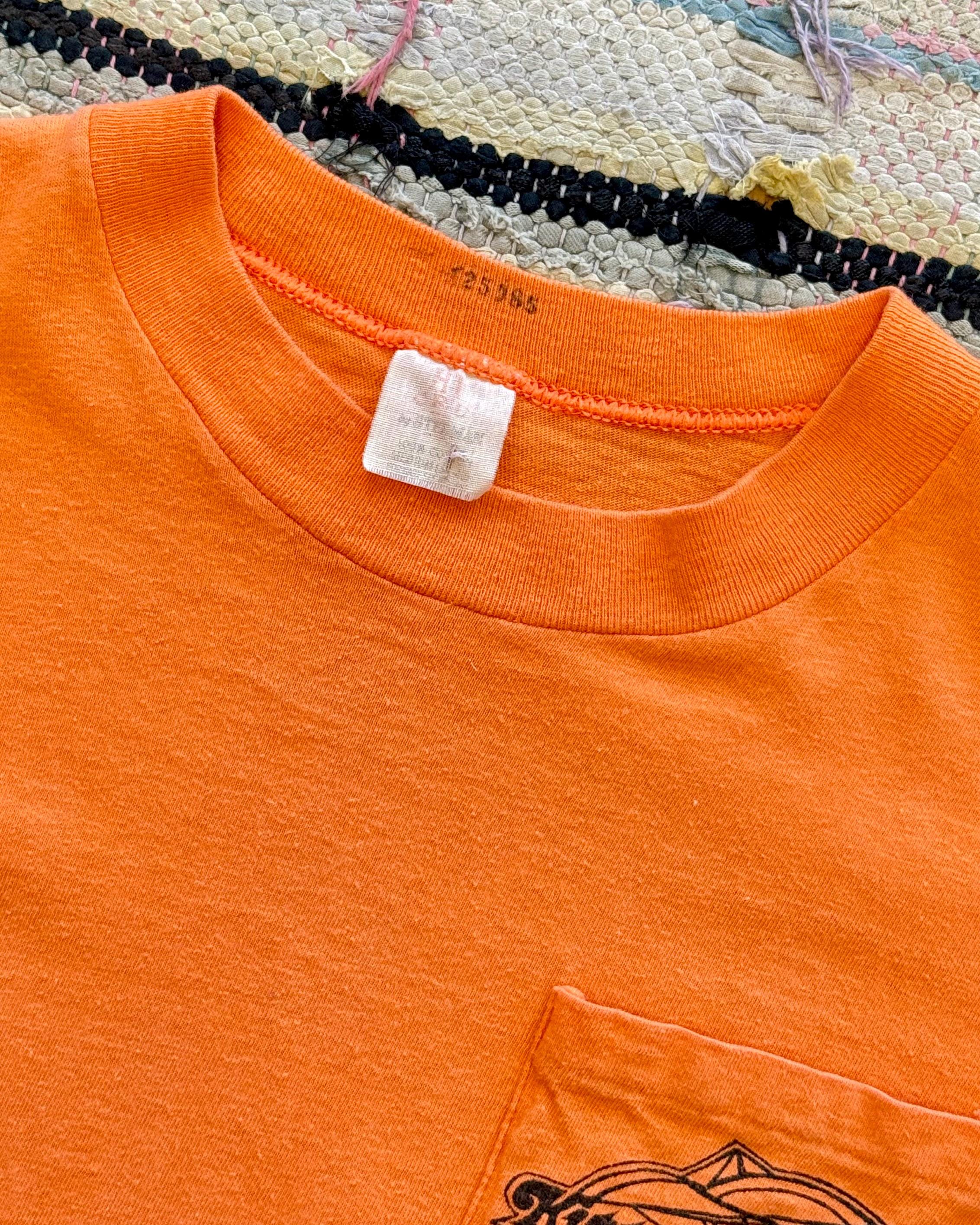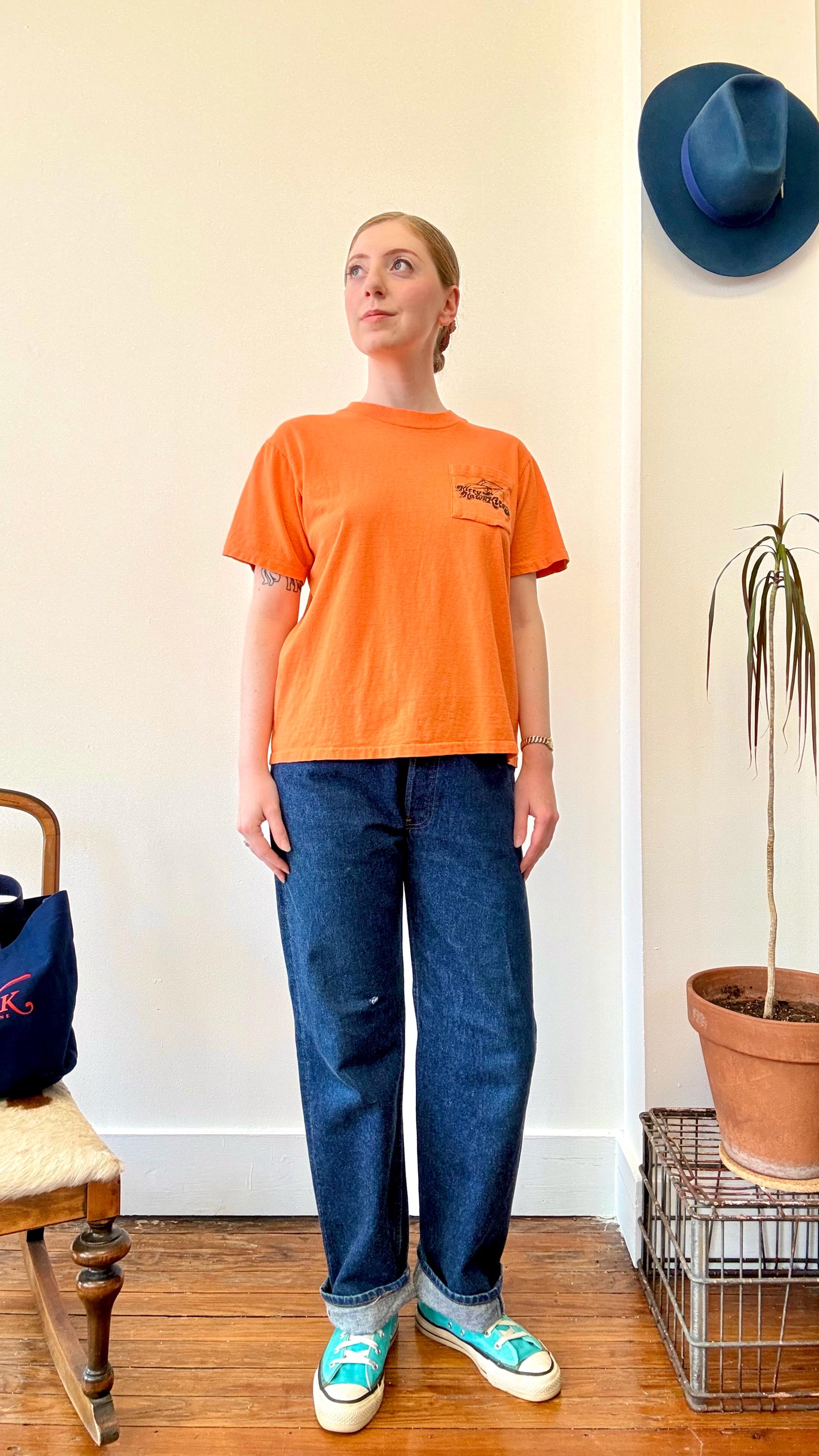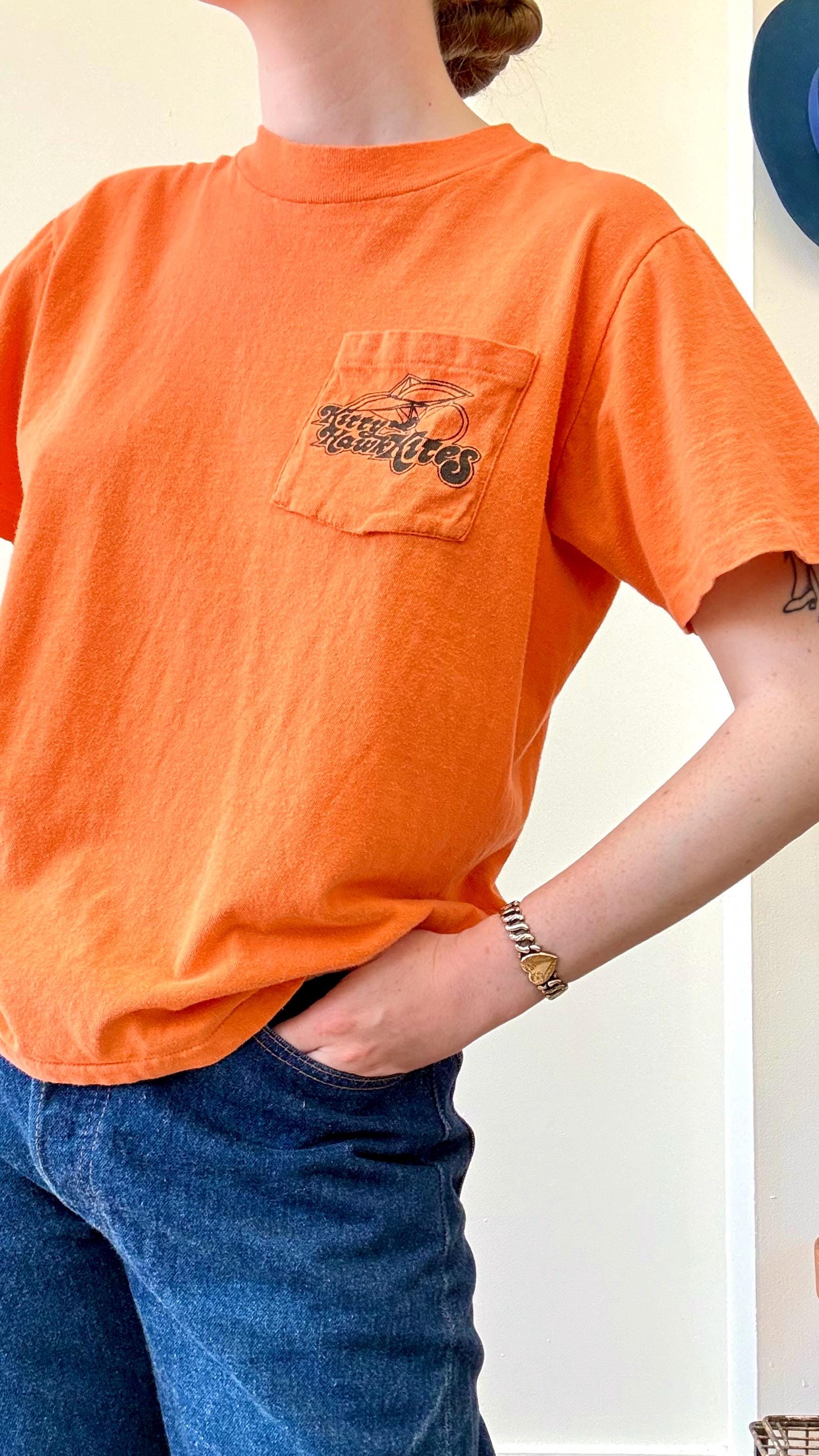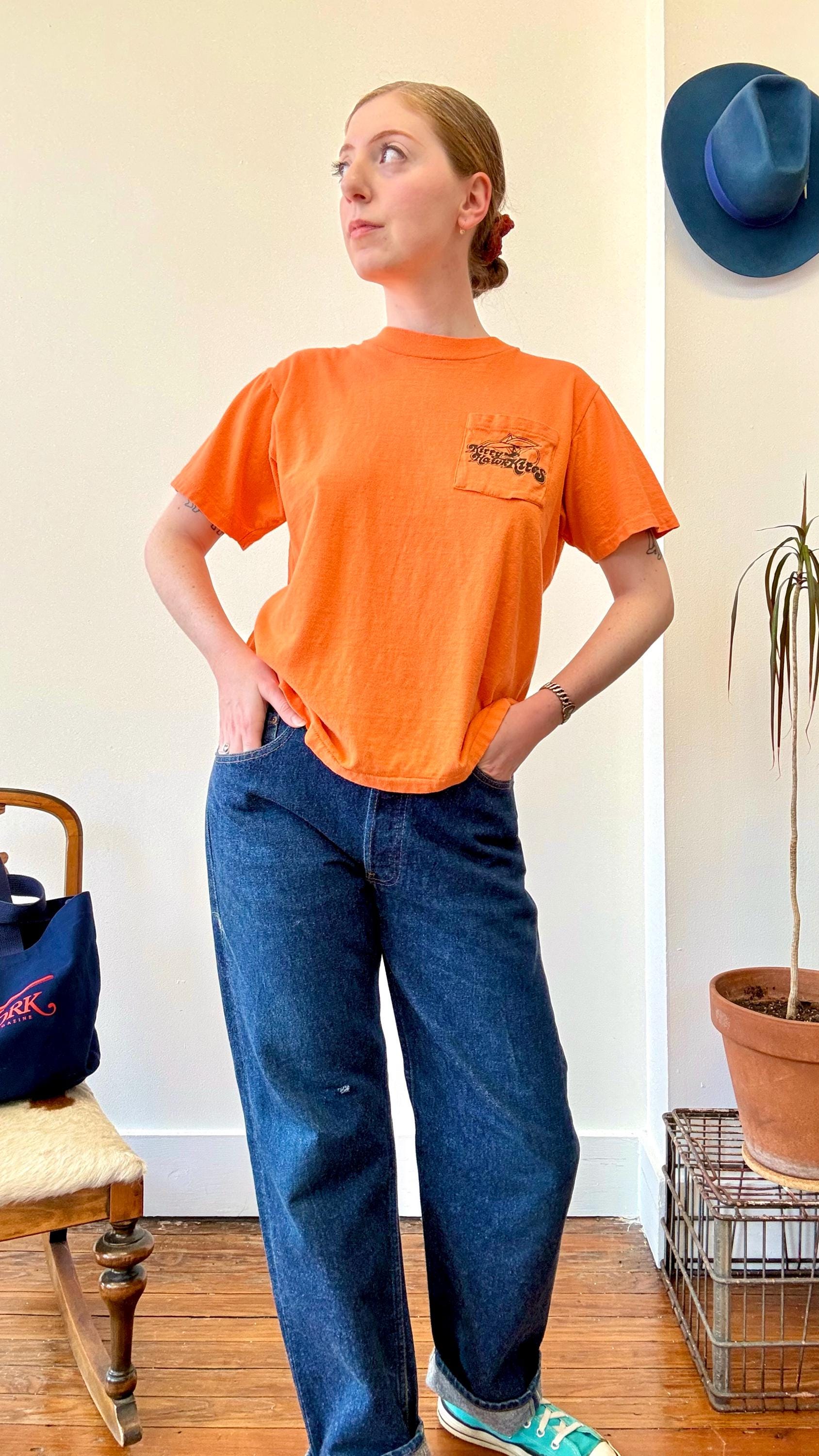 An authentic vintage t shirt featuring a Kitty Hawk Hang Gliding graphic on back and front chest pocket. a soft and gently worn tee pocket tee. stretches to fit. Stedman label. made in USA