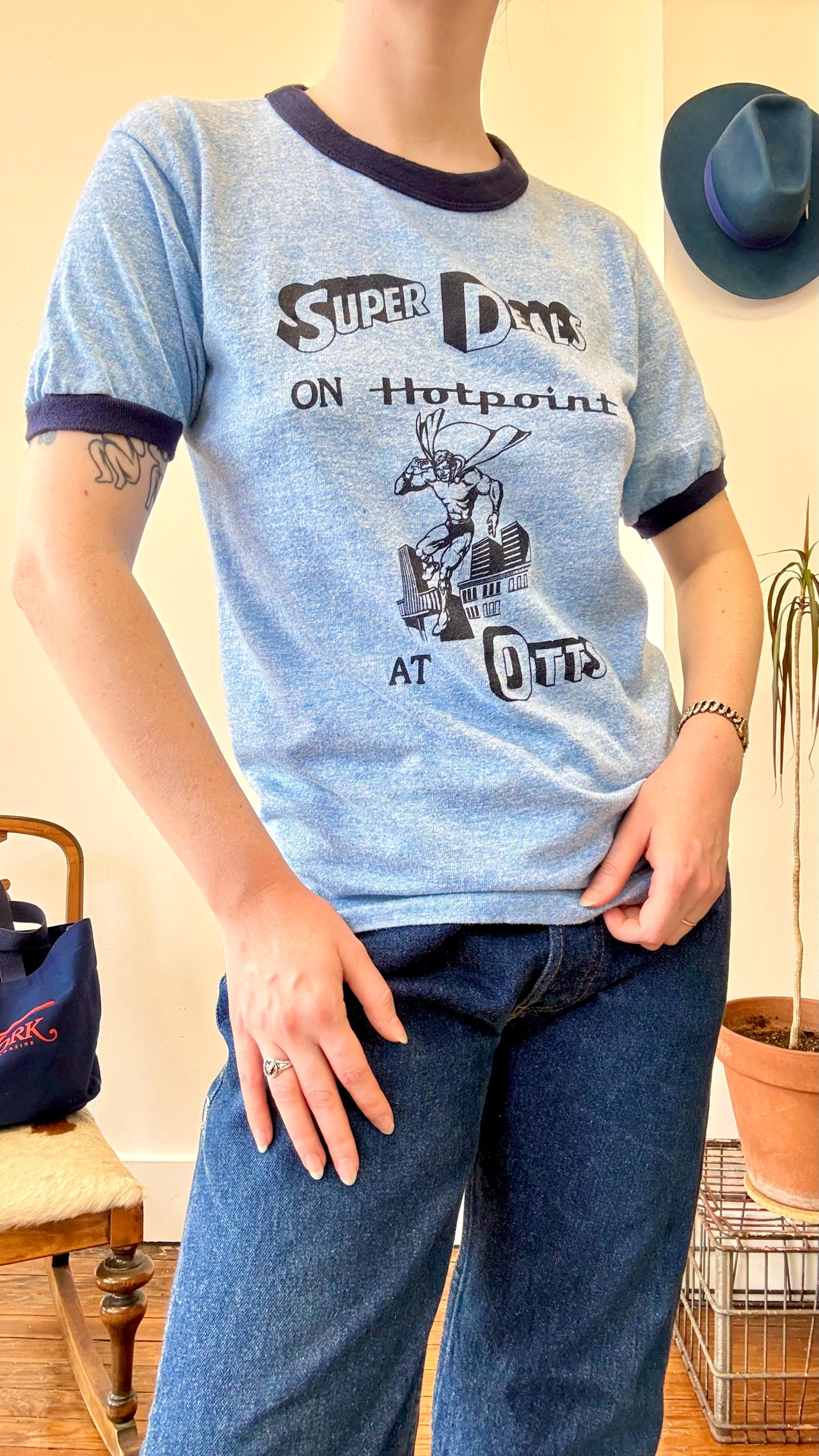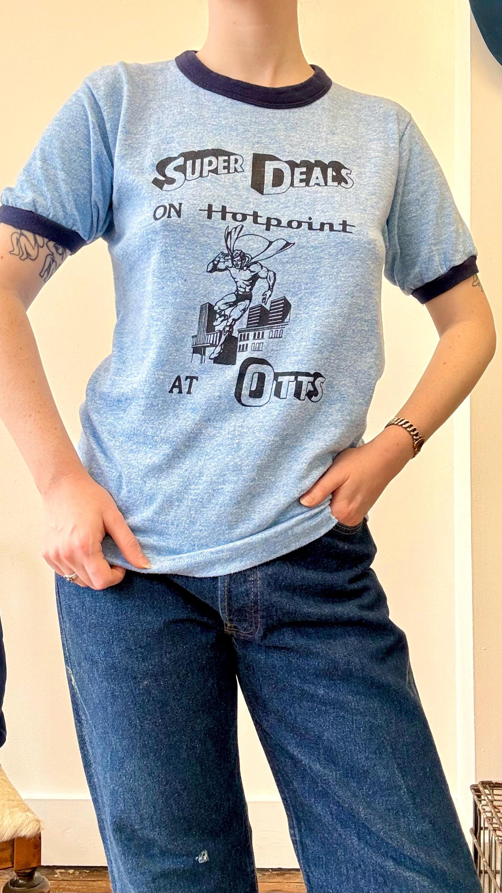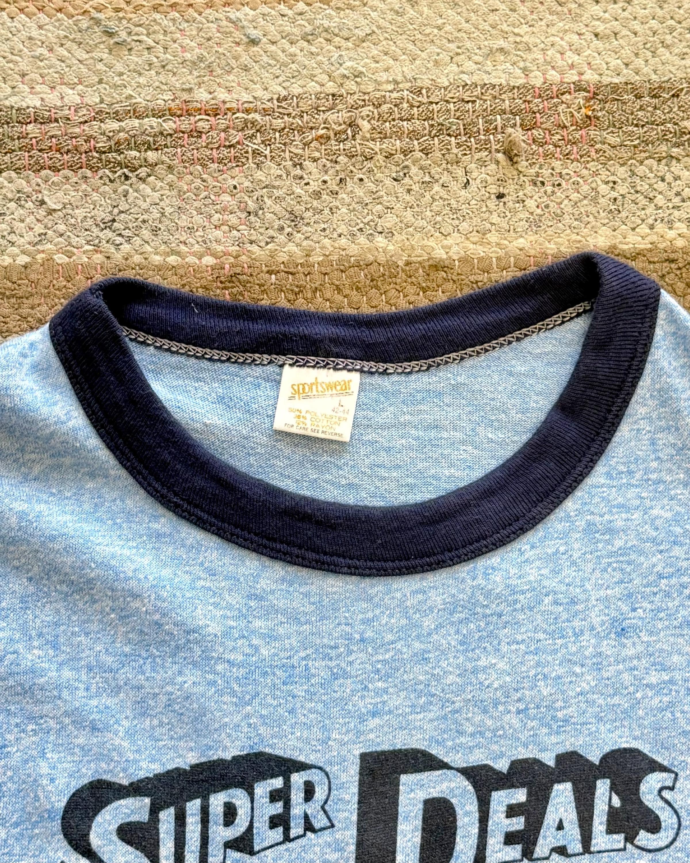An authentic vintage t shirt featuring a superman themed advertisement. ringer style with tri blend fabric. a soft and gently worn tee. stretches to fit. sportswear label. made in USA