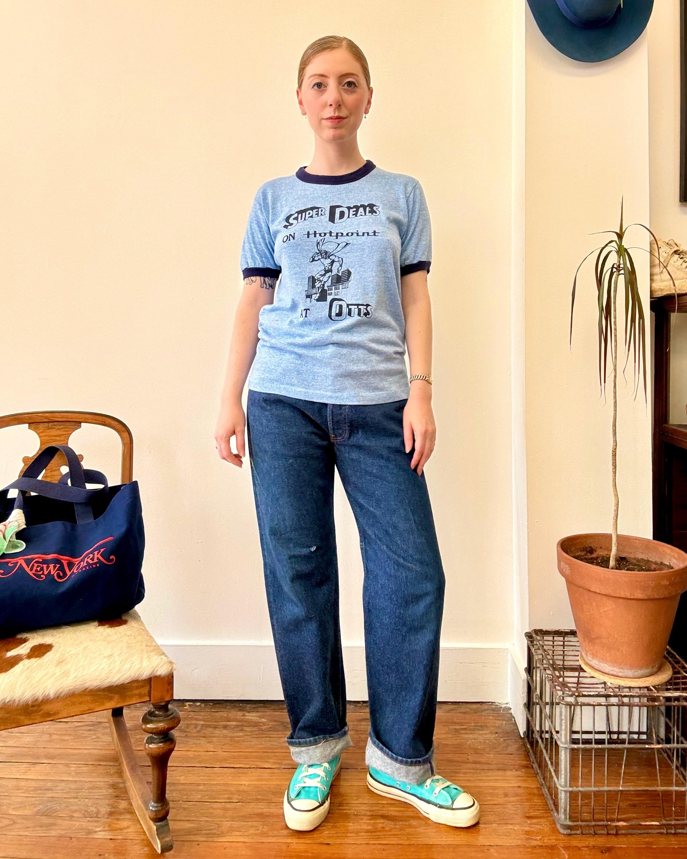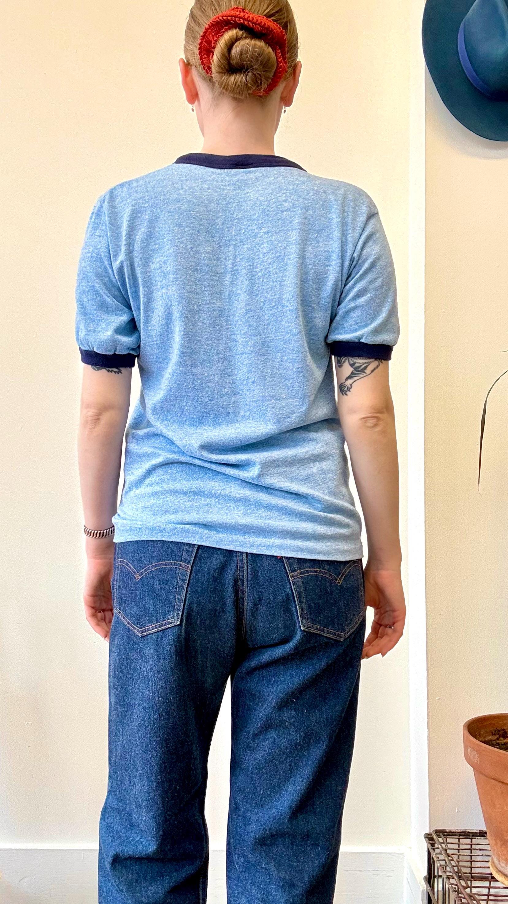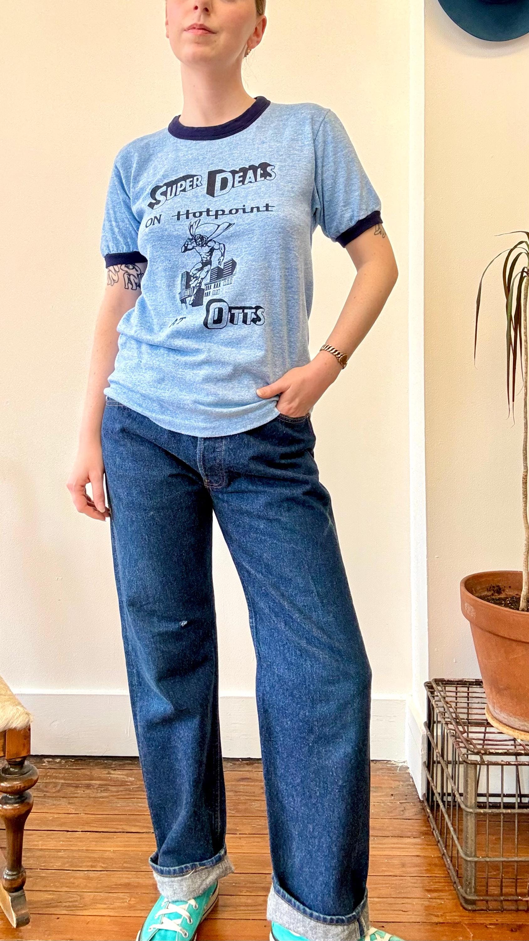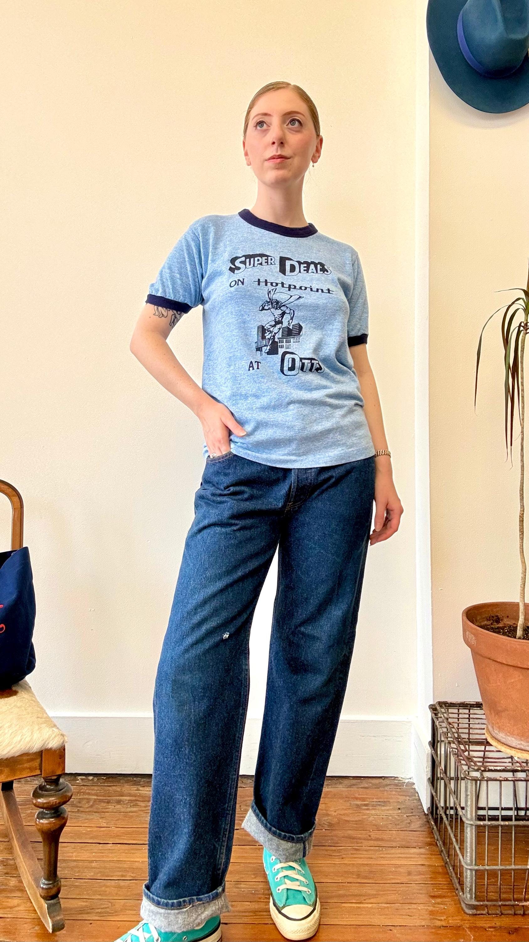 An authentic vintage t shirt featuring a superman themed advertisement. ringer style with tri blend fabric. a soft and gently worn tee. stretches to fit. sportswear label. made in USA