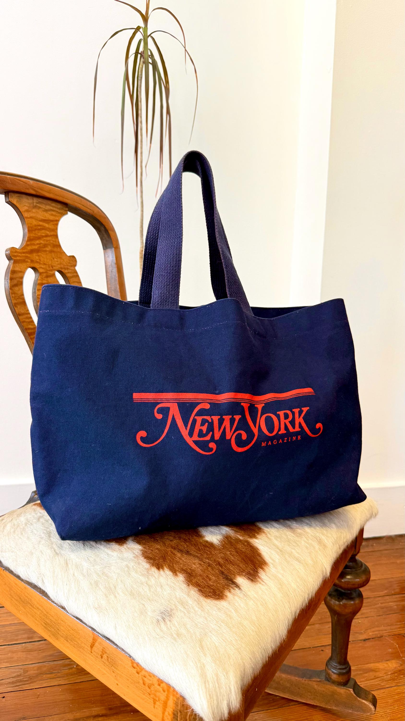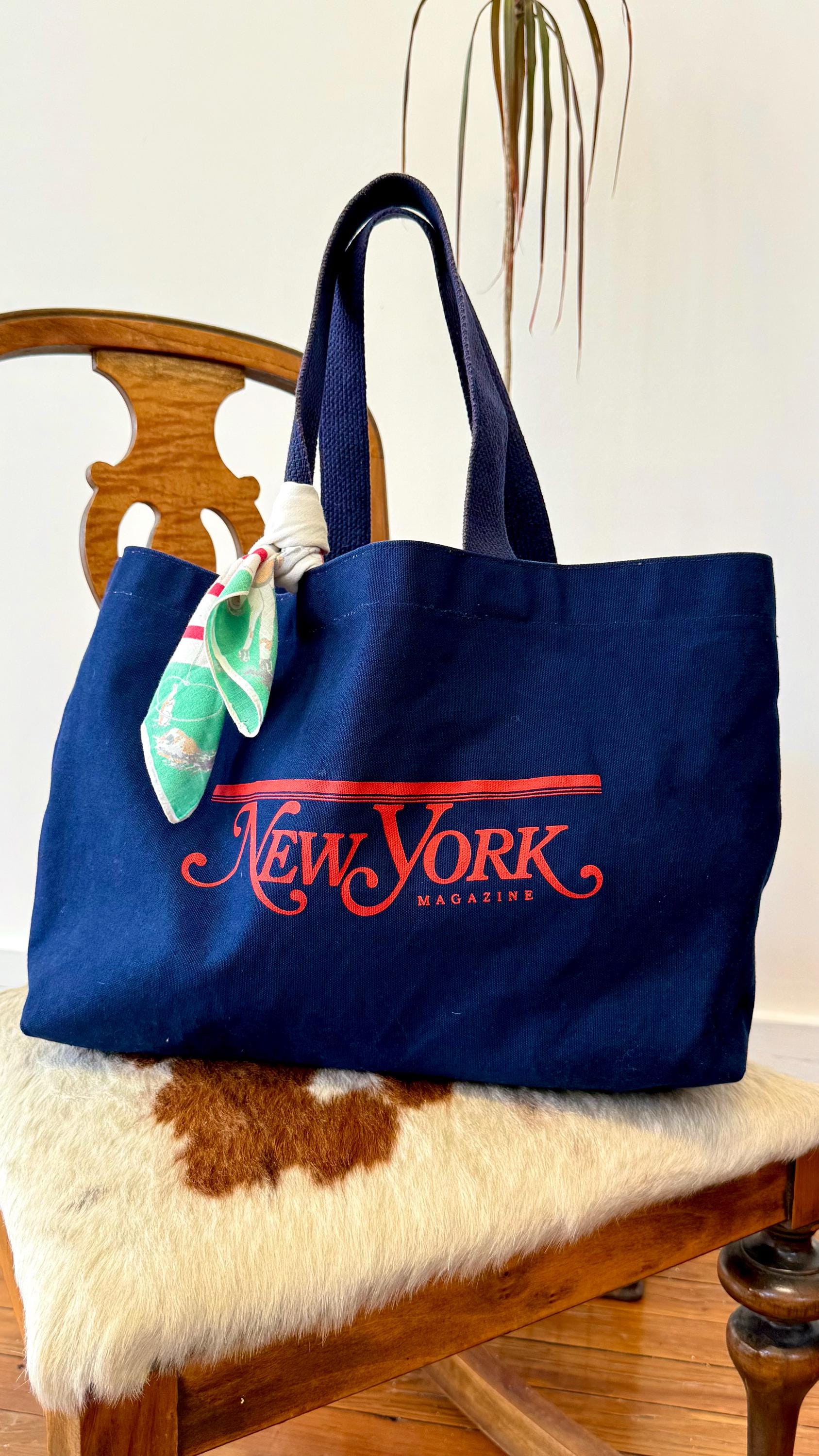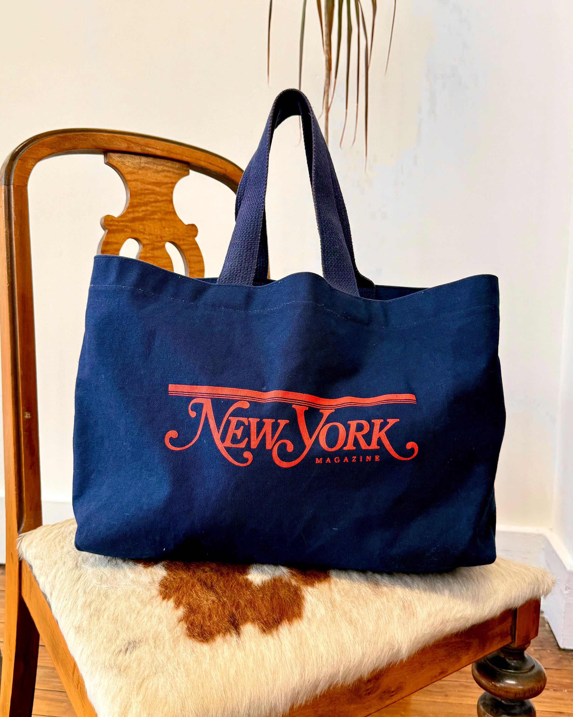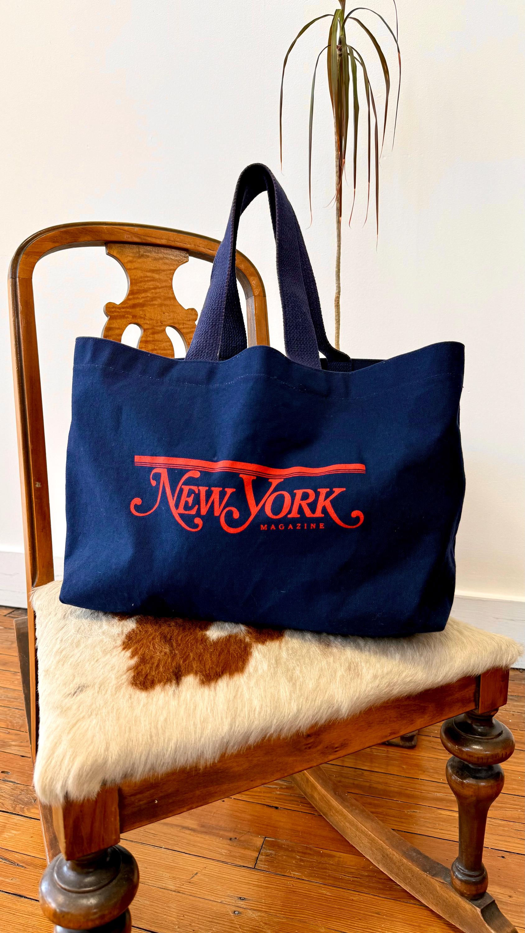 An authentic vintage tote bag for New York magazine. a large rectangular style with a flat base. crafted from durable canvas and webbed shoulder straps. unlined. no interior labels. well worn and broken in.