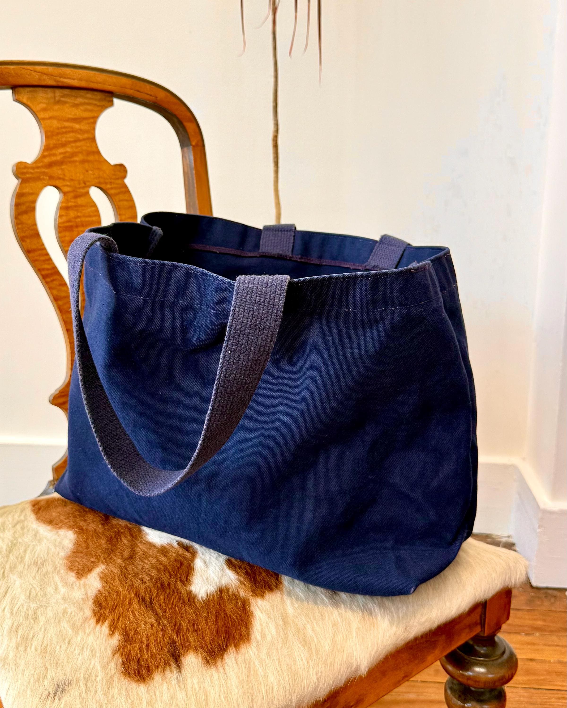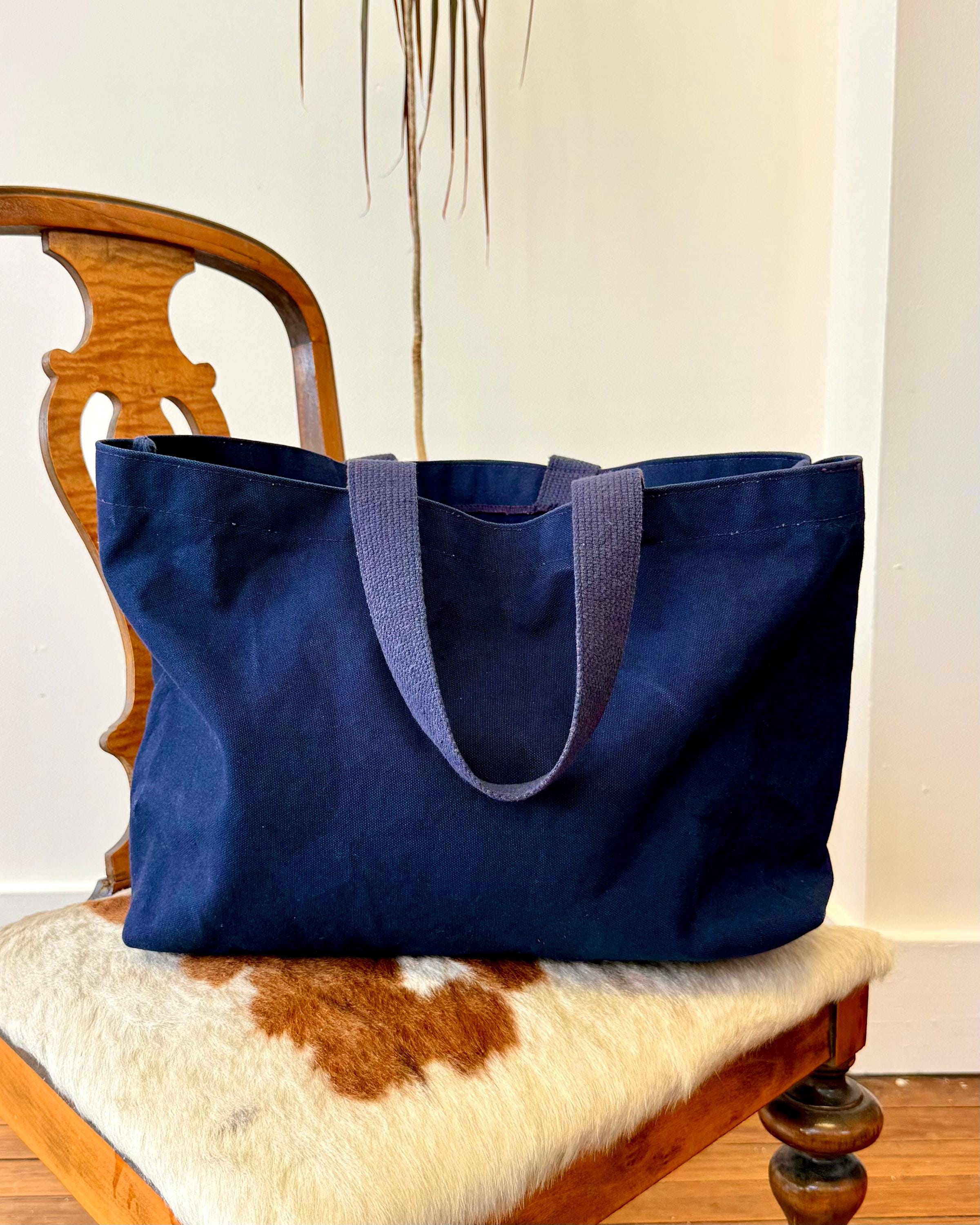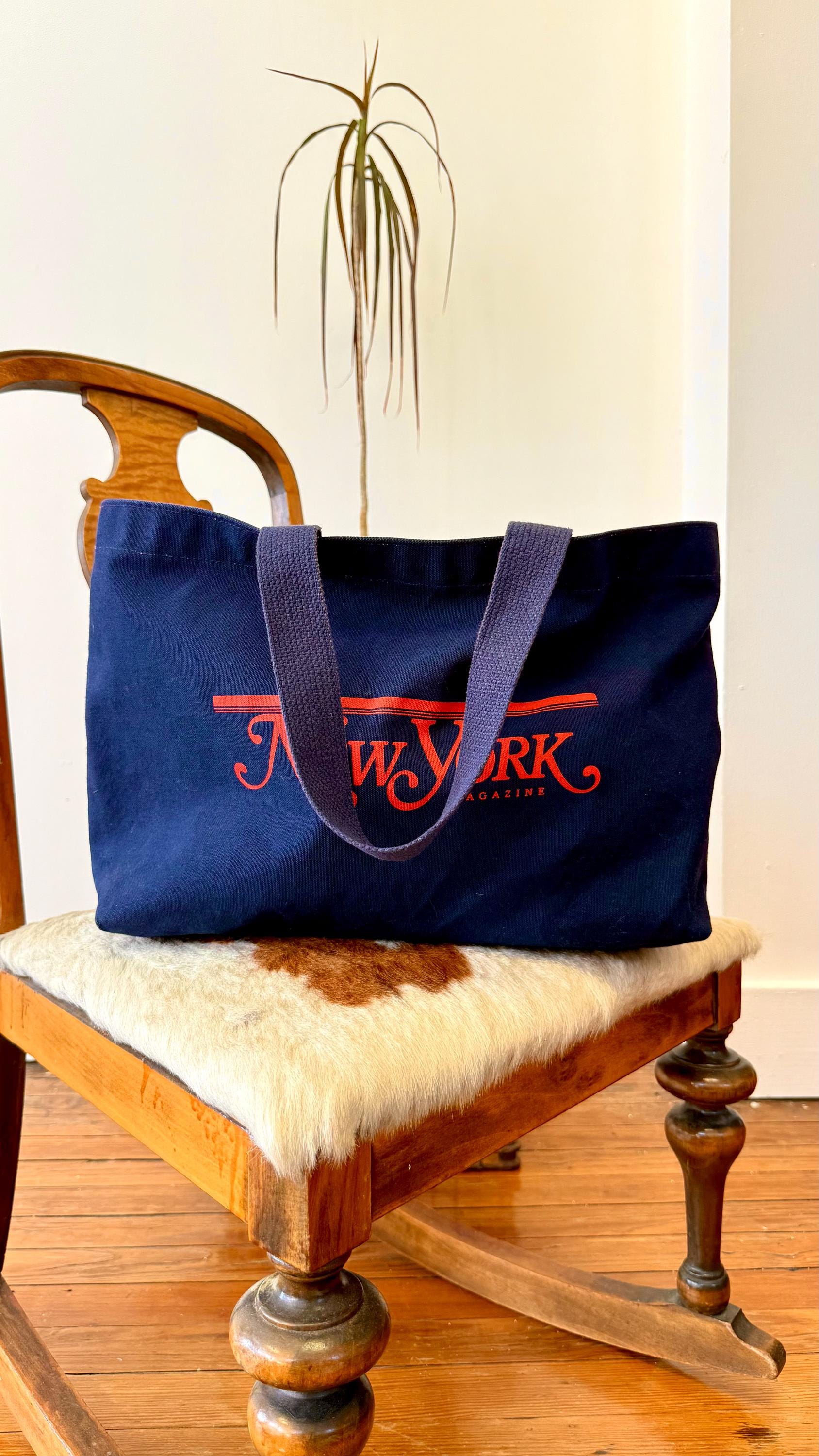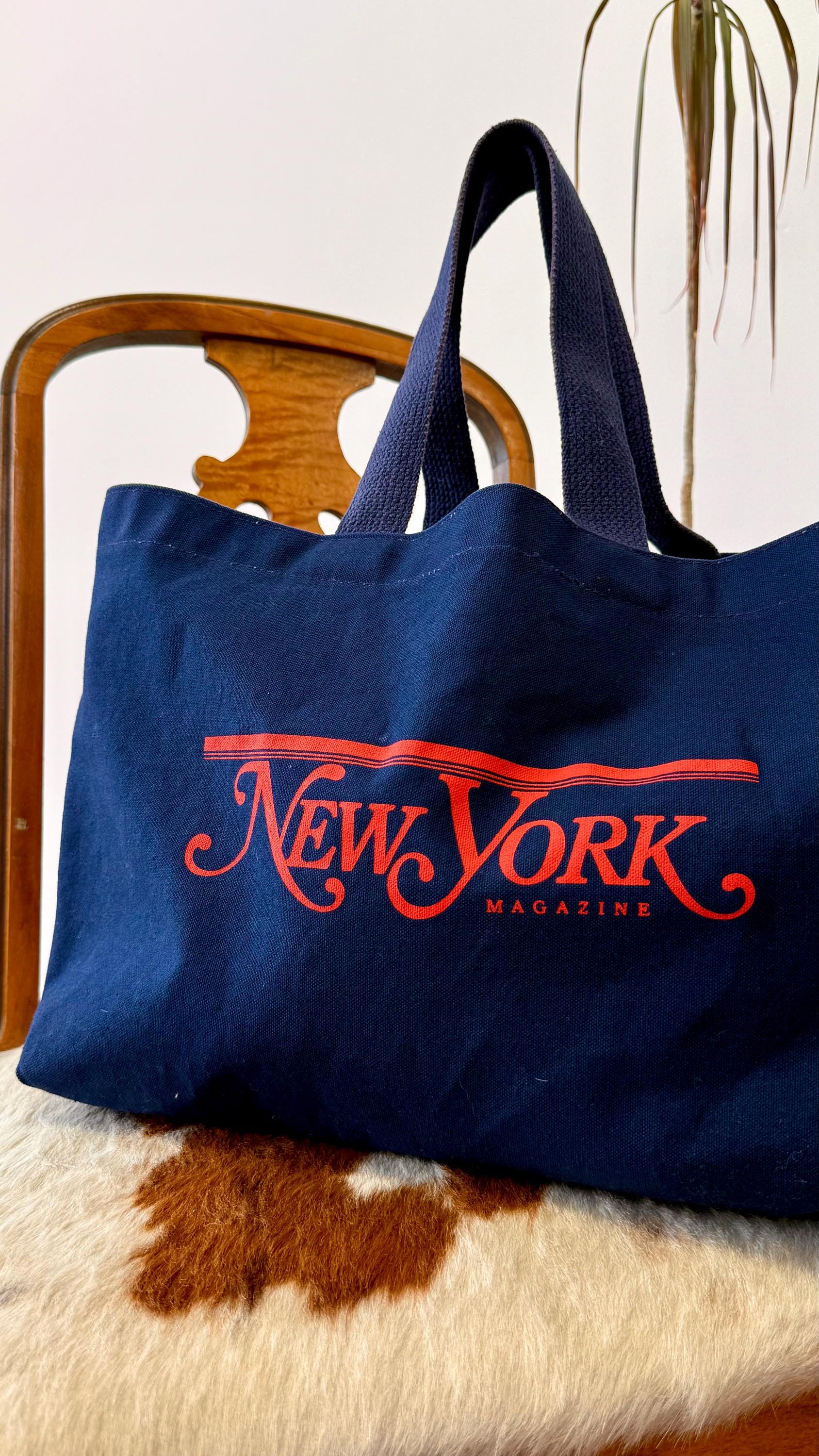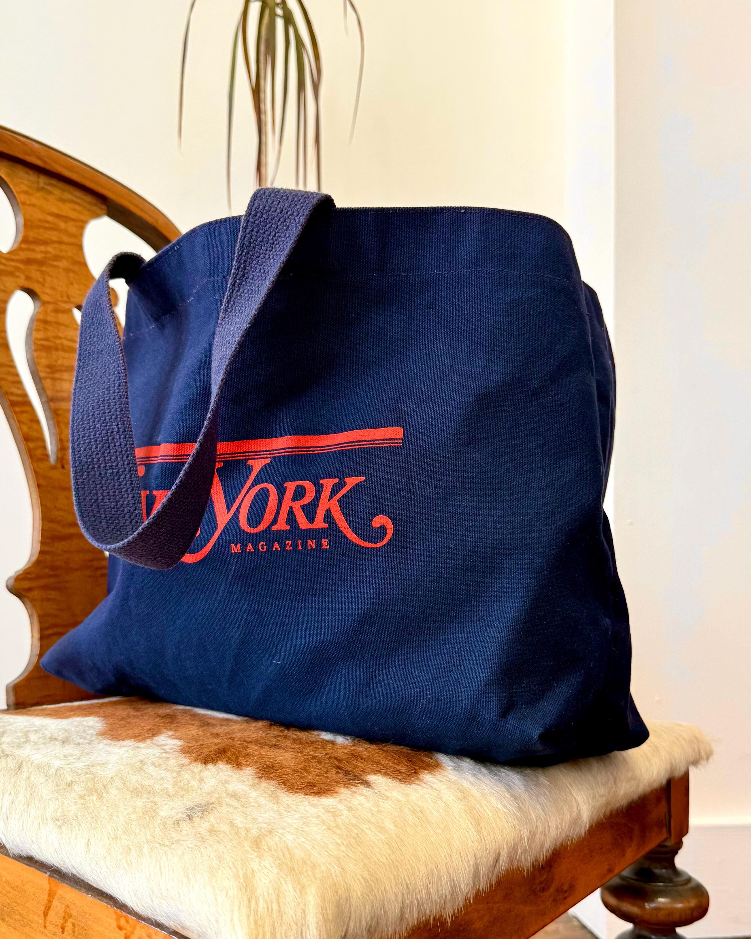 An authentic vintage tote bag for New York magazine. a large rectangular style with a flat base. crafted from durable canvas and webbed shoulder straps. unlined. no interior labels. well worn and broken in.