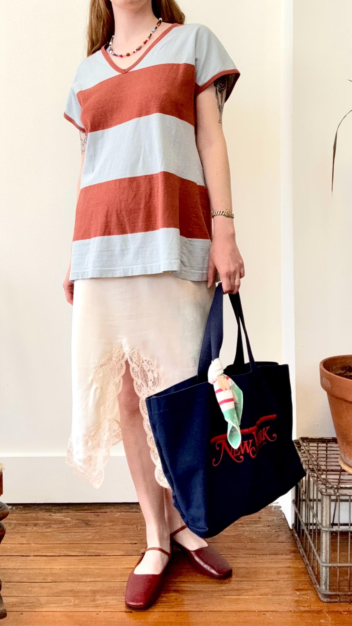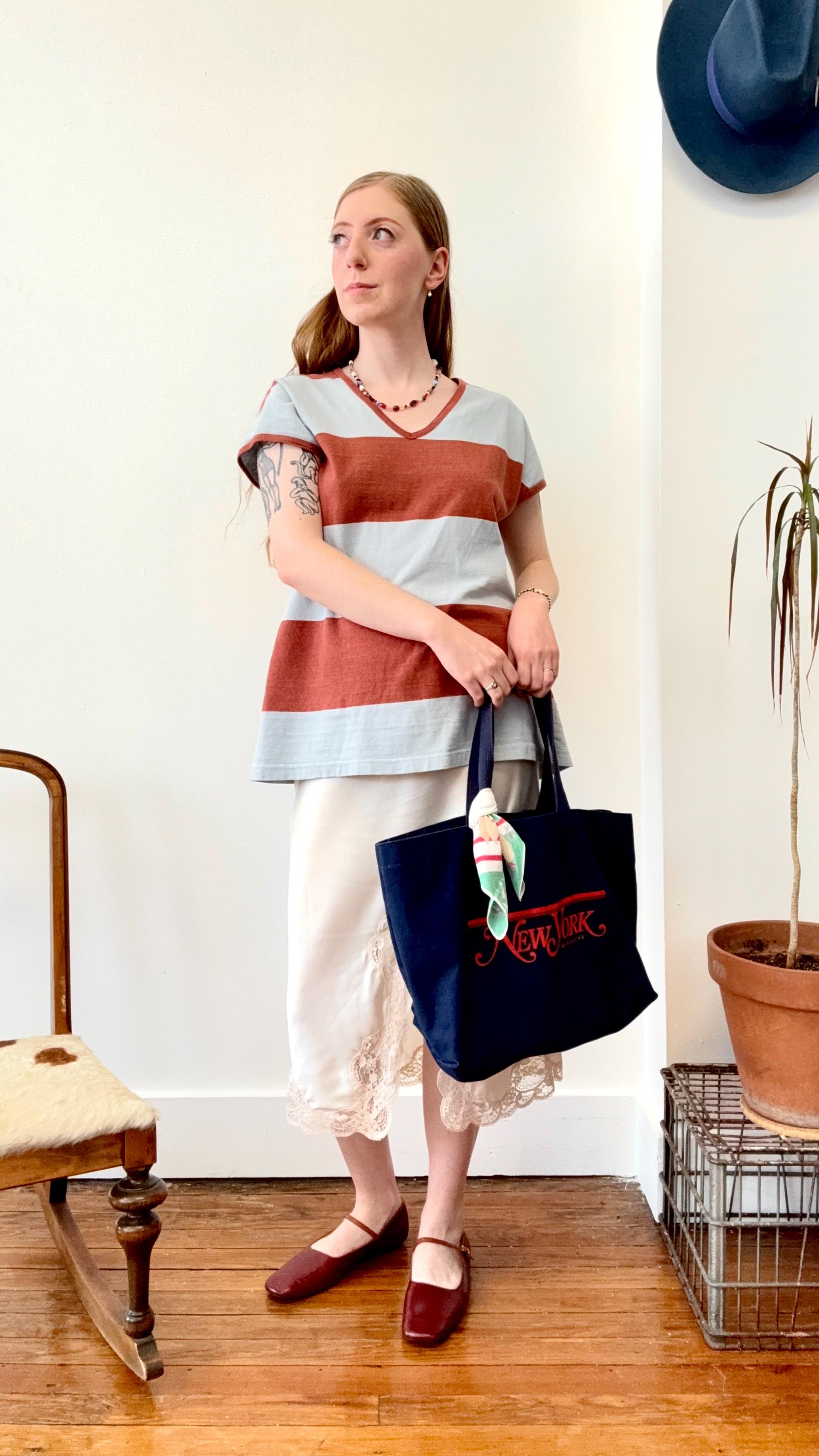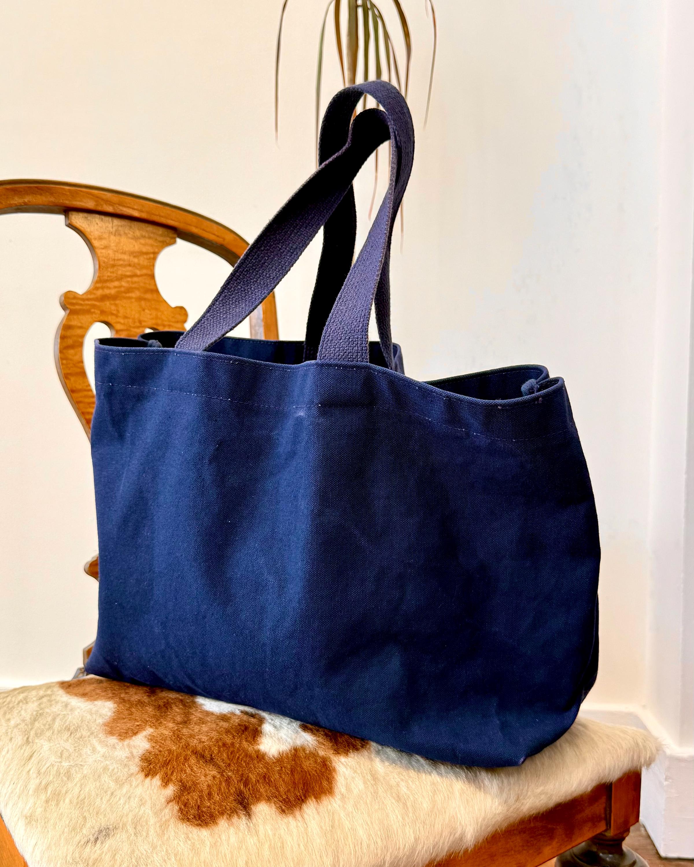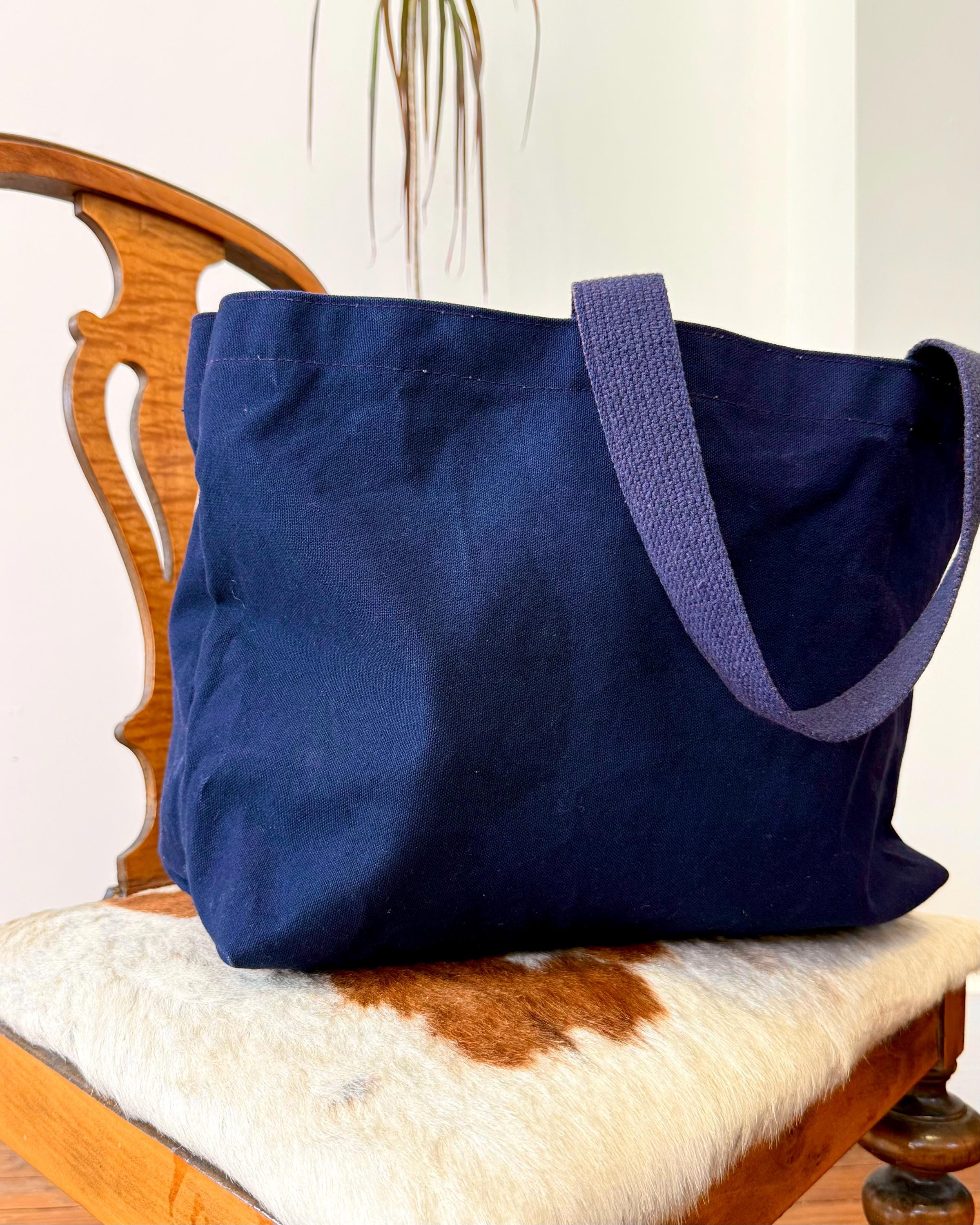 An authentic vintage tote bag for New York magazine. a large rectangular style with a flat base. crafted from durable canvas and webbed shoulder straps. unlined. no interior labels. well worn and broken in.