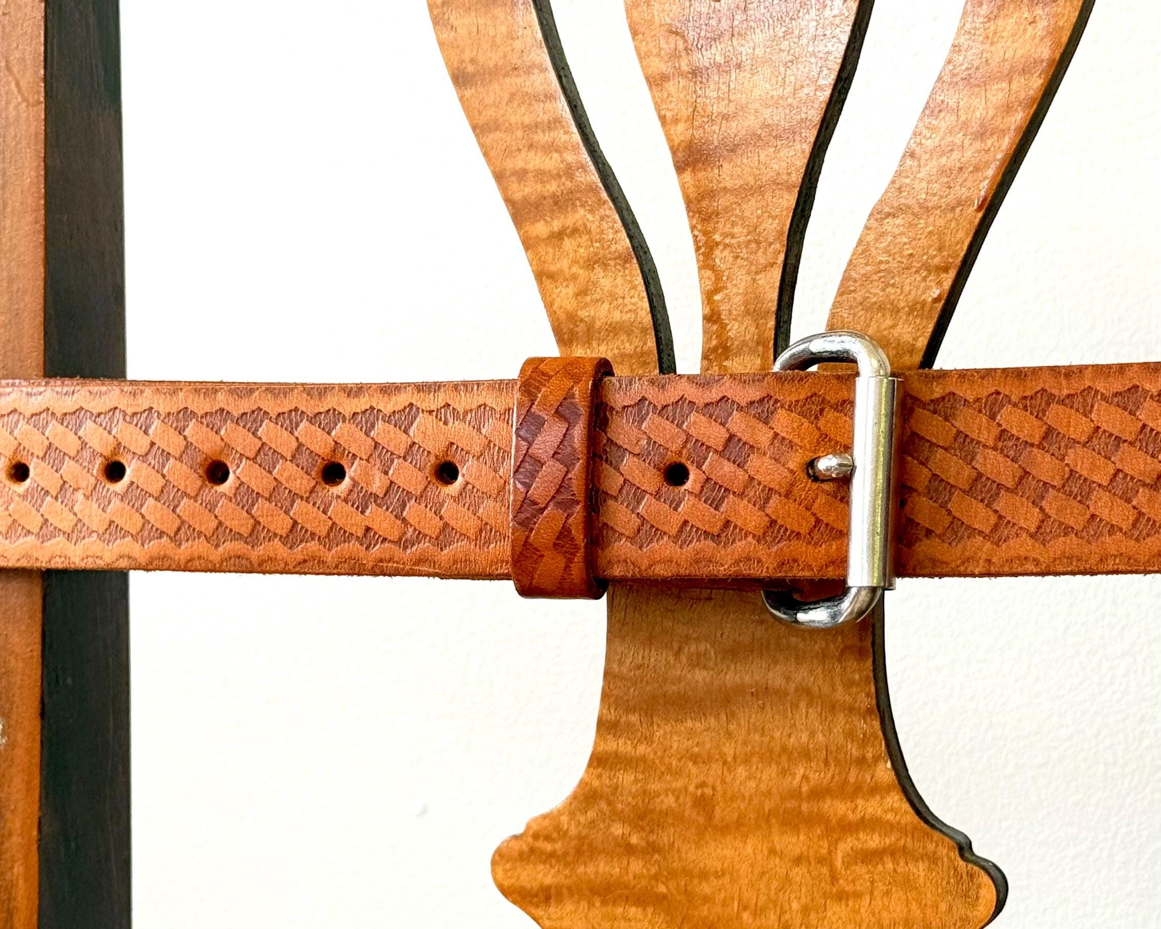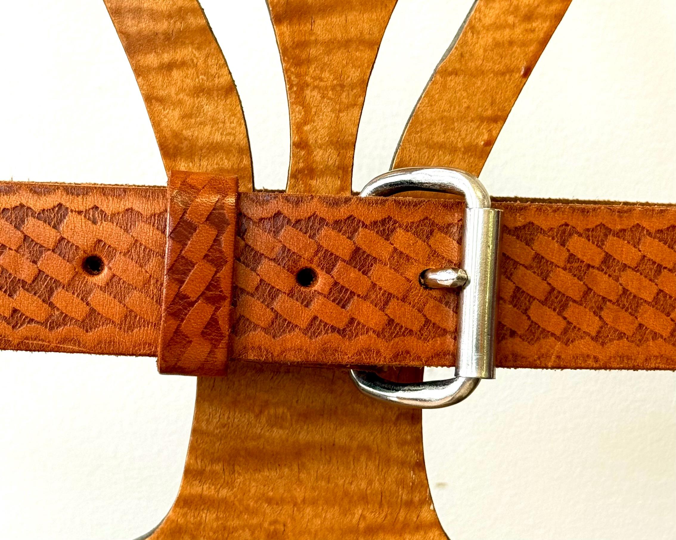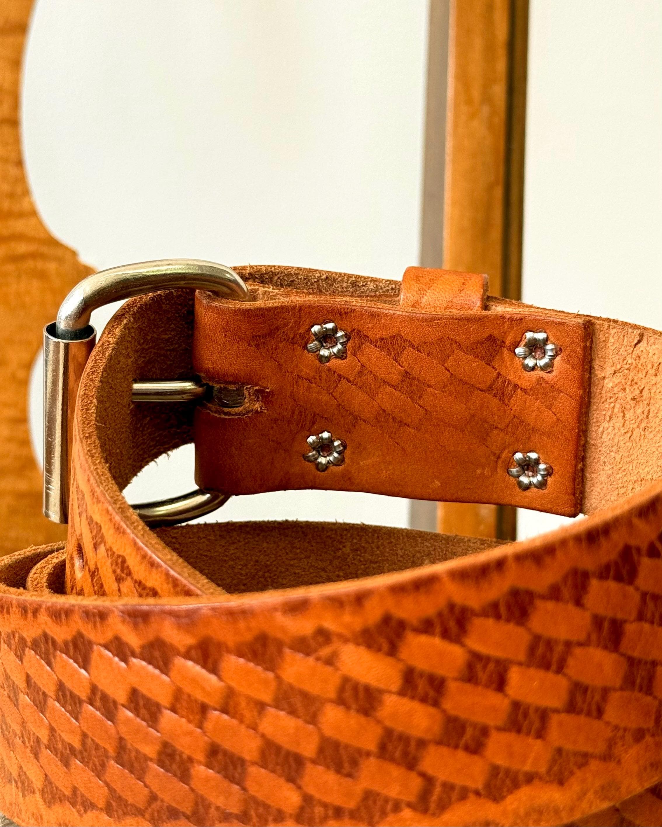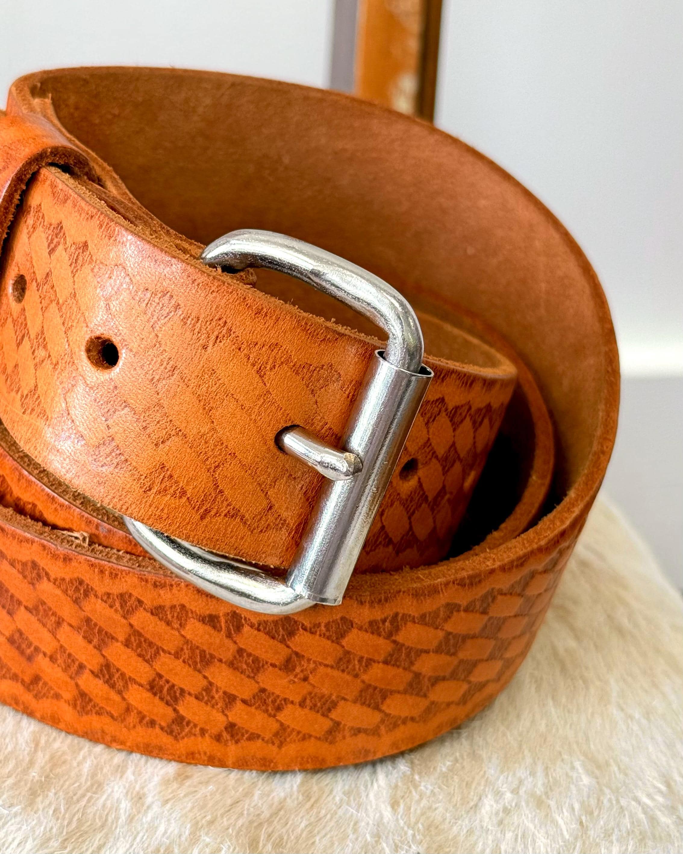 An authentic vintage belt with buckle. embossed basket weave pattern replicating hand tooled western design. crafted from high quality leather with attached buckle. silver tone buckle included. no stamps or marks. fits such a wide range of sizes, can be cut down to fit if need be.