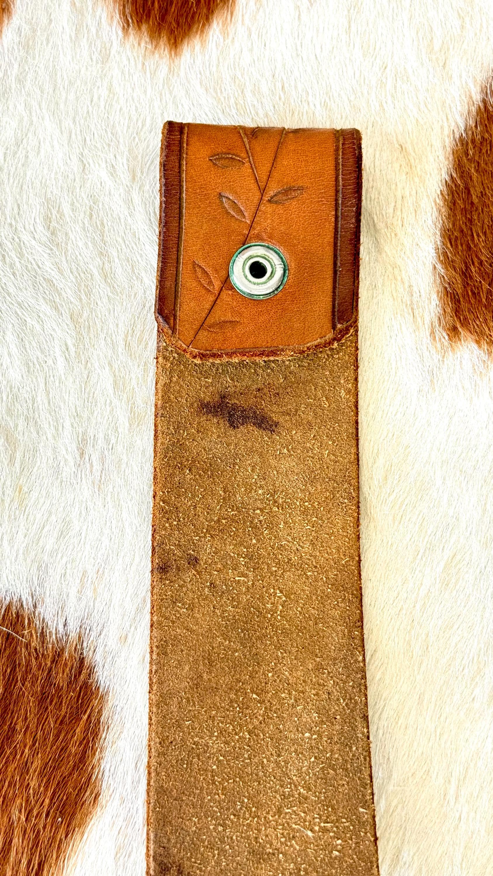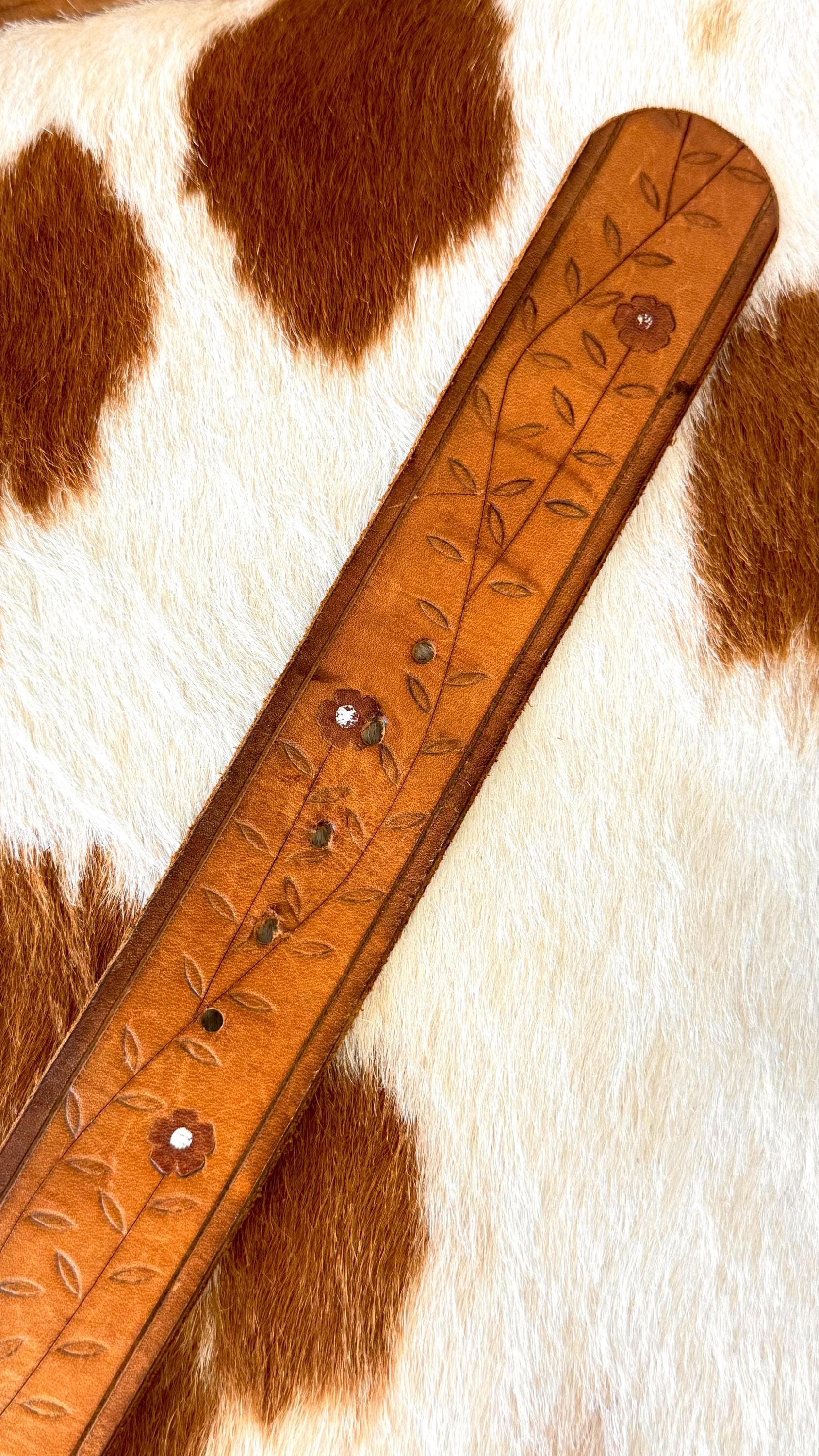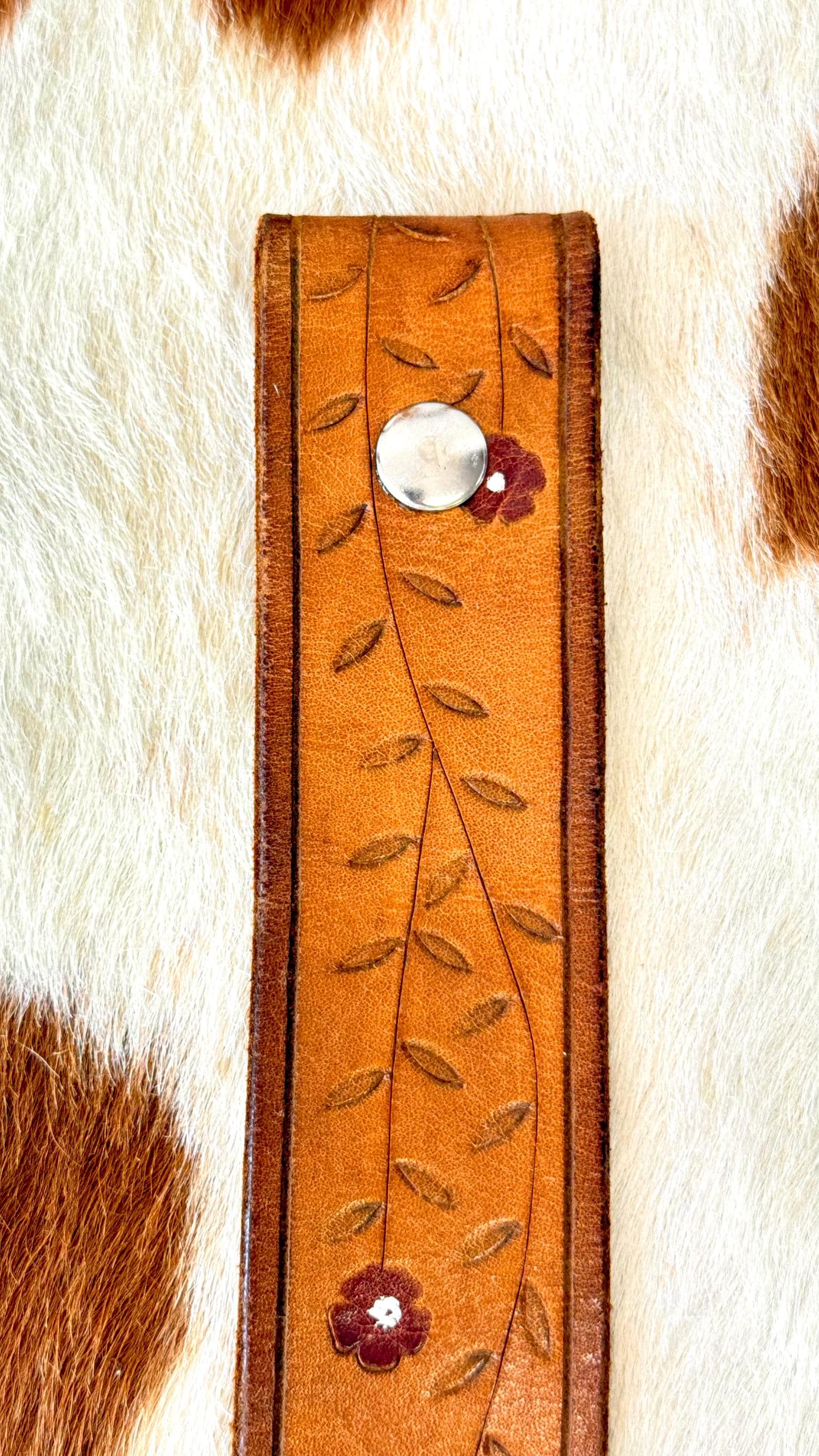 An authentic vintage leather belt only. crafted from full grain leather and features a tooled floral vine design. belt unsnaps to remove and replace your own buckle of choice. buckle NOT included. gently worn. no inside stamps or markings.