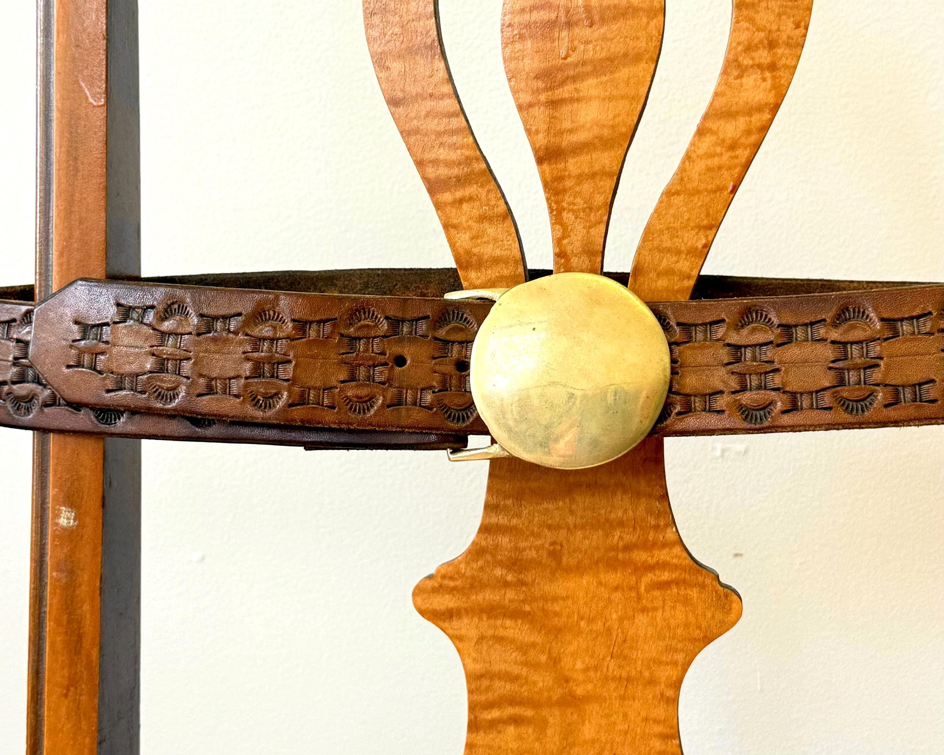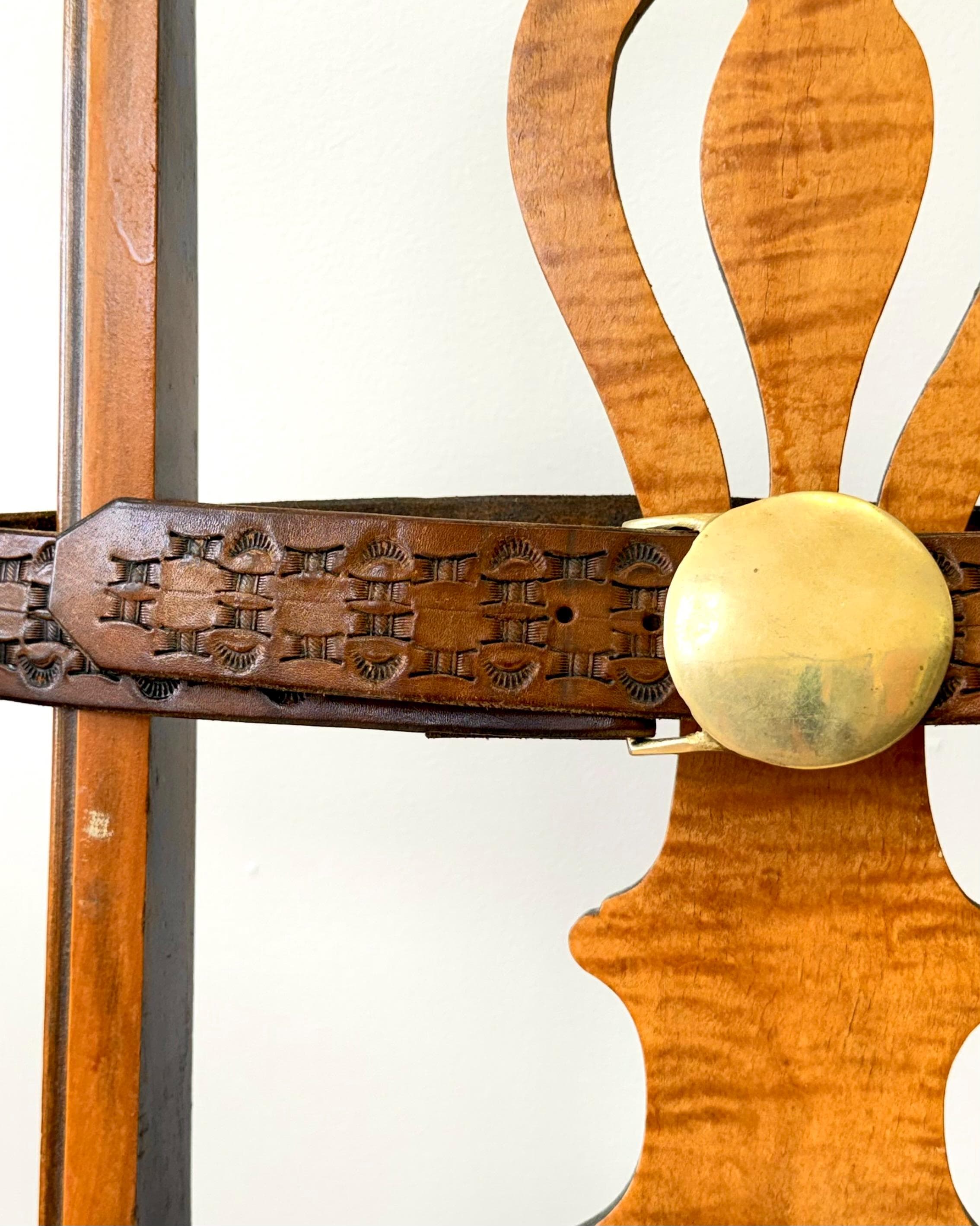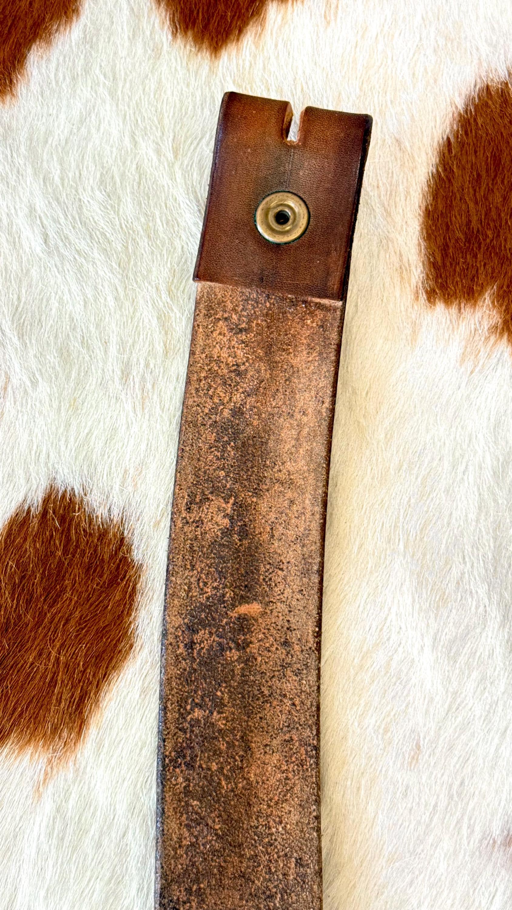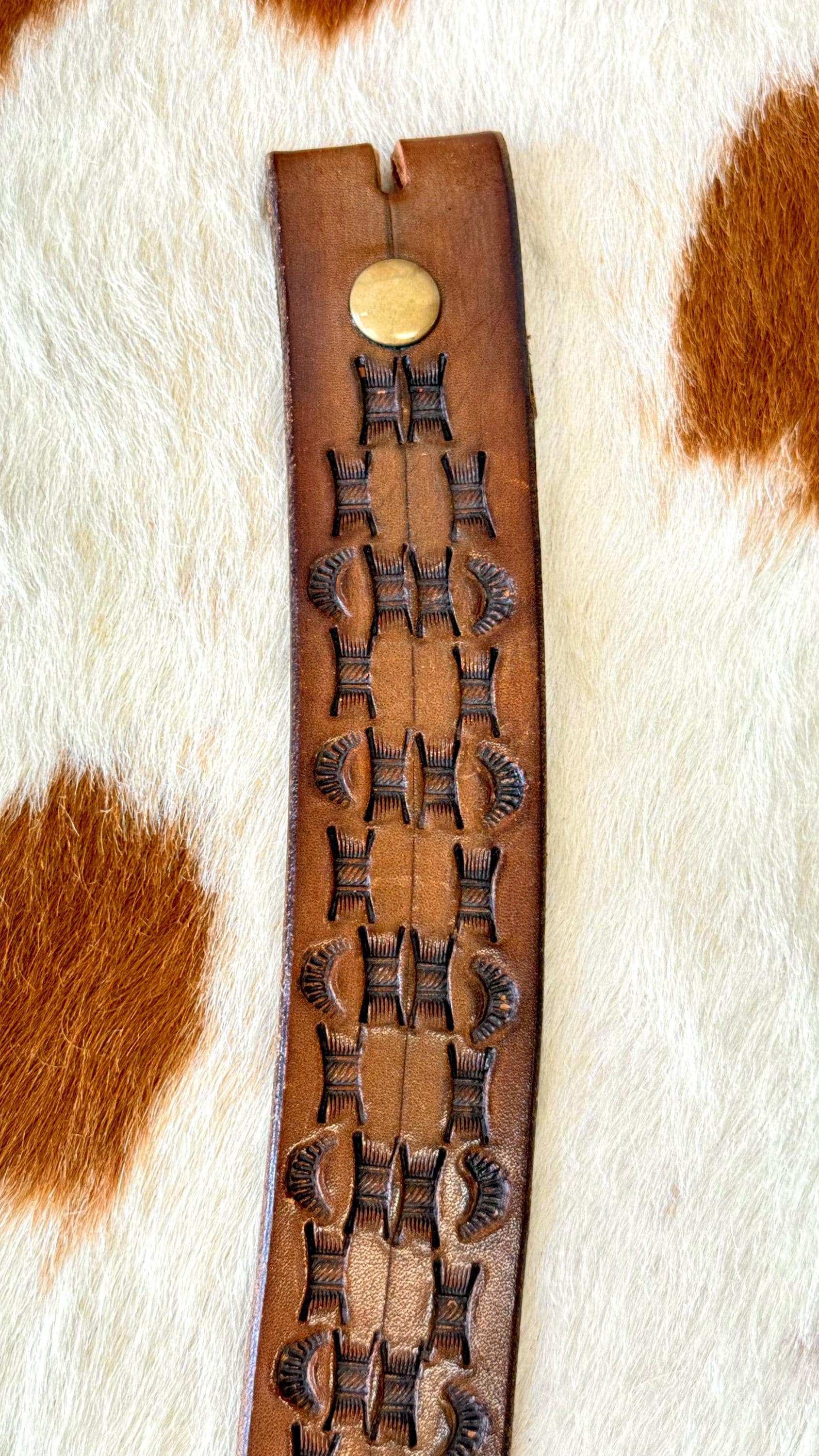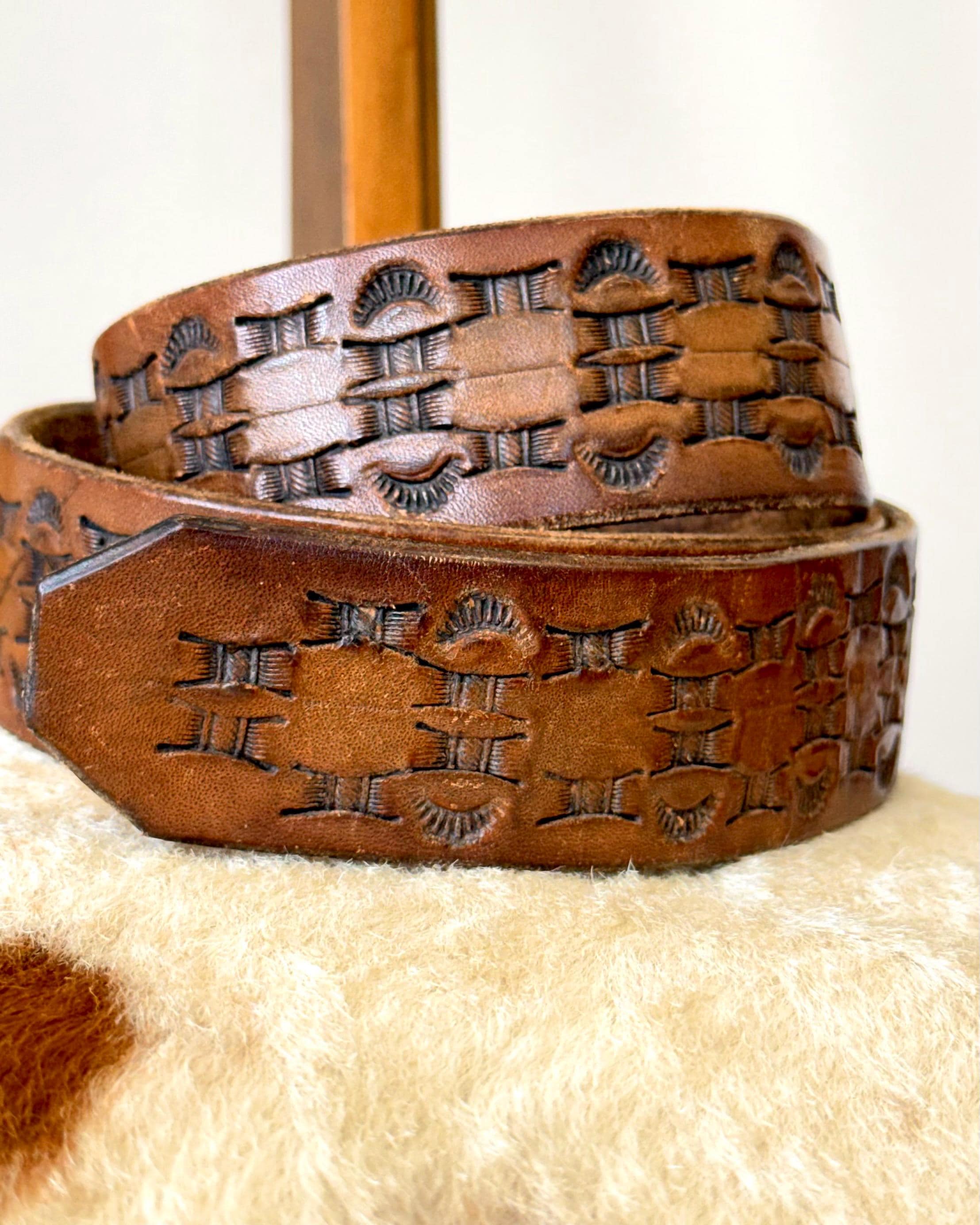 An authentic vintage leather belt only. crafted from full grain leather and features a tooled western style design. belt unsnaps to remove and replace your own buckle of choice. buckle NOT included. gently worn. no inside stamps or markings.