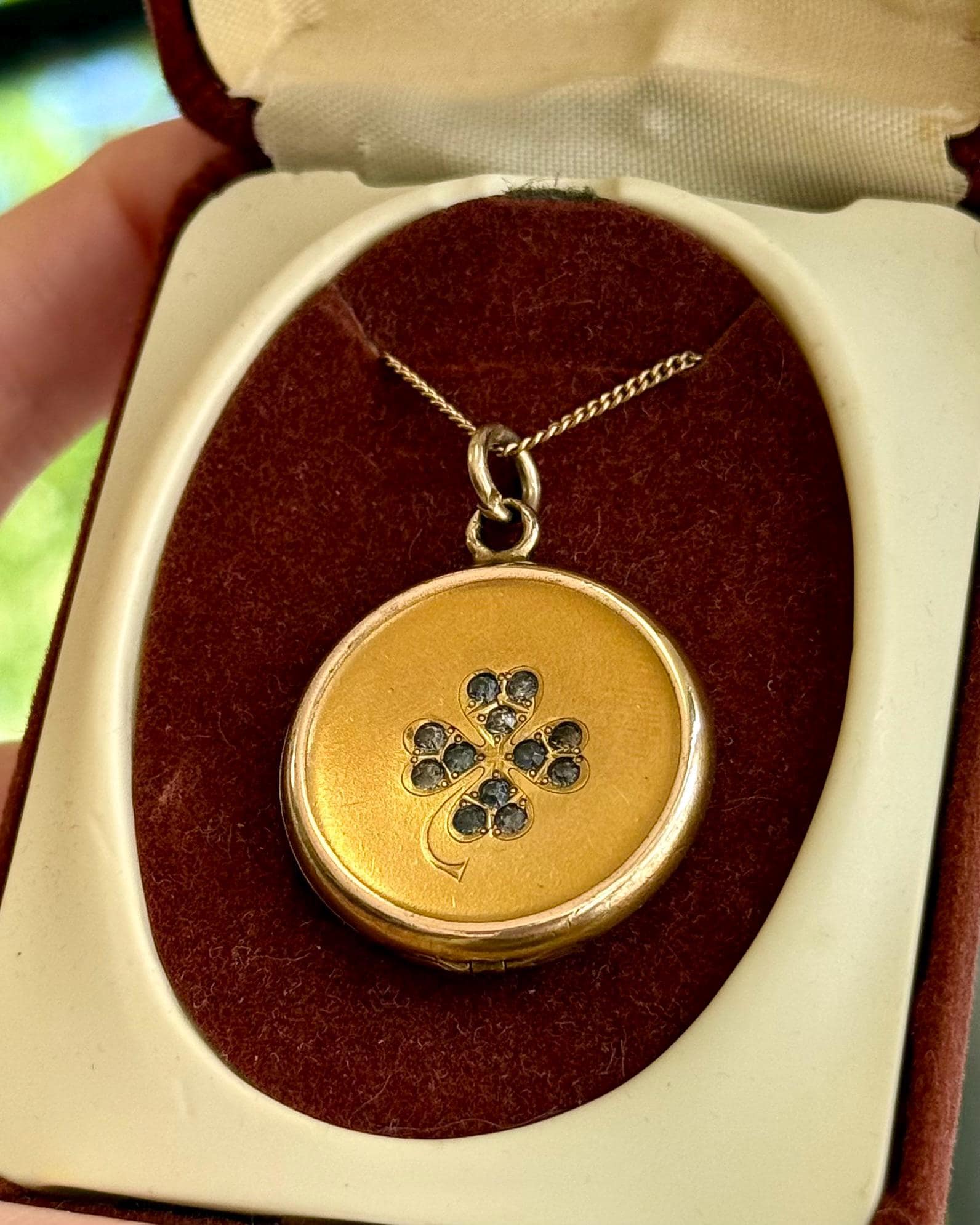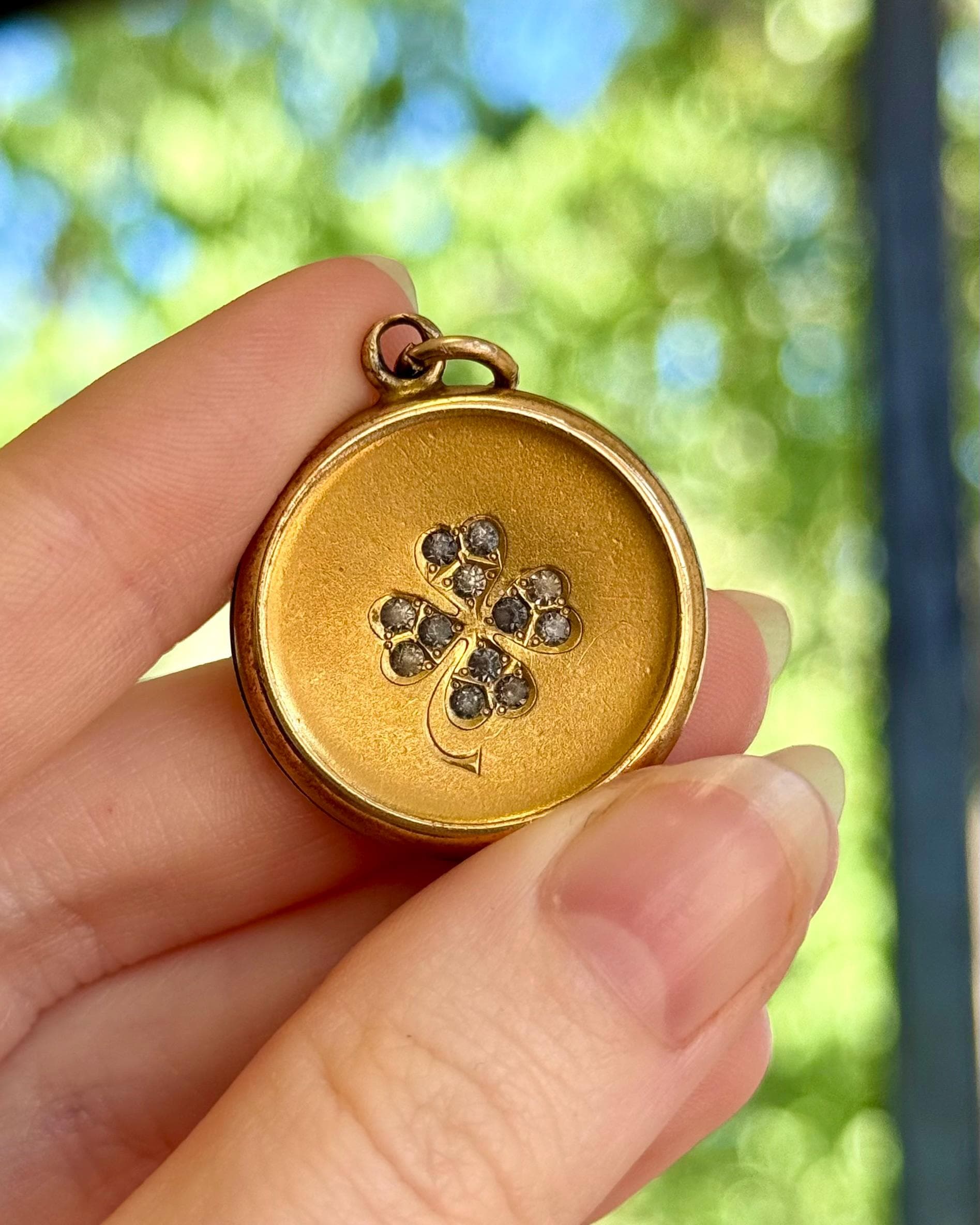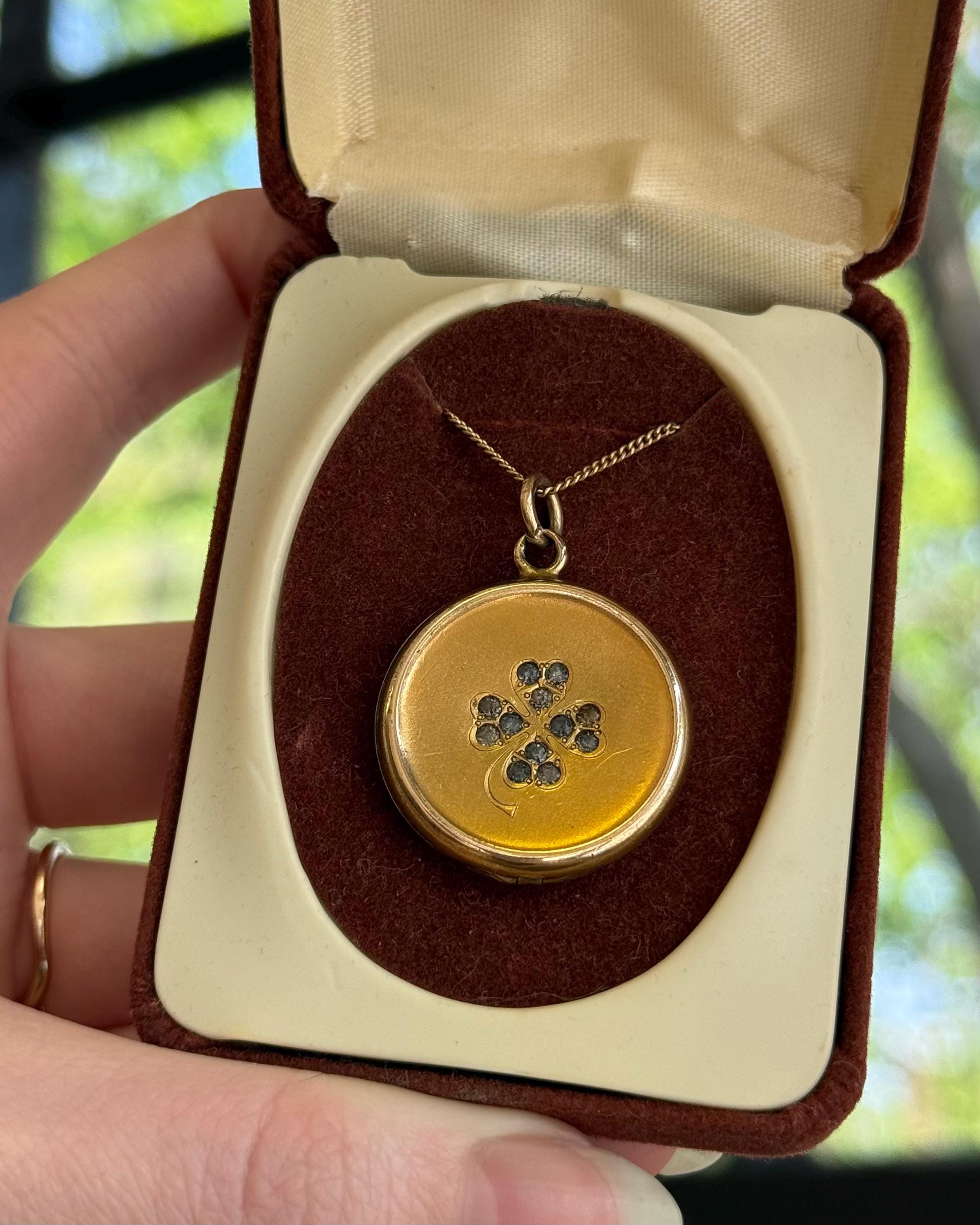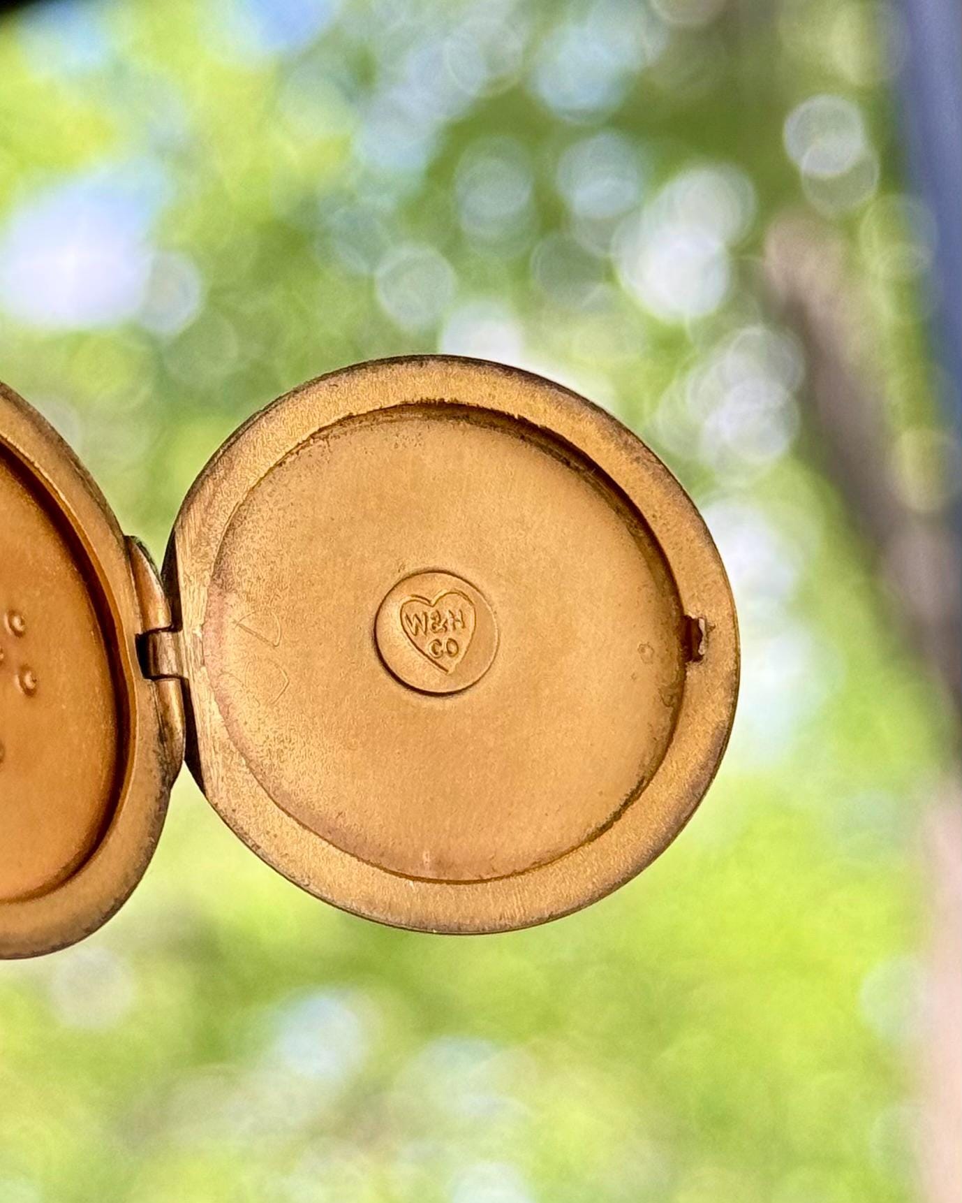 An authentic antique locket pendant only. features a lucky four leaf clover motif set with paste stones on front, engraved unidentifiable initial in old English lettering, possibly lowercase “h”? on back. the front is slightly concave with a brassy matte finish. includes the original photo placed inside by the first owner. marked W&H Co with heart marking underneath for Wightman & Hugh. photo frames press in and hold tightly. beautiful natural patina! easily strings onto your own jewelry of choice.